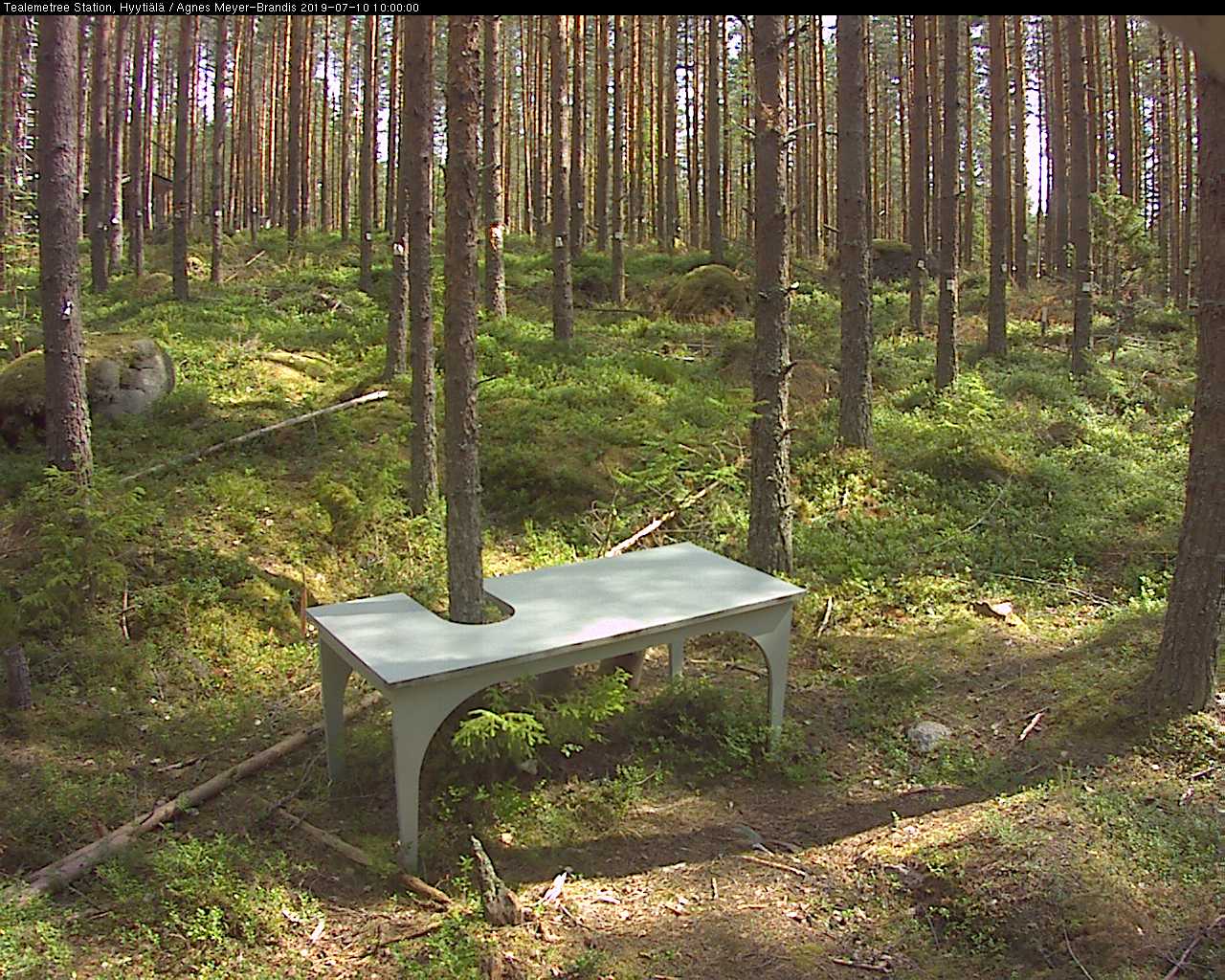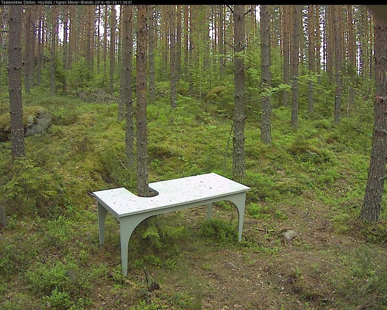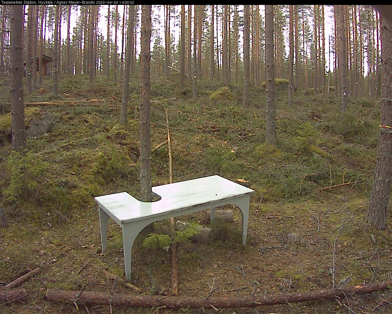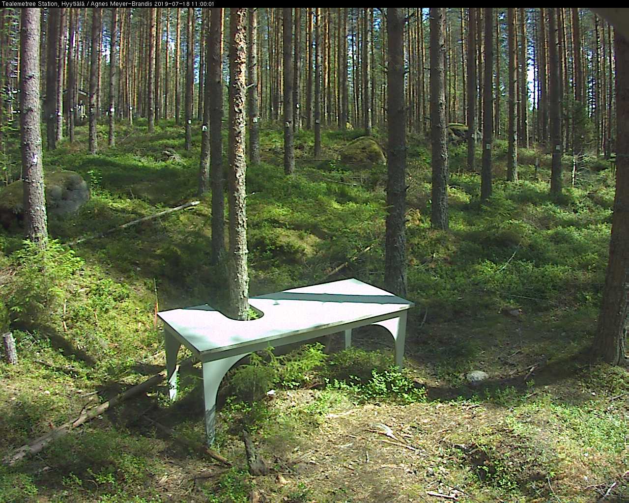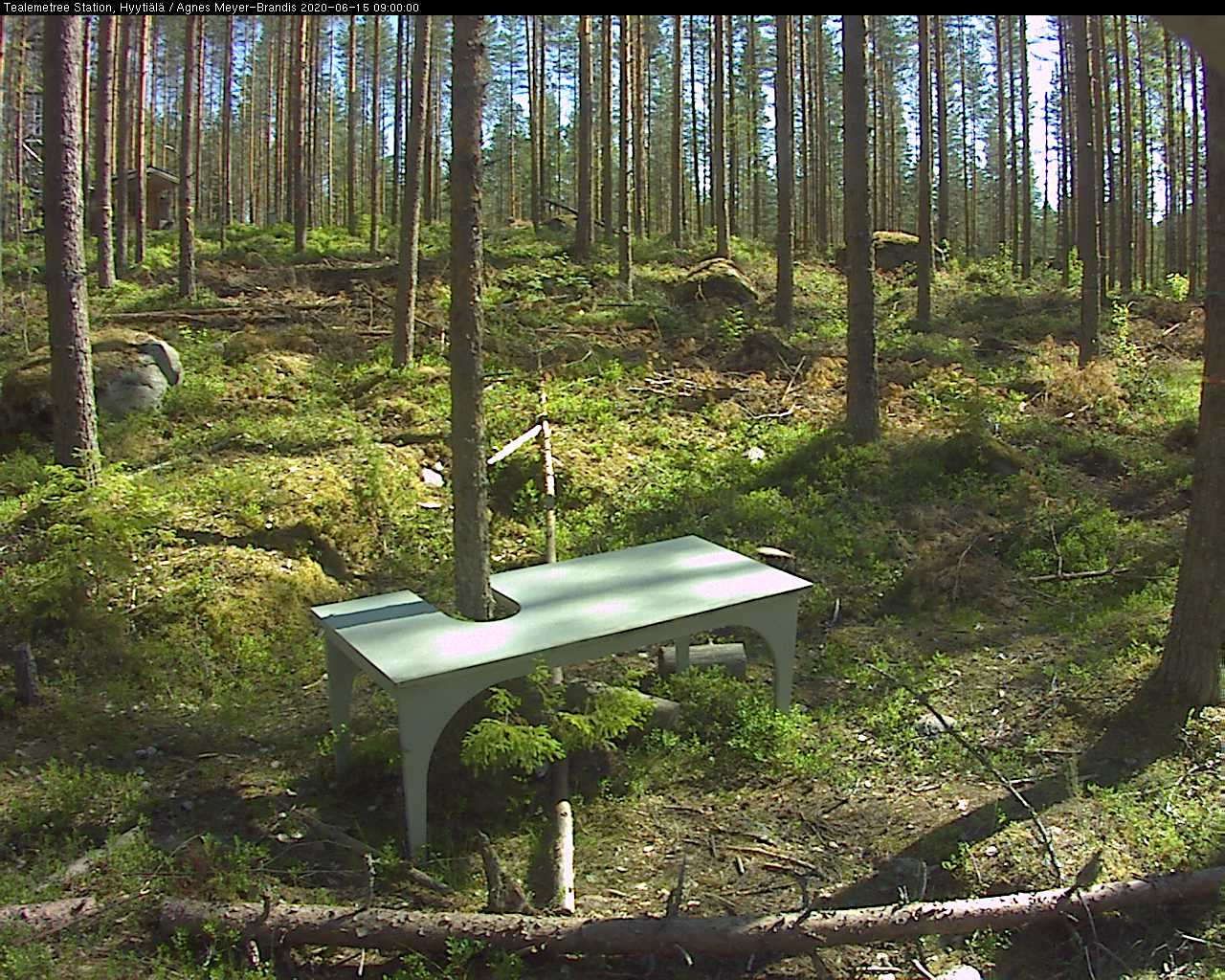 Agnes Meyer-Brandiksen työ Hyytiälässä alkoi tutustumalla aseman muihin tutkijoihin. Pystyäkseen tapaamaan ihmisiä metsässä, hän rakensi pöydän, josta muodostui kohtauspiste ja paikka teehetkille Agneksen ja puun kanssa.