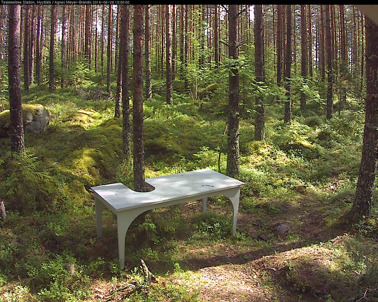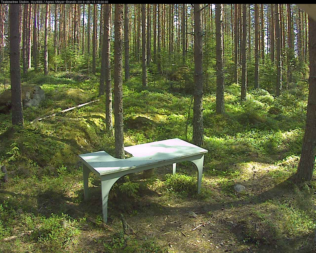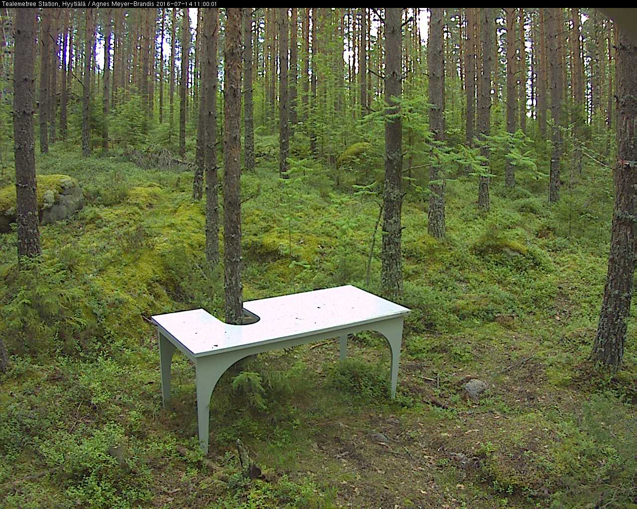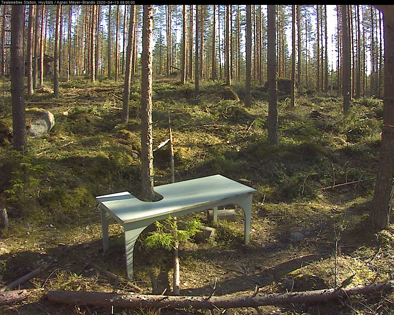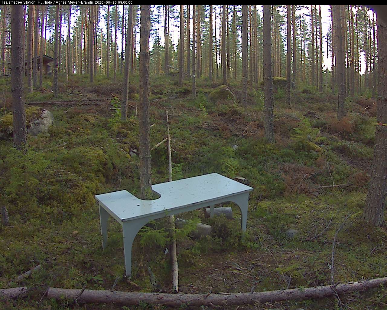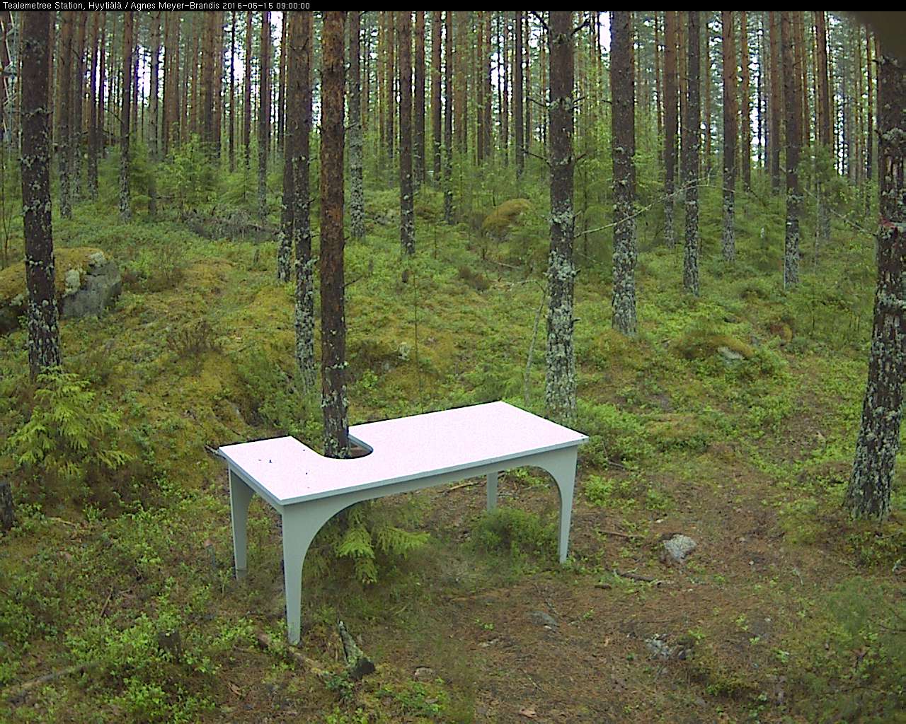 Agnes Meyer-Brandiksen työ Hyytiälässä alkoi tutustumalla aseman muihin tutkijoihin. Pystyäkseen tapaamaan ihmisiä metsässä, hän rakensi pöydän, josta muodostui kohtauspiste ja paikka teehetkille Agneksen ja puun kanssa.