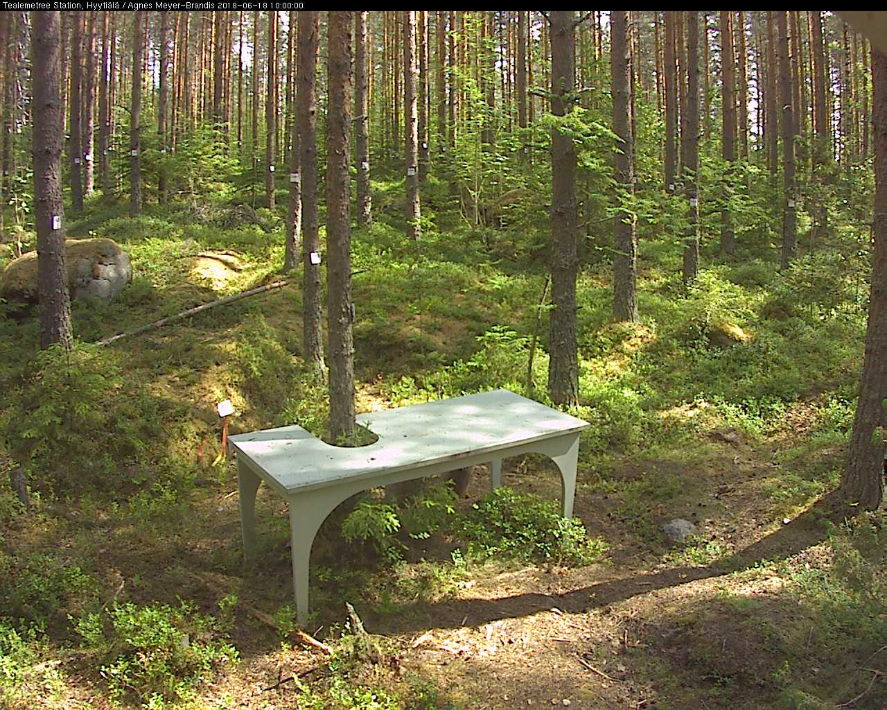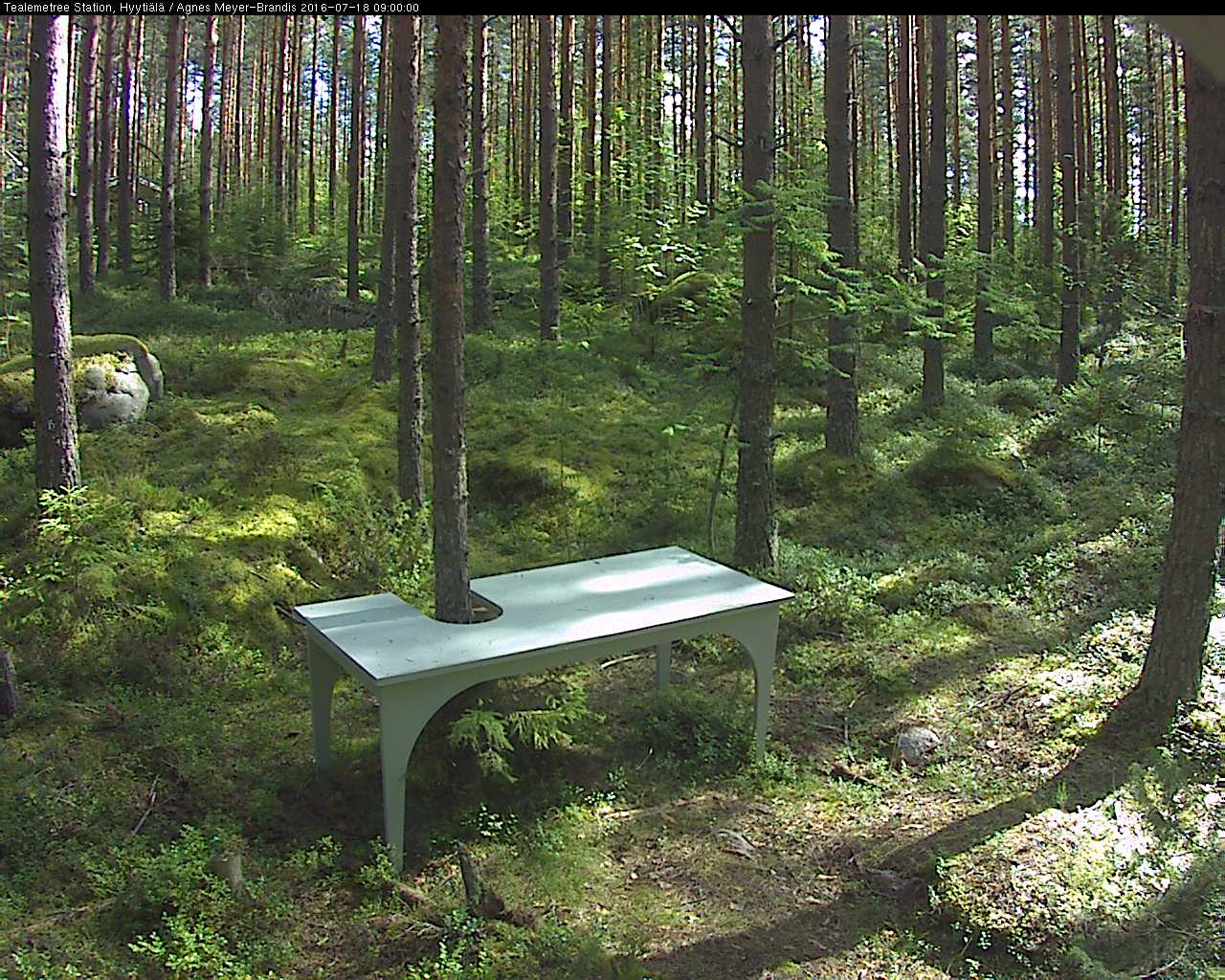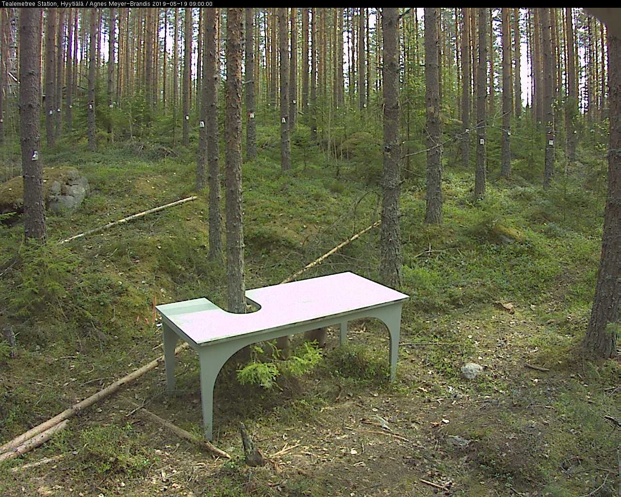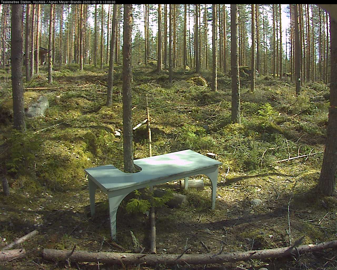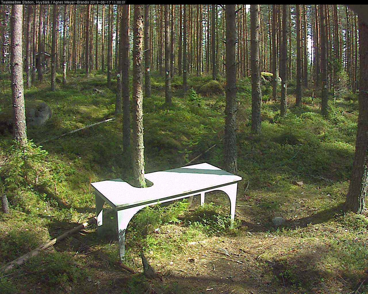 Agnes Meyer-Brandiksen työ Hyytiälässä alkoi tutustumalla aseman muihin tutkijoihin. Pystyäkseen tapaamaan ihmisiä metsässä, hän rakensi pöydän, josta muodostui kohtauspiste ja paikka teehetkille Agneksen ja puun kanssa.