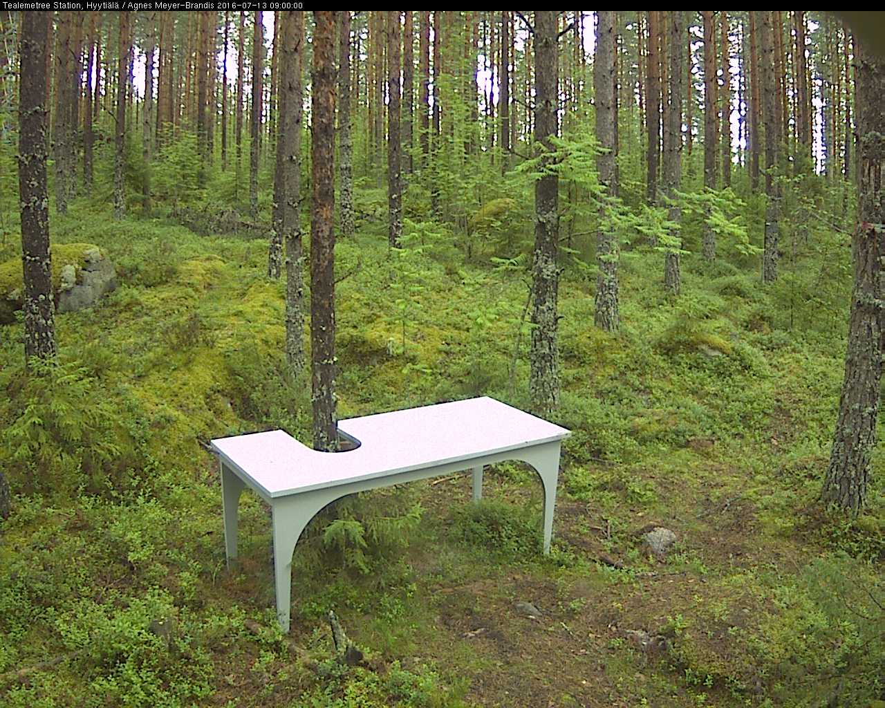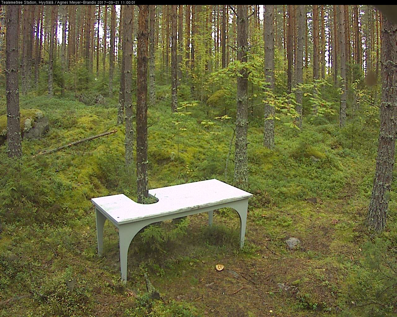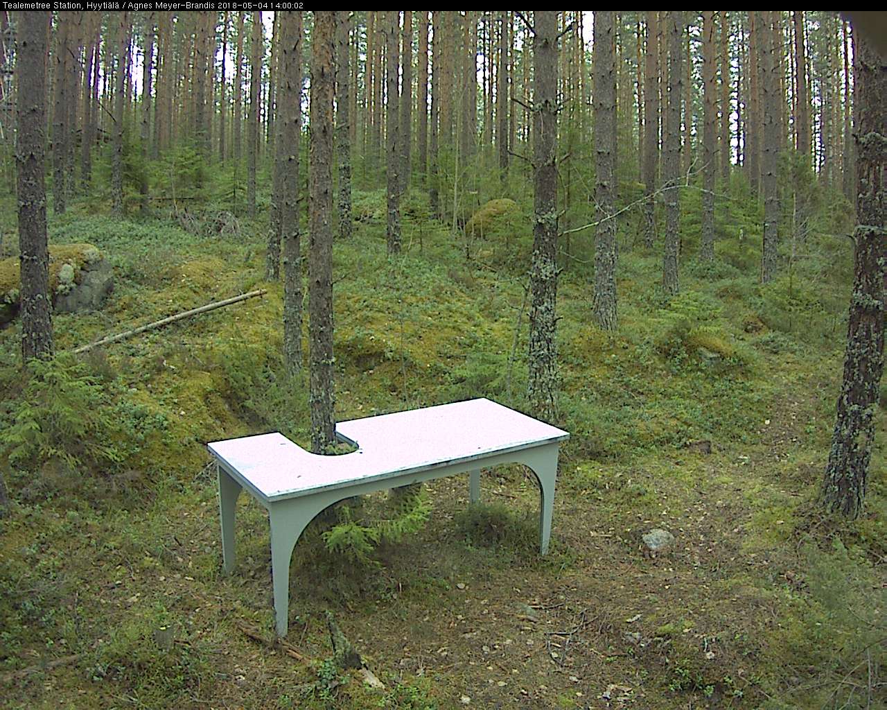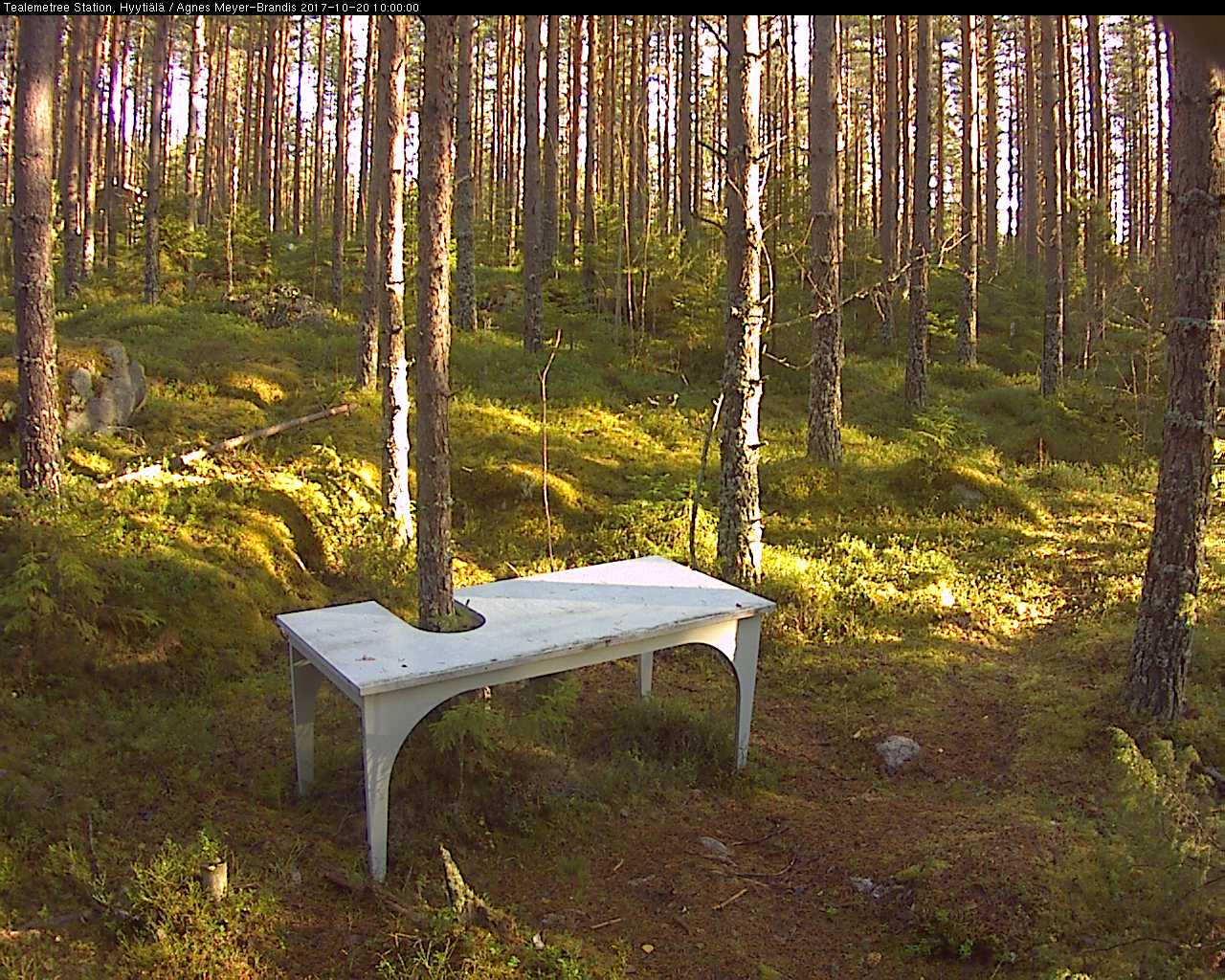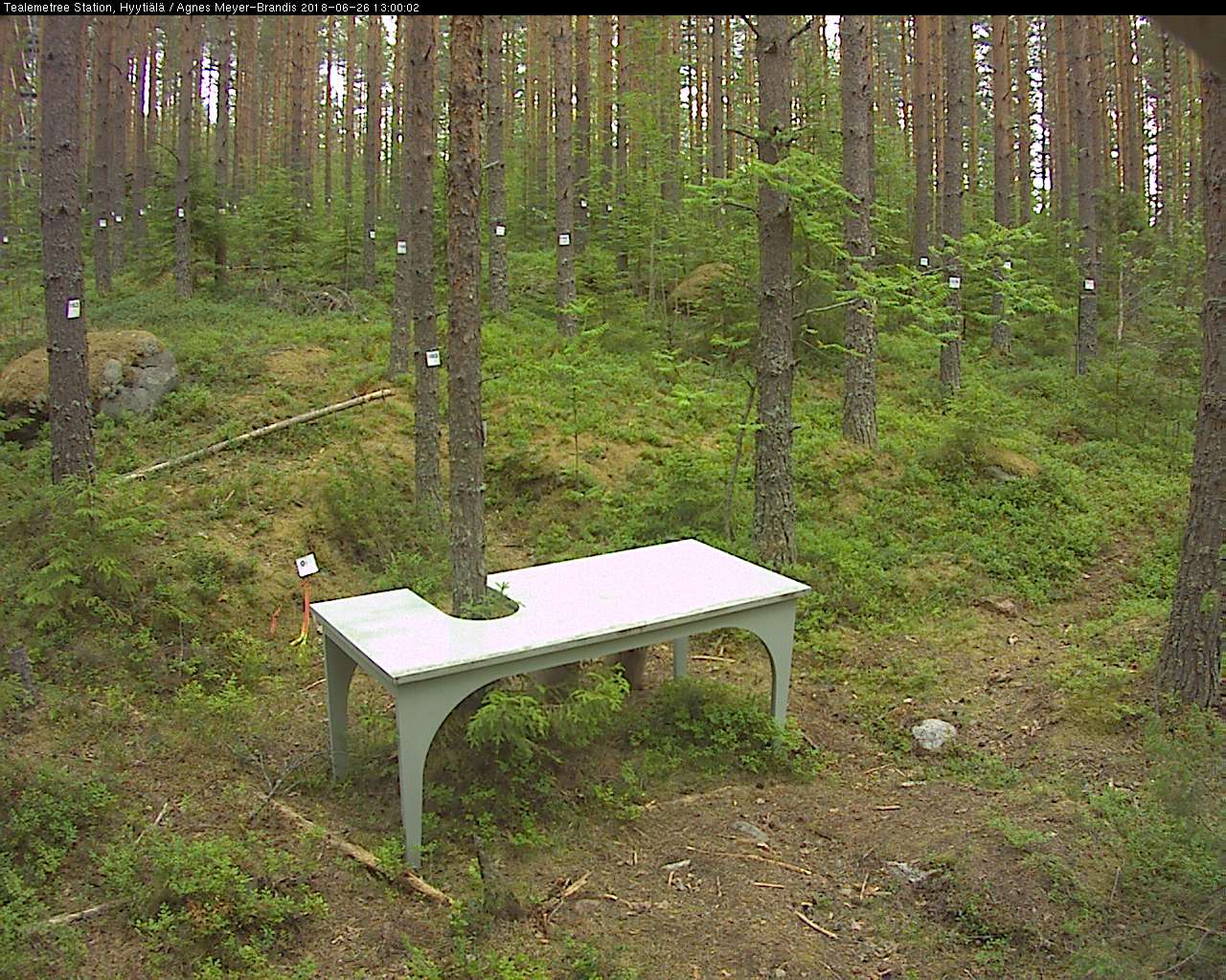 Agnes Meyer-Brandiksen työ Hyytiälässä alkoi tutustumalla aseman muihin tutkijoihin. Pystyäkseen tapaamaan ihmisiä metsässä, hän rakensi pöydän, josta muodostui kohtauspiste ja paikka teehetkille Agneksen ja puun kanssa.