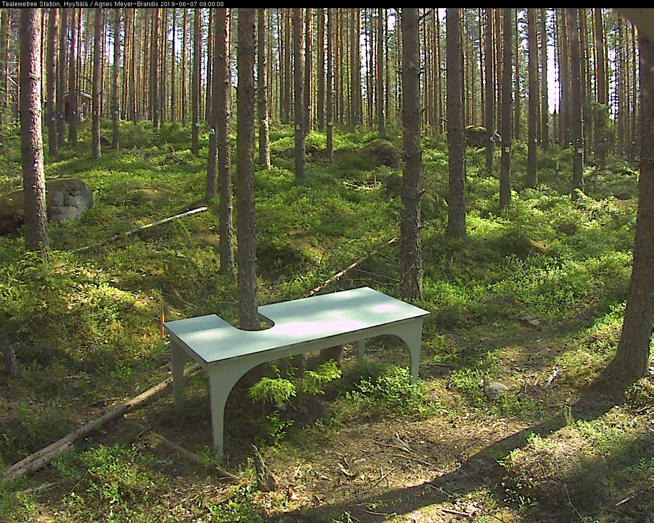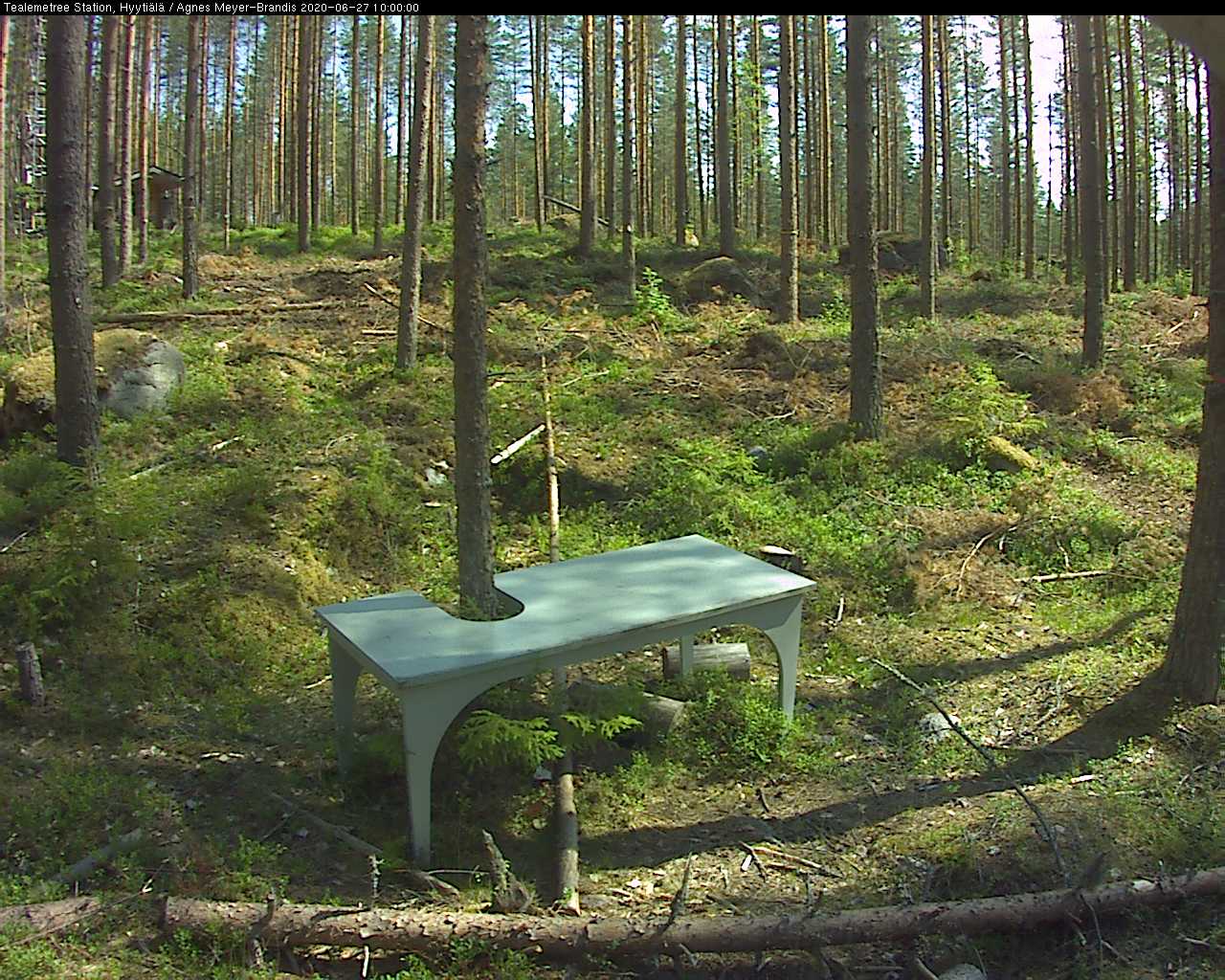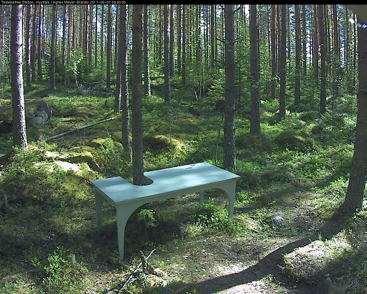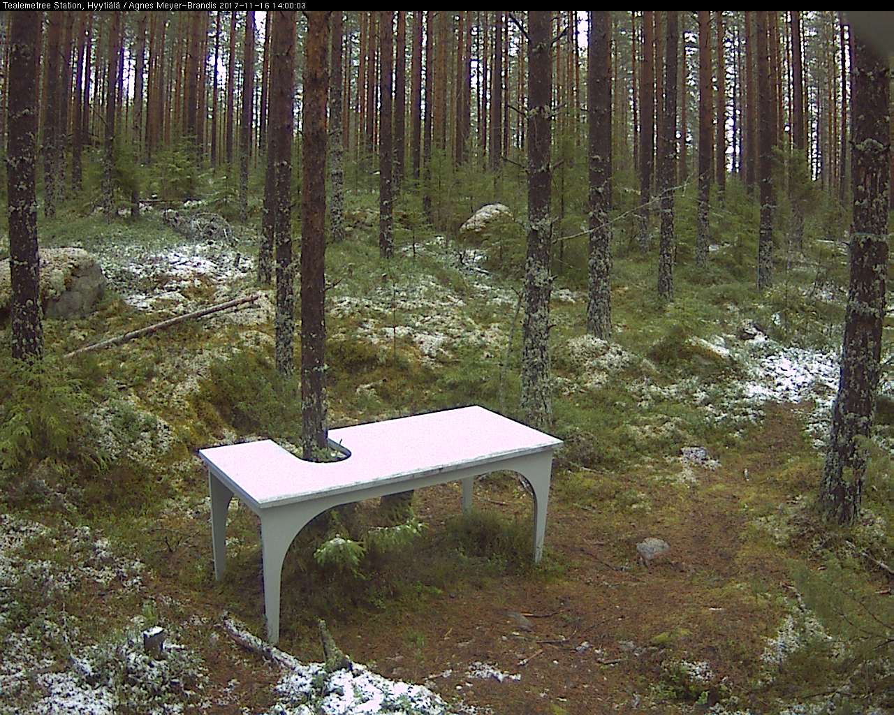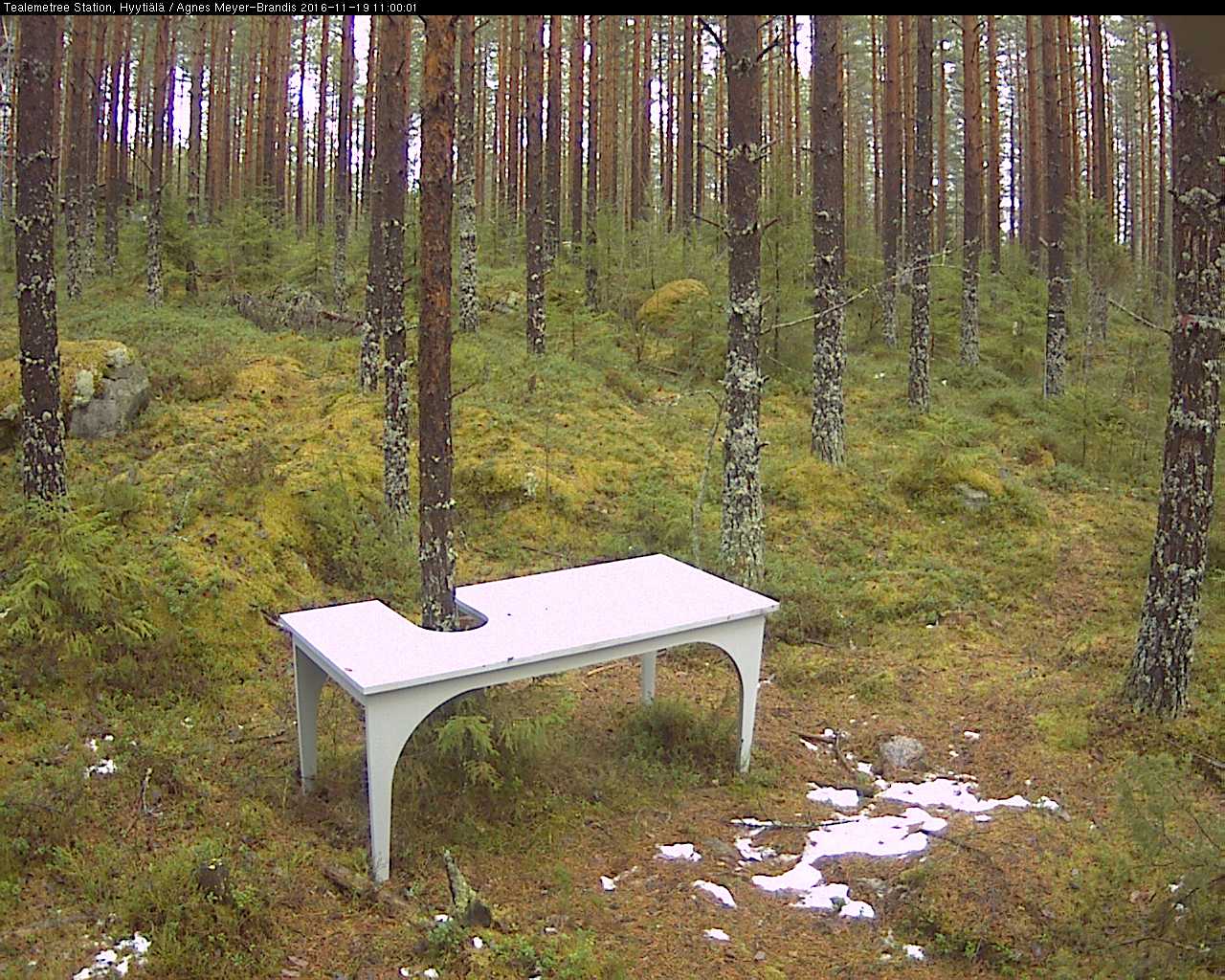 Agnes Meyer-Brandiksen työ Hyytiälässä alkoi tutustumalla aseman muihin tutkijoihin. Pystyäkseen tapaamaan ihmisiä metsässä, hän rakensi pöydän, josta muodostui kohtauspiste ja paikka teehetkille Agneksen ja puun kanssa.