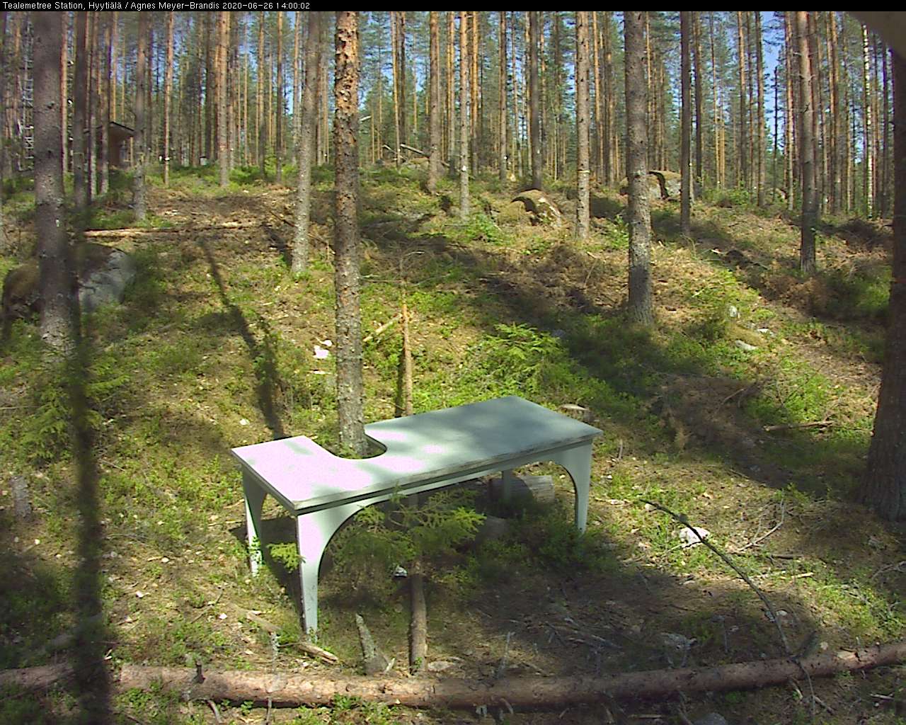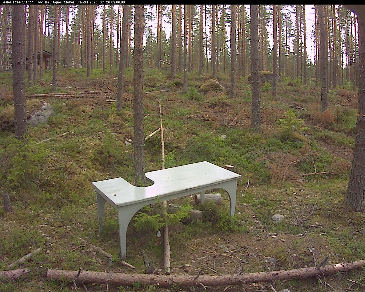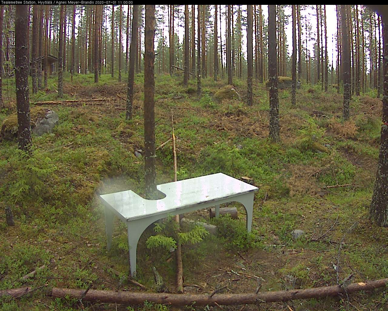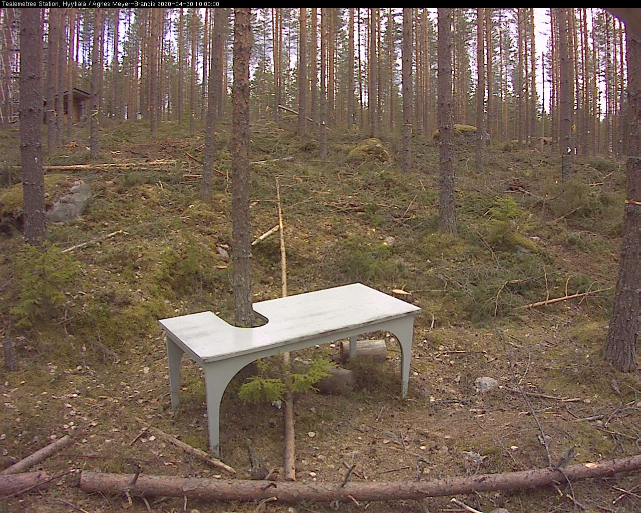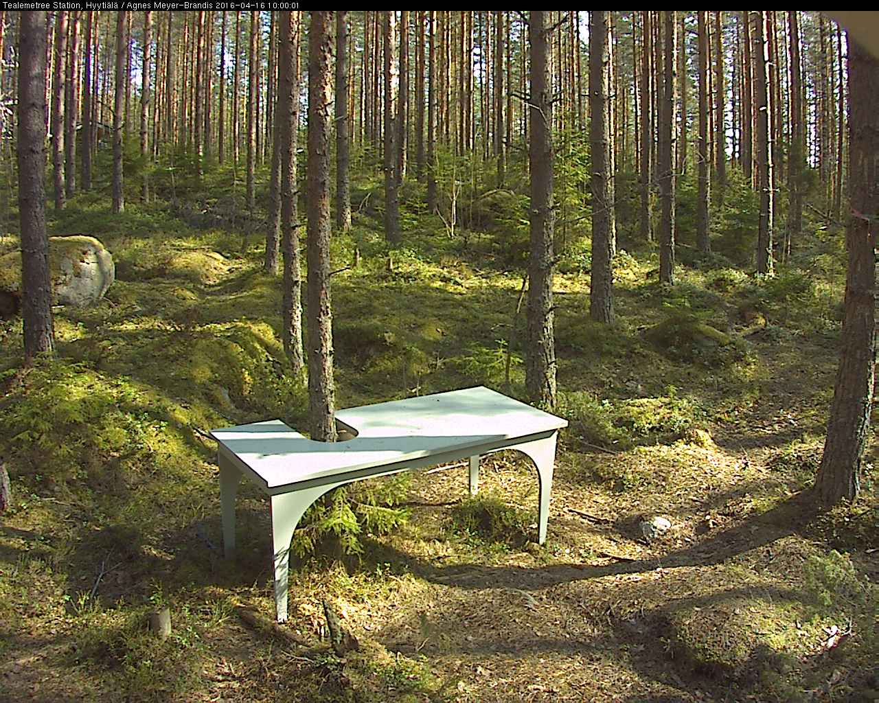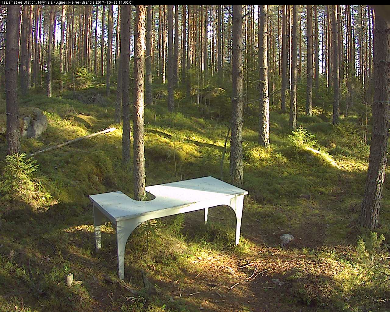 Agnes Meyer-Brandiksen työ Hyytiälässä alkoi tutustumalla aseman muihin tutkijoihin. Pystyäkseen tapaamaan ihmisiä metsässä, hän rakensi pöydän, josta muodostui kohtauspiste ja paikka teehetkille Agneksen ja puun kanssa.