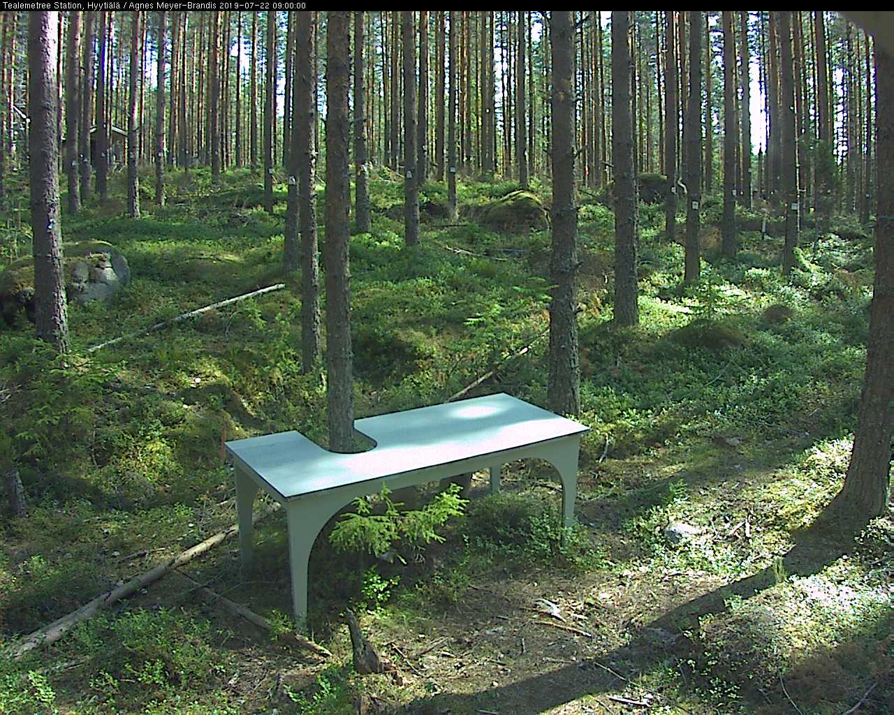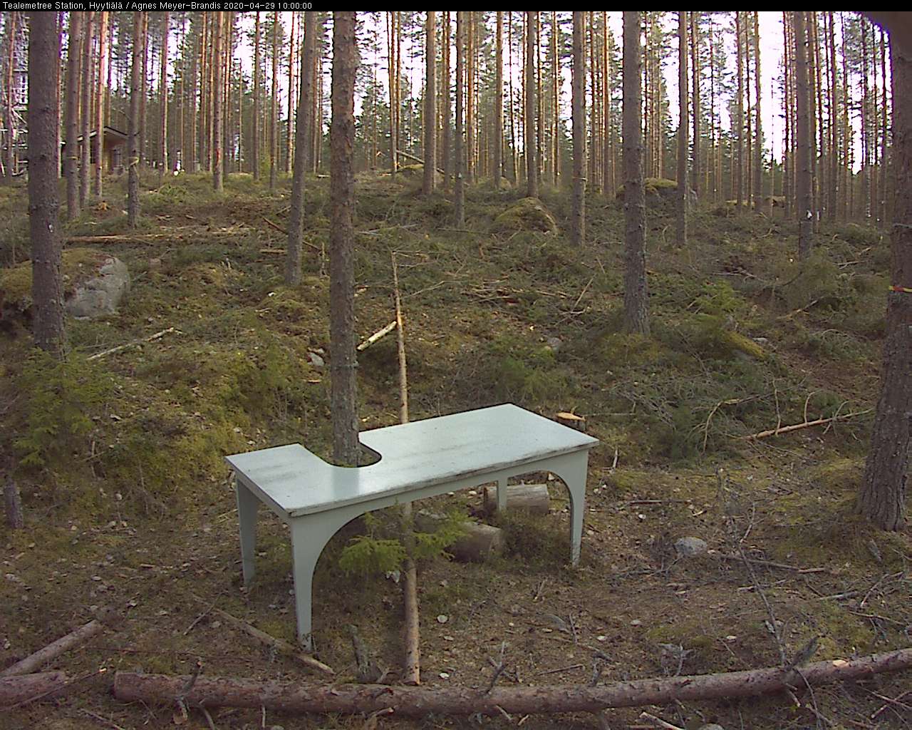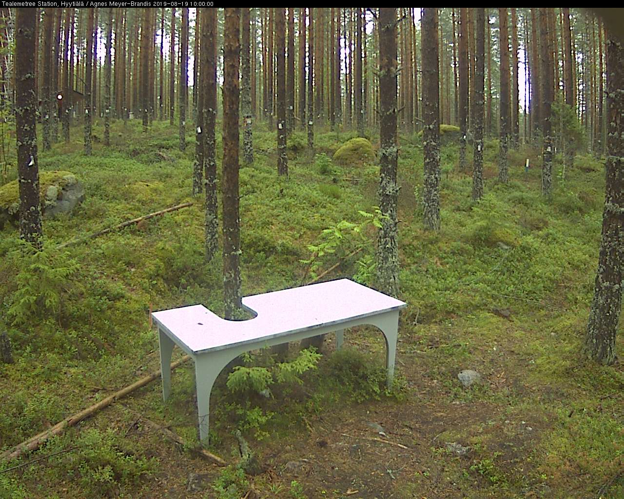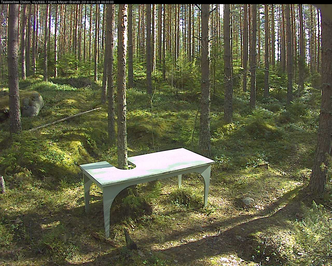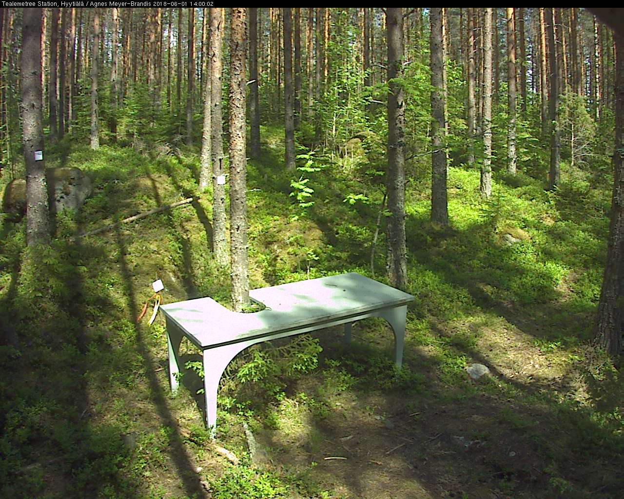 Agnes Meyer-Brandiksen työ Hyytiälässä alkoi tutustumalla aseman muihin tutkijoihin. Pystyäkseen tapaamaan ihmisiä metsässä, hän rakensi pöydän, josta muodostui kohtauspiste ja paikka teehetkille Agneksen ja puun kanssa.