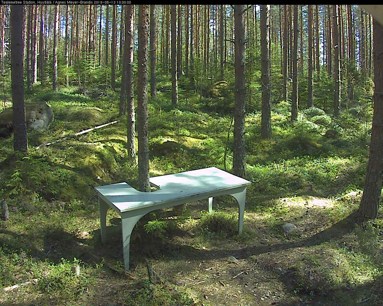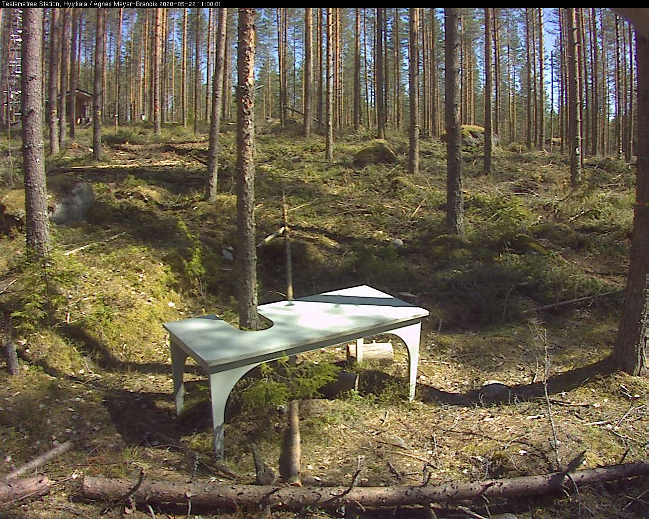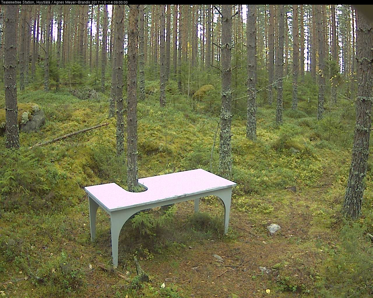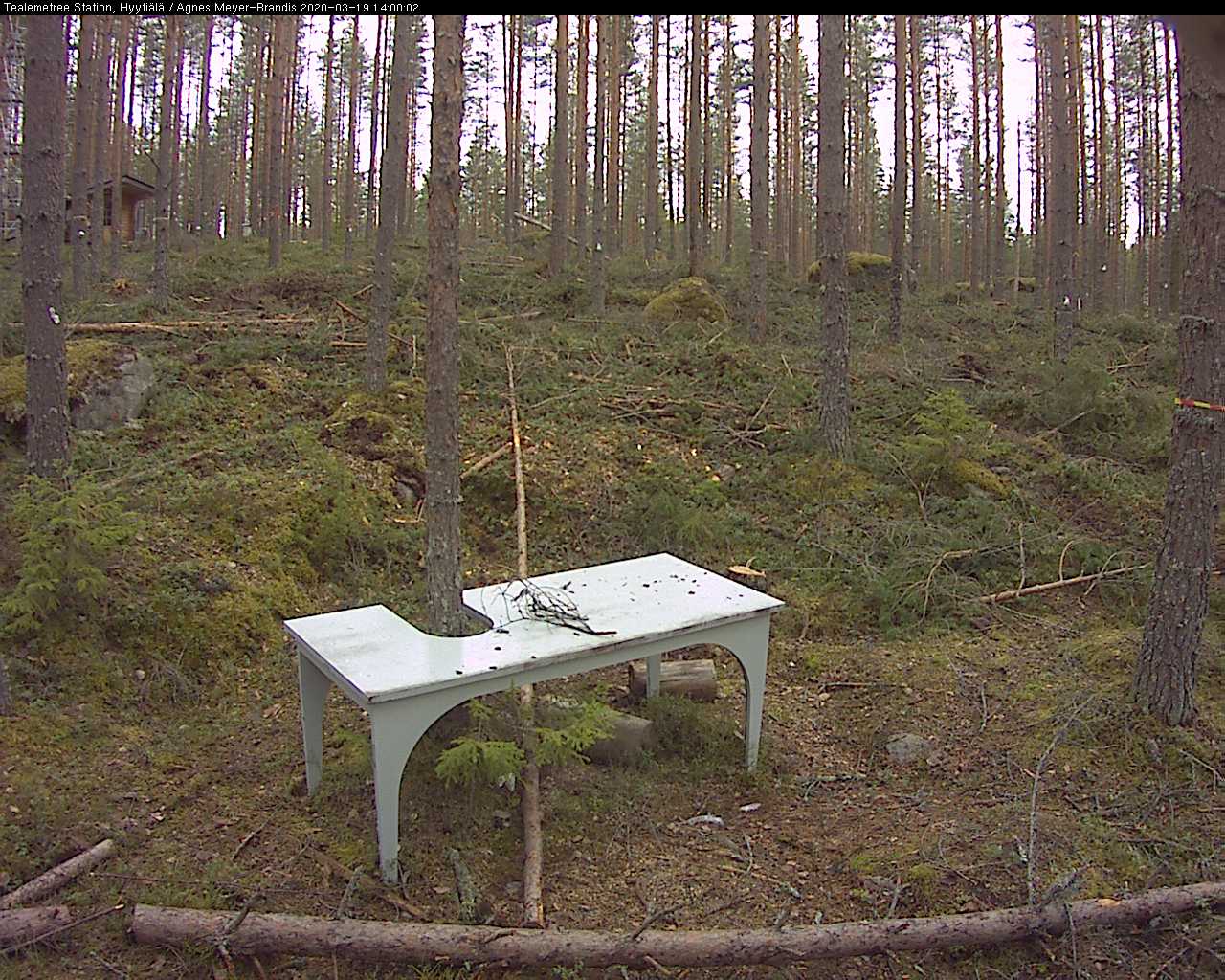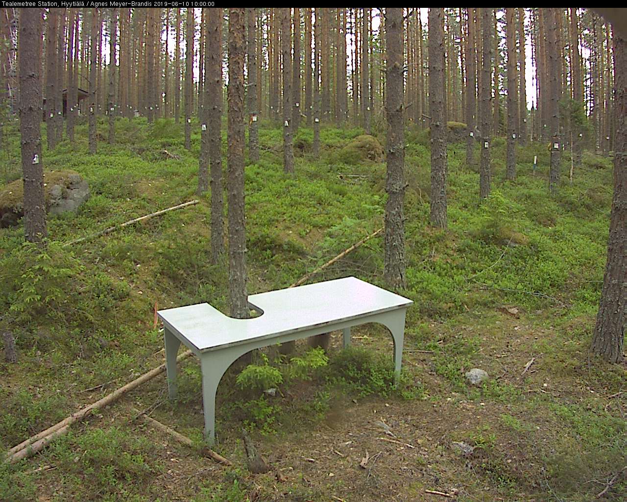 Agnes Meyer-Brandiksen työ Hyytiälässä alkoi tutustumalla aseman muihin tutkijoihin. Pystyäkseen tapaamaan ihmisiä metsässä, hän rakensi pöydän, josta muodostui kohtauspiste ja paikka teehetkille Agneksen ja puun kanssa.