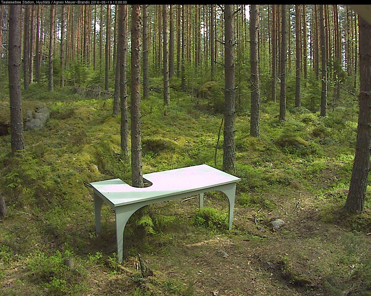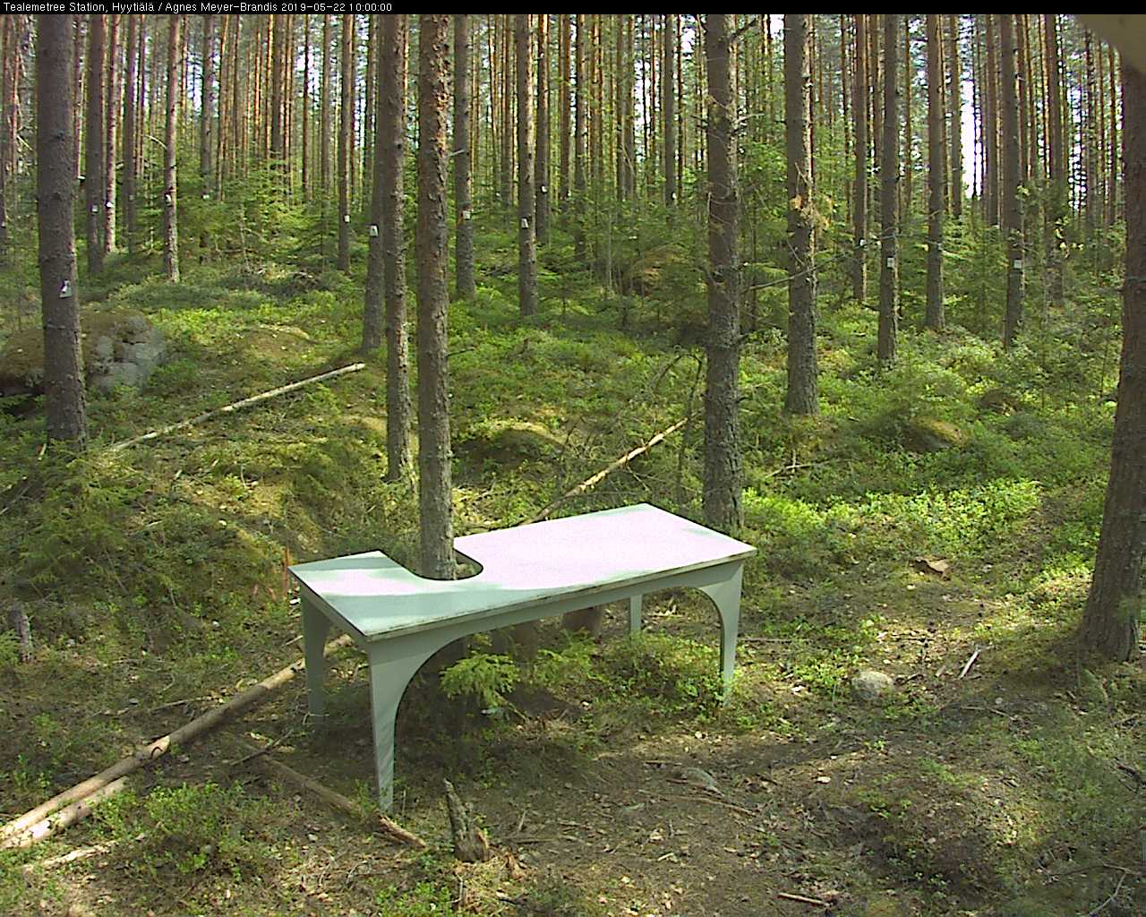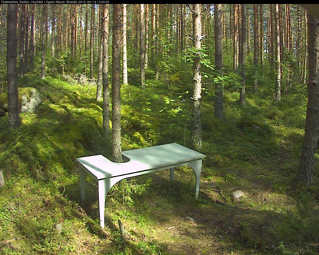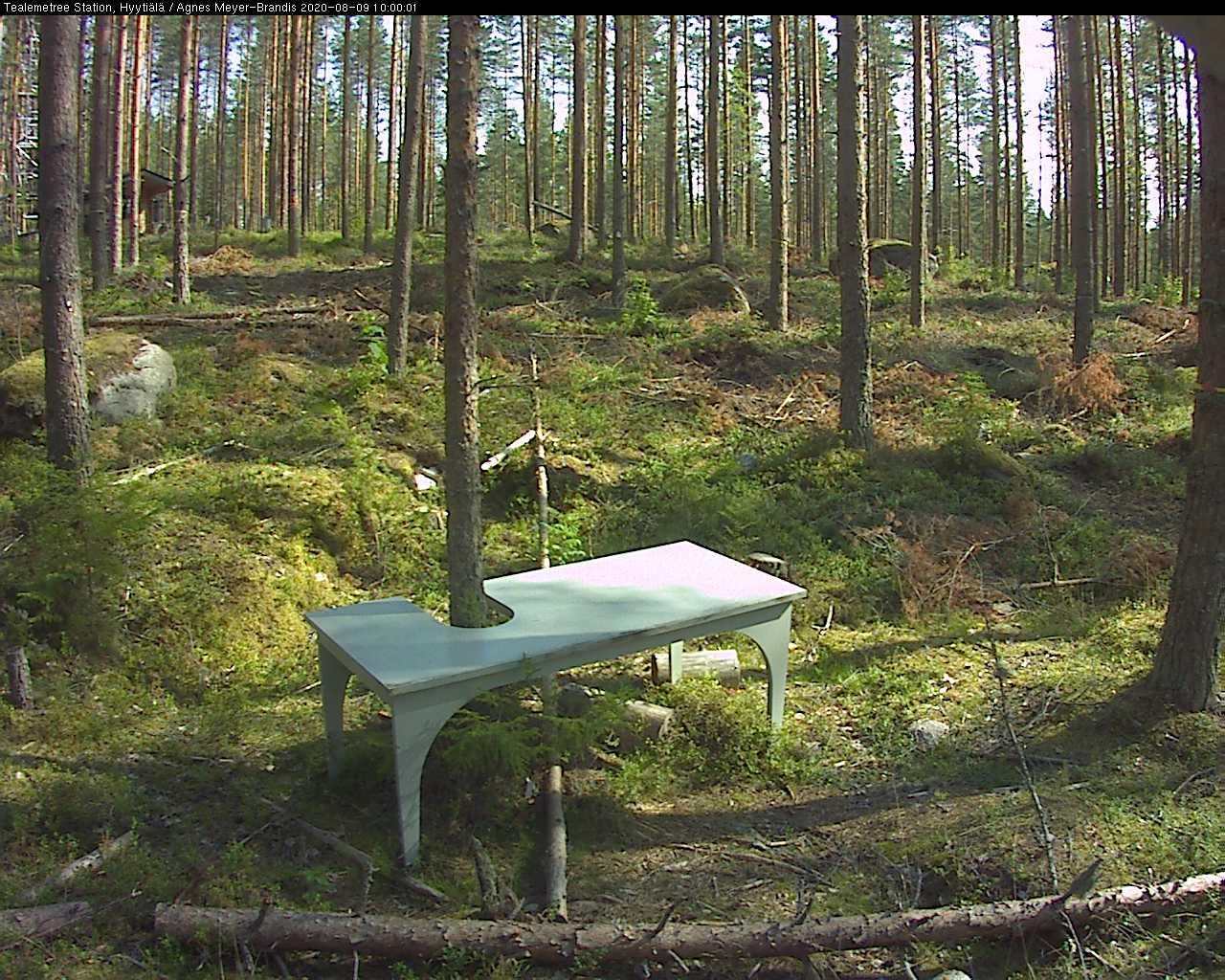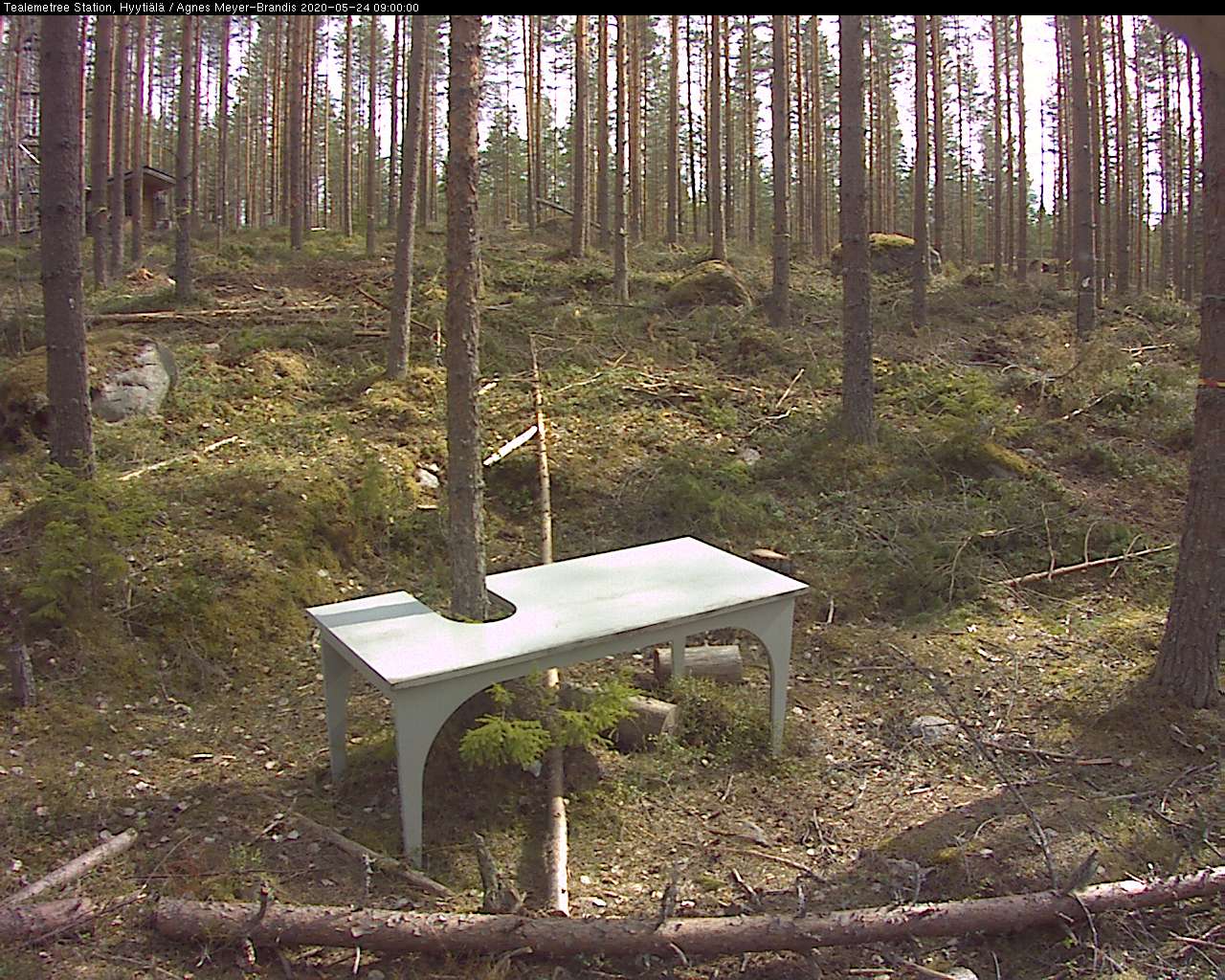 Agnes Meyer-Brandiksen työ Hyytiälässä alkoi tutustumalla aseman muihin tutkijoihin. Pystyäkseen tapaamaan ihmisiä metsässä, hän rakensi pöydän, josta muodostui kohtauspiste ja paikka teehetkille Agneksen ja puun kanssa.
