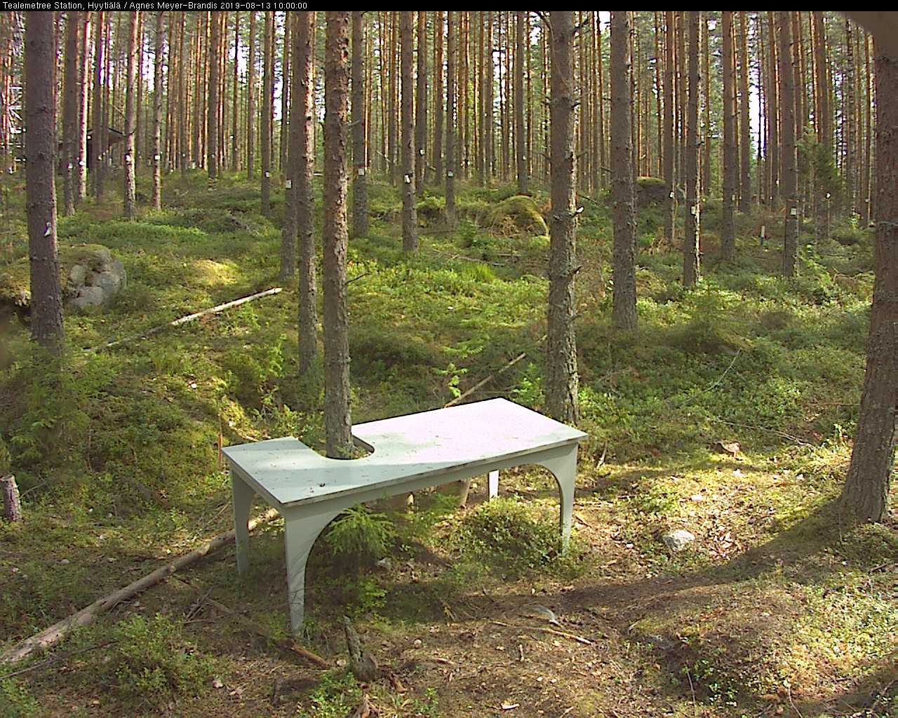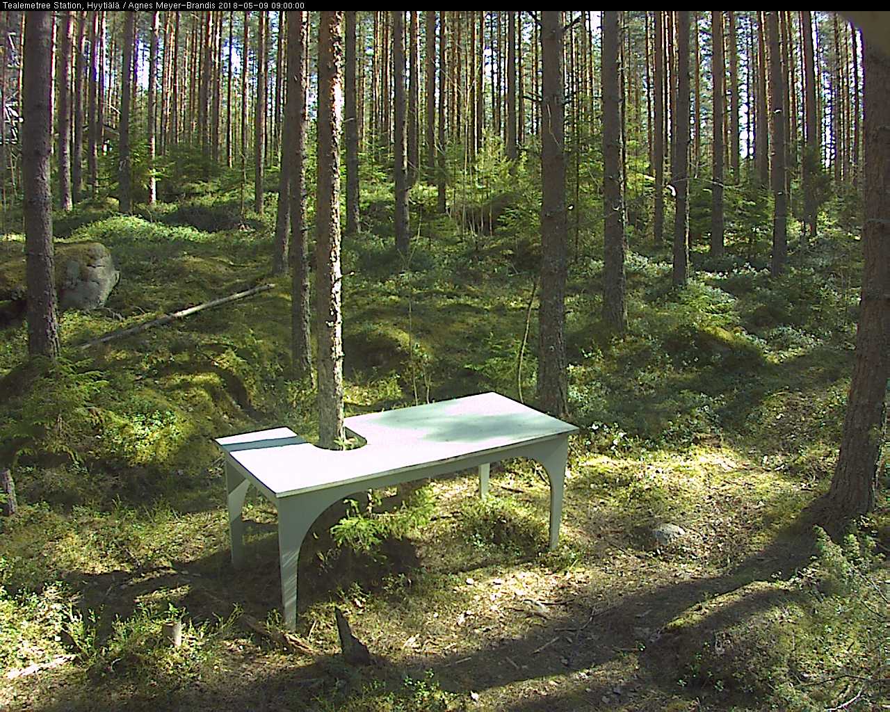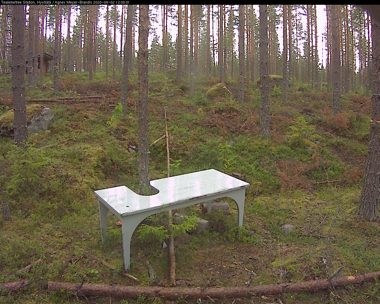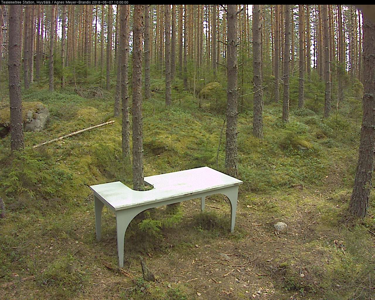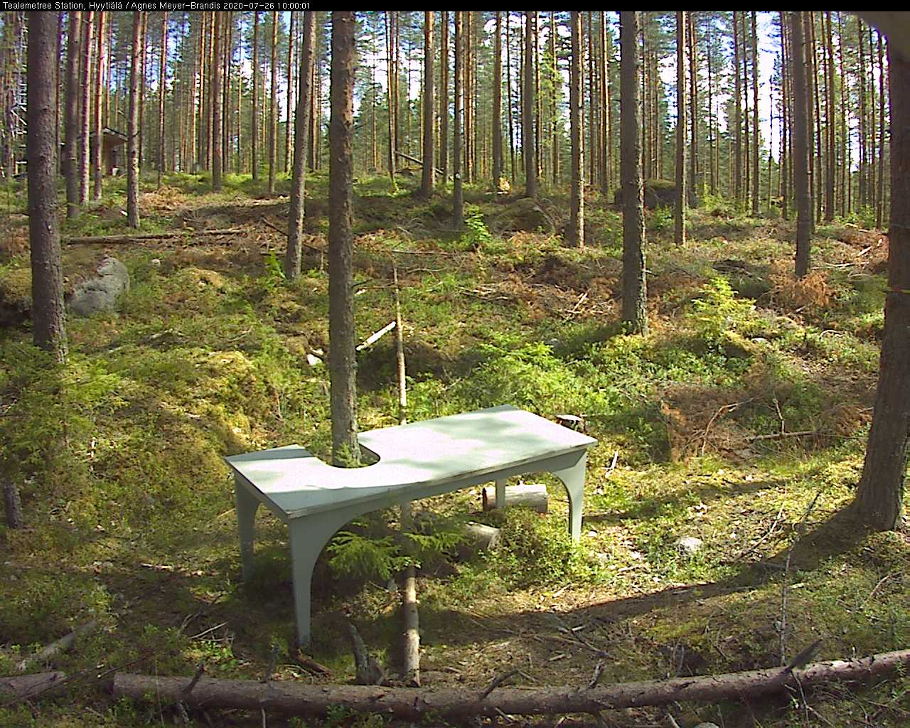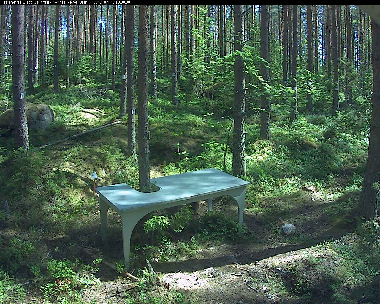 Agnes Meyer-Brandiksen työ Hyytiälässä alkoi tutustumalla aseman muihin tutkijoihin. Pystyäkseen tapaamaan ihmisiä metsässä, hän rakensi pöydän, josta muodostui kohtauspiste ja paikka teehetkille Agneksen ja puun kanssa.
