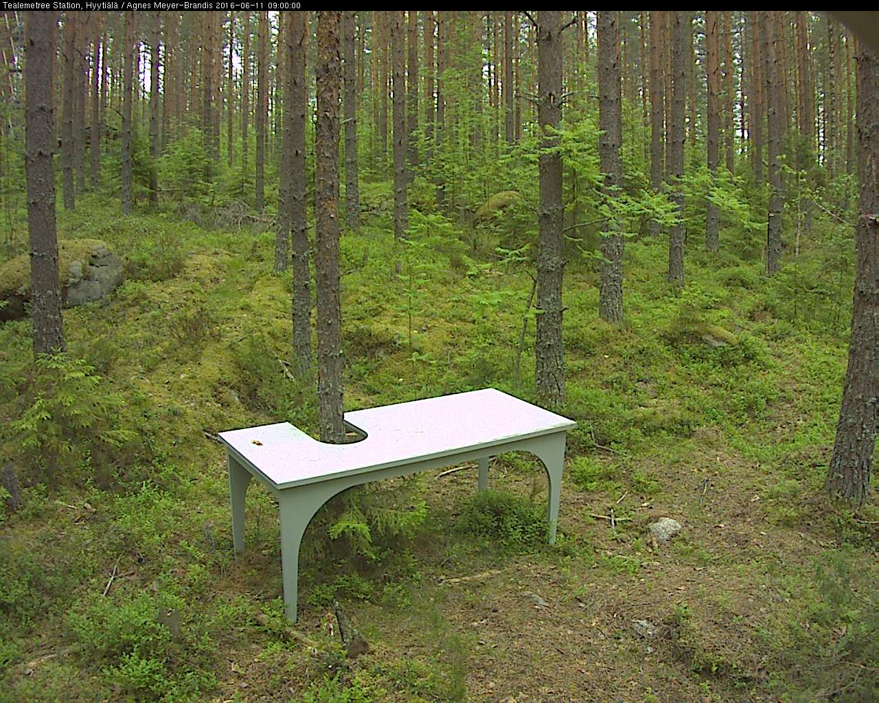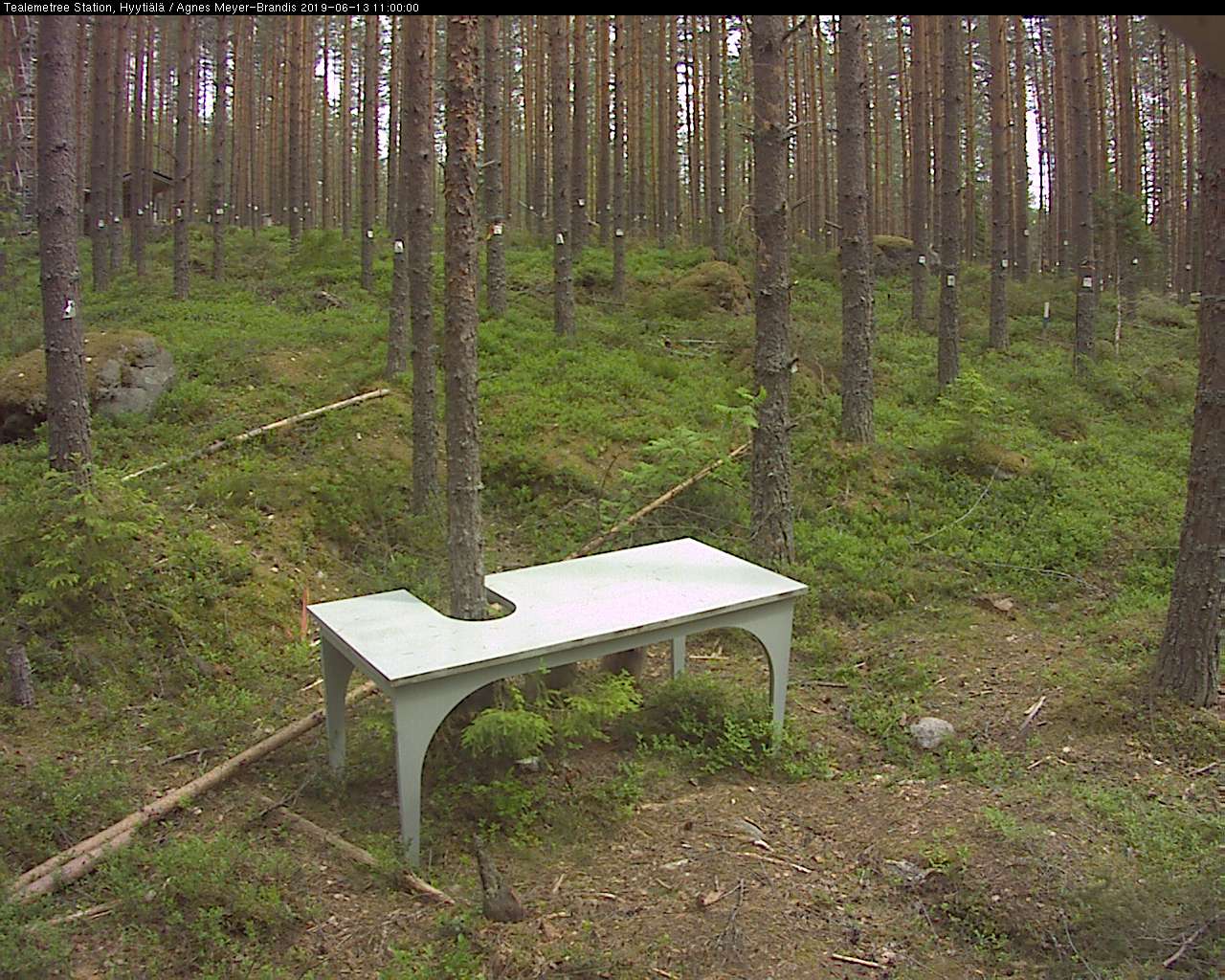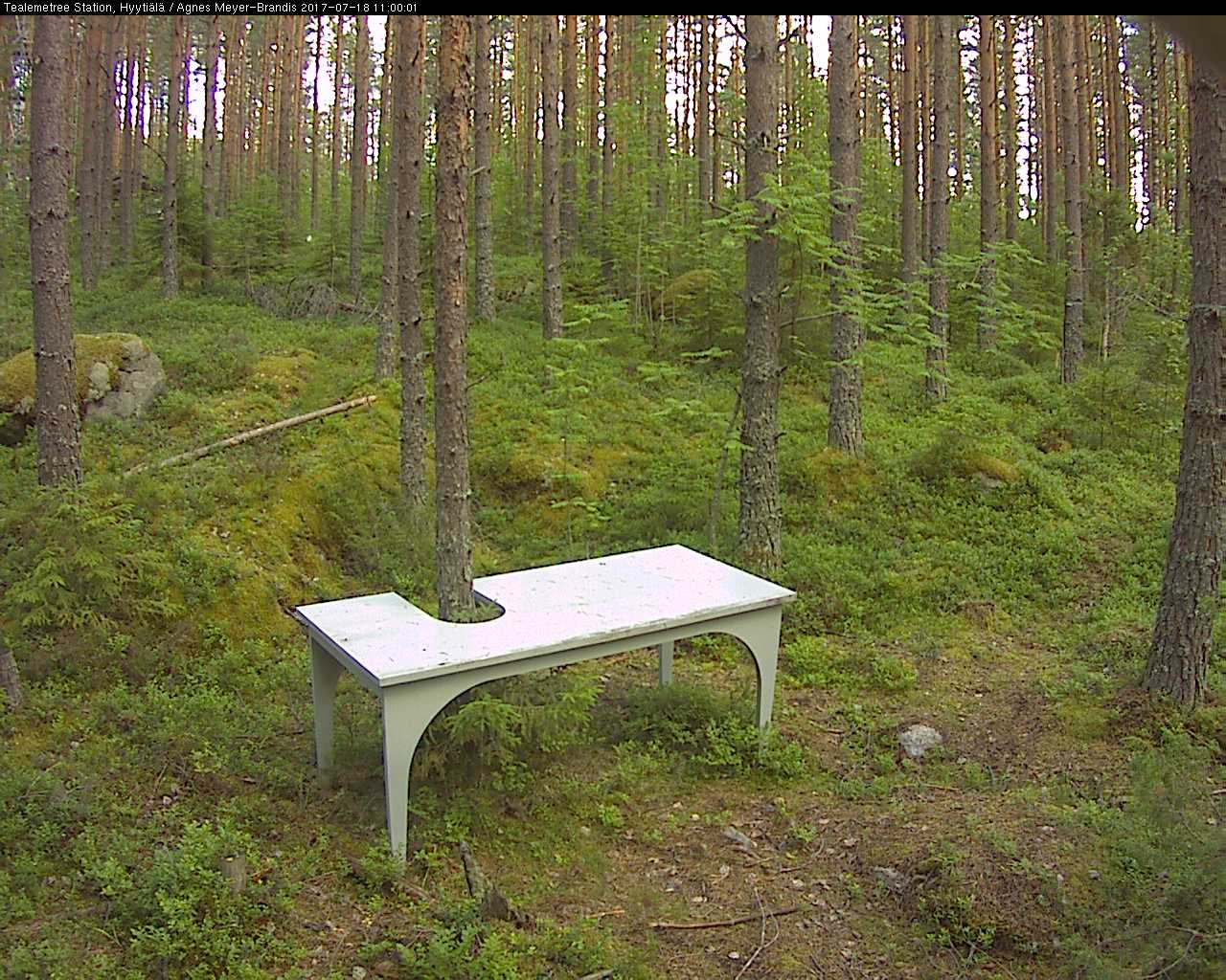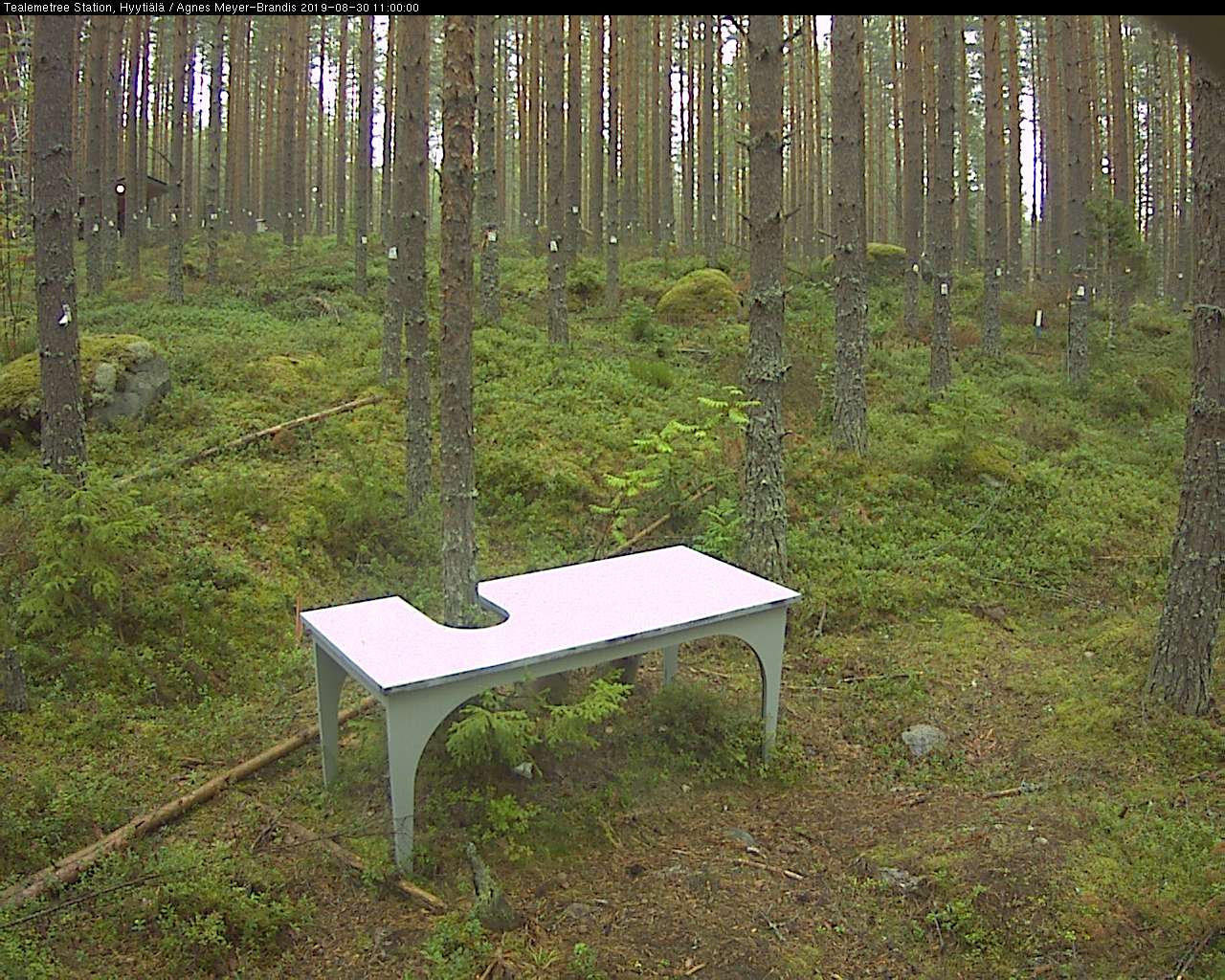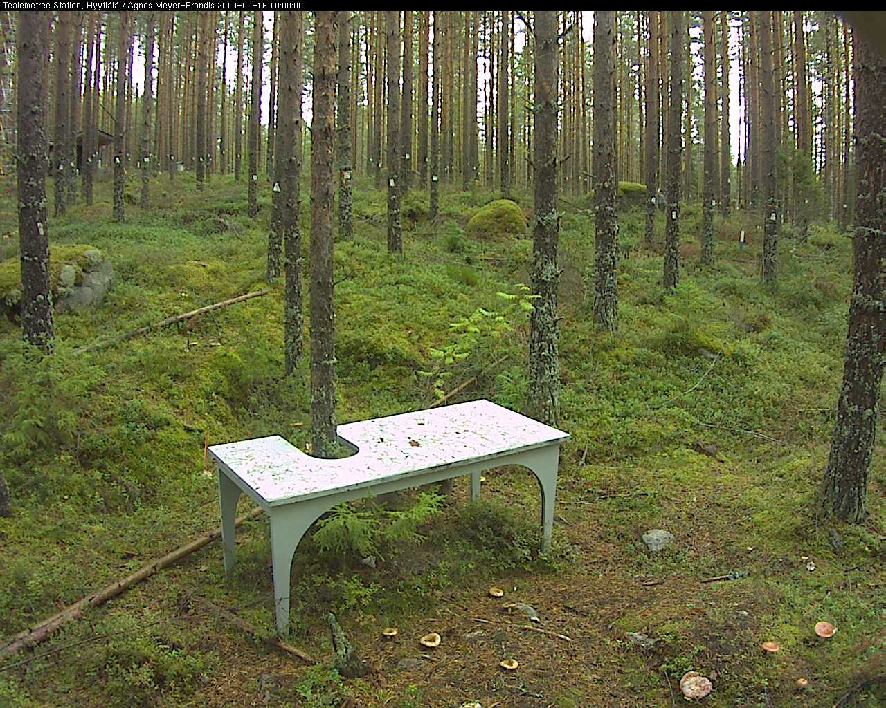 Agnes Meyer-Brandiksen työ Hyytiälässä alkoi tutustumalla aseman muihin tutkijoihin. Pystyäkseen tapaamaan ihmisiä metsässä, hän rakensi pöydän, josta muodostui kohtauspiste ja paikka teehetkille Agneksen ja puun kanssa.