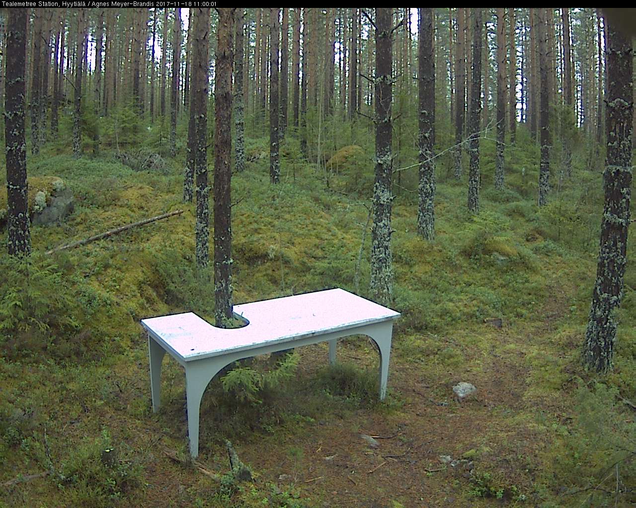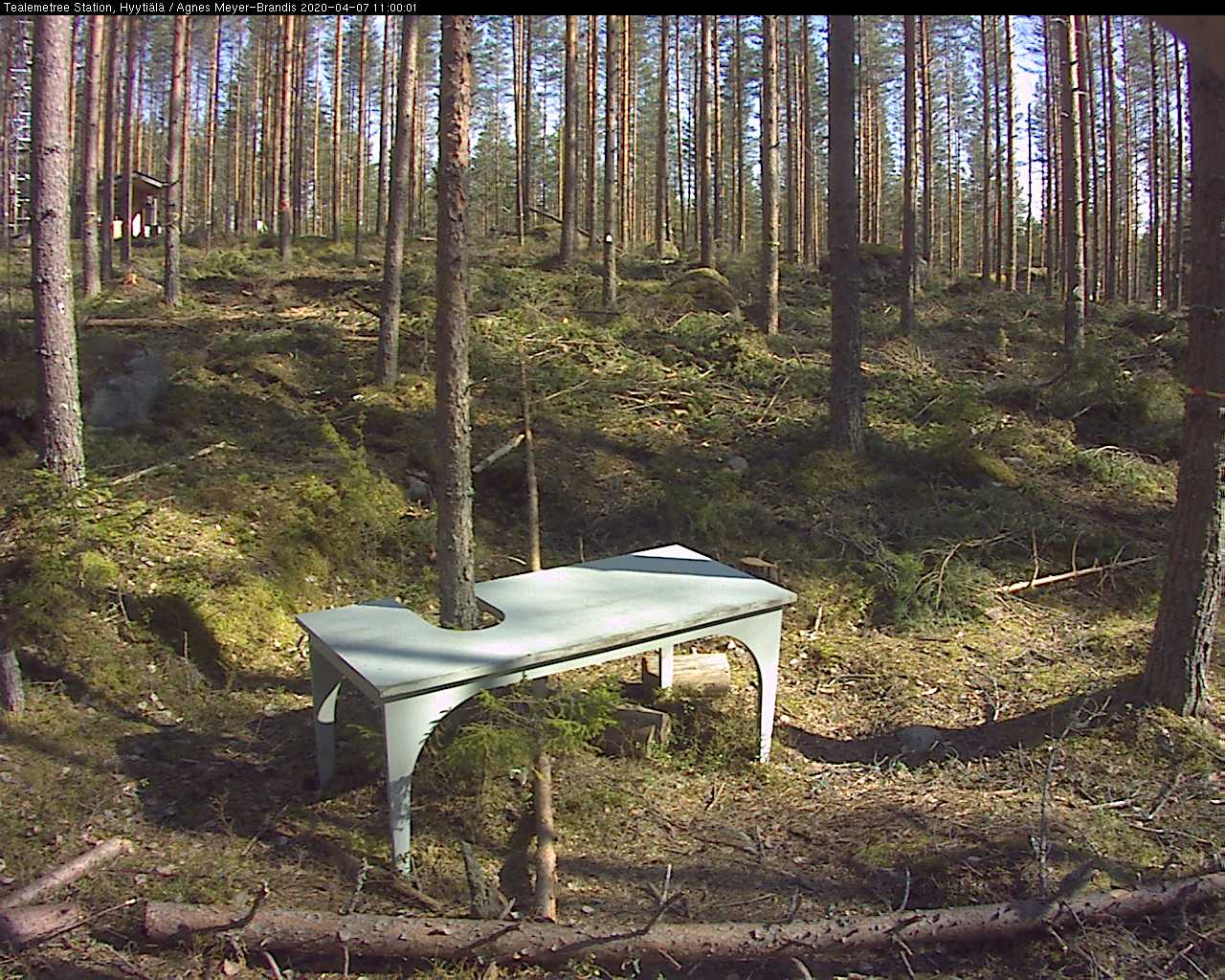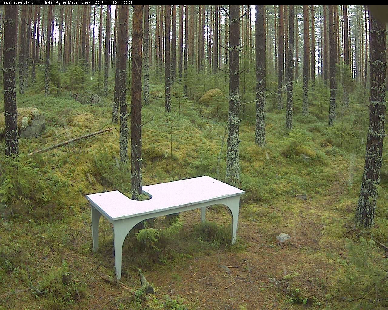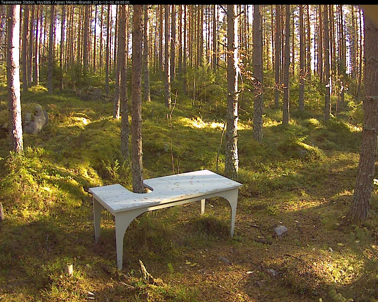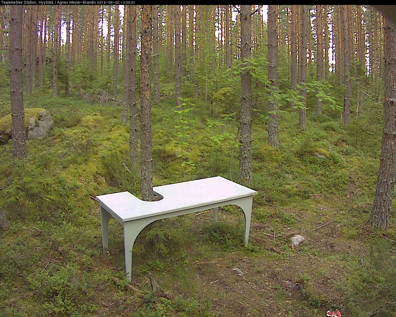 Agnes Meyer-Brandiksen työ Hyytiälässä alkoi tutustumalla aseman muihin tutkijoihin. Pystyäkseen tapaamaan ihmisiä metsässä, hän rakensi pöydän, josta muodostui kohtauspiste ja paikka teehetkille Agneksen ja puun kanssa.
