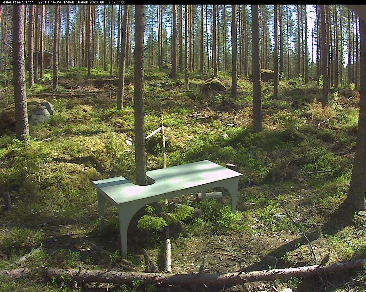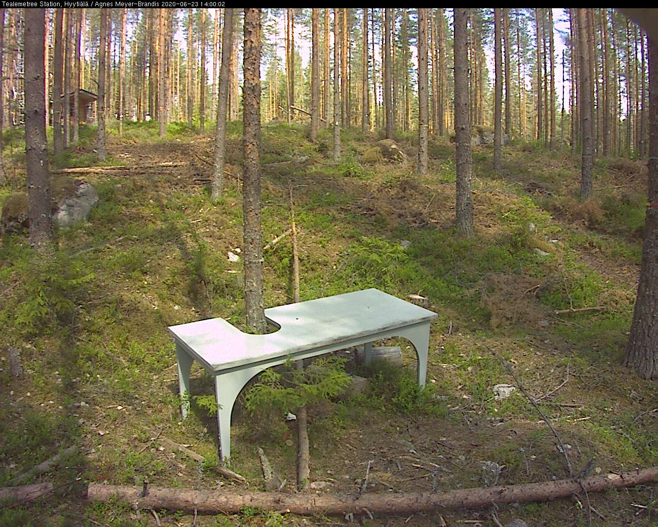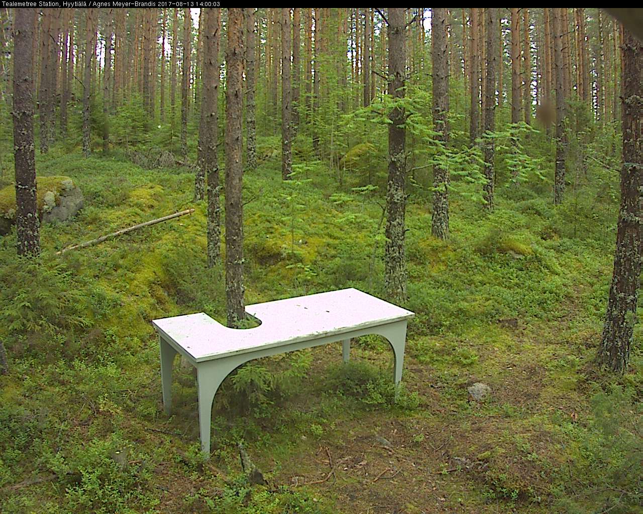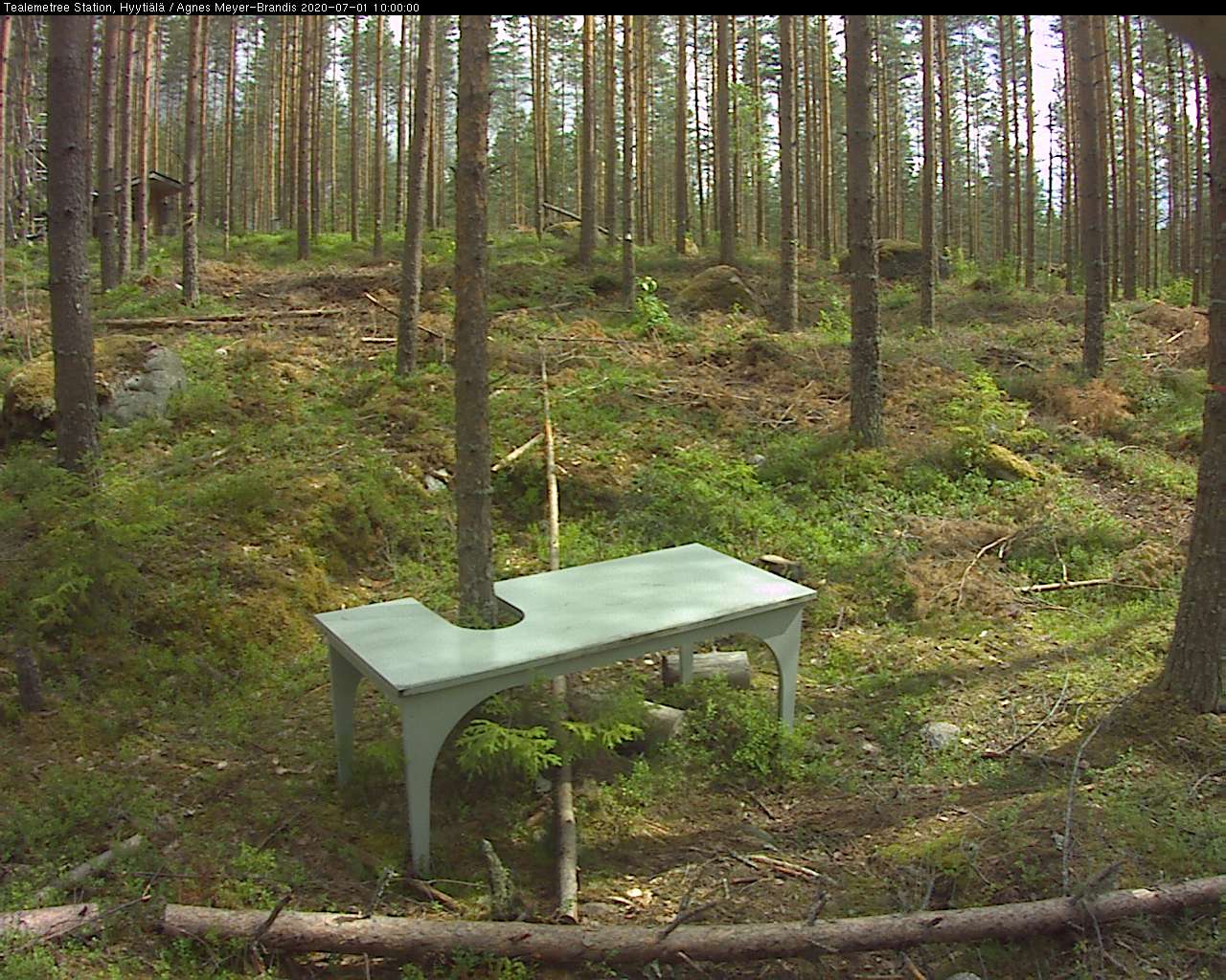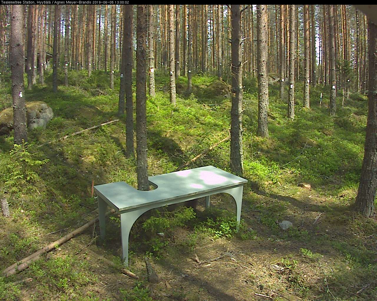 Agnes Meyer-Brandiksen työ Hyytiälässä alkoi tutustumalla aseman muihin tutkijoihin. Pystyäkseen tapaamaan ihmisiä metsässä, hän rakensi pöydän, josta muodostui kohtauspiste ja paikka teehetkille Agneksen ja puun kanssa.