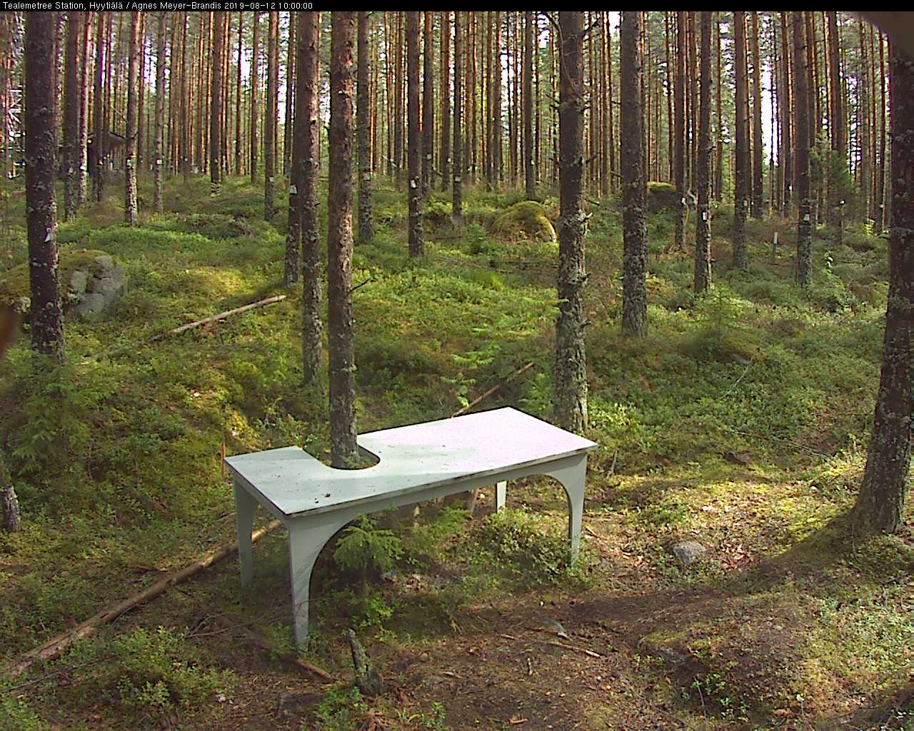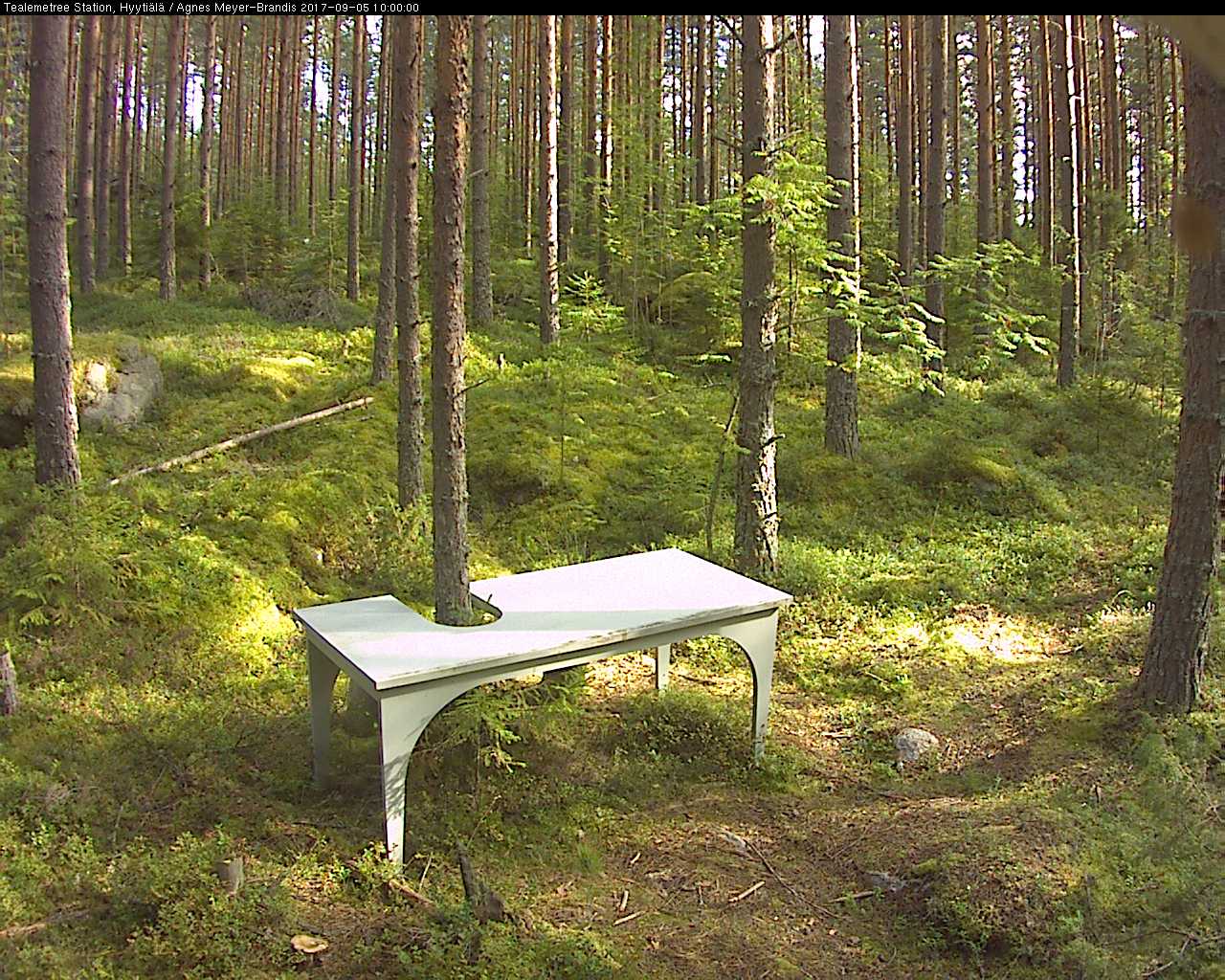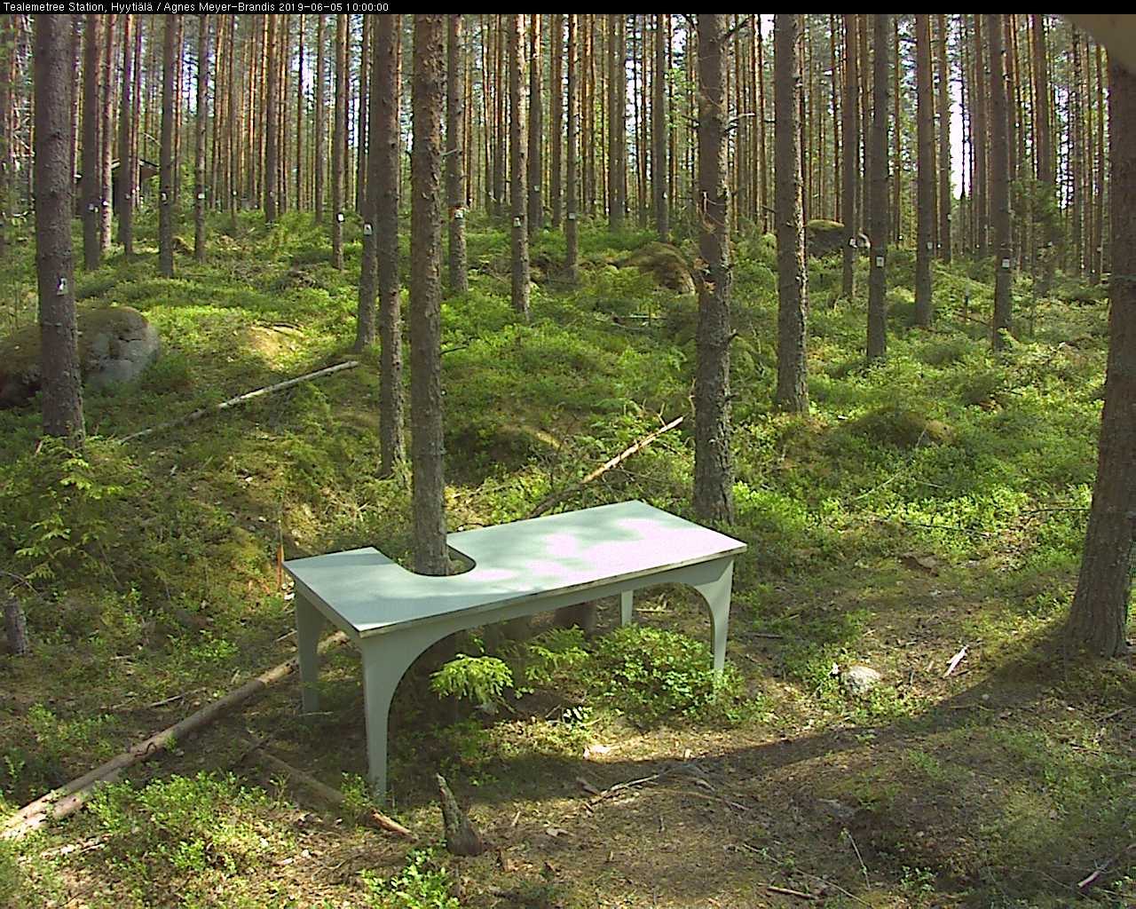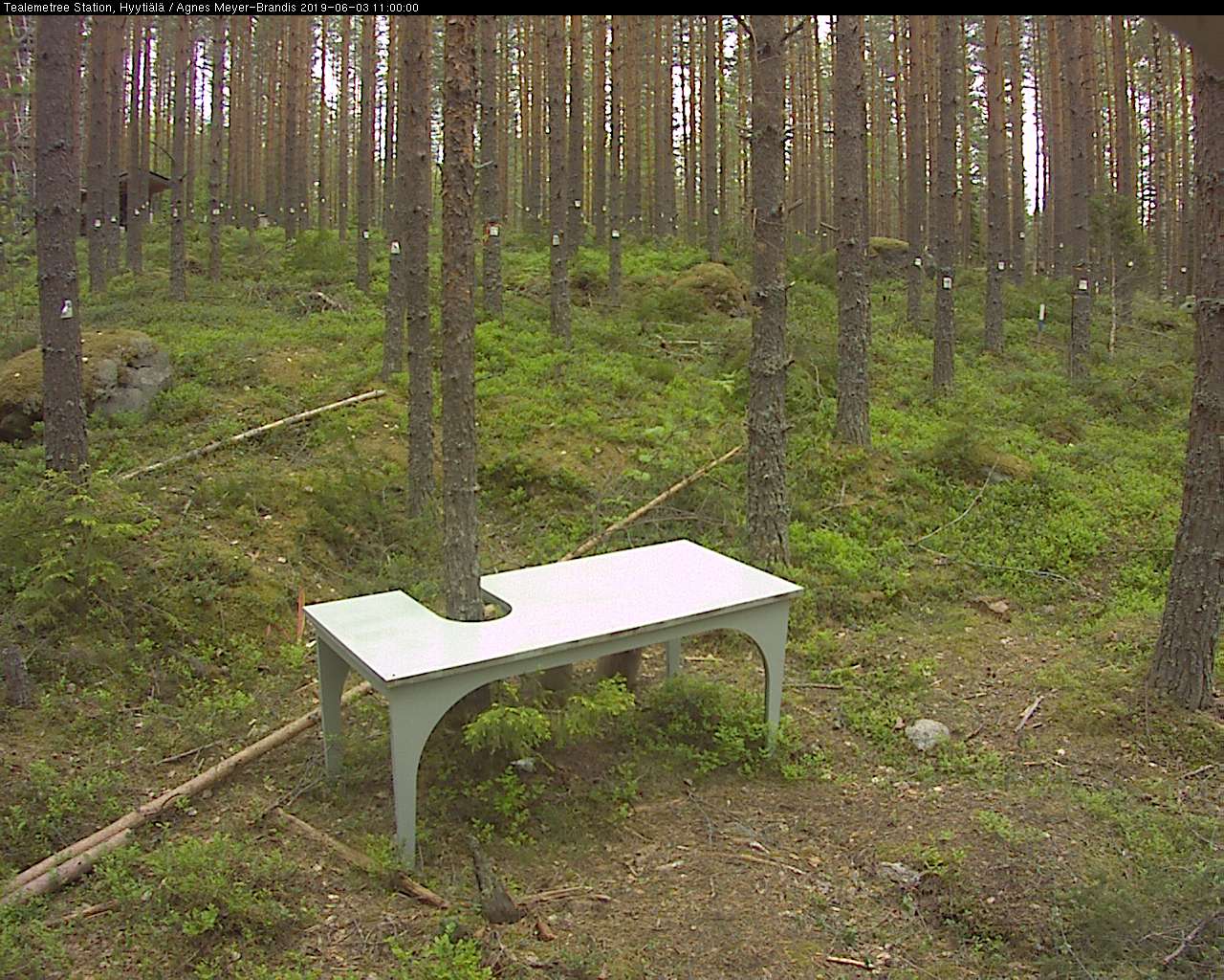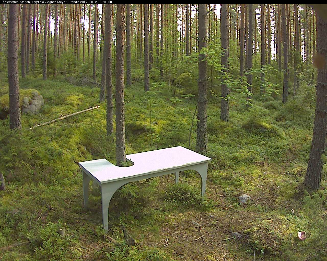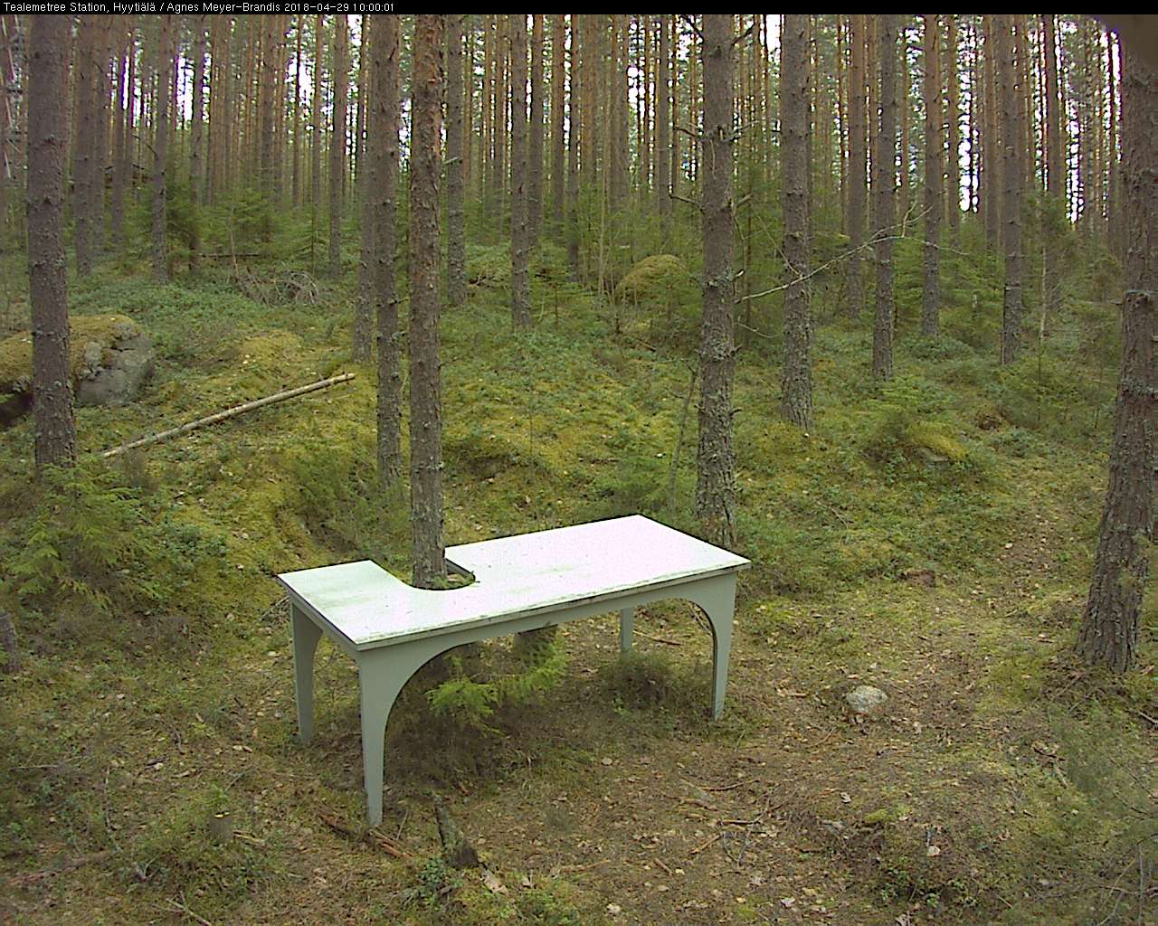 Agnes Meyer-Brandiksen työ Hyytiälässä alkoi tutustumalla aseman muihin tutkijoihin. Pystyäkseen tapaamaan ihmisiä metsässä, hän rakensi pöydän, josta muodostui kohtauspiste ja paikka teehetkille Agneksen ja puun kanssa.