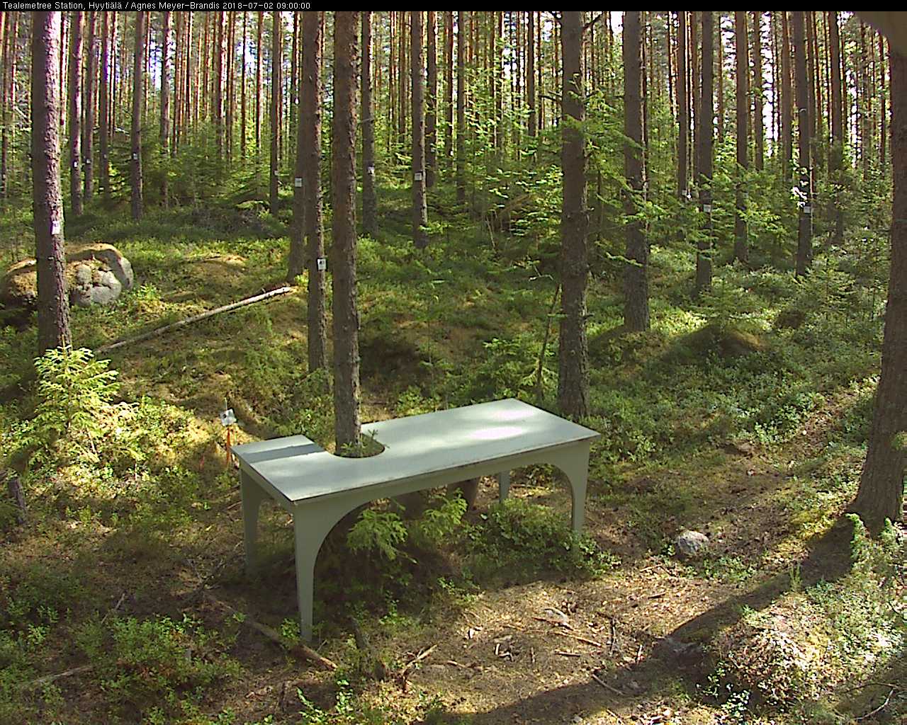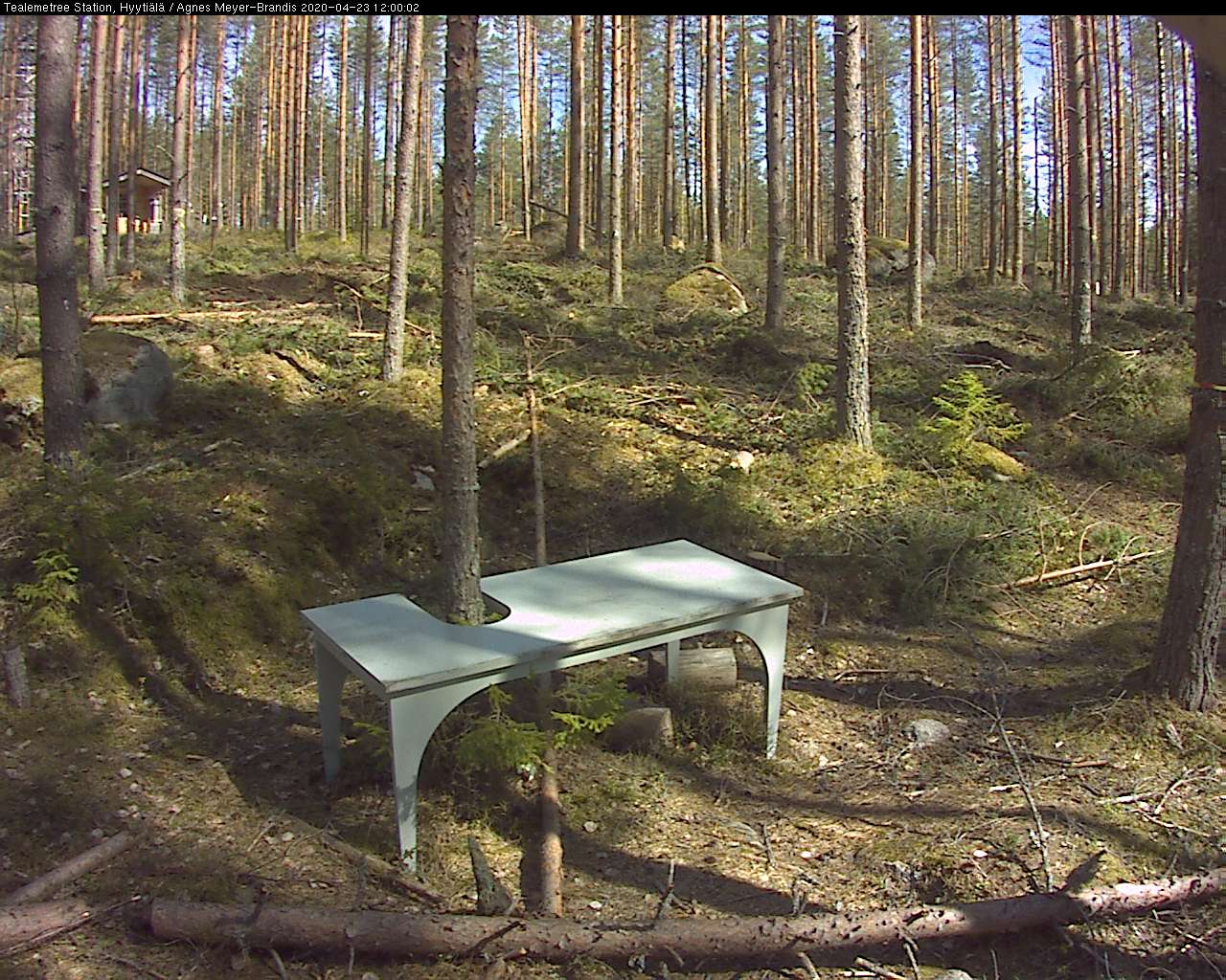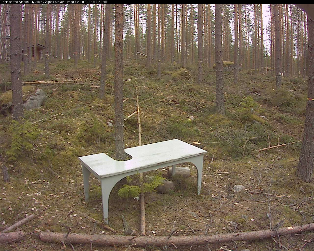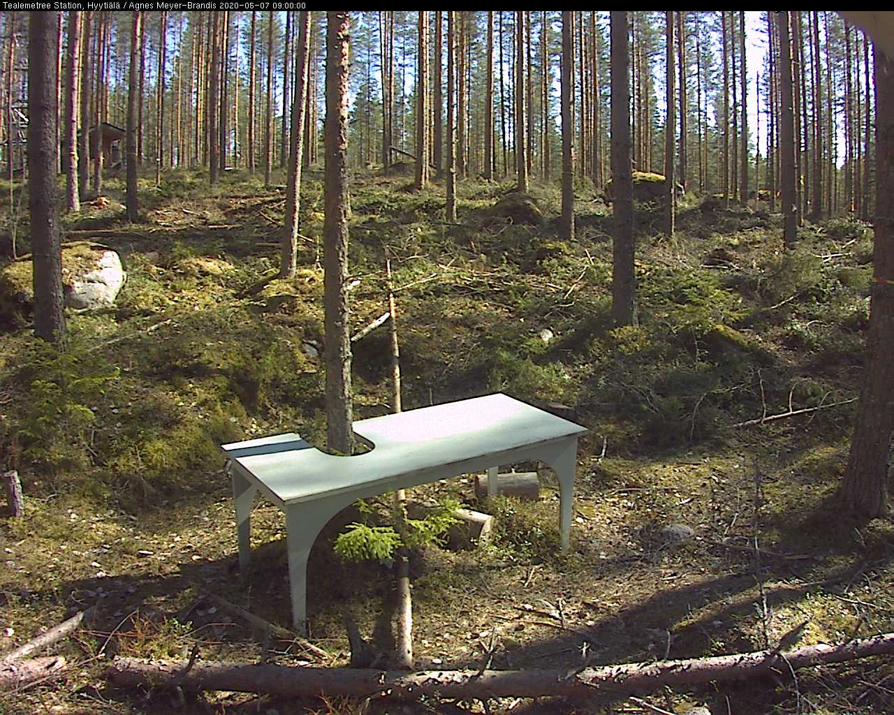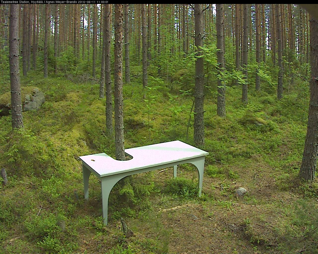 Agnes Meyer-Brandiksen työ Hyytiälässä alkoi tutustumalla aseman muihin tutkijoihin. Pystyäkseen tapaamaan ihmisiä metsässä, hän rakensi pöydän, josta muodostui kohtauspiste ja paikka teehetkille Agneksen ja puun kanssa.