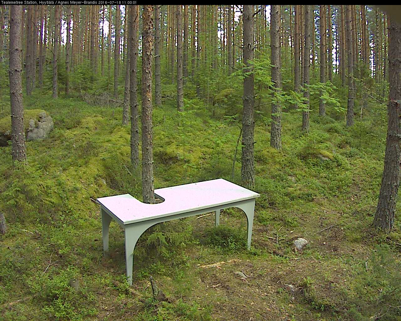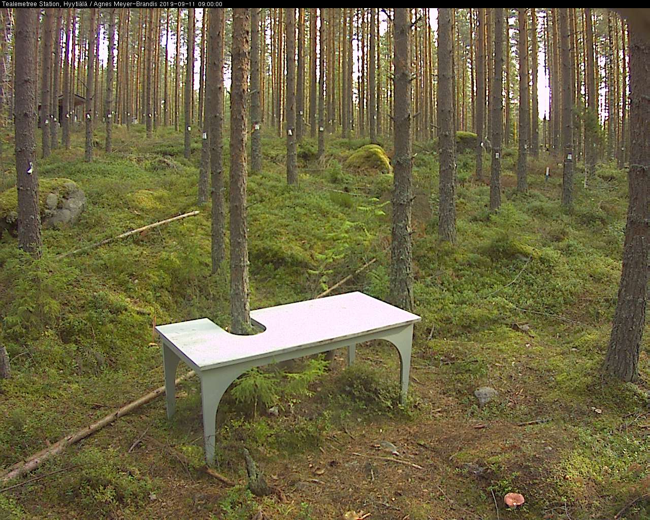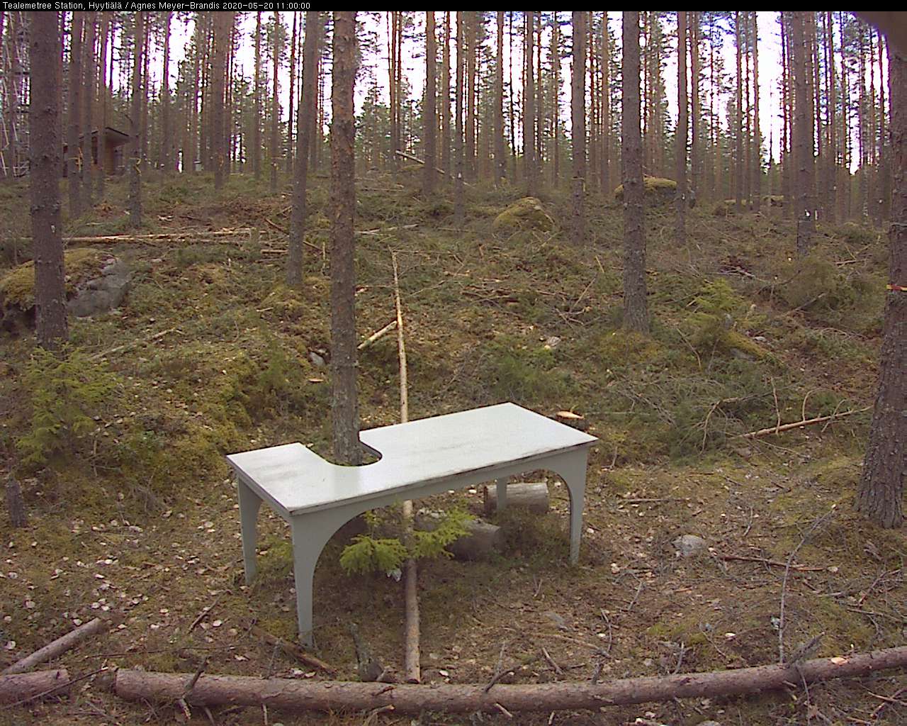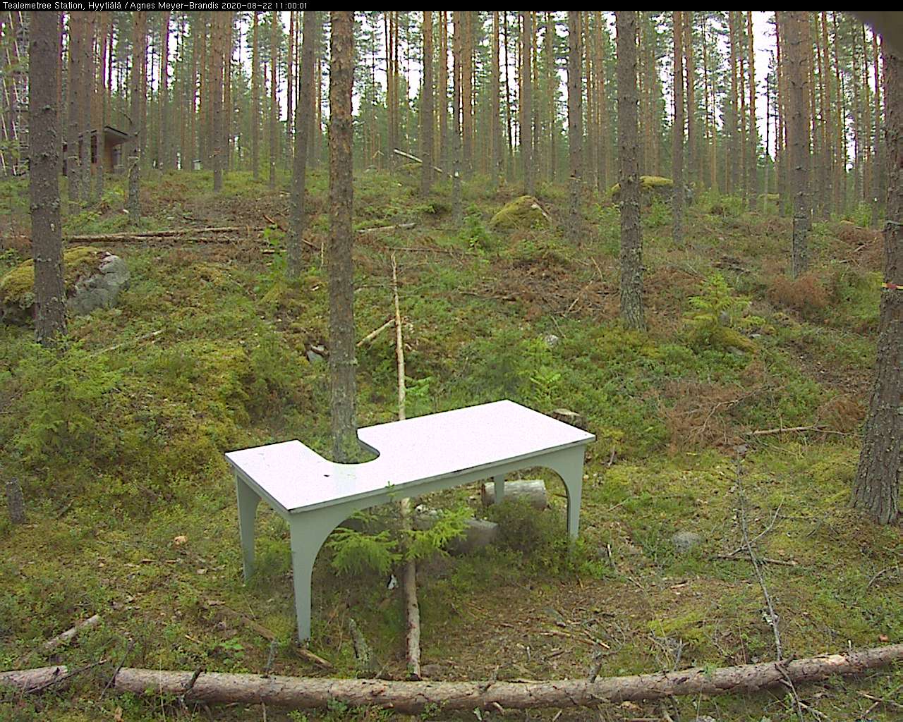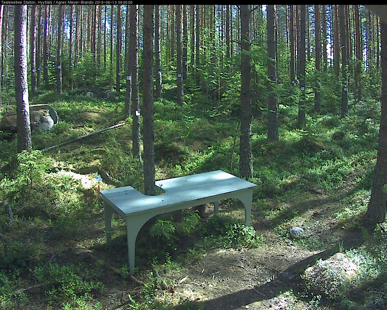 Agnes Meyer-Brandiksen työ Hyytiälässä alkoi tutustumalla aseman muihin tutkijoihin. Pystyäkseen tapaamaan ihmisiä metsässä, hän rakensi pöydän, josta muodostui kohtauspiste ja paikka teehetkille Agneksen ja puun kanssa.