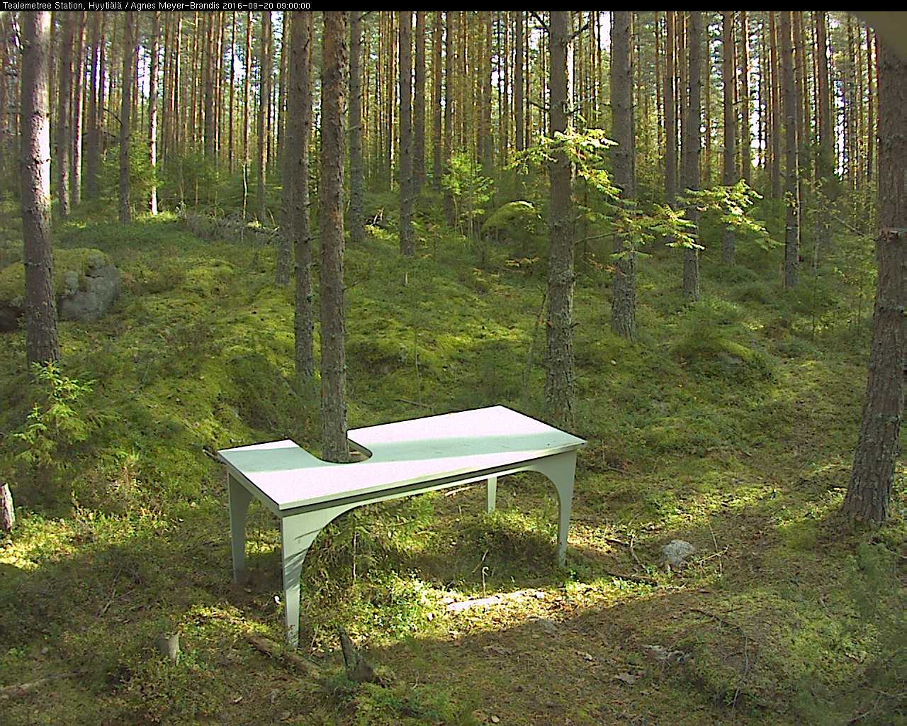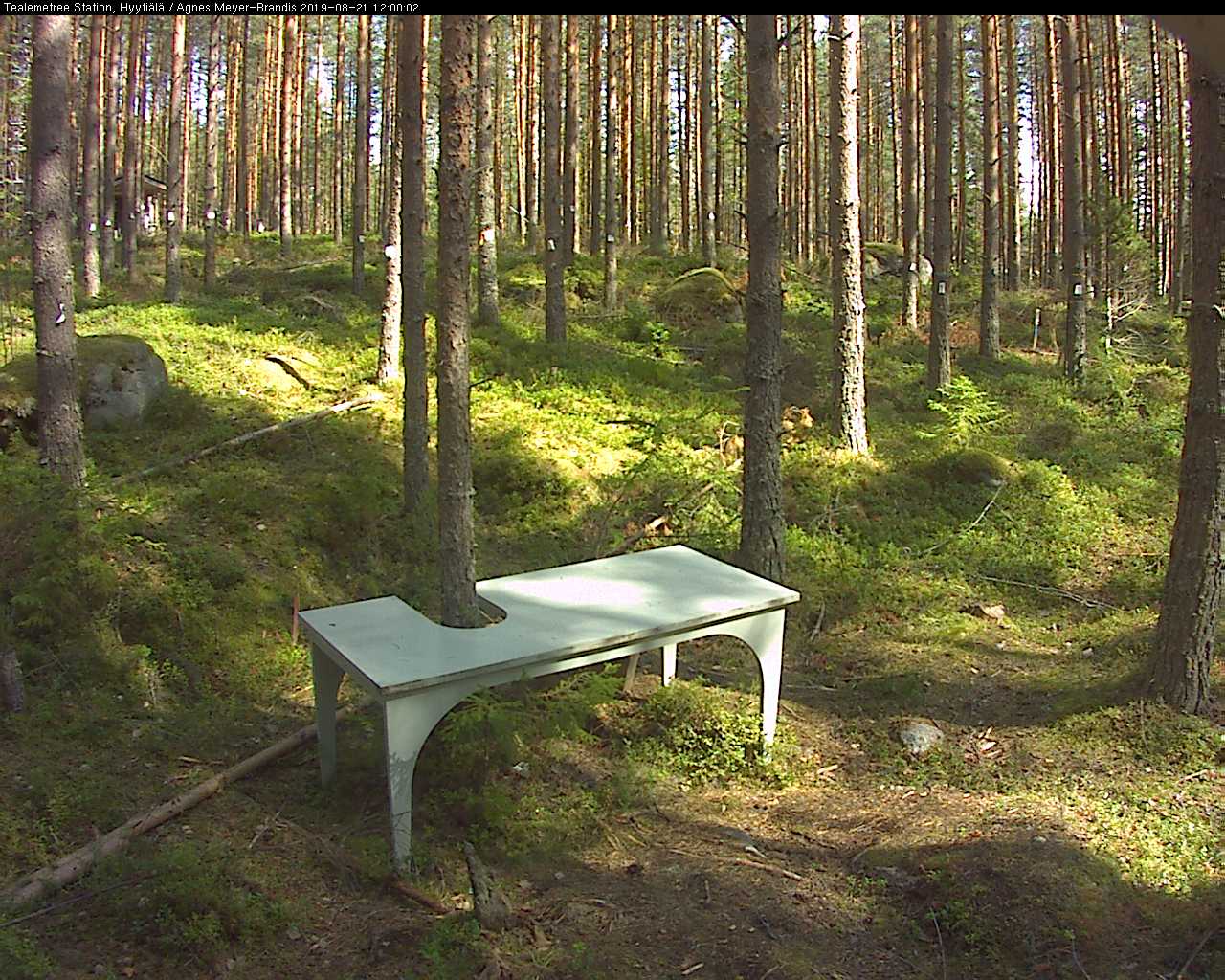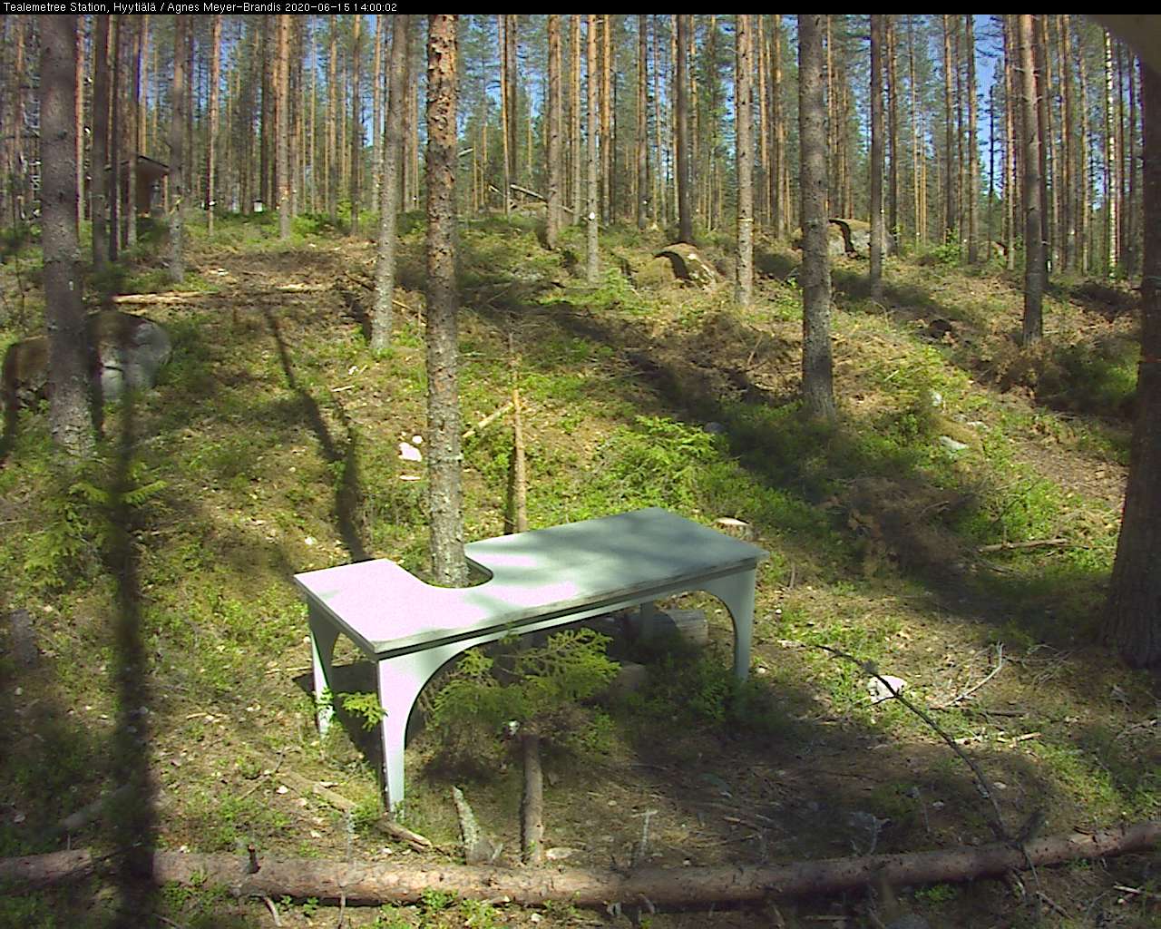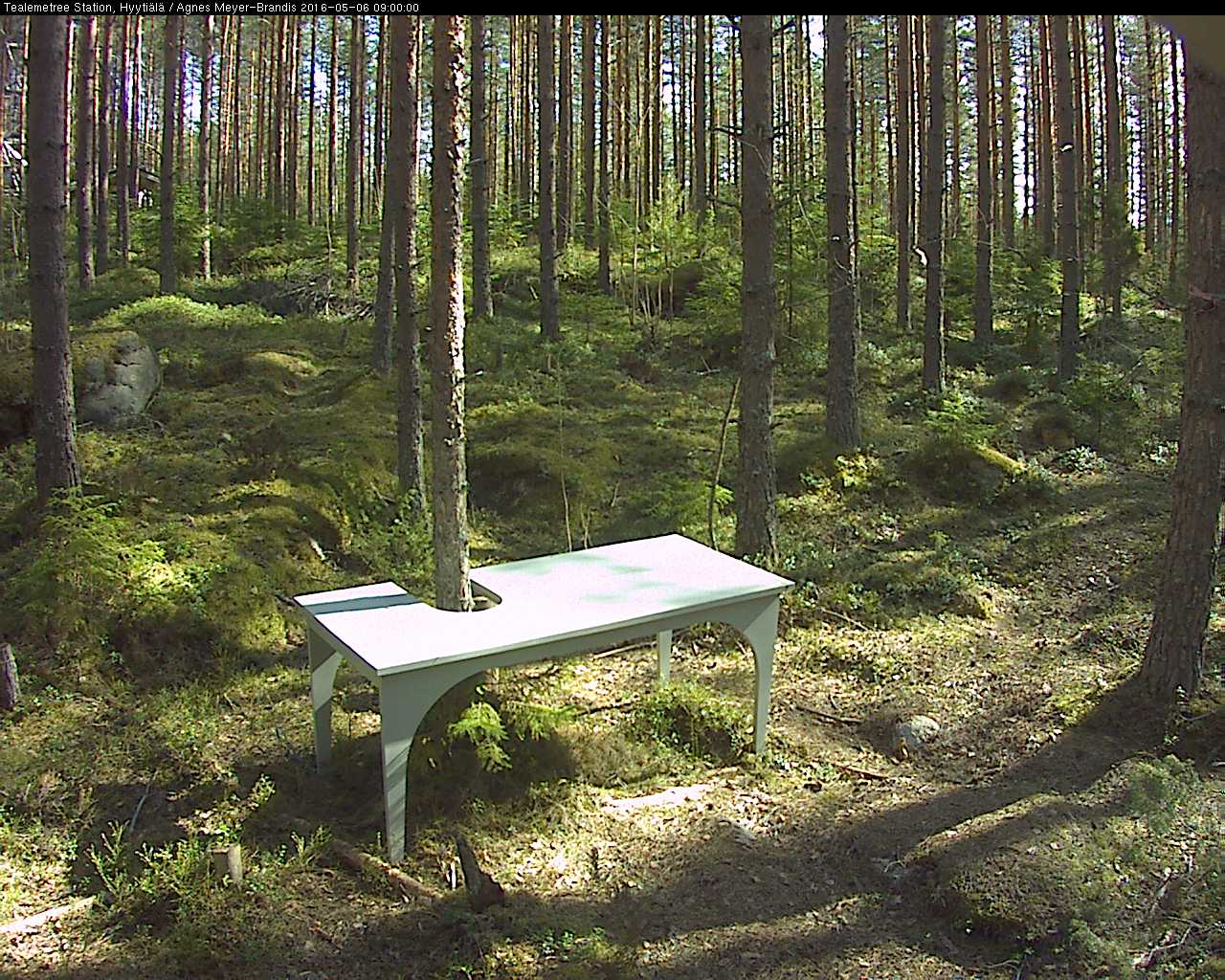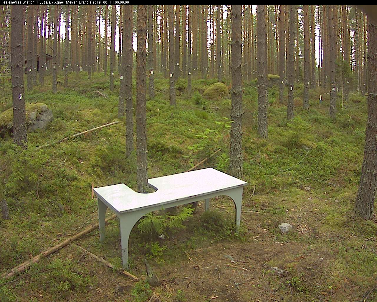 Agnes Meyer-Brandiksen työ Hyytiälässä alkoi tutustumalla aseman muihin tutkijoihin. Pystyäkseen tapaamaan ihmisiä metsässä, hän rakensi pöydän, josta muodostui kohtauspiste ja paikka teehetkille Agneksen ja puun kanssa.