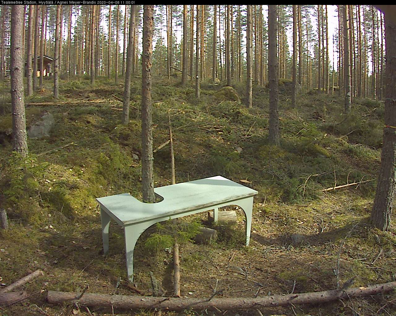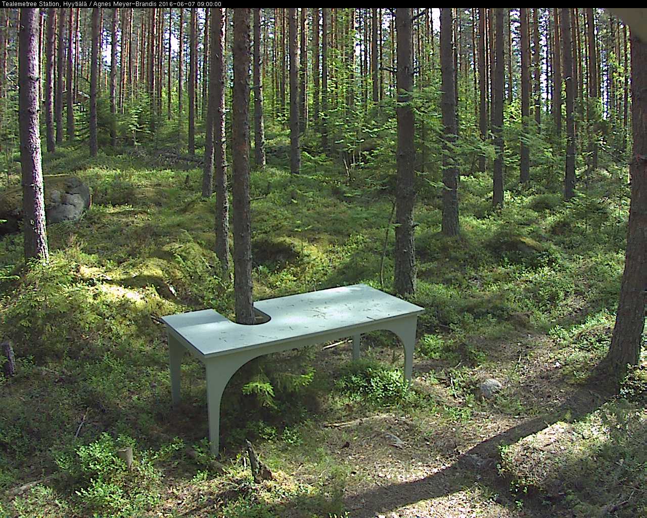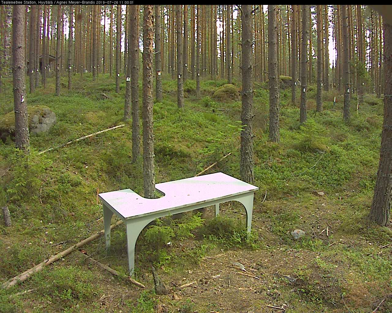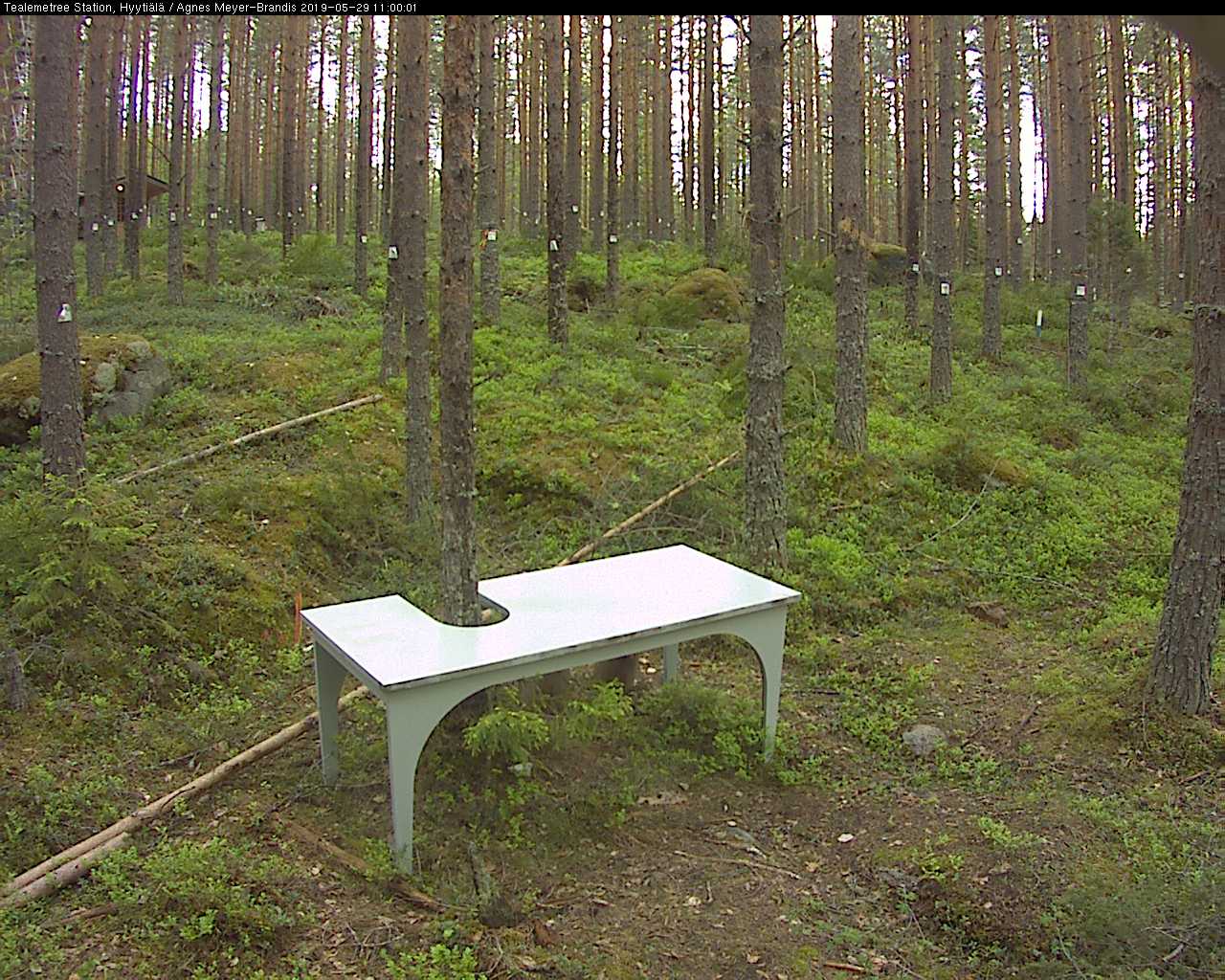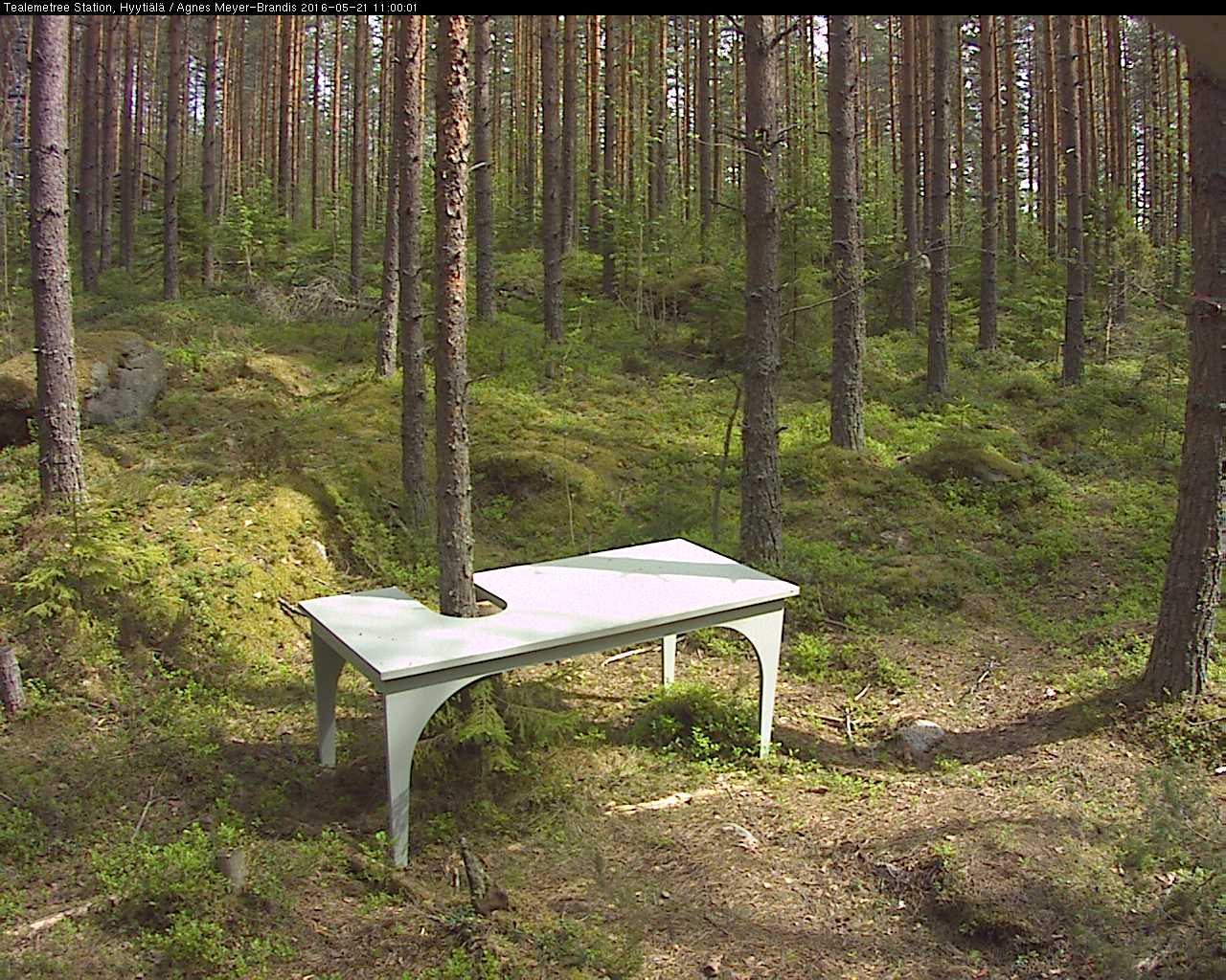 Agnes Meyer-Brandiksen työ Hyytiälässä alkoi tutustumalla aseman muihin tutkijoihin. Pystyäkseen tapaamaan ihmisiä metsässä, hän rakensi pöydän, josta muodostui kohtauspiste ja paikka teehetkille Agneksen ja puun kanssa.