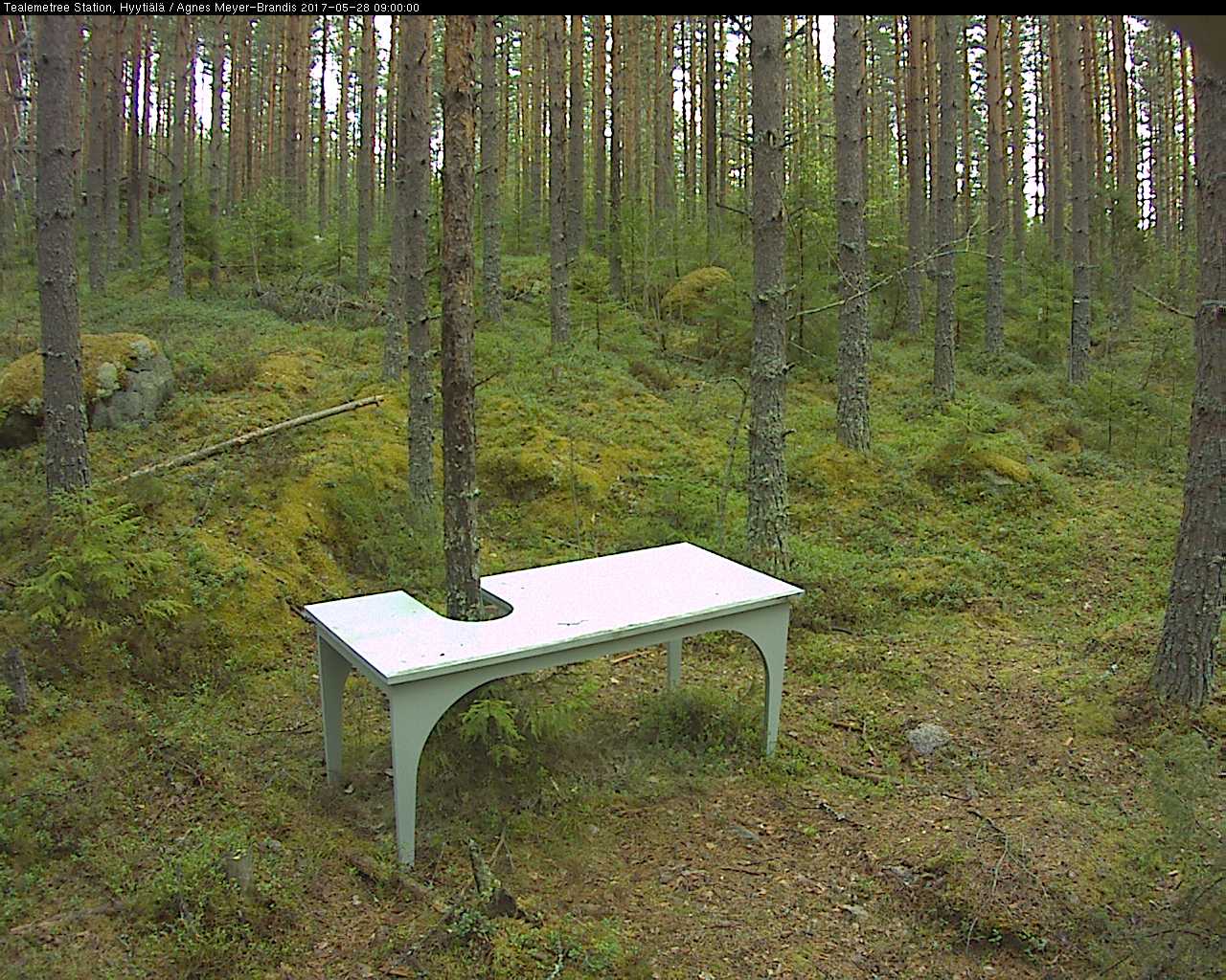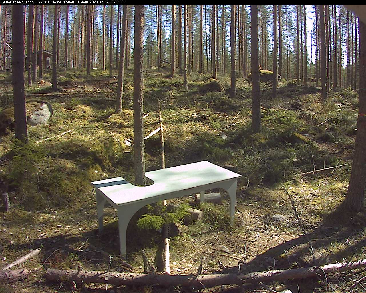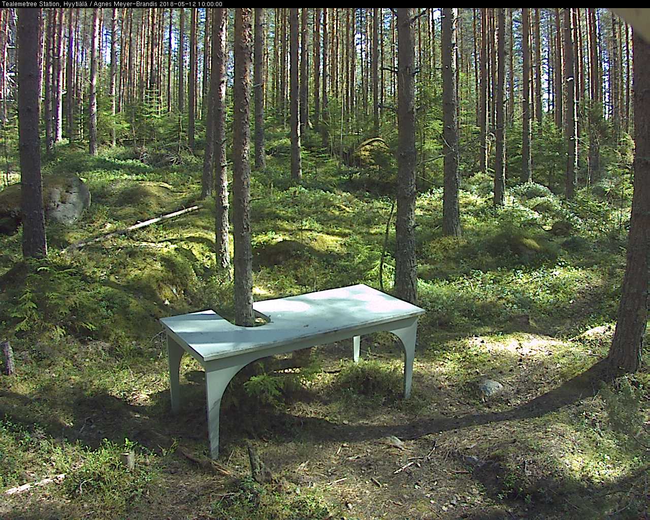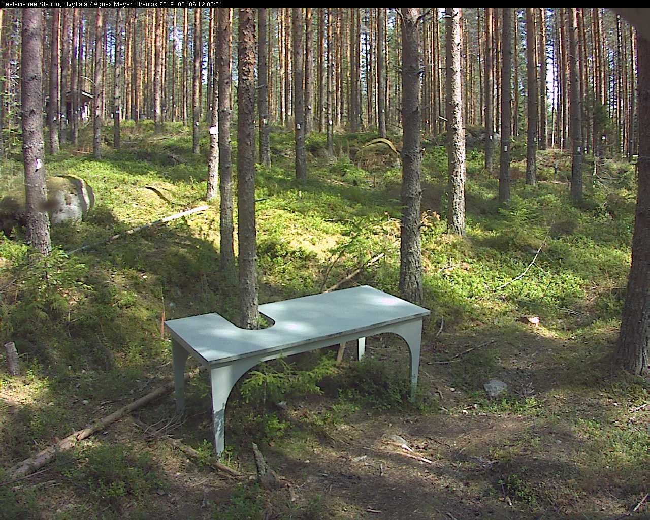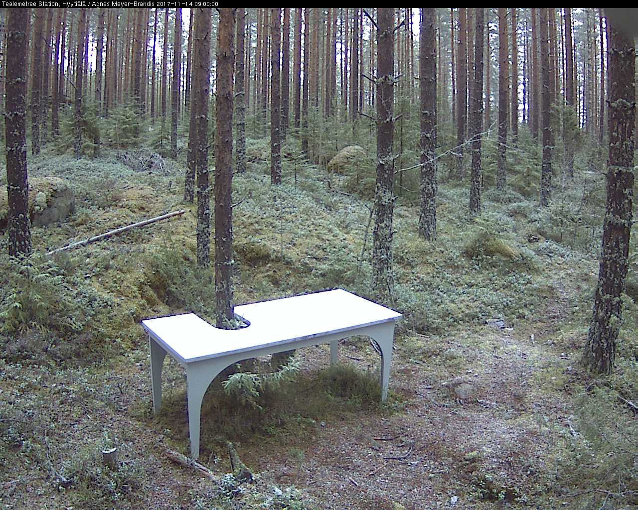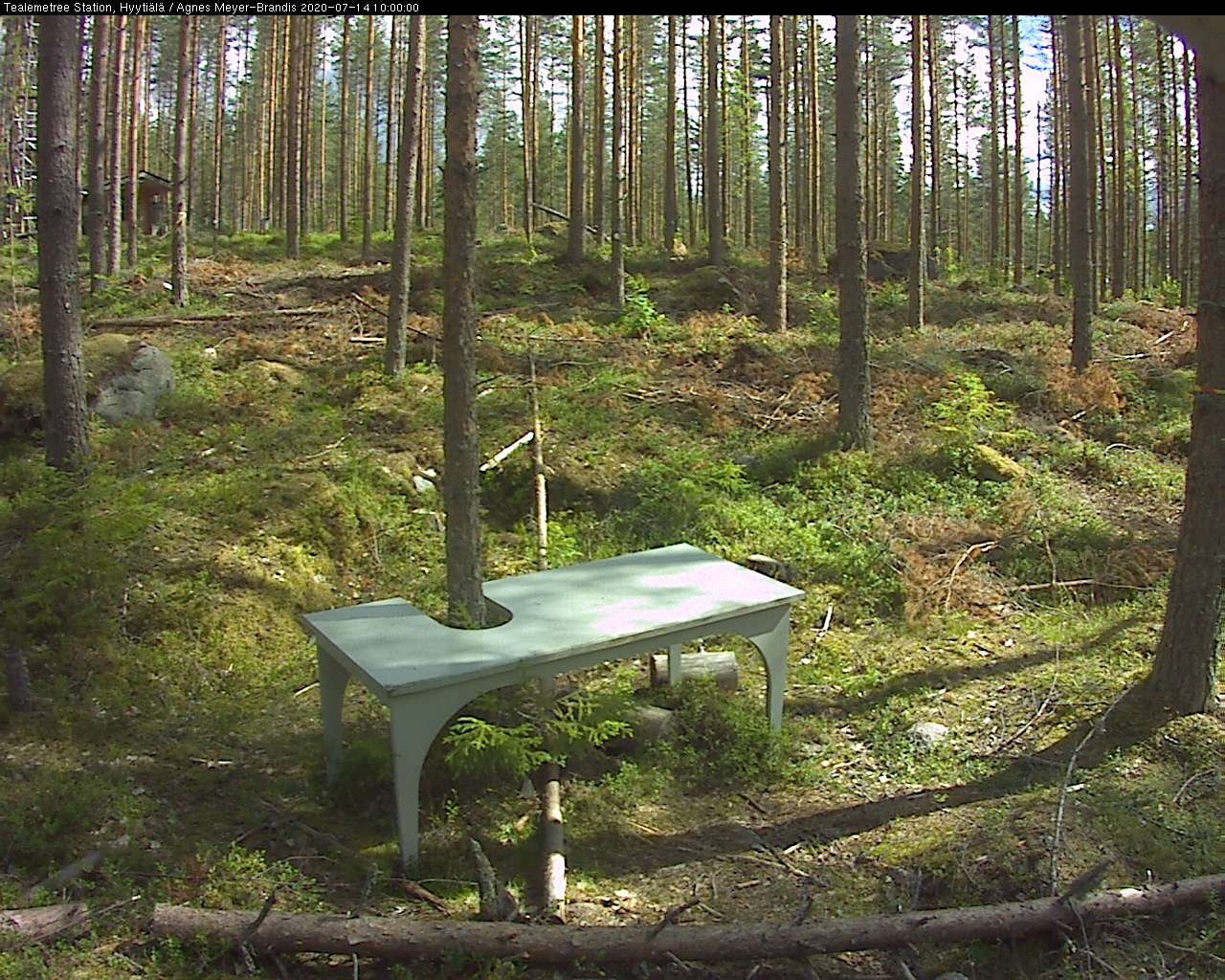 Agnes Meyer-Brandiksen työ Hyytiälässä alkoi tutustumalla aseman muihin tutkijoihin. Pystyäkseen tapaamaan ihmisiä metsässä, hän rakensi pöydän, josta muodostui kohtauspiste ja paikka teehetkille Agneksen ja puun kanssa.
