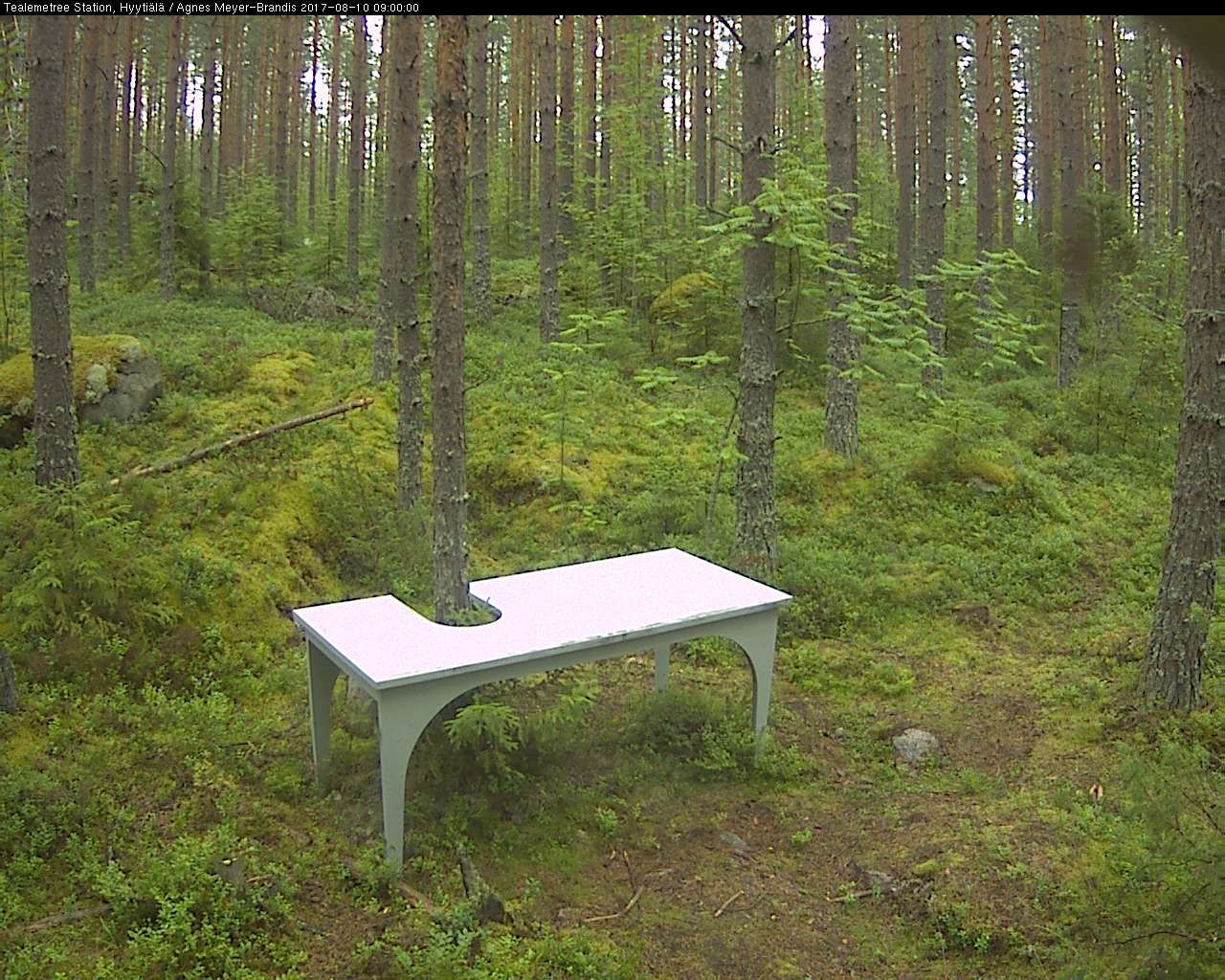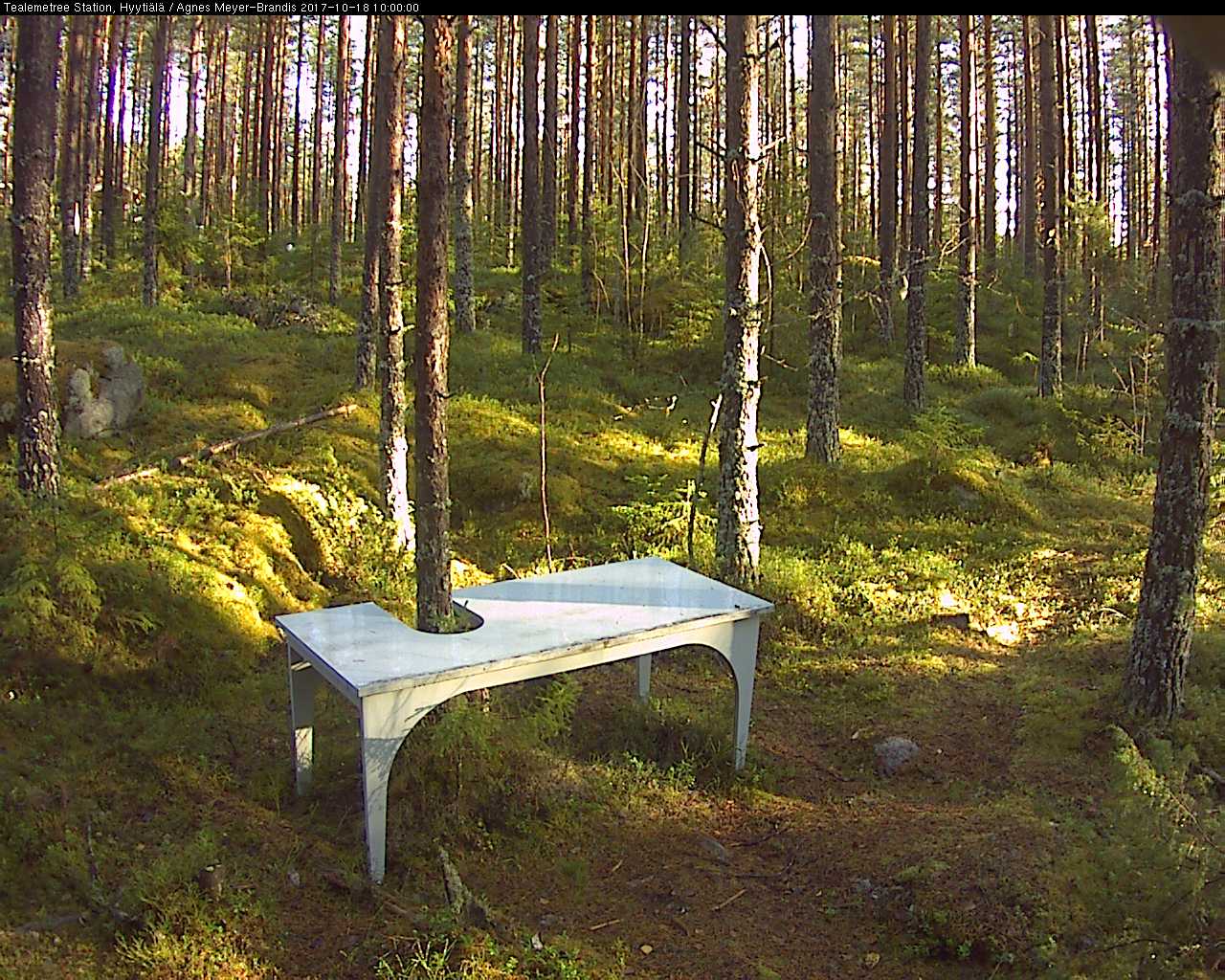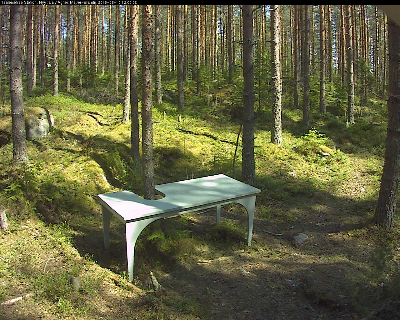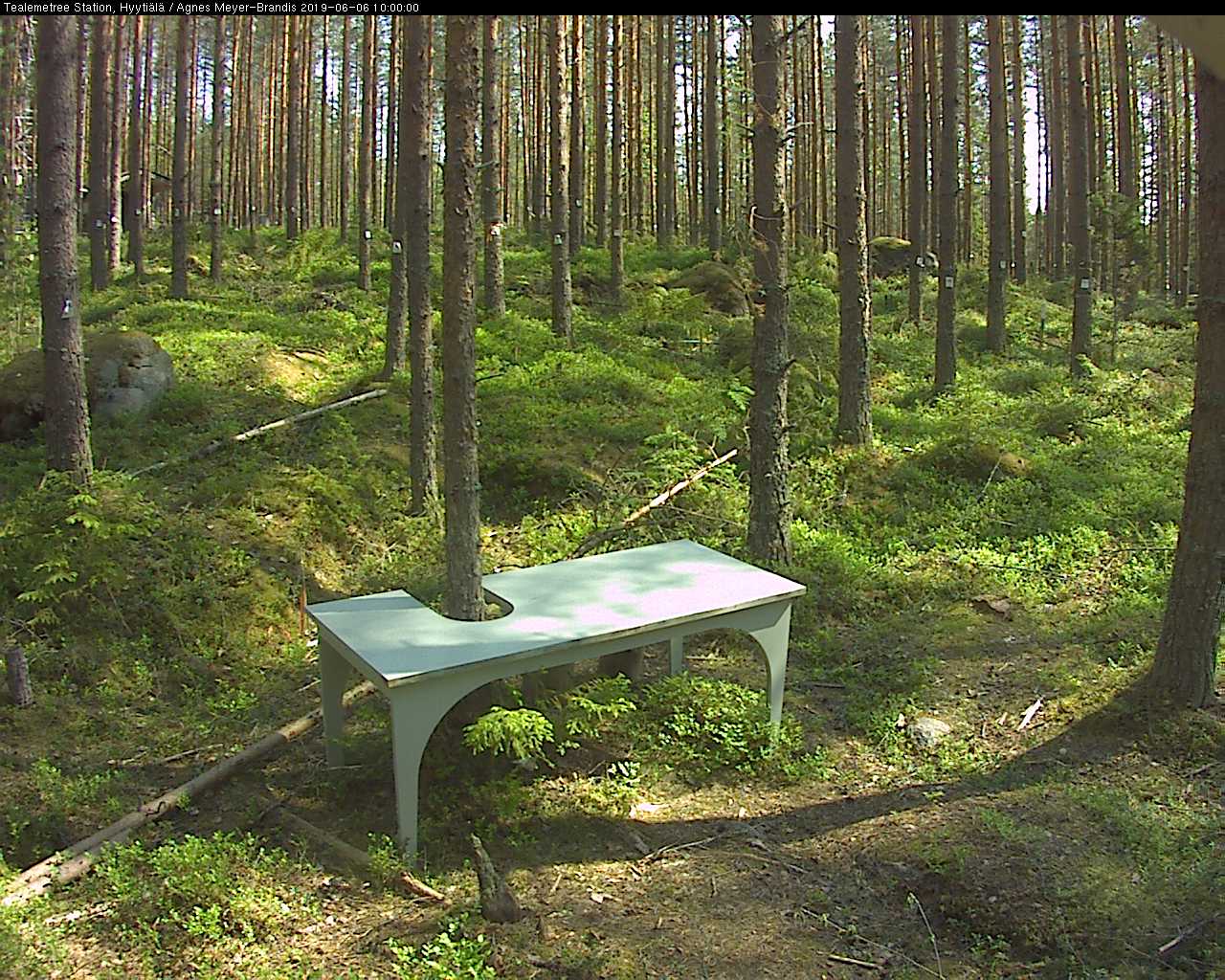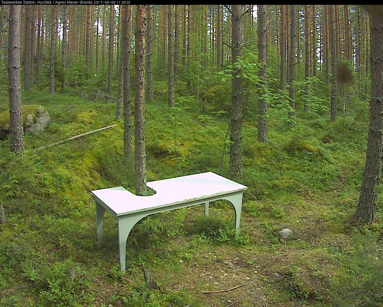 Agnes Meyer-Brandiksen työ Hyytiälässä alkoi tutustumalla aseman muihin tutkijoihin. Pystyäkseen tapaamaan ihmisiä metsässä, hän rakensi pöydän, josta muodostui kohtauspiste ja paikka teehetkille Agneksen ja puun kanssa.
