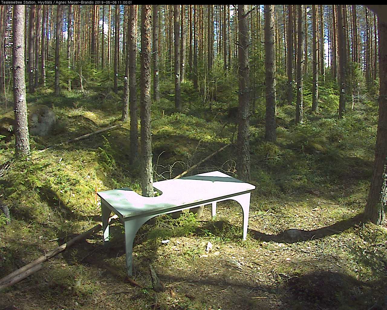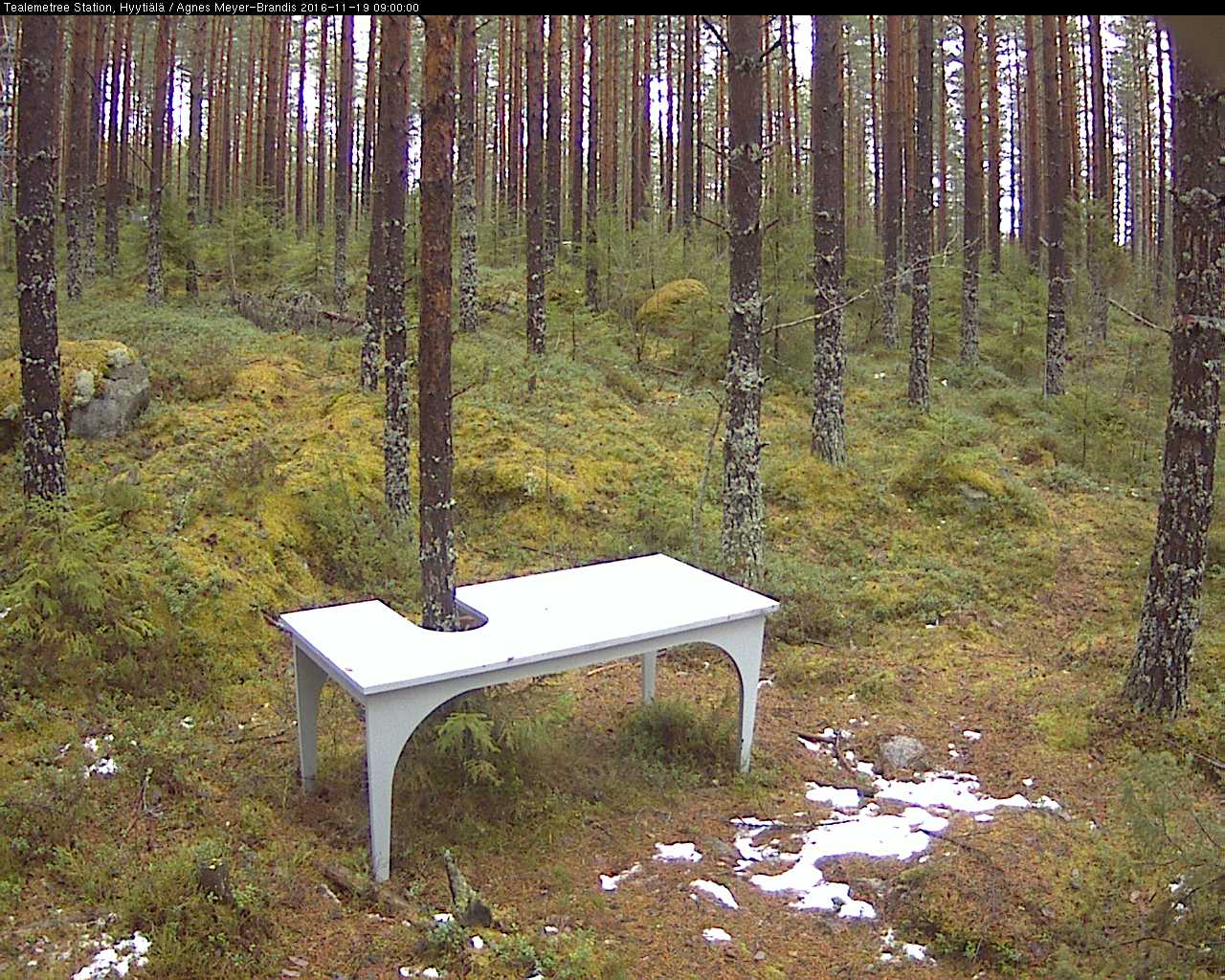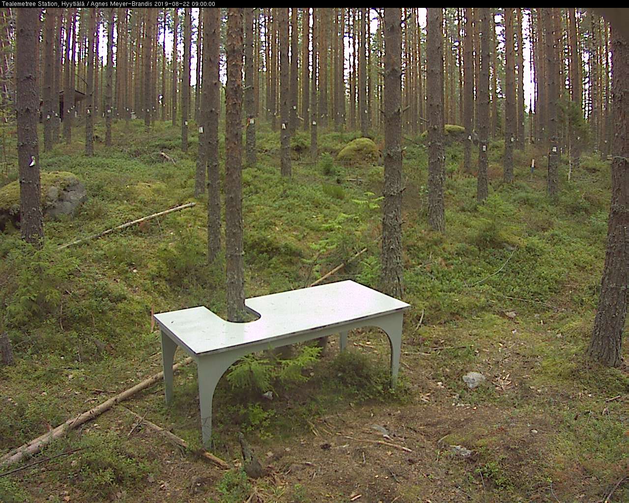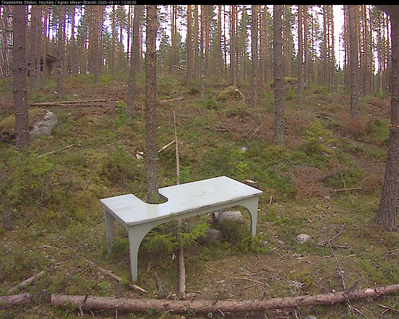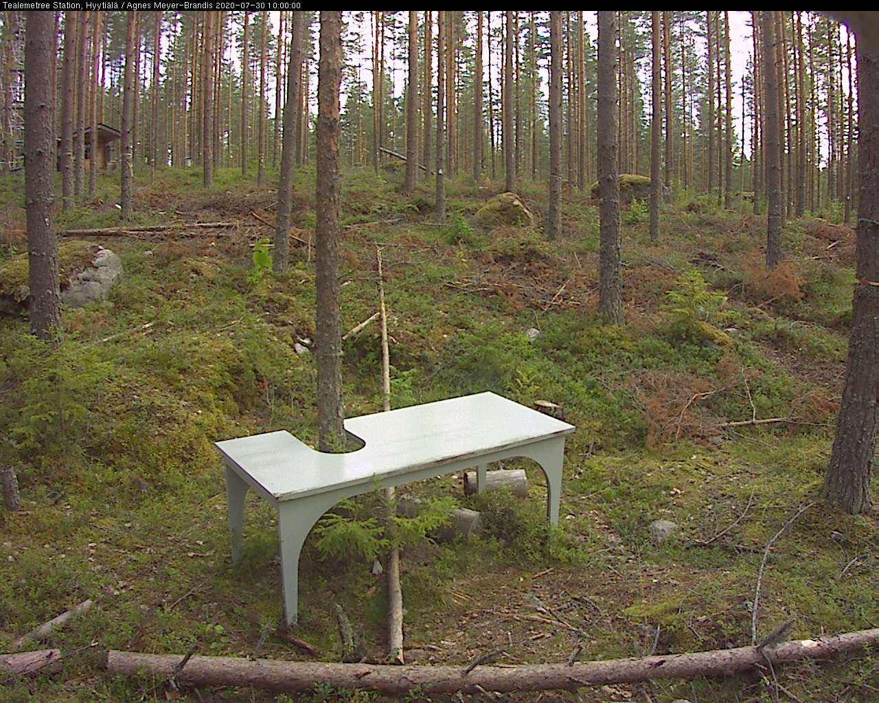 Agnes Meyer-Brandiksen työ Hyytiälässä alkoi tutustumalla aseman muihin tutkijoihin. Pystyäkseen tapaamaan ihmisiä metsässä, hän rakensi pöydän, josta muodostui kohtauspiste ja paikka teehetkille Agneksen ja puun kanssa.