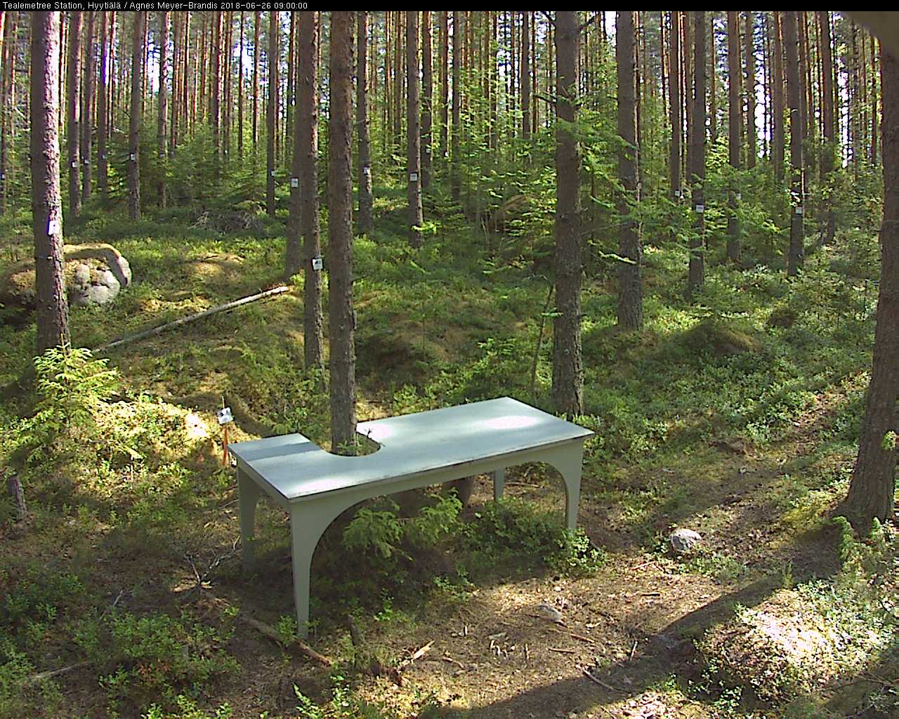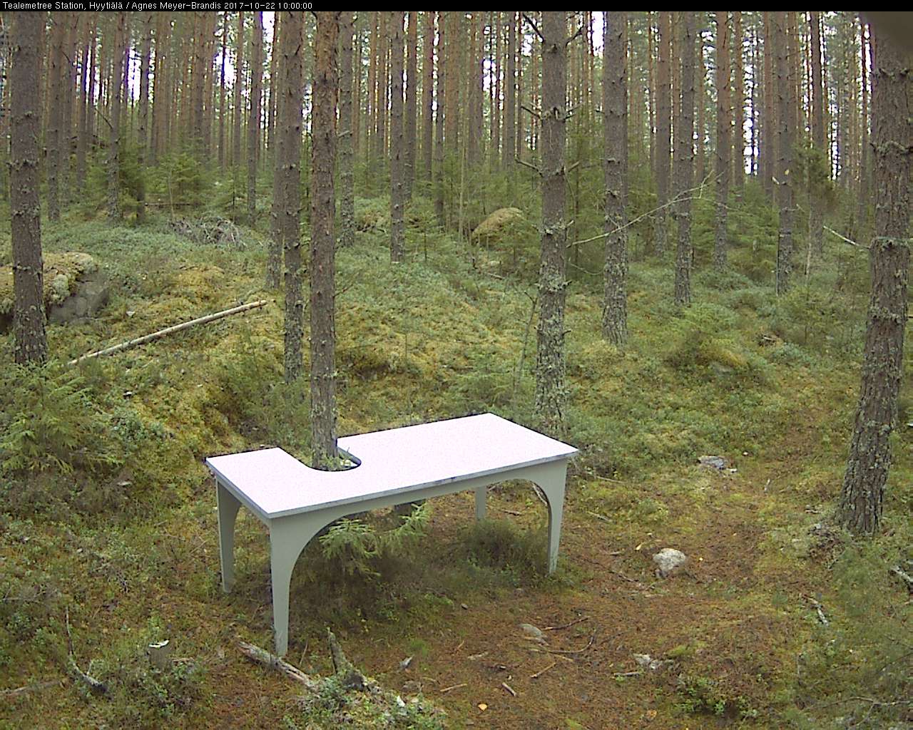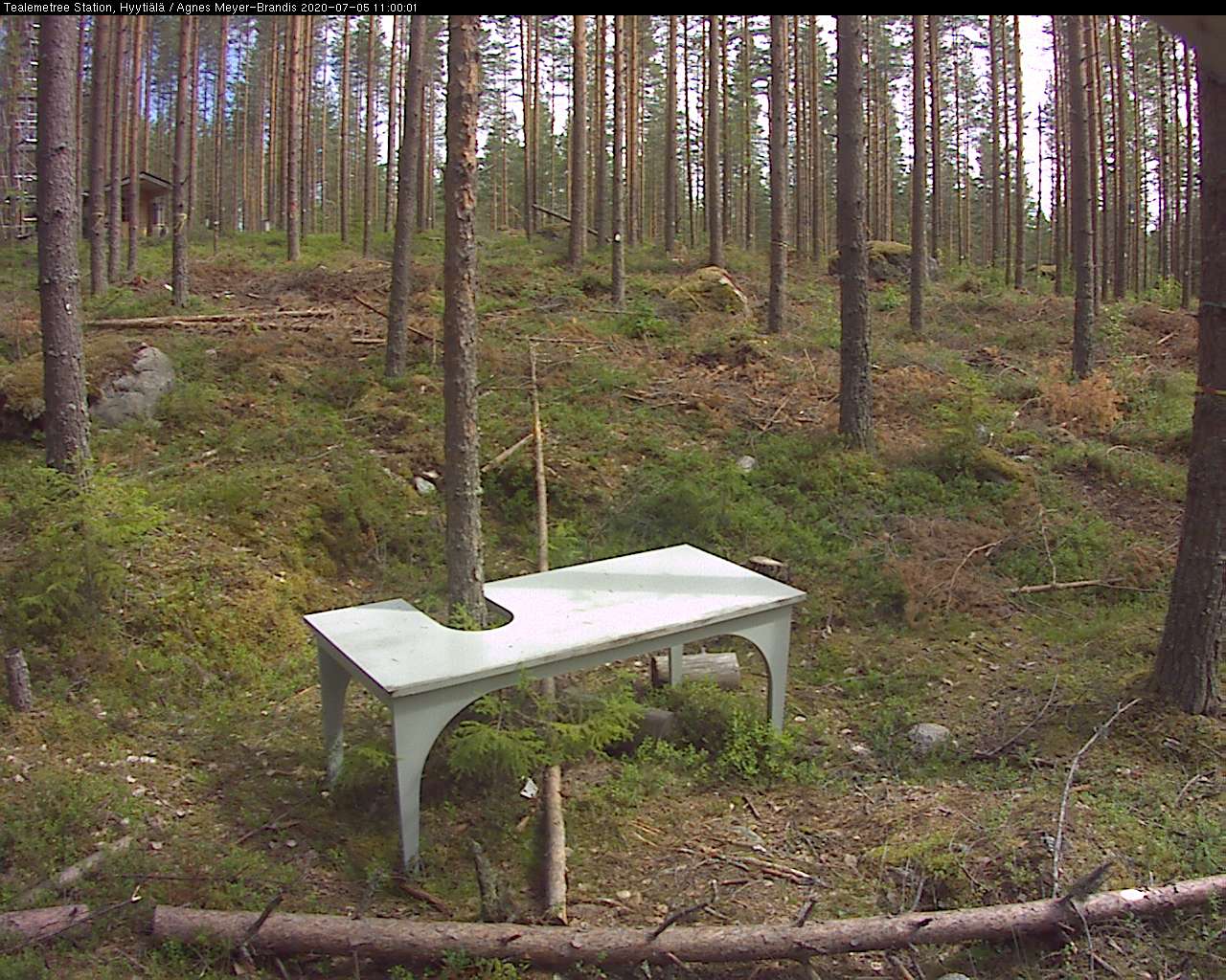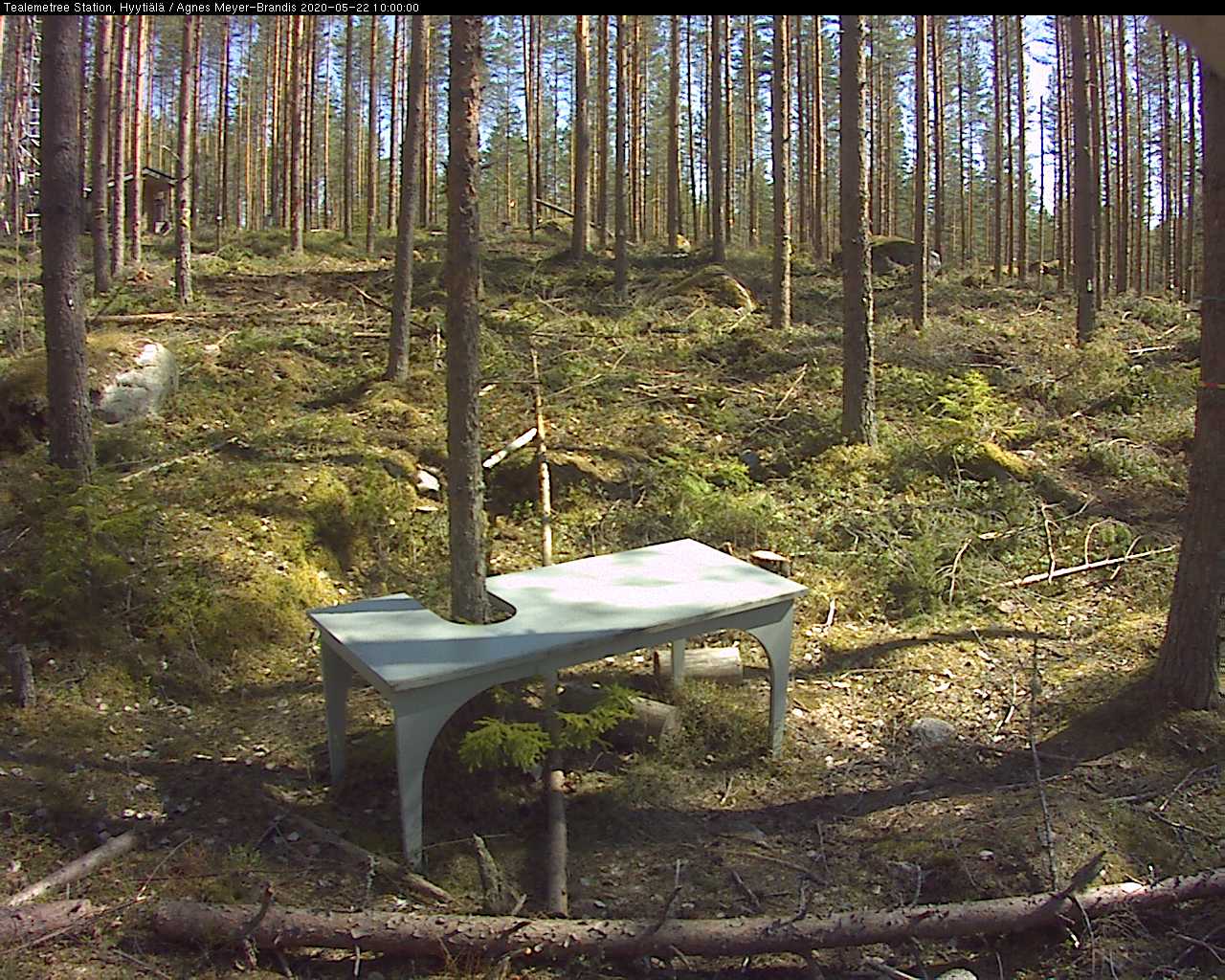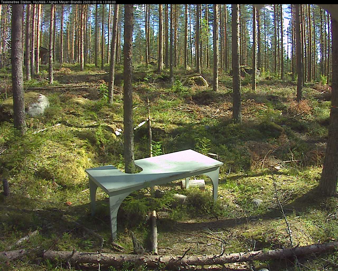 Agnes Meyer-Brandiksen työ Hyytiälässä alkoi tutustumalla aseman muihin tutkijoihin. Pystyäkseen tapaamaan ihmisiä metsässä, hän rakensi pöydän, josta muodostui kohtauspiste ja paikka teehetkille Agneksen ja puun kanssa.