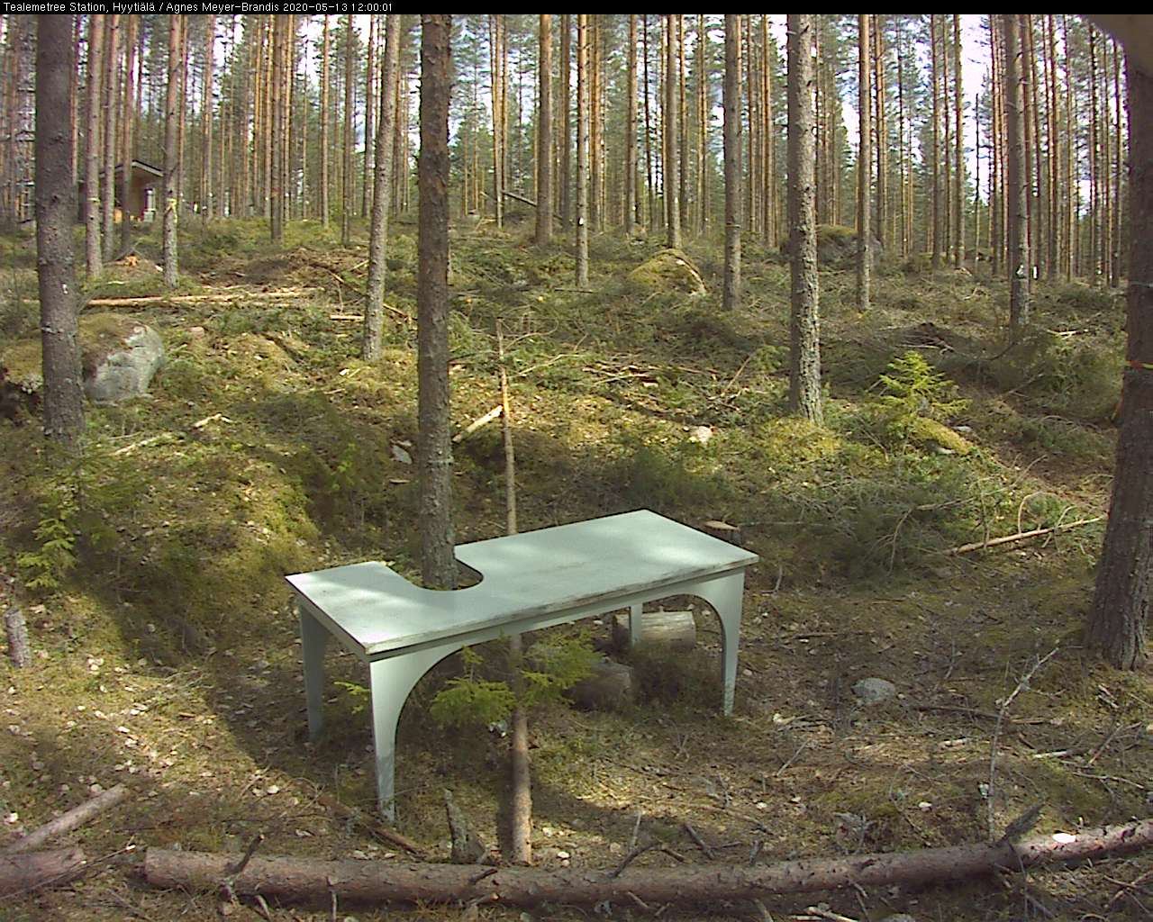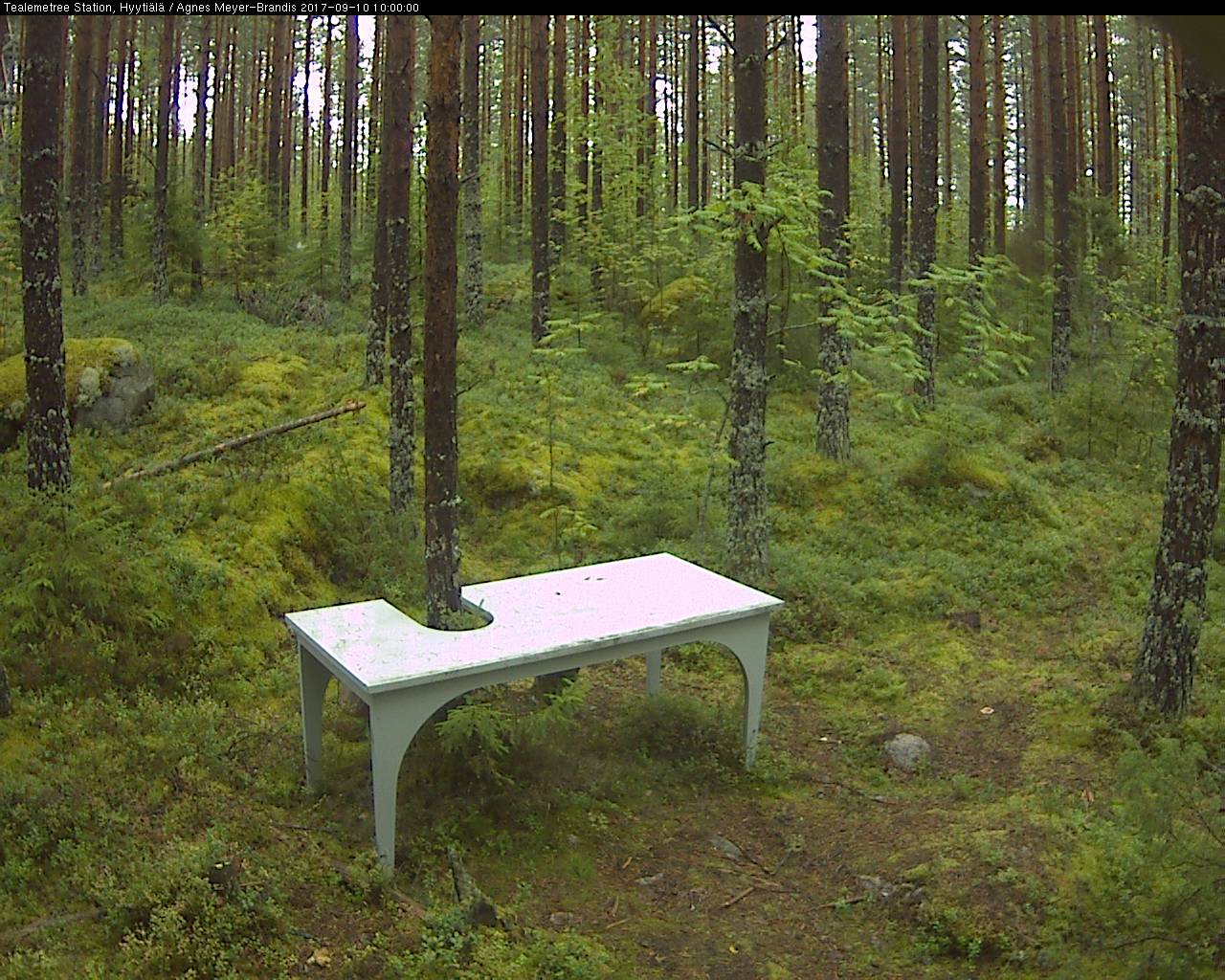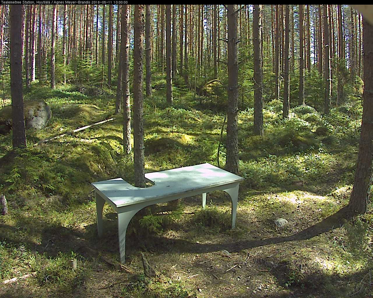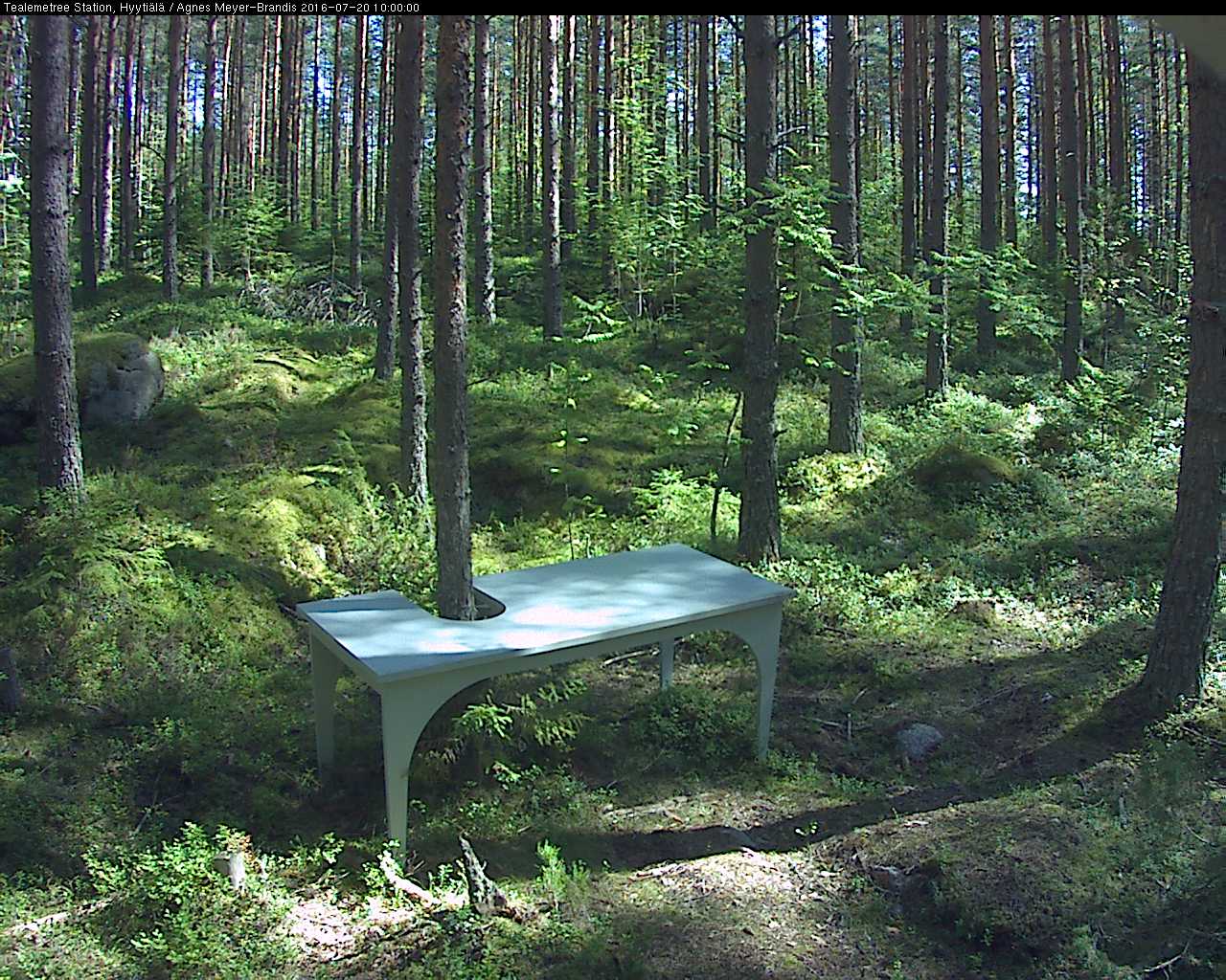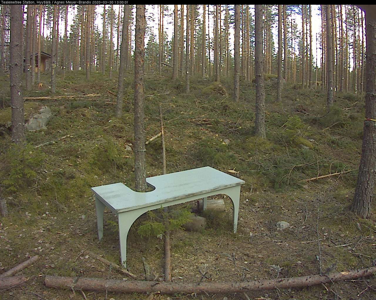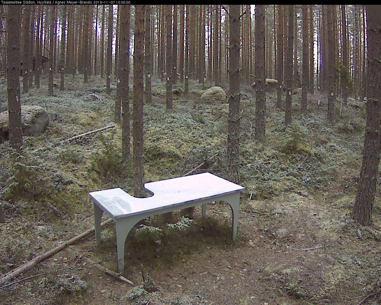 Agnes Meyer-Brandiksen työ Hyytiälässä alkoi tutustumalla aseman muihin tutkijoihin. Pystyäkseen tapaamaan ihmisiä metsässä, hän rakensi pöydän, josta muodostui kohtauspiste ja paikka teehetkille Agneksen ja puun kanssa.