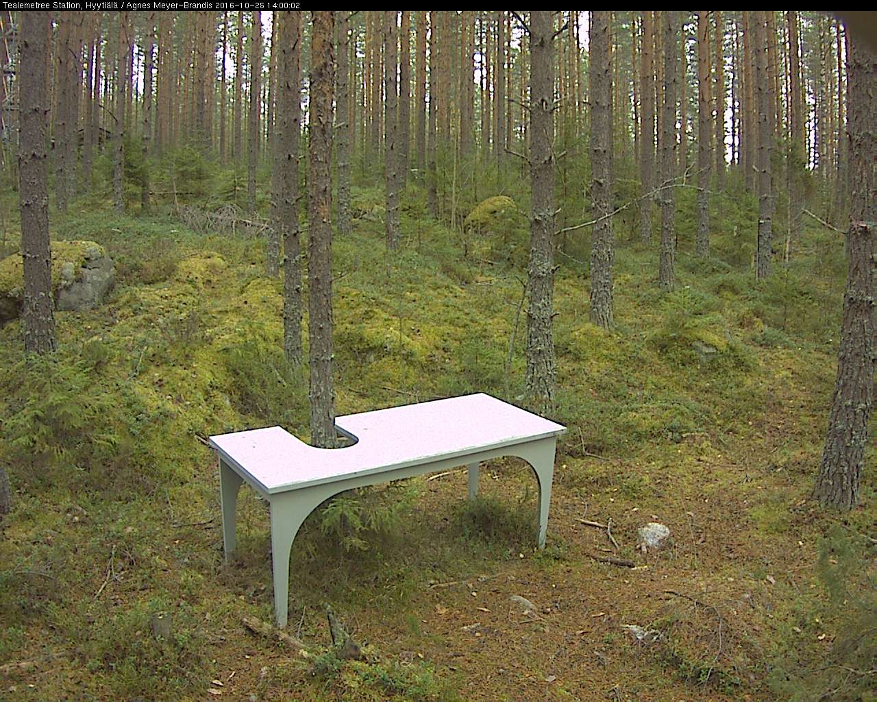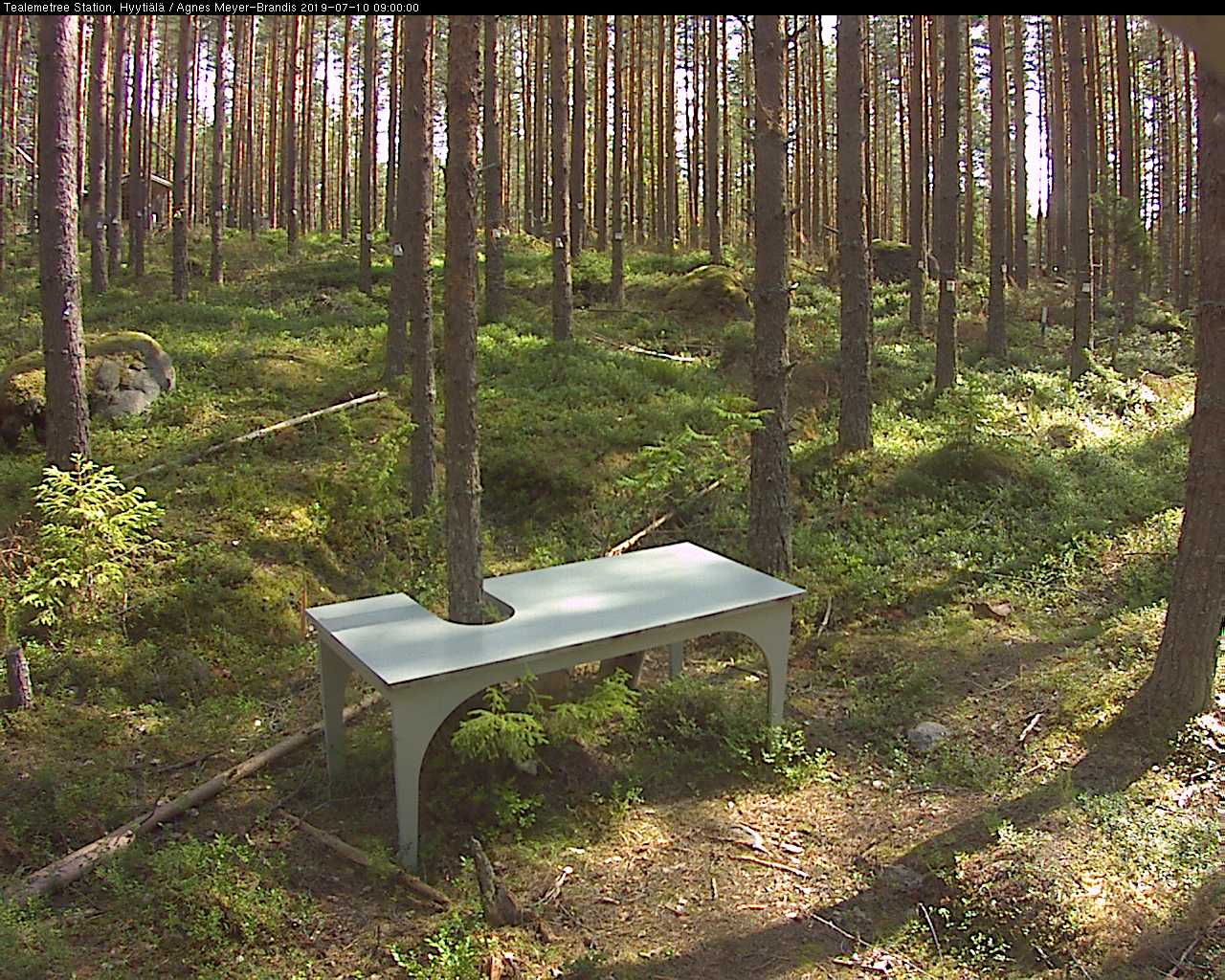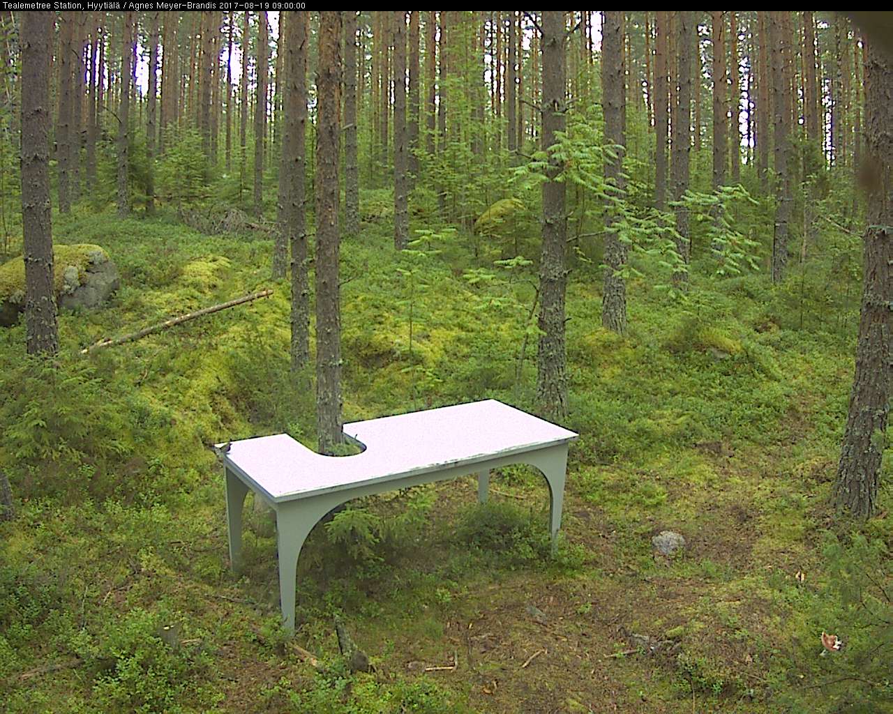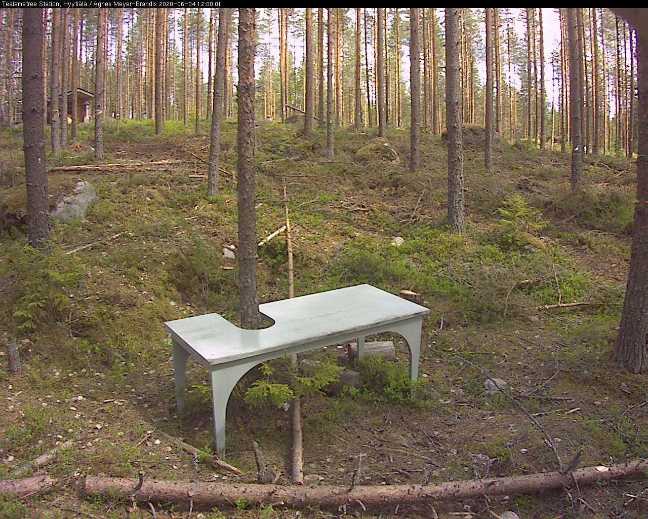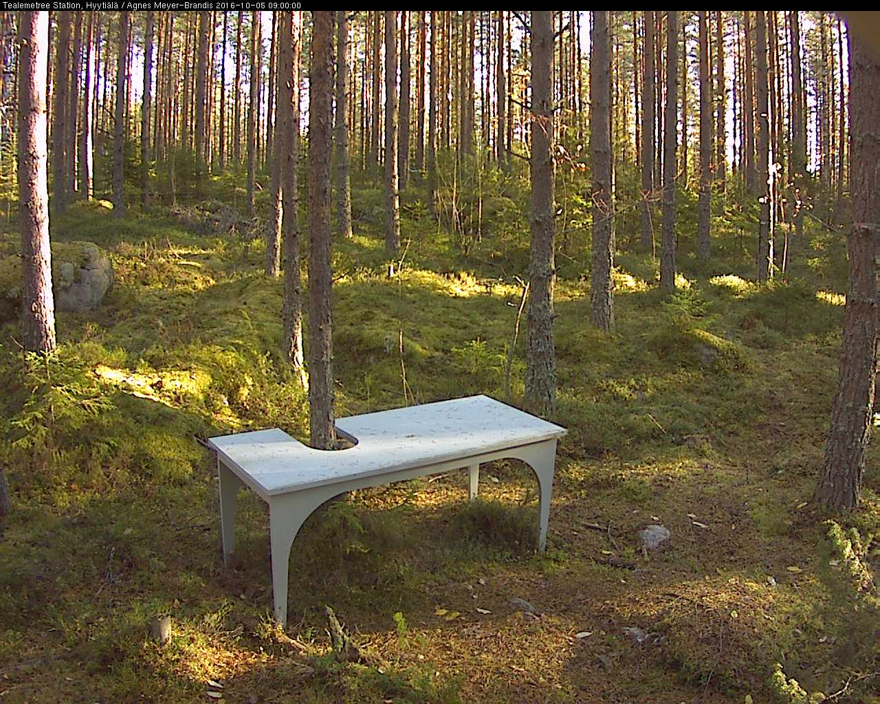 Agnes Meyer-Brandiksen työ Hyytiälässä alkoi tutustumalla aseman muihin tutkijoihin. Pystyäkseen tapaamaan ihmisiä metsässä, hän rakensi pöydän, josta muodostui kohtauspiste ja paikka teehetkille Agneksen ja puun kanssa.