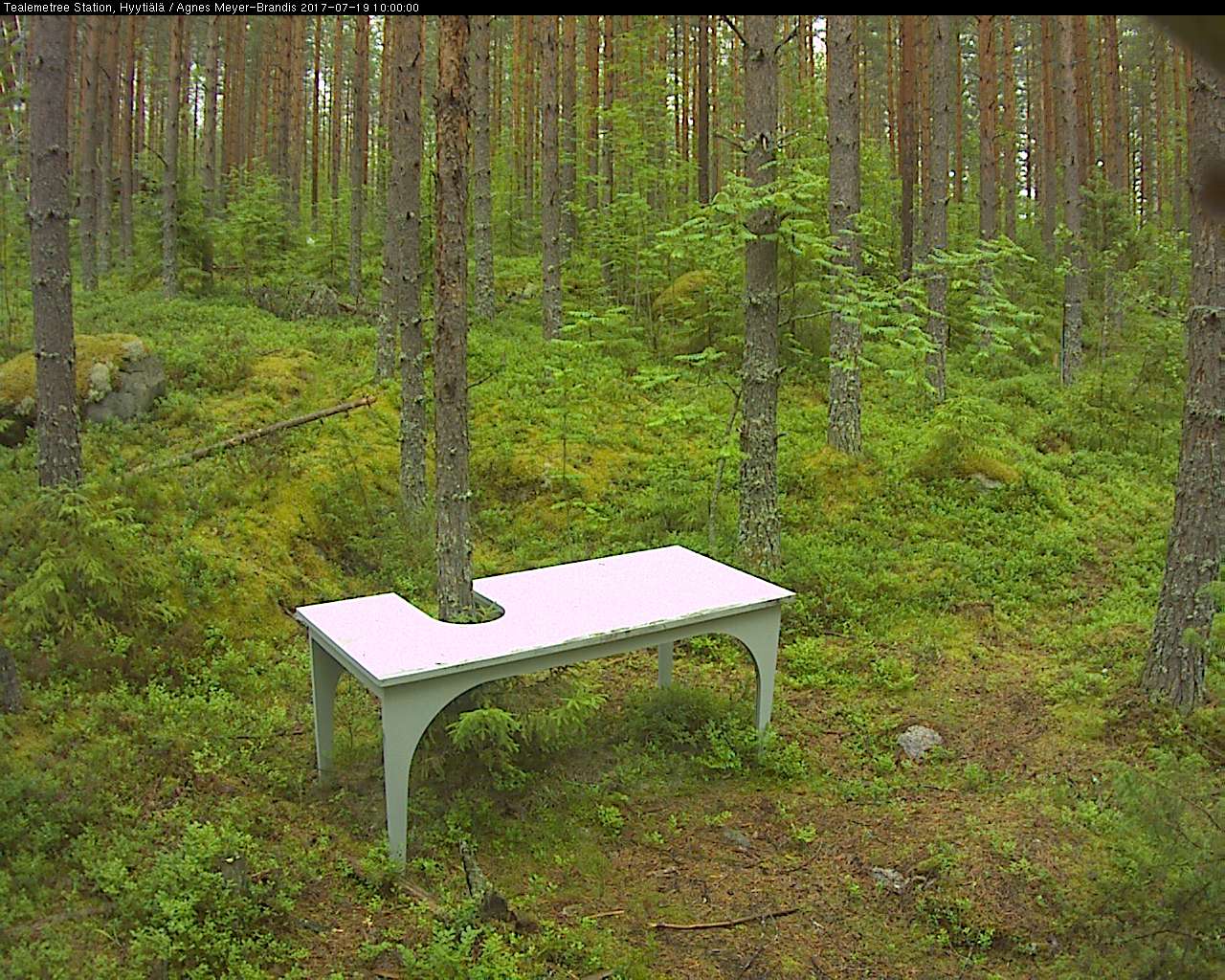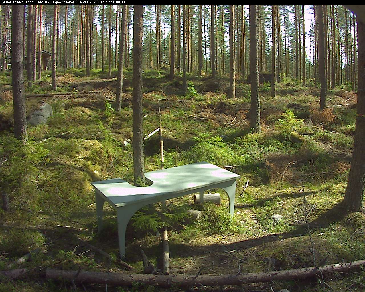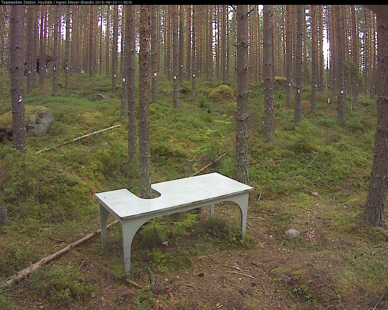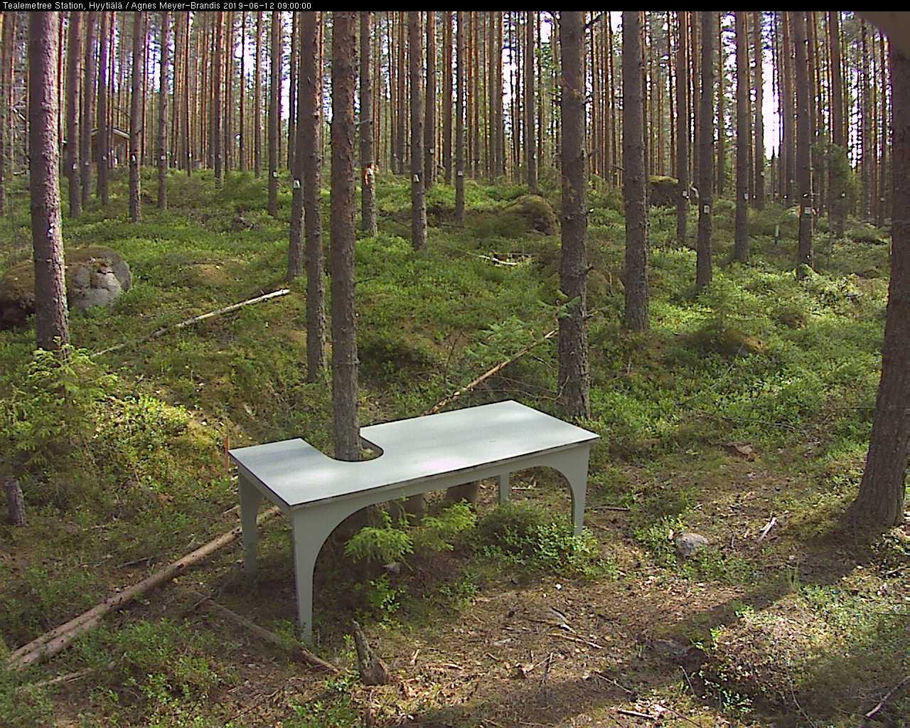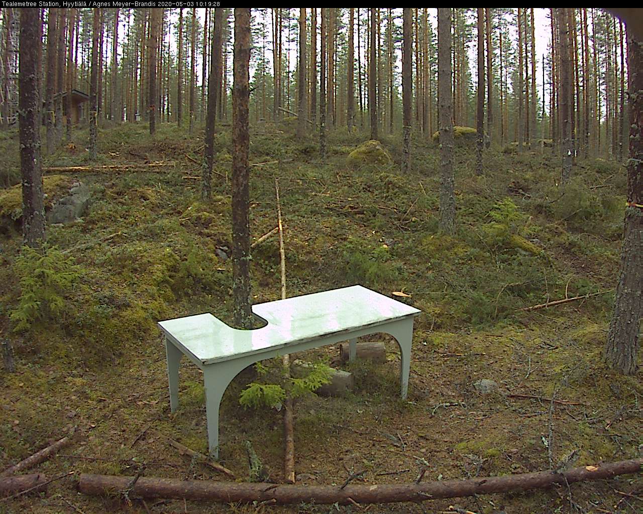 Agnes Meyer-Brandiksen työ Hyytiälässä alkoi tutustumalla aseman muihin tutkijoihin. Pystyäkseen tapaamaan ihmisiä metsässä, hän rakensi pöydän, josta muodostui kohtauspiste ja paikka teehetkille Agneksen ja puun kanssa.