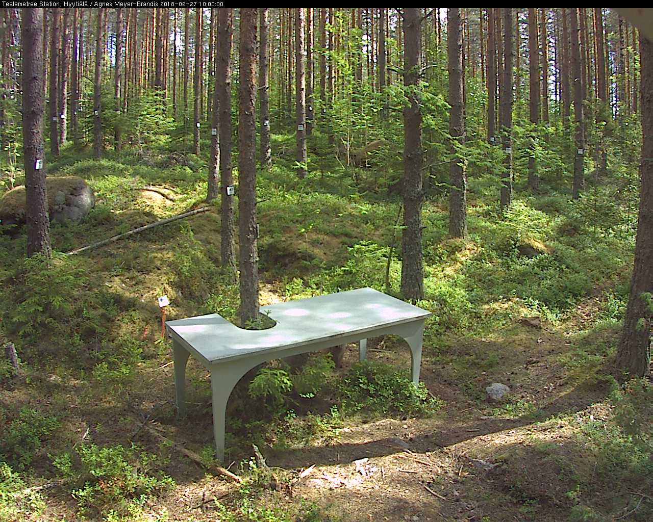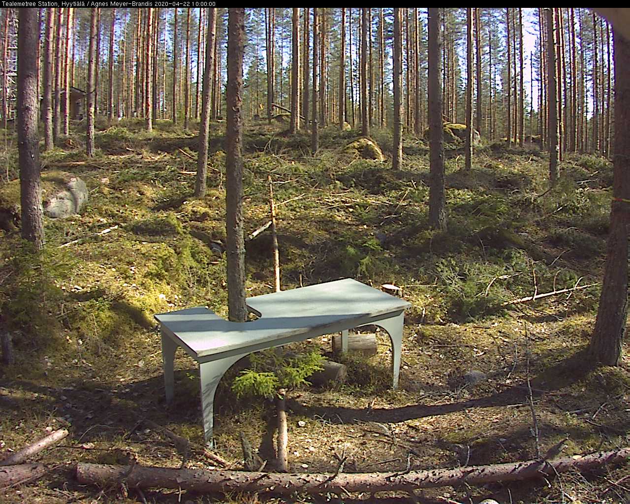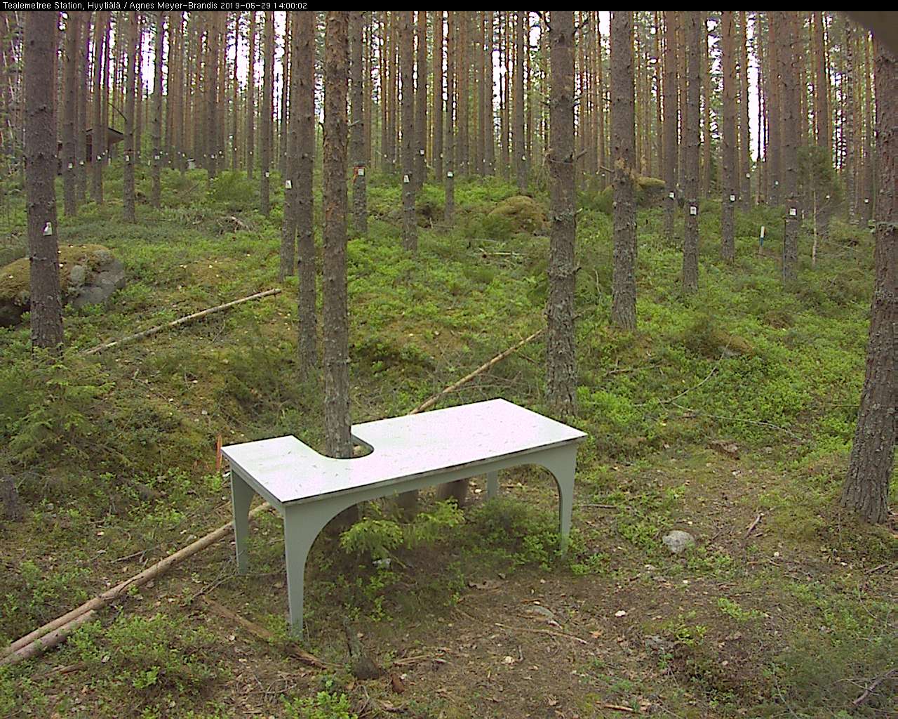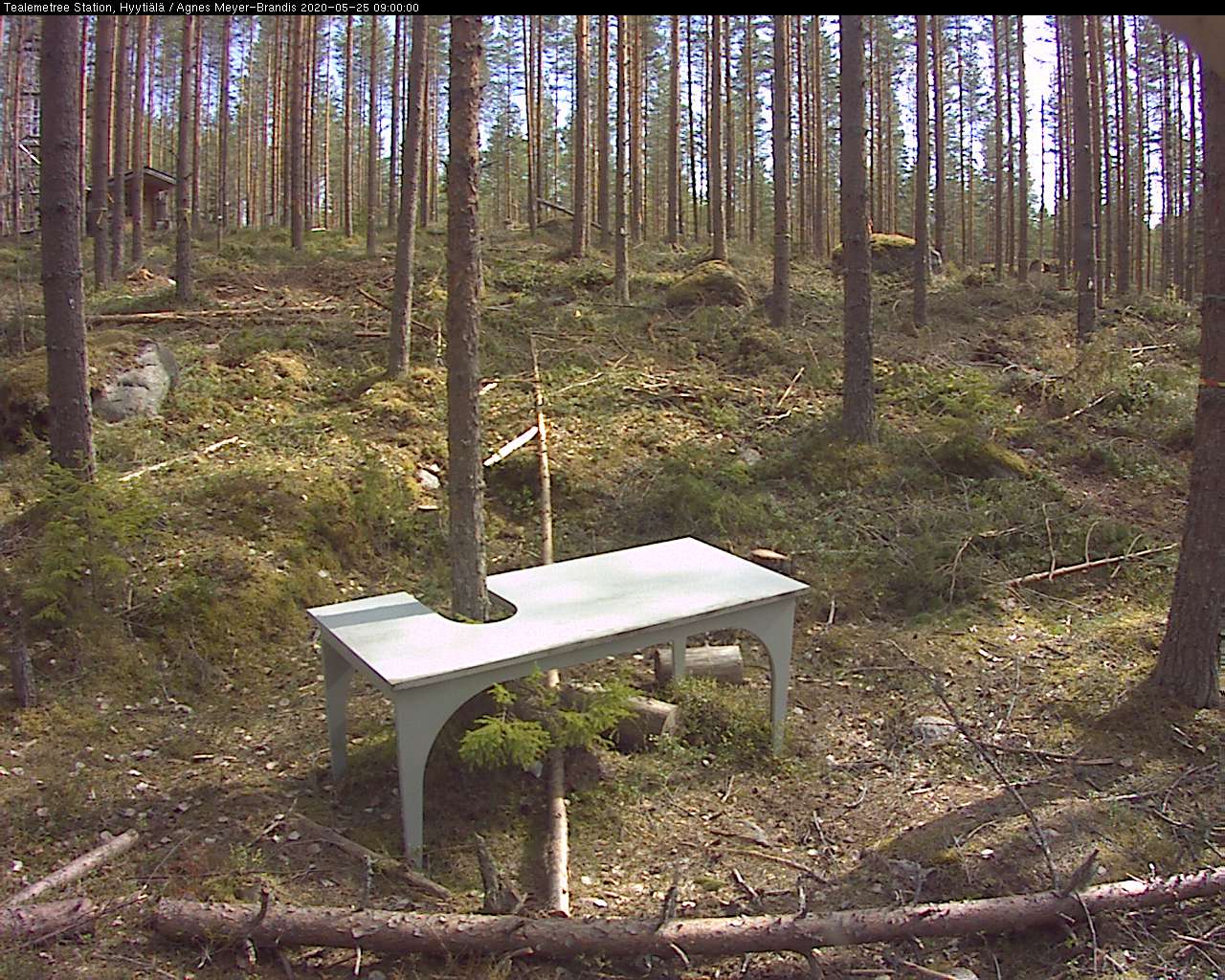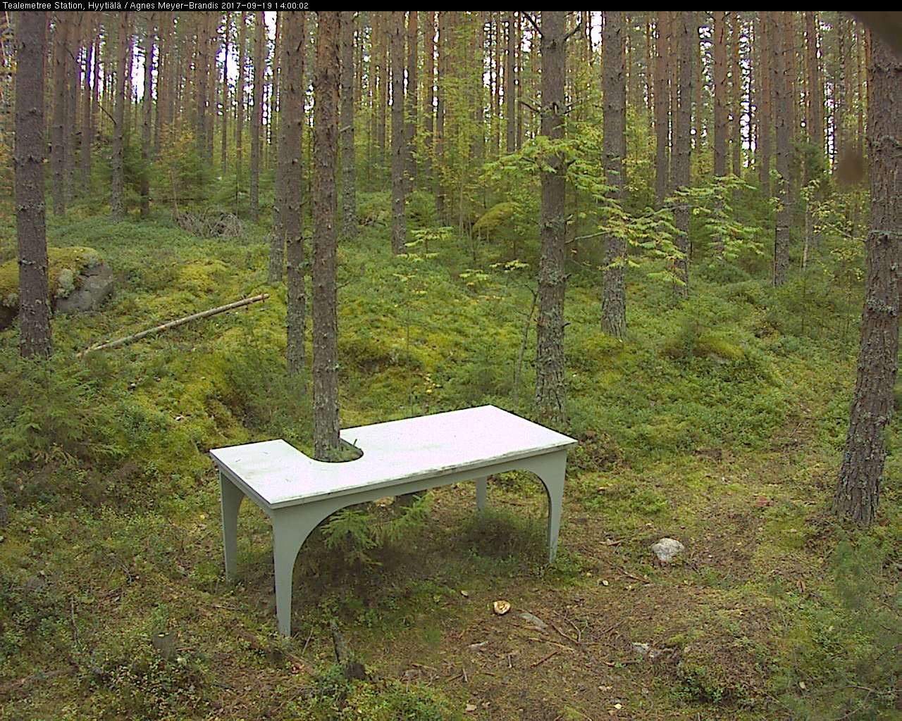 Agnes Meyer-Brandiksen työ Hyytiälässä alkoi tutustumalla aseman muihin tutkijoihin. Pystyäkseen tapaamaan ihmisiä metsässä, hän rakensi pöydän, josta muodostui kohtauspiste ja paikka teehetkille Agneksen ja puun kanssa.