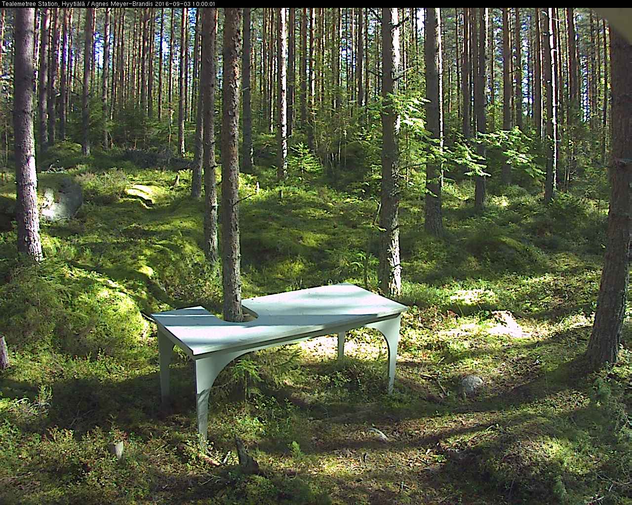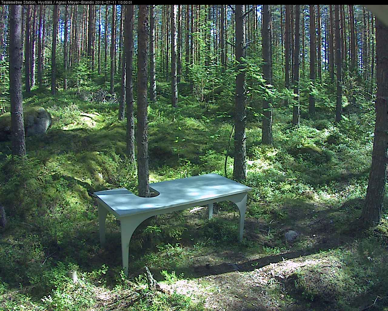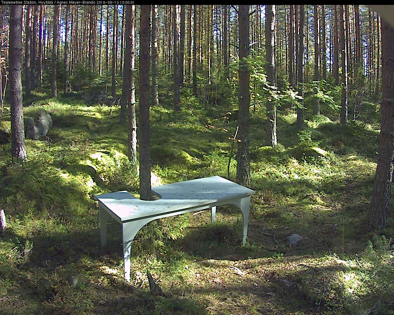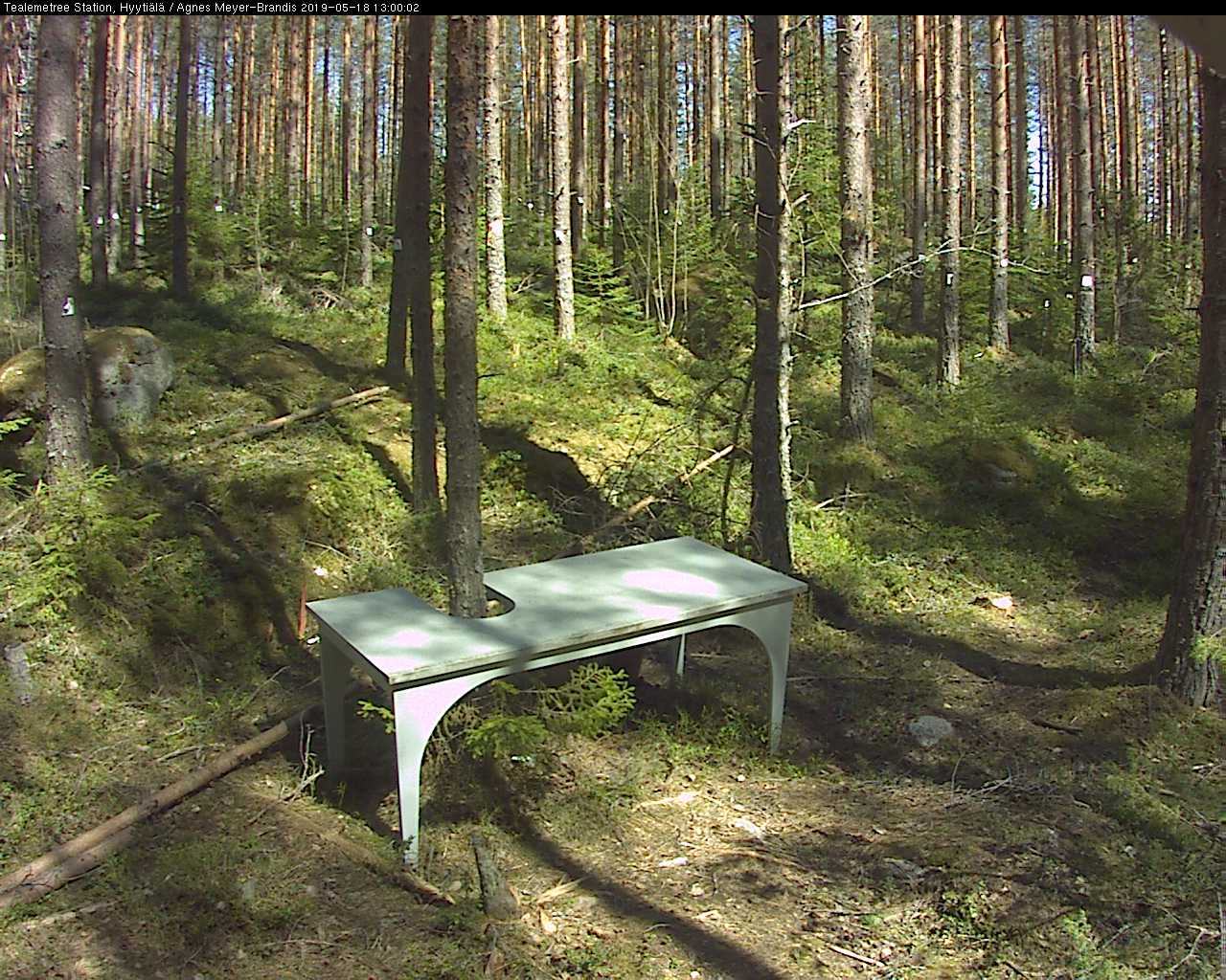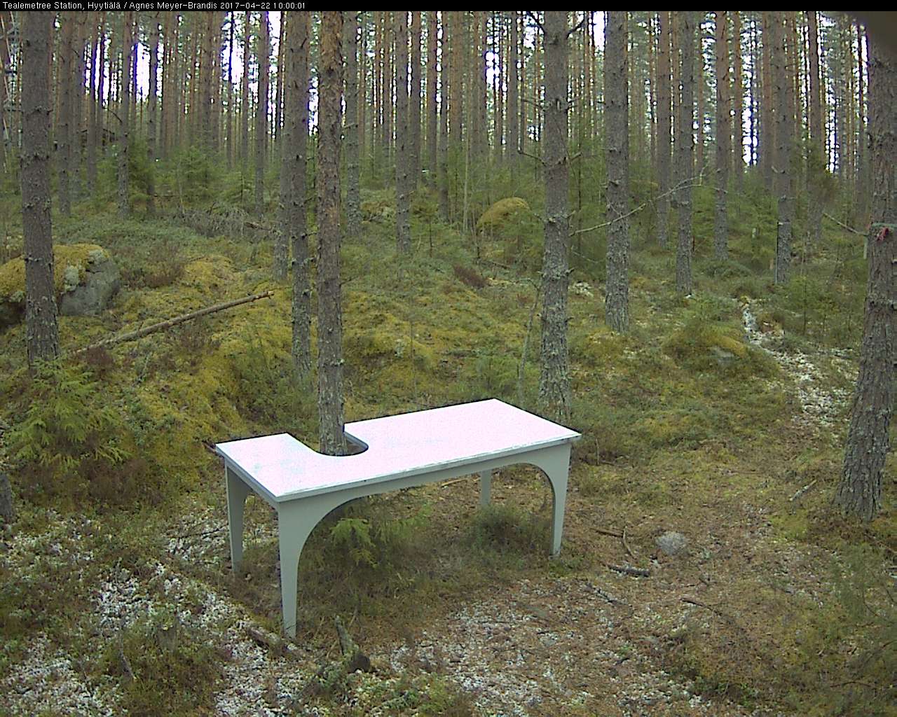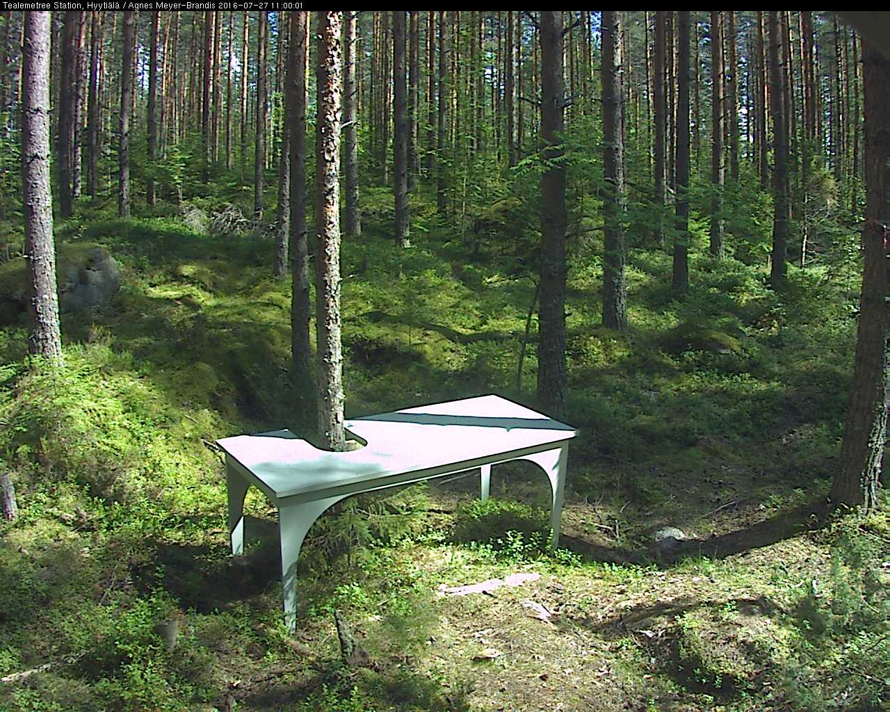 Agnes Meyer-Brandiksen työ Hyytiälässä alkoi tutustumalla aseman muihin tutkijoihin. Pystyäkseen tapaamaan ihmisiä metsässä, hän rakensi pöydän, josta muodostui kohtauspiste ja paikka teehetkille Agneksen ja puun kanssa.