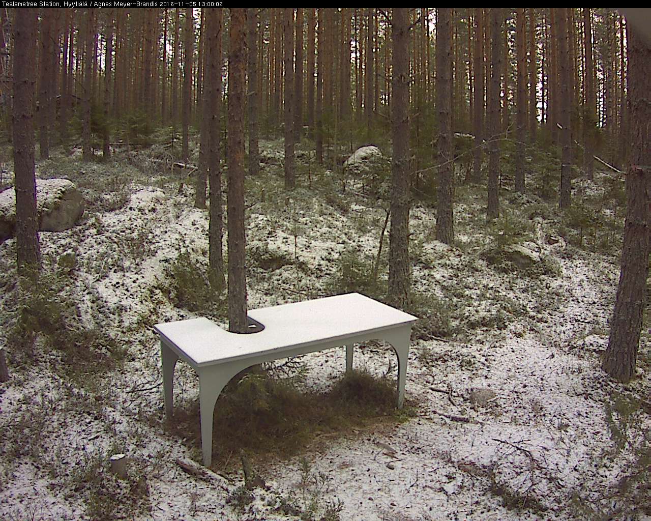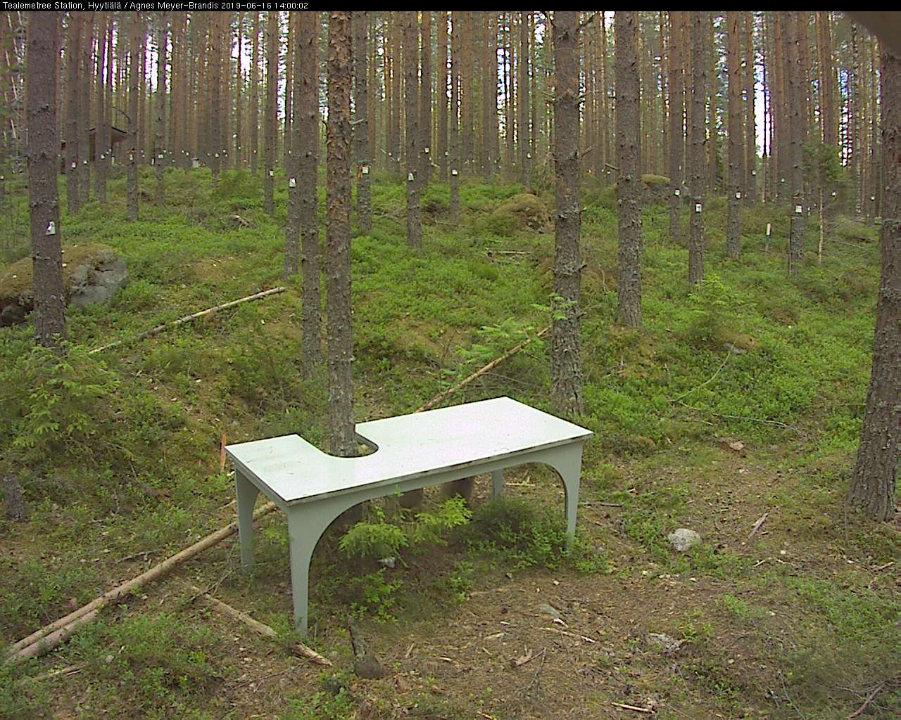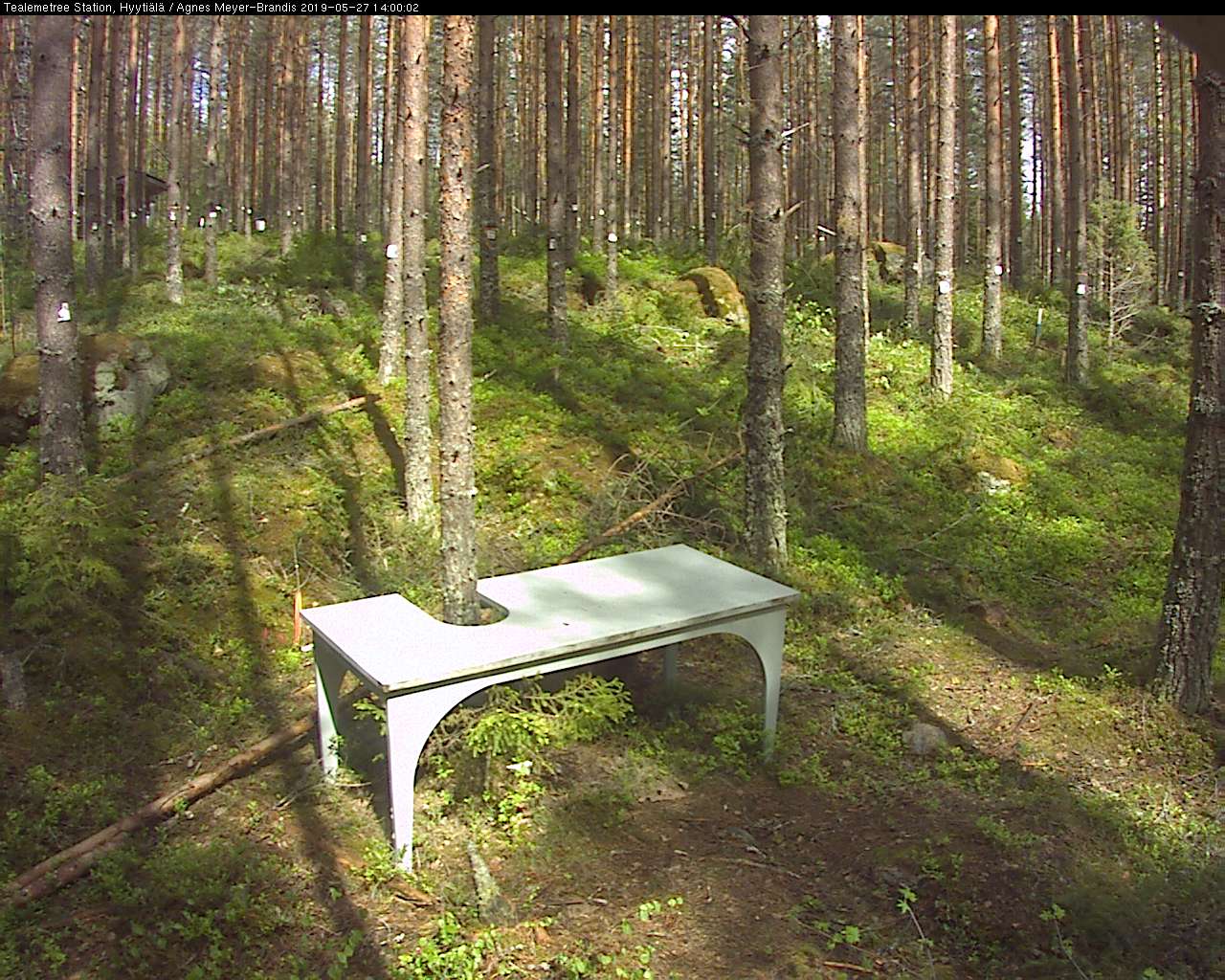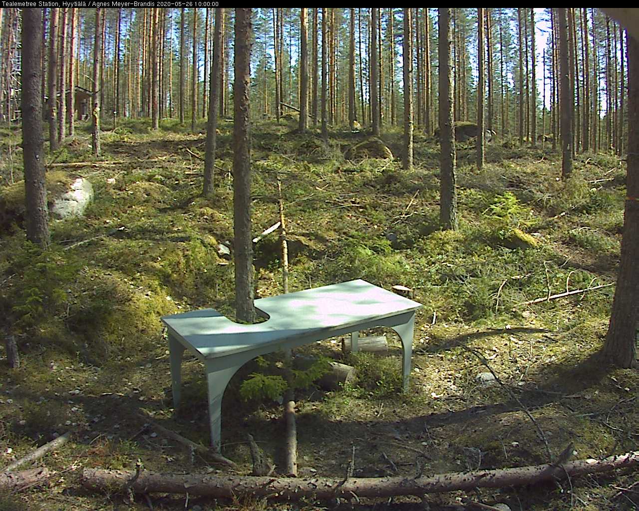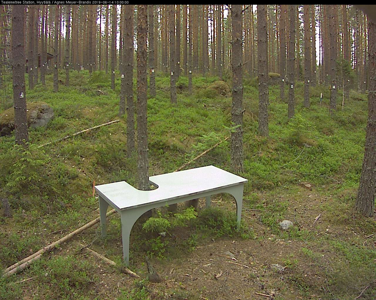 Agnes Meyer-Brandiksen työ Hyytiälässä alkoi tutustumalla aseman muihin tutkijoihin. Pystyäkseen tapaamaan ihmisiä metsässä, hän rakensi pöydän, josta muodostui kohtauspiste ja paikka teehetkille Agneksen ja puun kanssa.