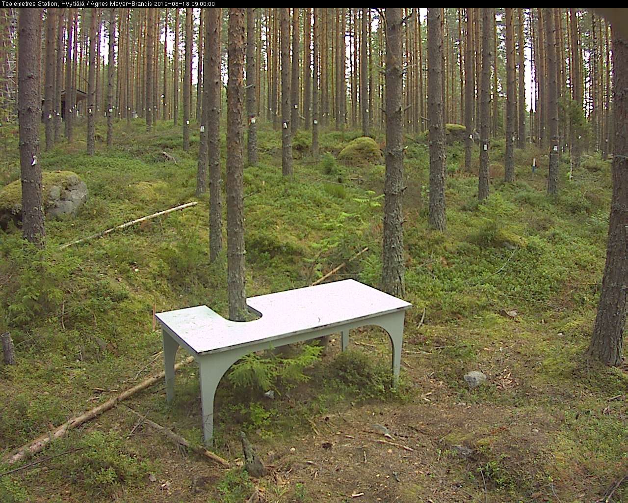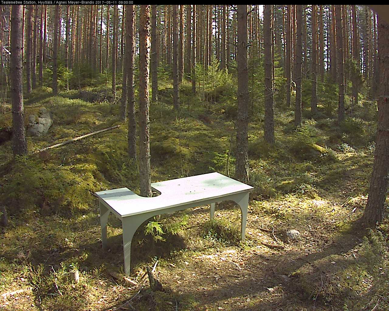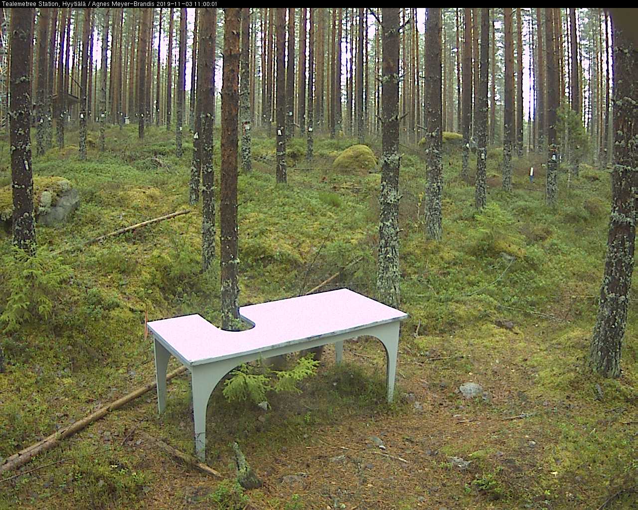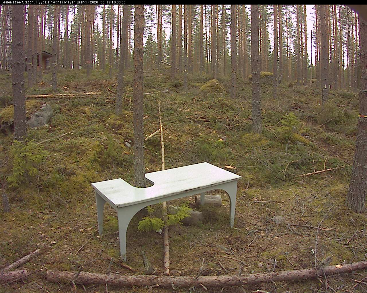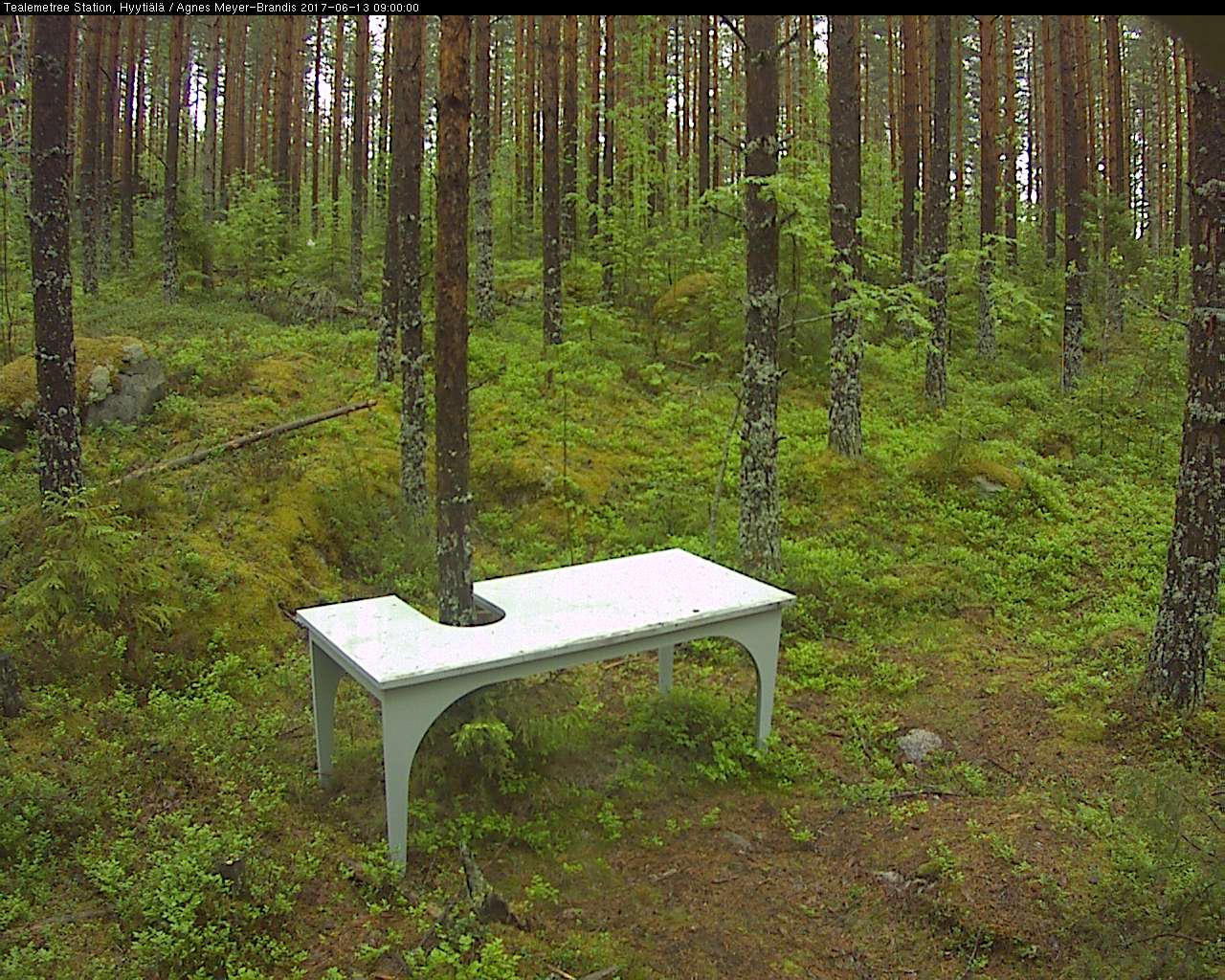 Agnes Meyer-Brandiksen työ Hyytiälässä alkoi tutustumalla aseman muihin tutkijoihin. Pystyäkseen tapaamaan ihmisiä metsässä, hän rakensi pöydän, josta muodostui kohtauspiste ja paikka teehetkille Agneksen ja puun kanssa.