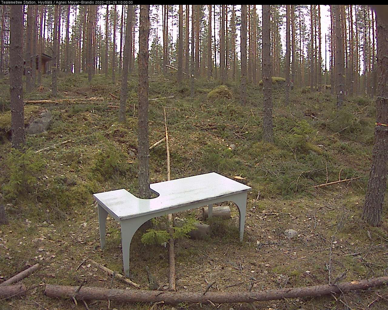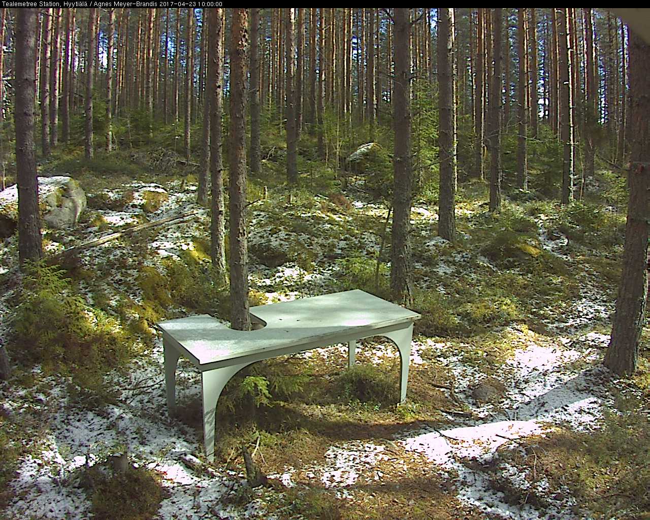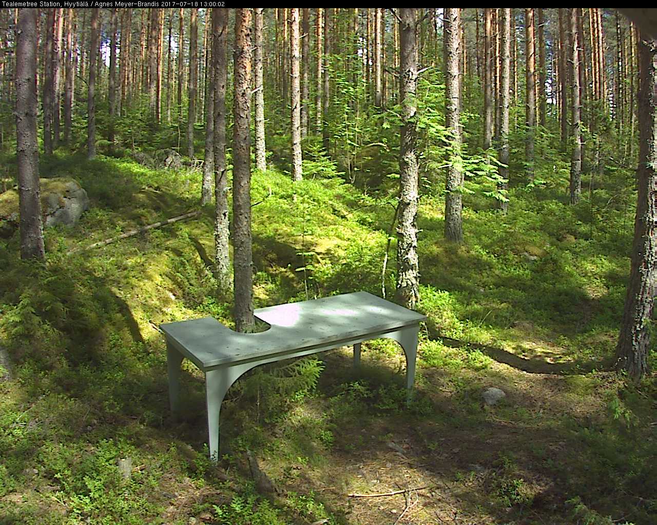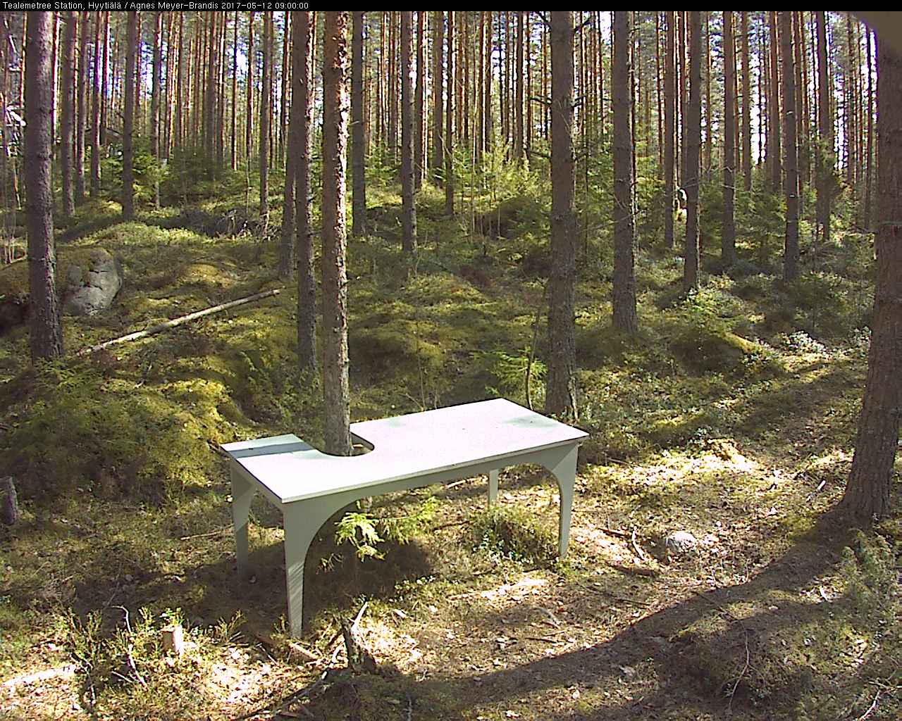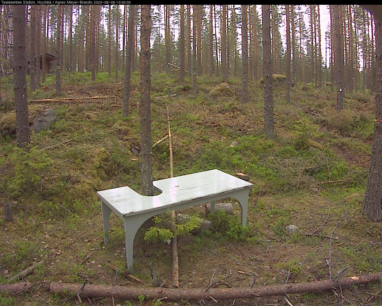 Agnes Meyer-Brandiksen työ Hyytiälässä alkoi tutustumalla aseman muihin tutkijoihin. Pystyäkseen tapaamaan ihmisiä metsässä, hän rakensi pöydän, josta muodostui kohtauspiste ja paikka teehetkille Agneksen ja puun kanssa.