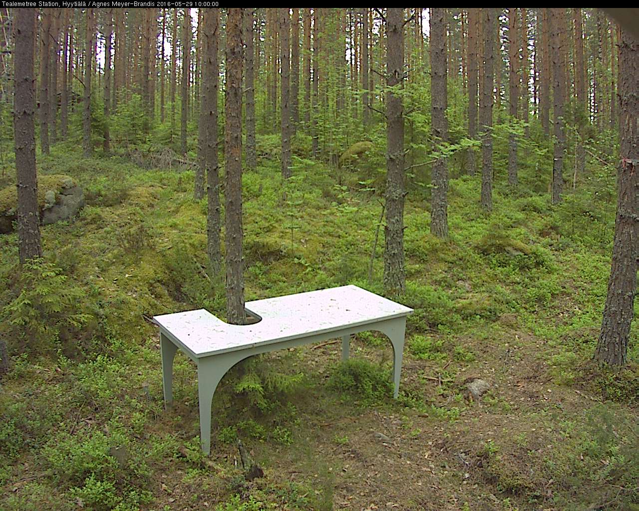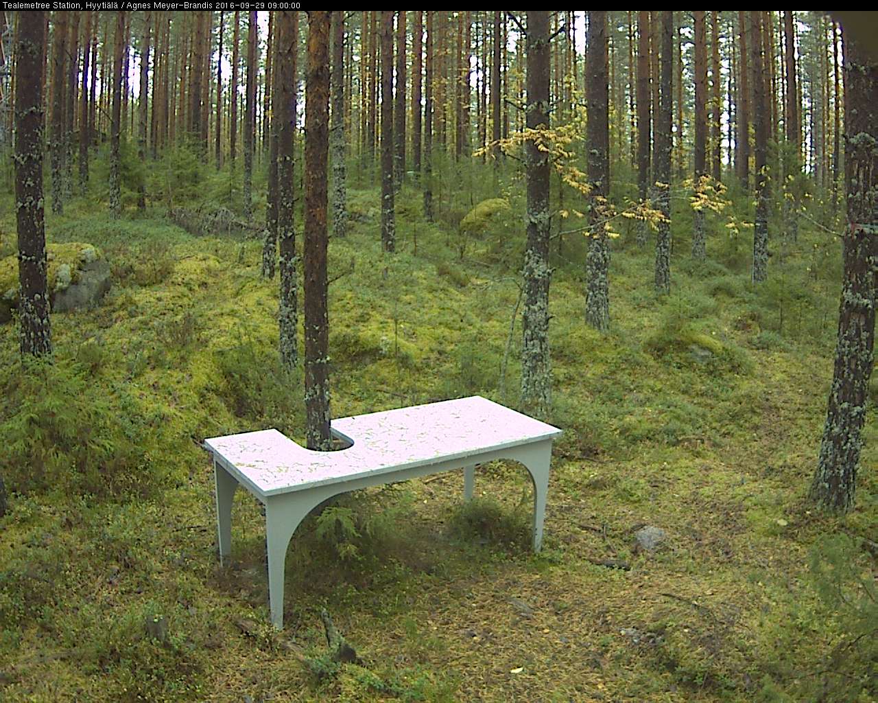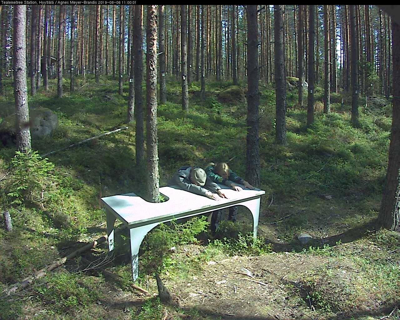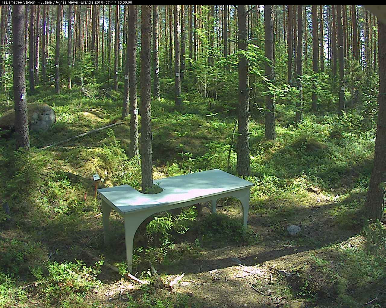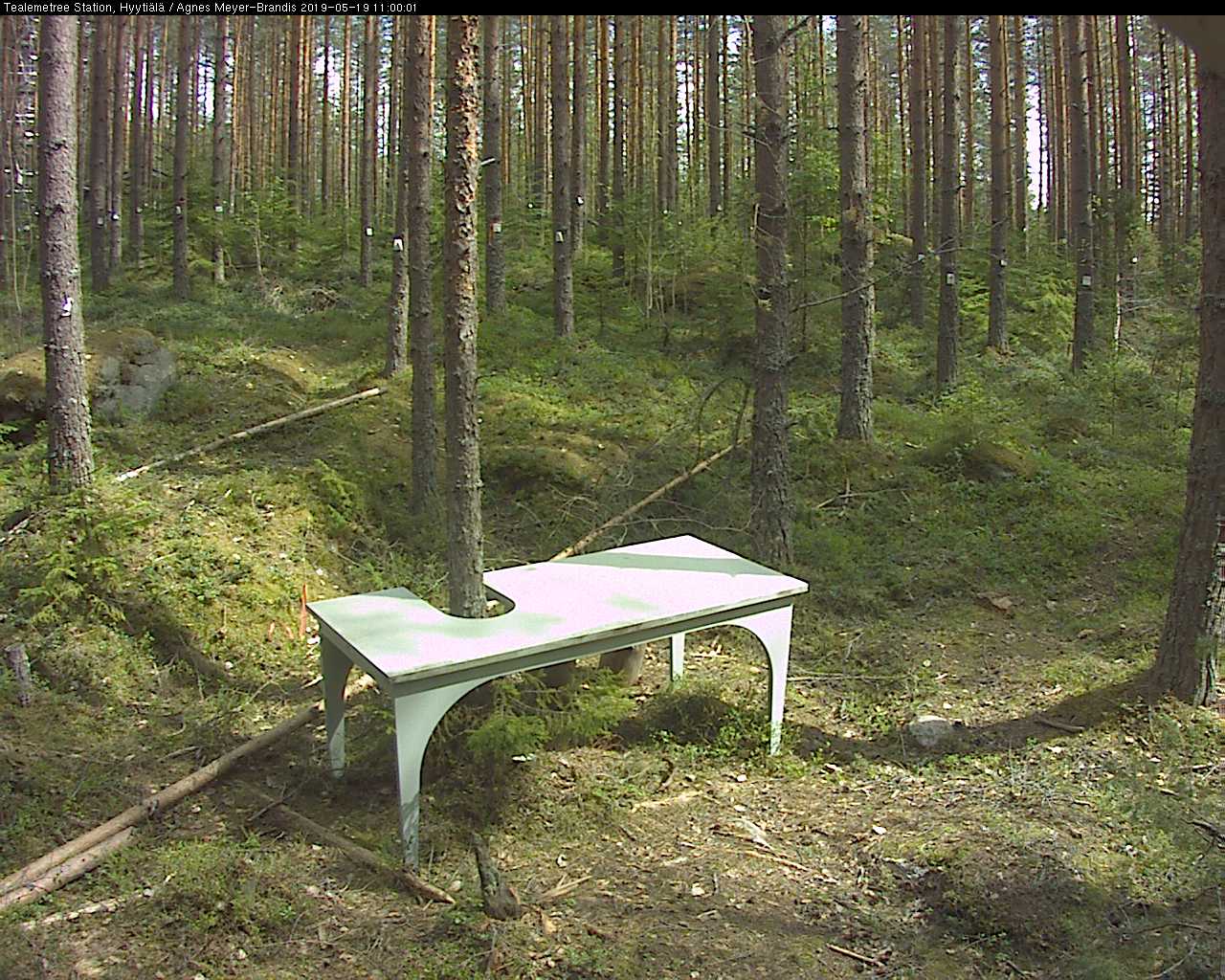 Agnes Meyer-Brandiksen työ Hyytiälässä alkoi tutustumalla aseman muihin tutkijoihin. Pystyäkseen tapaamaan ihmisiä metsässä, hän rakensi pöydän, josta muodostui kohtauspiste ja paikka teehetkille Agneksen ja puun kanssa.