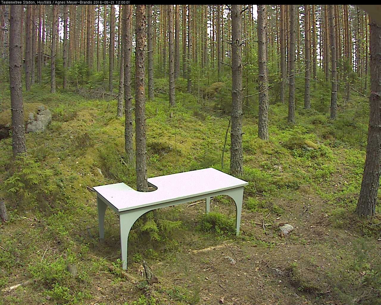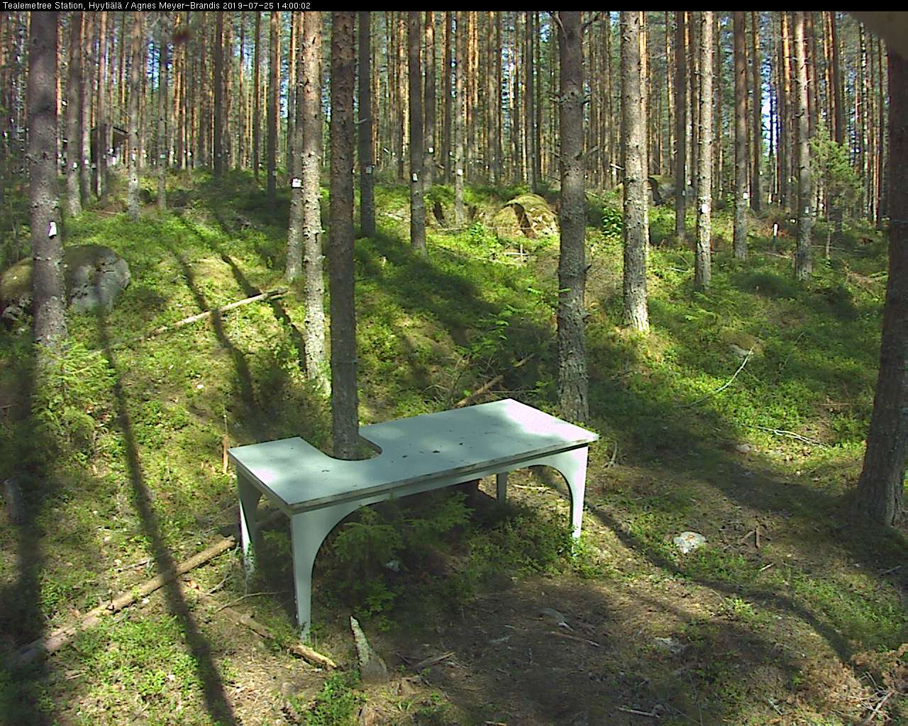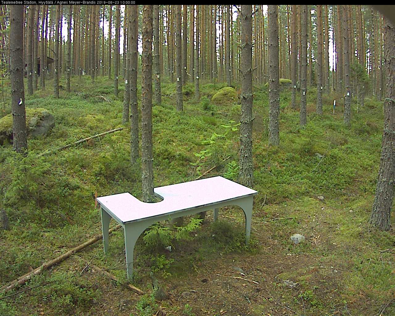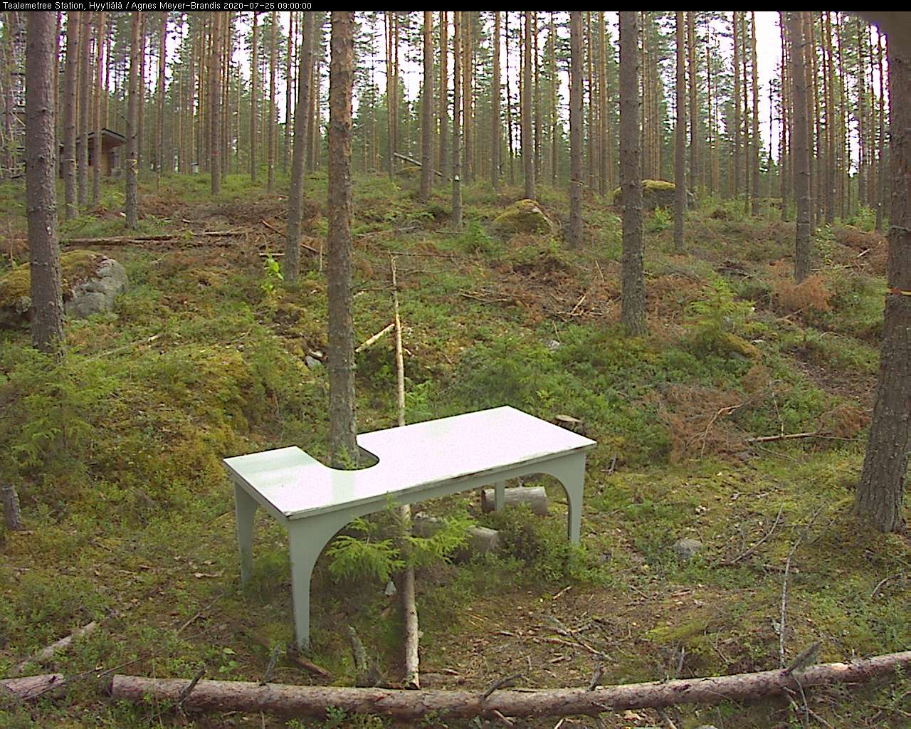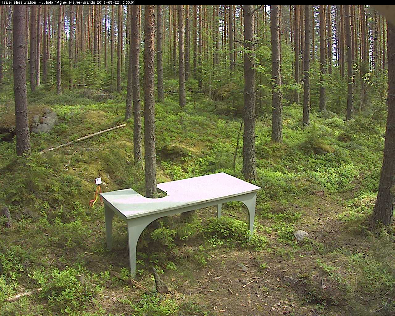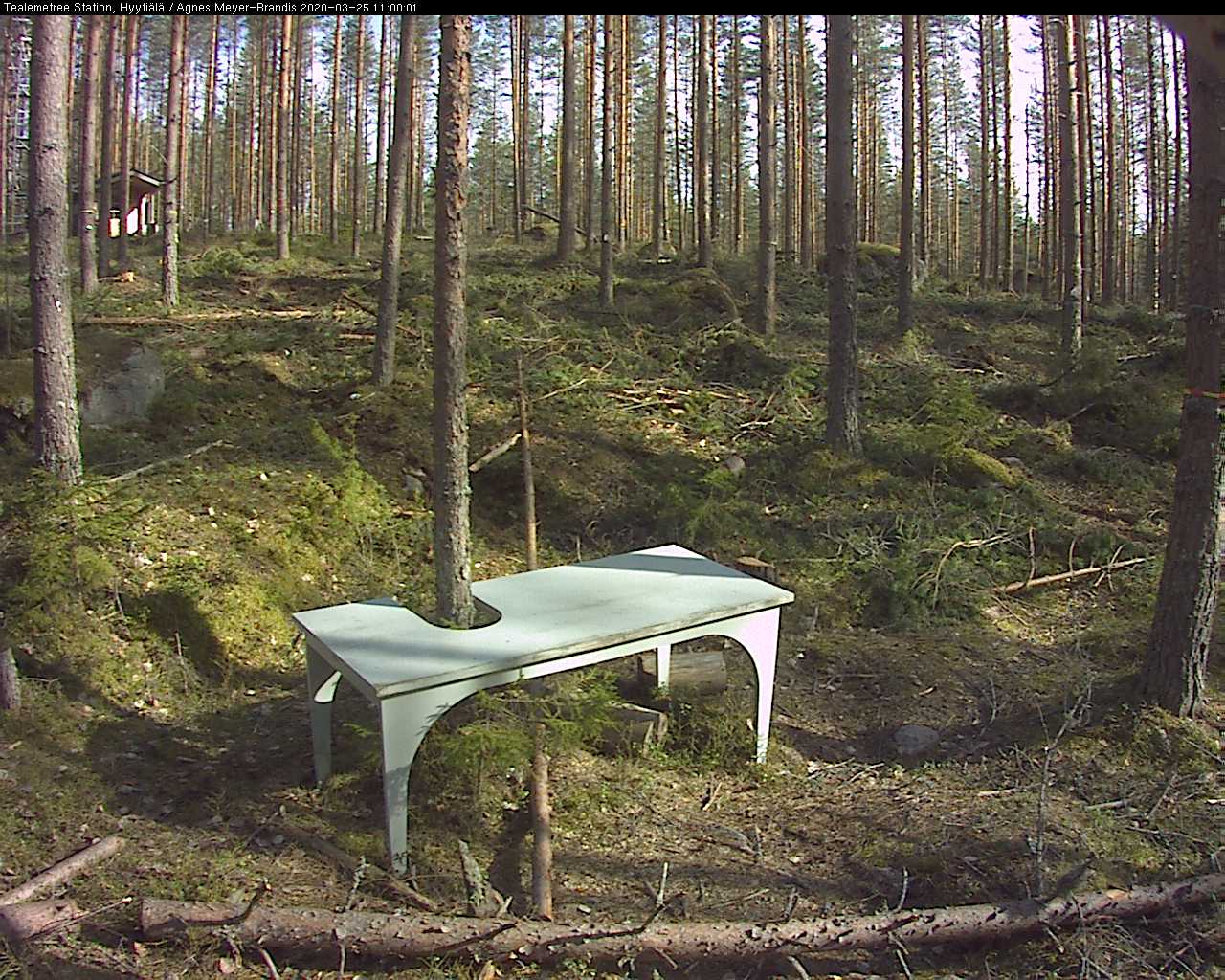Agnes Meyer-Brandiksen työ Hyytiälässä alkoi tutustumalla aseman muihin tutkijoihin. Pystyäkseen tapaamaan ihmisiä metsässä, hän rakensi pöydän, josta muodostui kohtauspiste ja paikka teehetkille Agneksen ja puun kanssa.