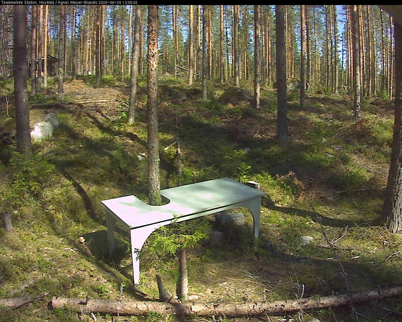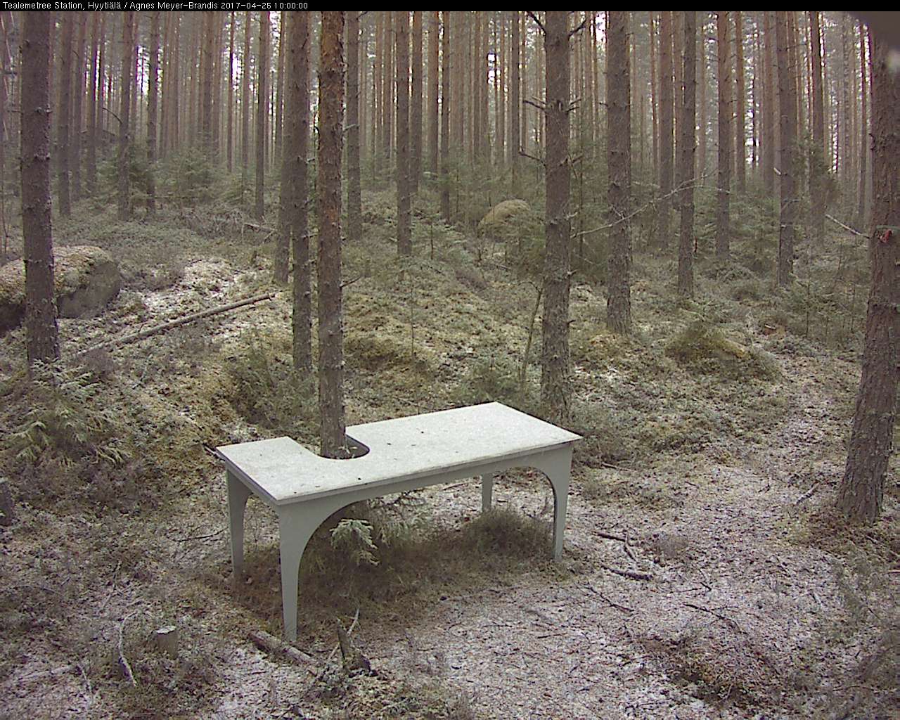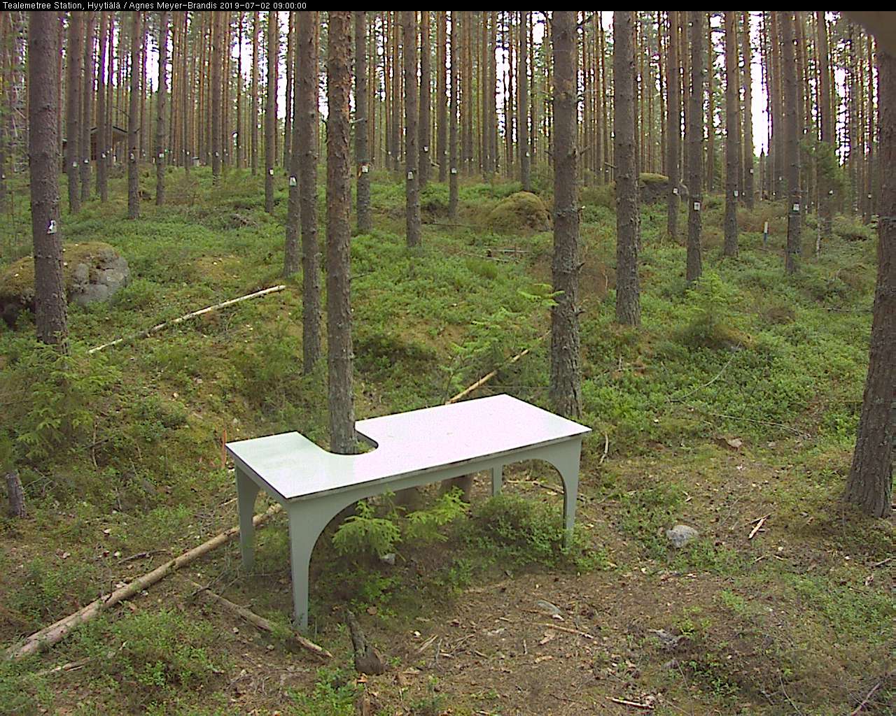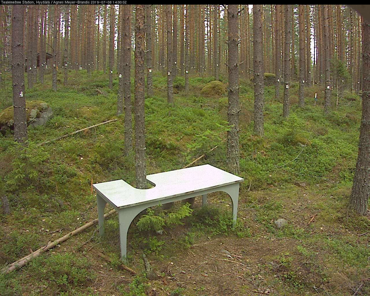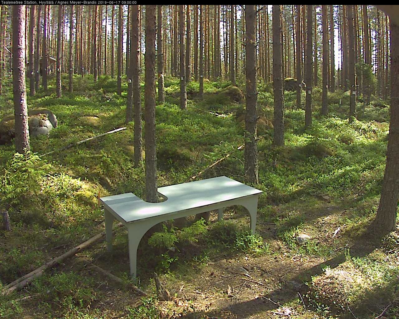 Agnes Meyer-Brandiksen työ Hyytiälässä alkoi tutustumalla aseman muihin tutkijoihin. Pystyäkseen tapaamaan ihmisiä metsässä, hän rakensi pöydän, josta muodostui kohtauspiste ja paikka teehetkille Agneksen ja puun kanssa.