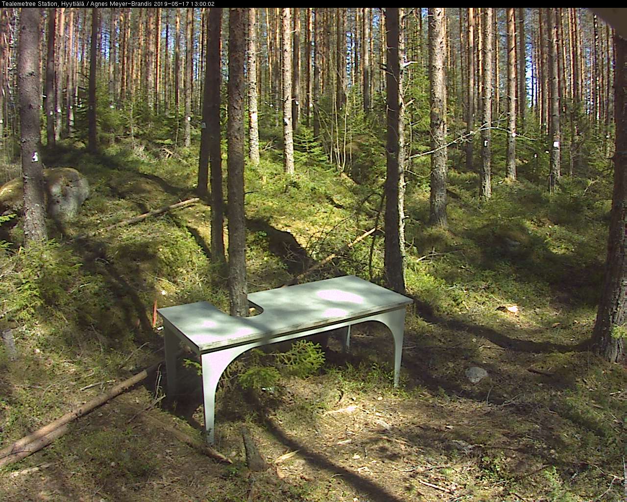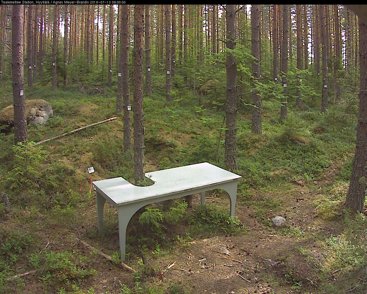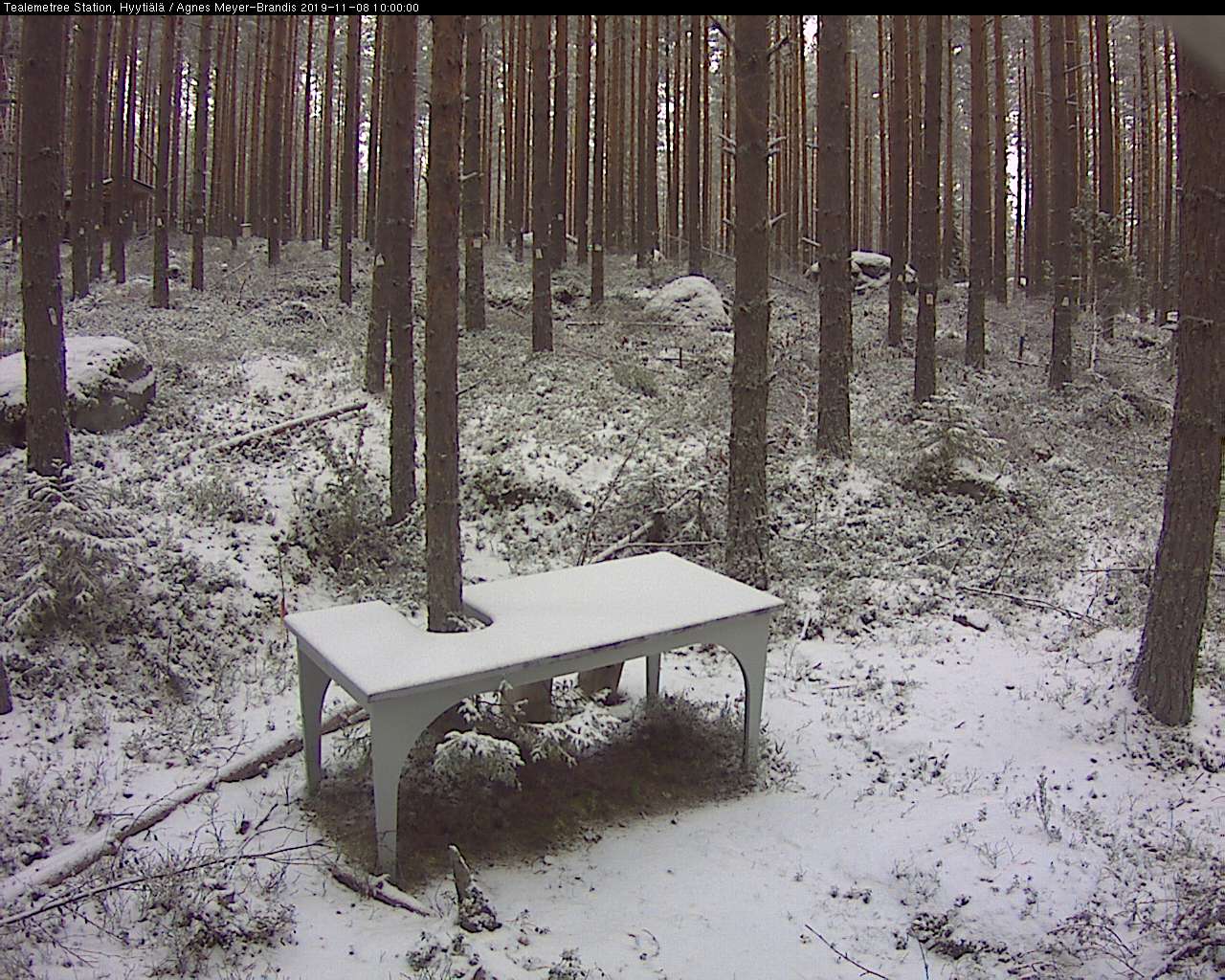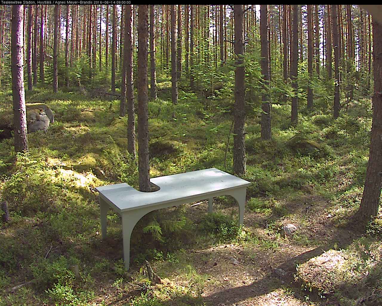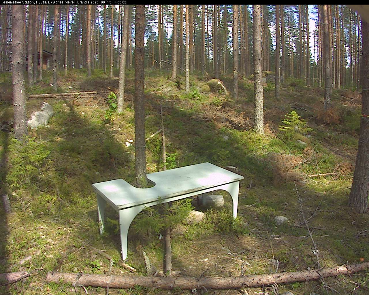 Agnes Meyer-Brandiksen työ Hyytiälässä alkoi tutustumalla aseman muihin tutkijoihin. Pystyäkseen tapaamaan ihmisiä metsässä, hän rakensi pöydän, josta muodostui kohtauspiste ja paikka teehetkille Agneksen ja puun kanssa.