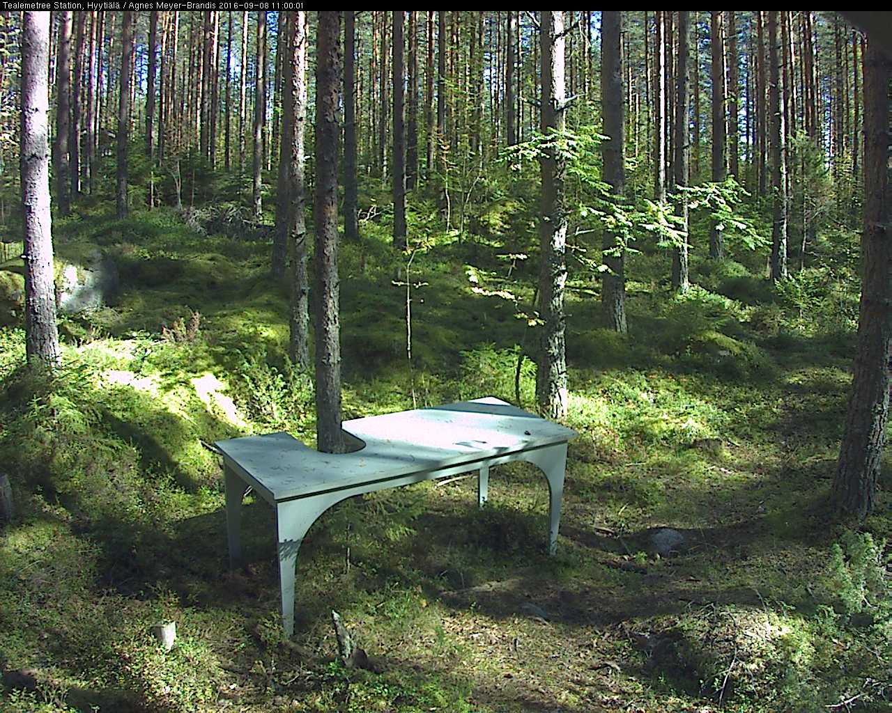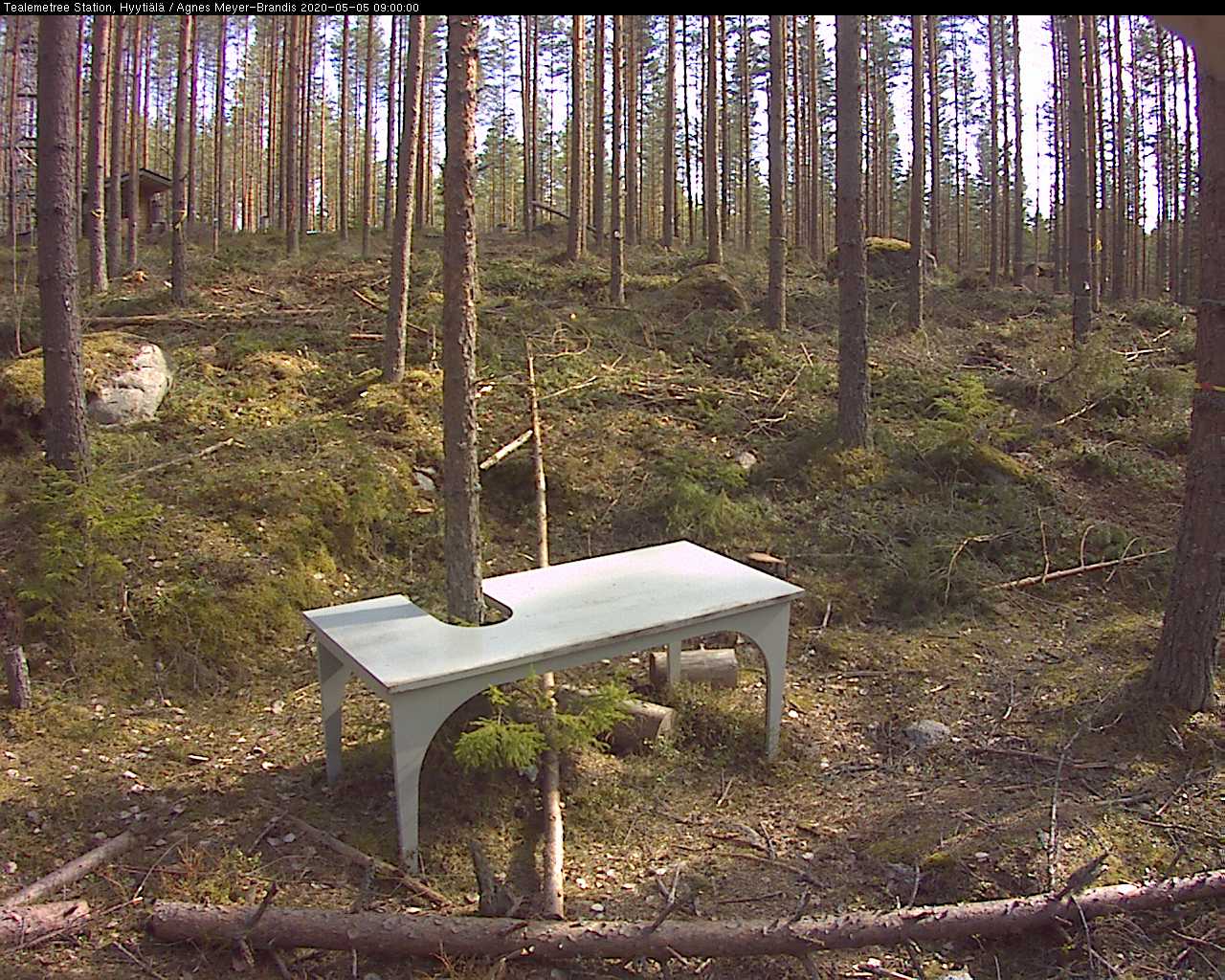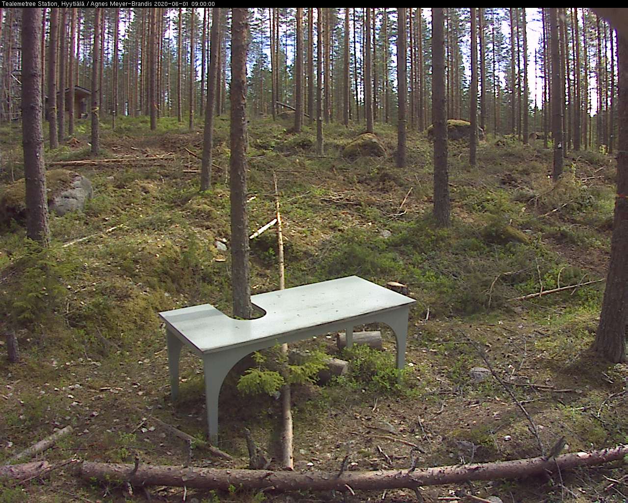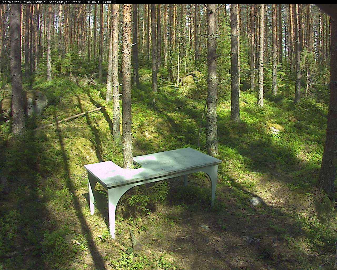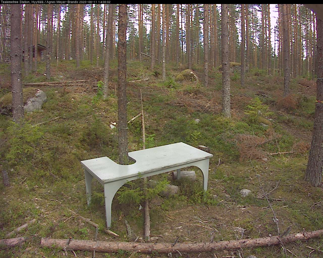 Agnes Meyer-Brandiksen työ Hyytiälässä alkoi tutustumalla aseman muihin tutkijoihin. Pystyäkseen tapaamaan ihmisiä metsässä, hän rakensi pöydän, josta muodostui kohtauspiste ja paikka teehetkille Agneksen ja puun kanssa.