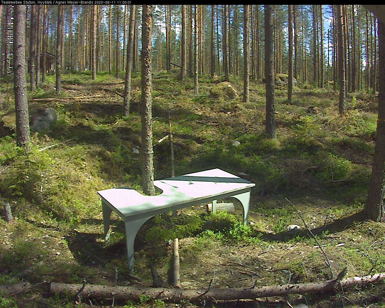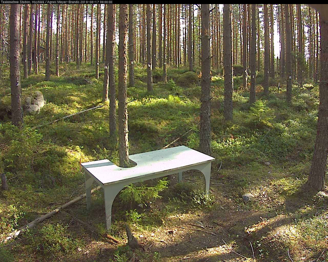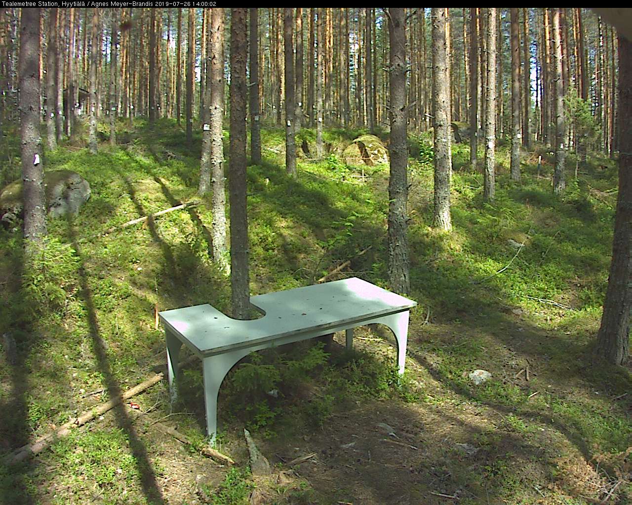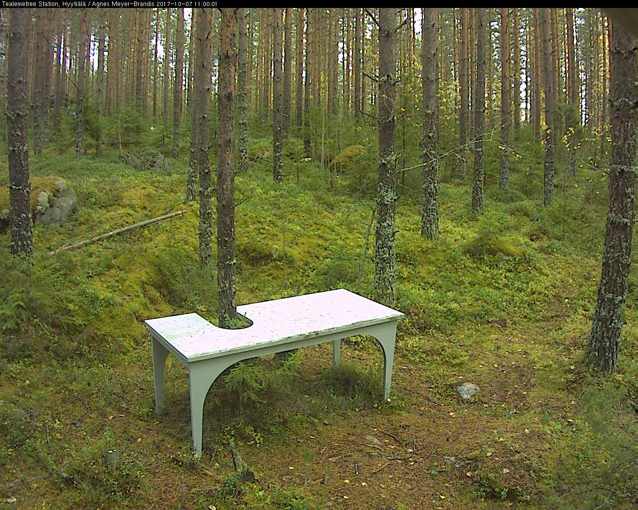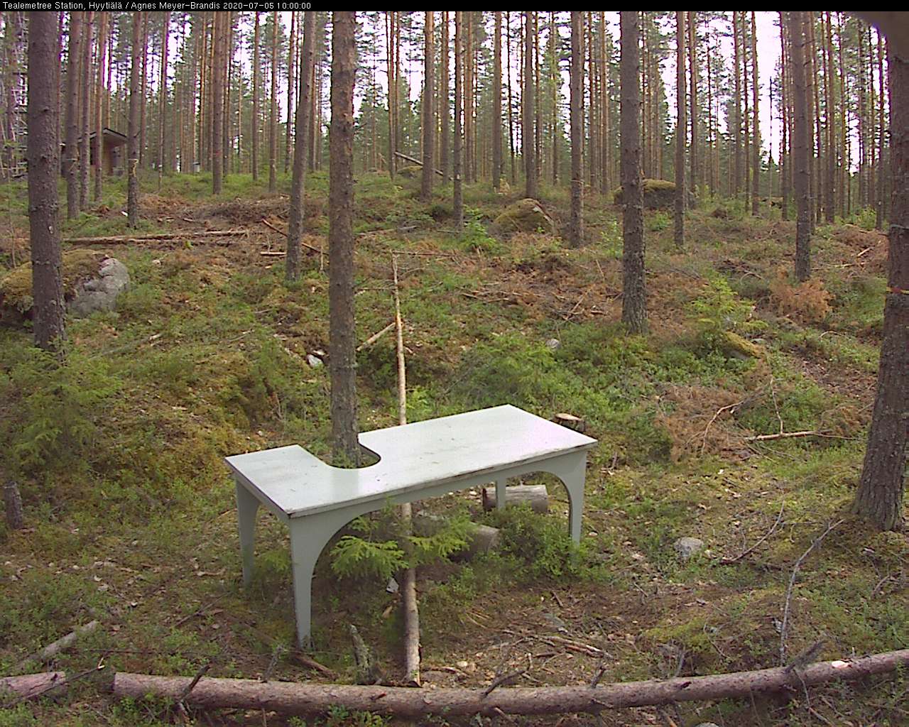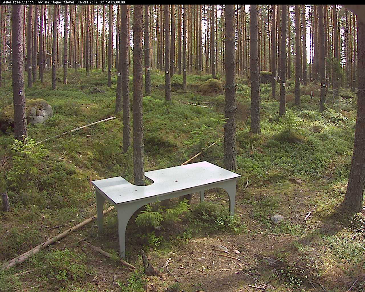 Agnes Meyer-Brandiksen työ Hyytiälässä alkoi tutustumalla aseman muihin tutkijoihin. Pystyäkseen tapaamaan ihmisiä metsässä, hän rakensi pöydän, josta muodostui kohtauspiste ja paikka teehetkille Agneksen ja puun kanssa.