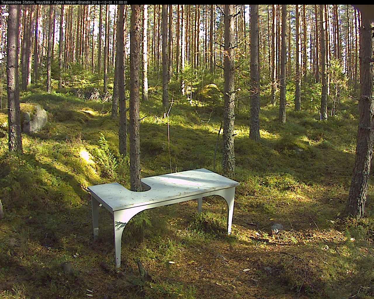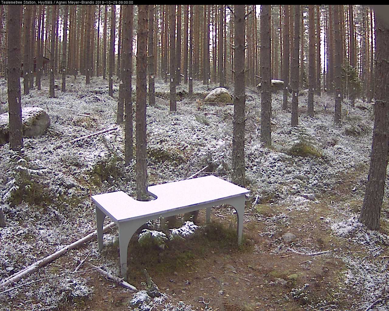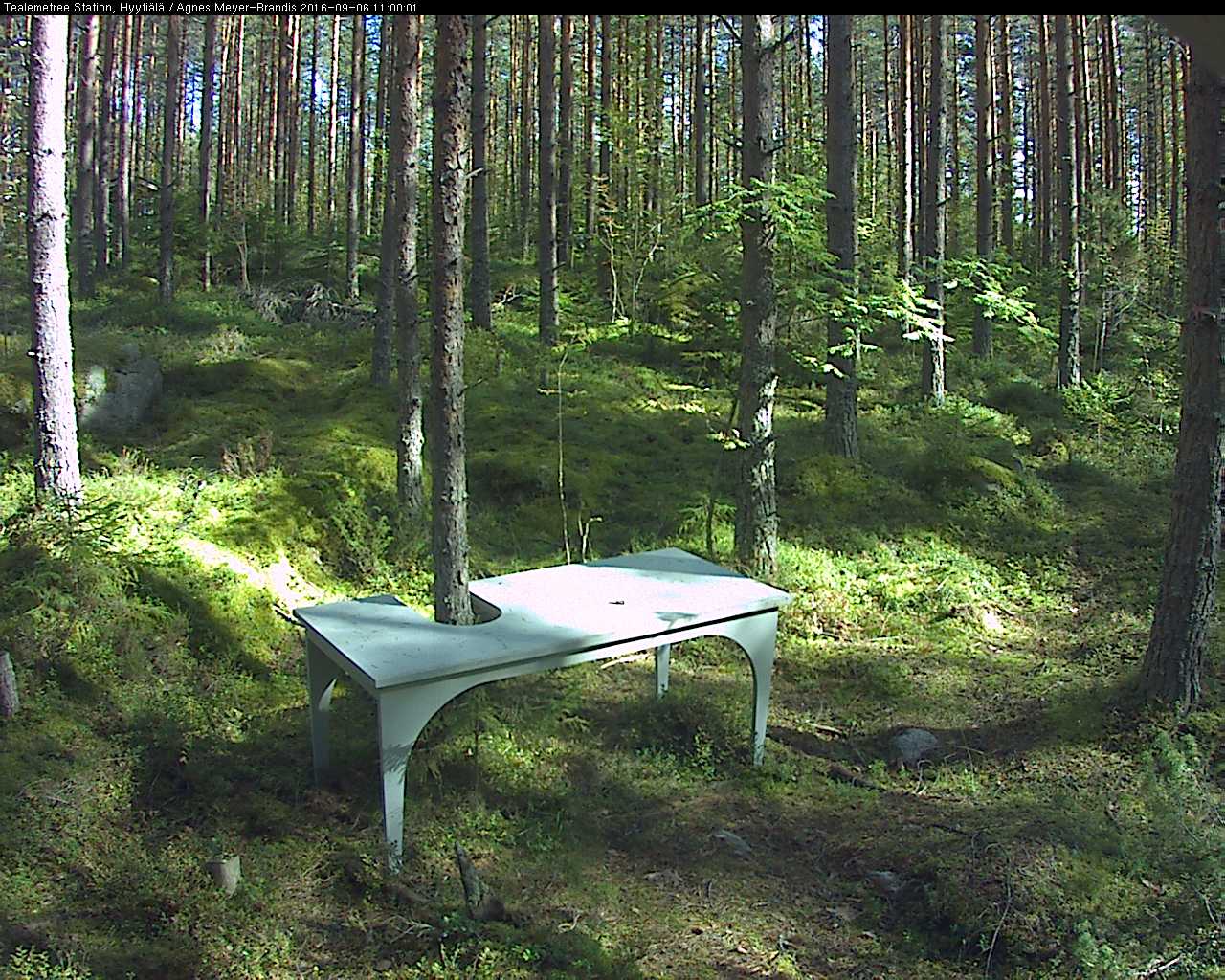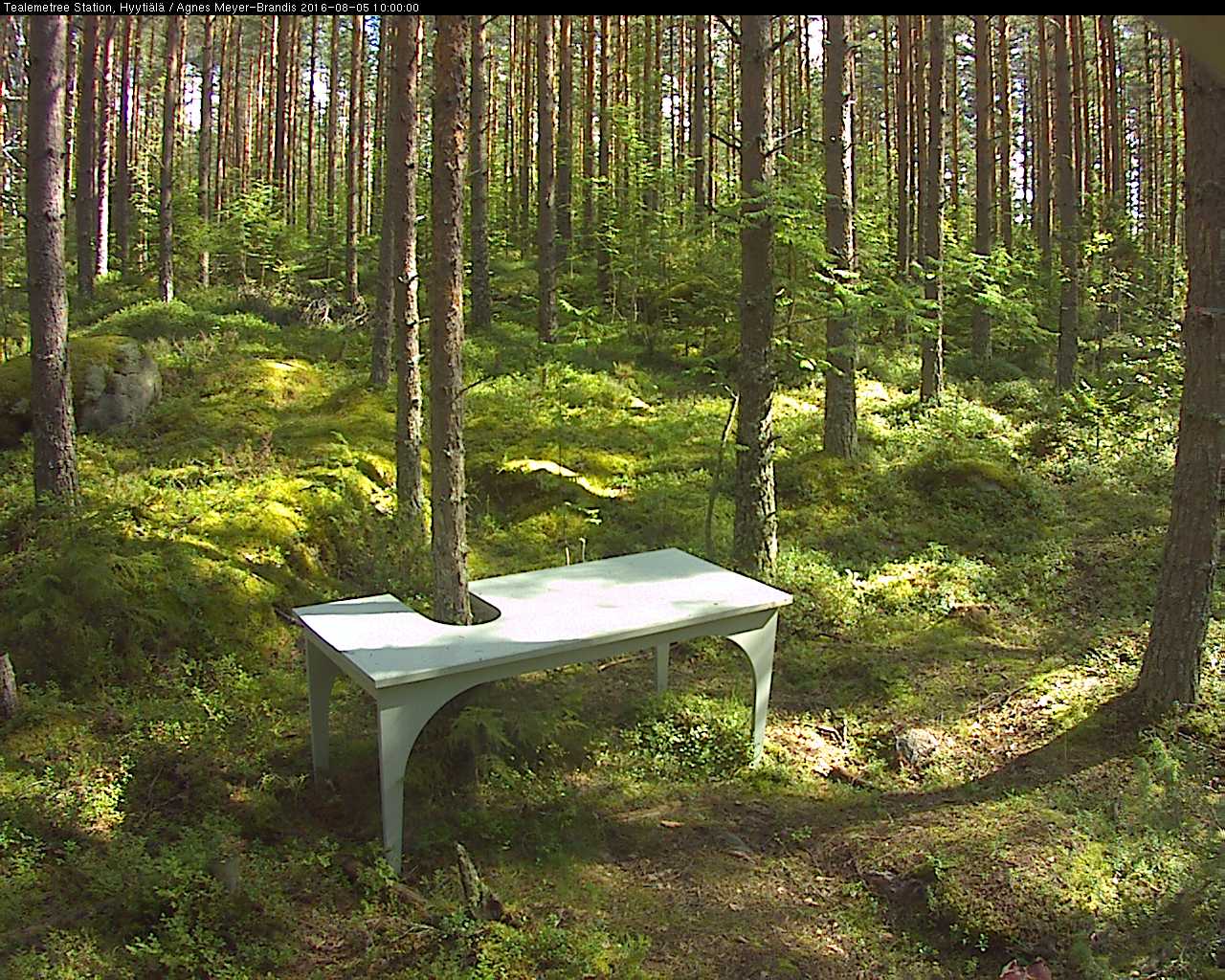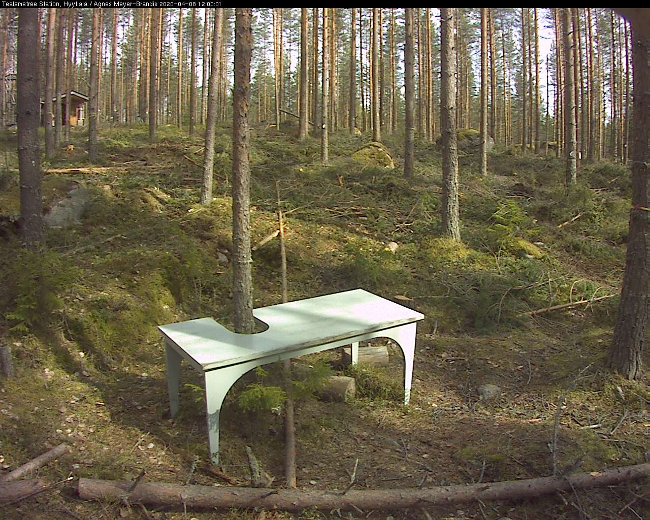 Agnes Meyer-Brandiksen työ Hyytiälässä alkoi tutustumalla aseman muihin tutkijoihin. Pystyäkseen tapaamaan ihmisiä metsässä, hän rakensi pöydän, josta muodostui kohtauspiste ja paikka teehetkille Agneksen ja puun kanssa.