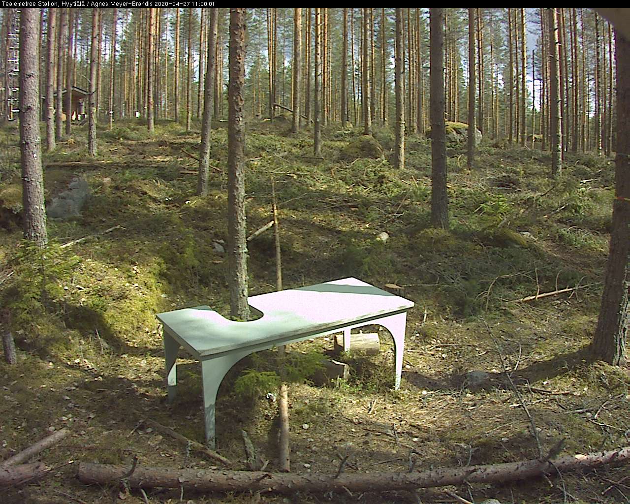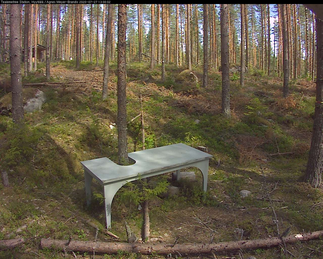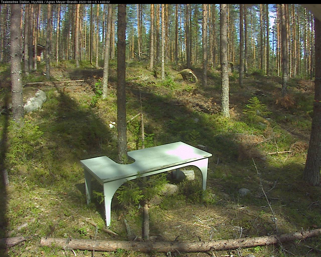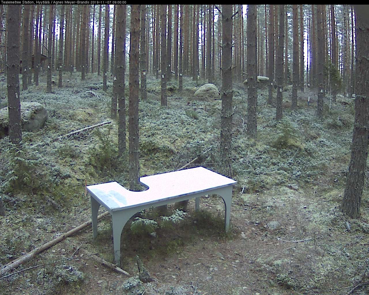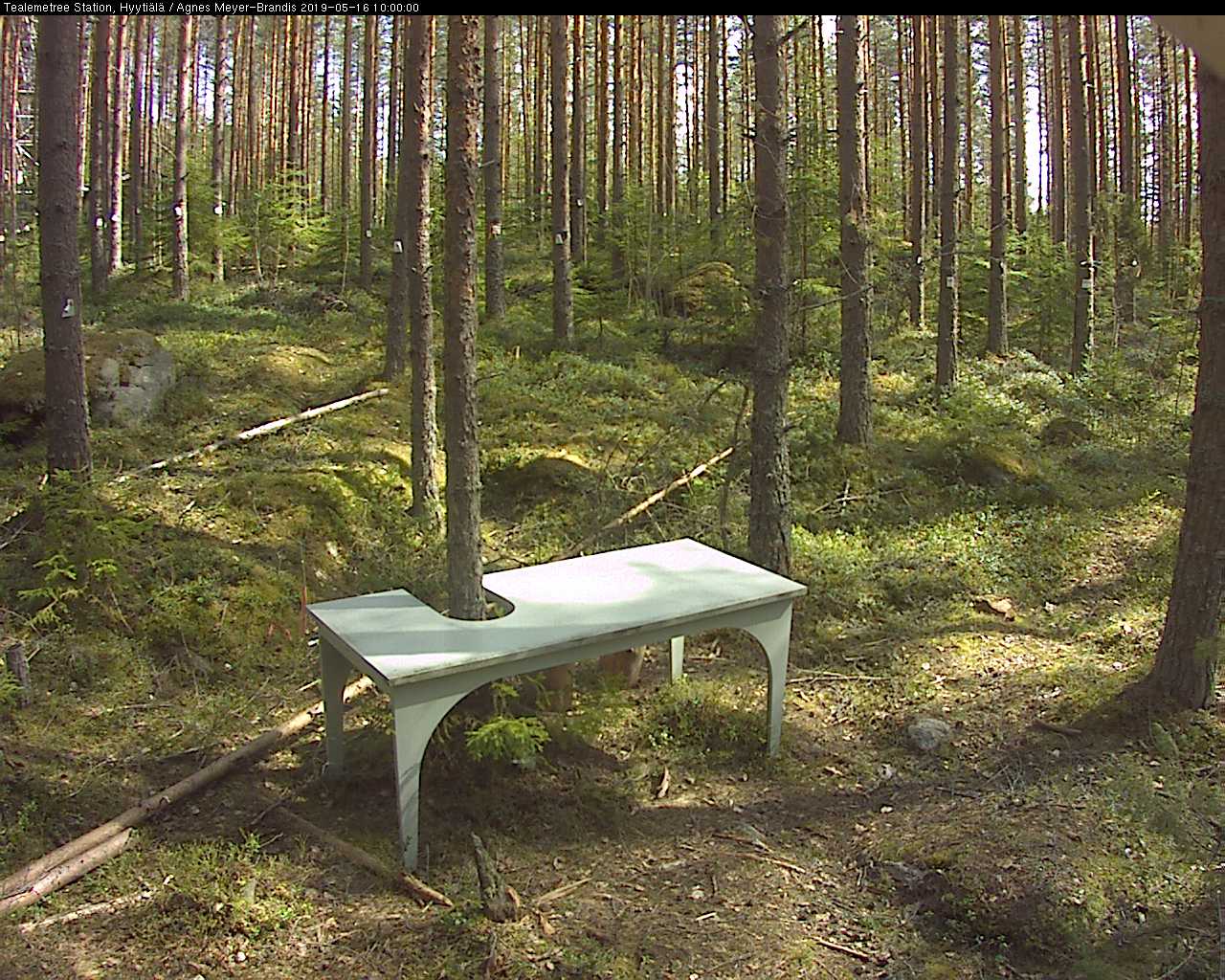 Agnes Meyer-Brandiksen työ Hyytiälässä alkoi tutustumalla aseman muihin tutkijoihin. Pystyäkseen tapaamaan ihmisiä metsässä, hän rakensi pöydän, josta muodostui kohtauspiste ja paikka teehetkille Agneksen ja puun kanssa.