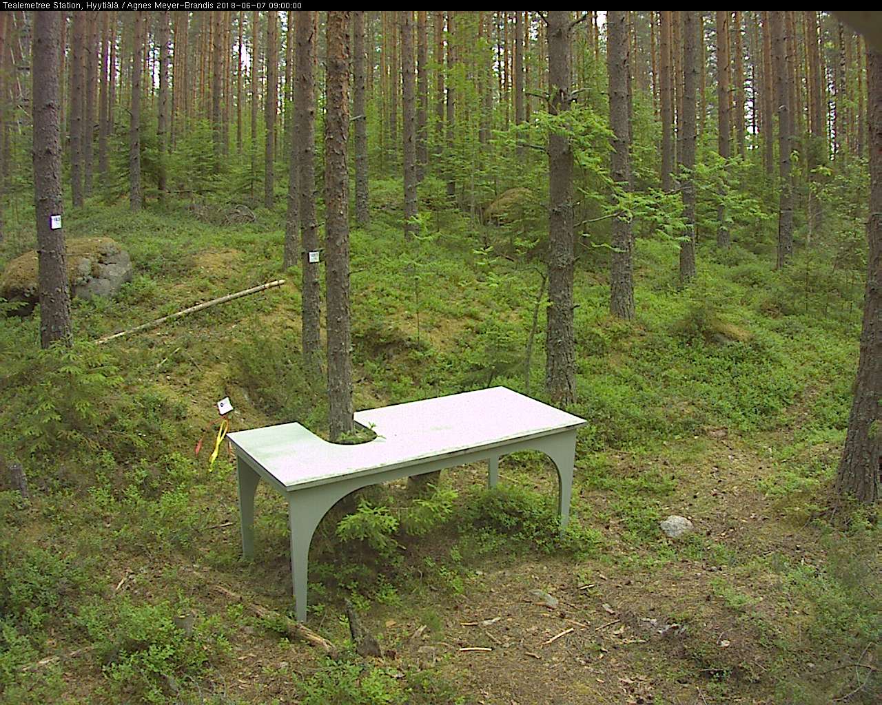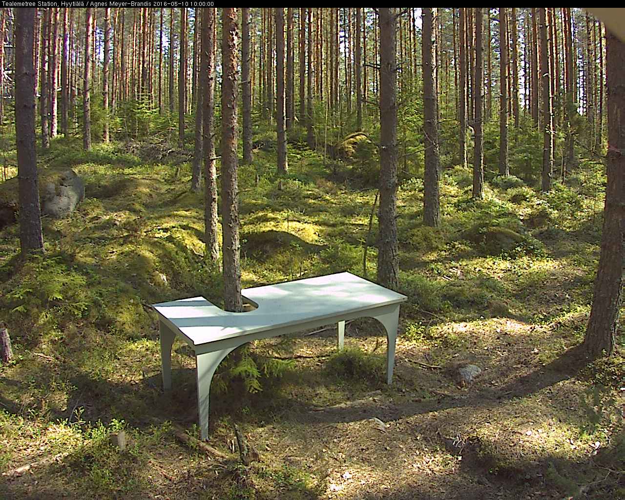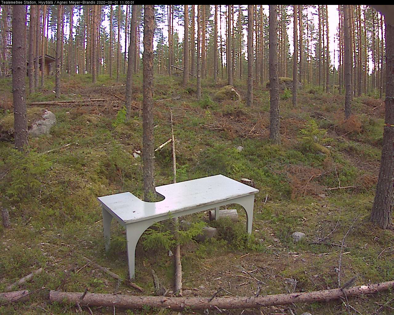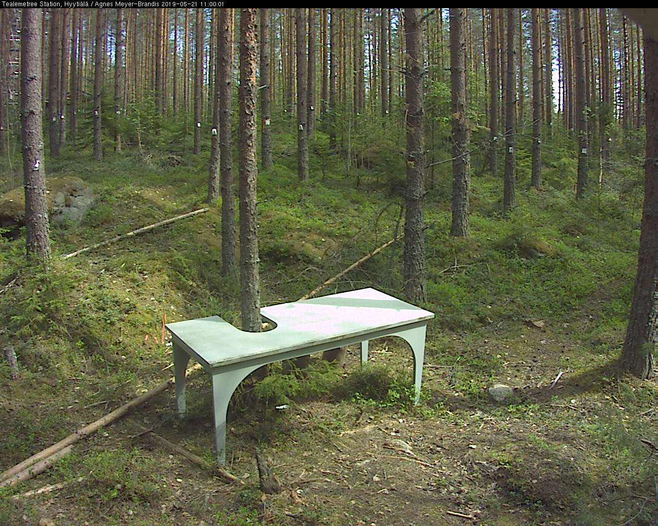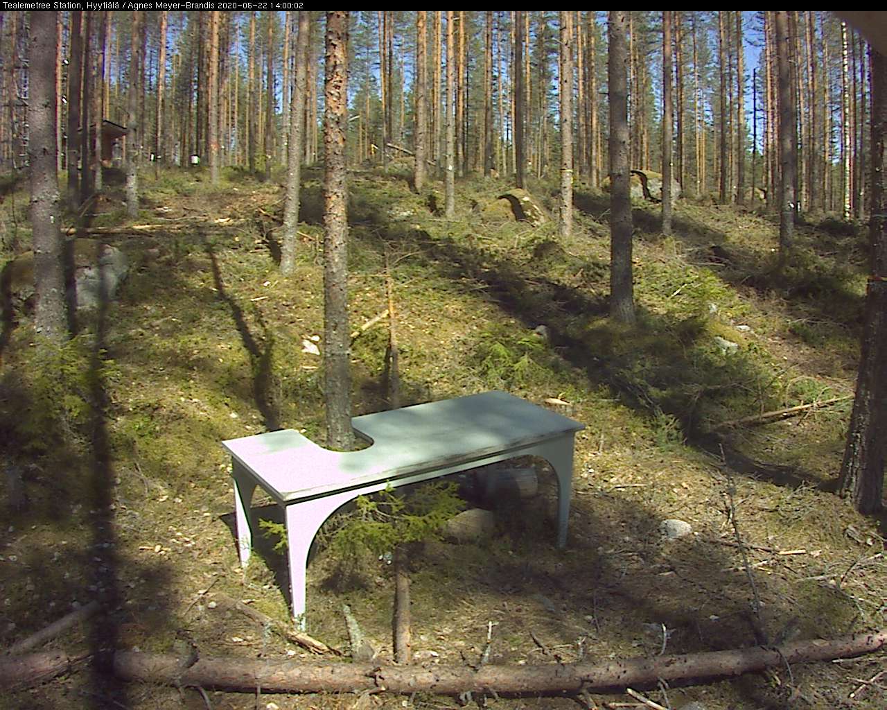 Agnes Meyer-Brandiksen työ Hyytiälässä alkoi tutustumalla aseman muihin tutkijoihin. Pystyäkseen tapaamaan ihmisiä metsässä, hän rakensi pöydän, josta muodostui kohtauspiste ja paikka teehetkille Agneksen ja puun kanssa.