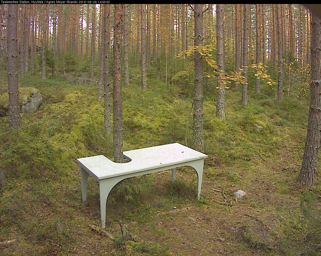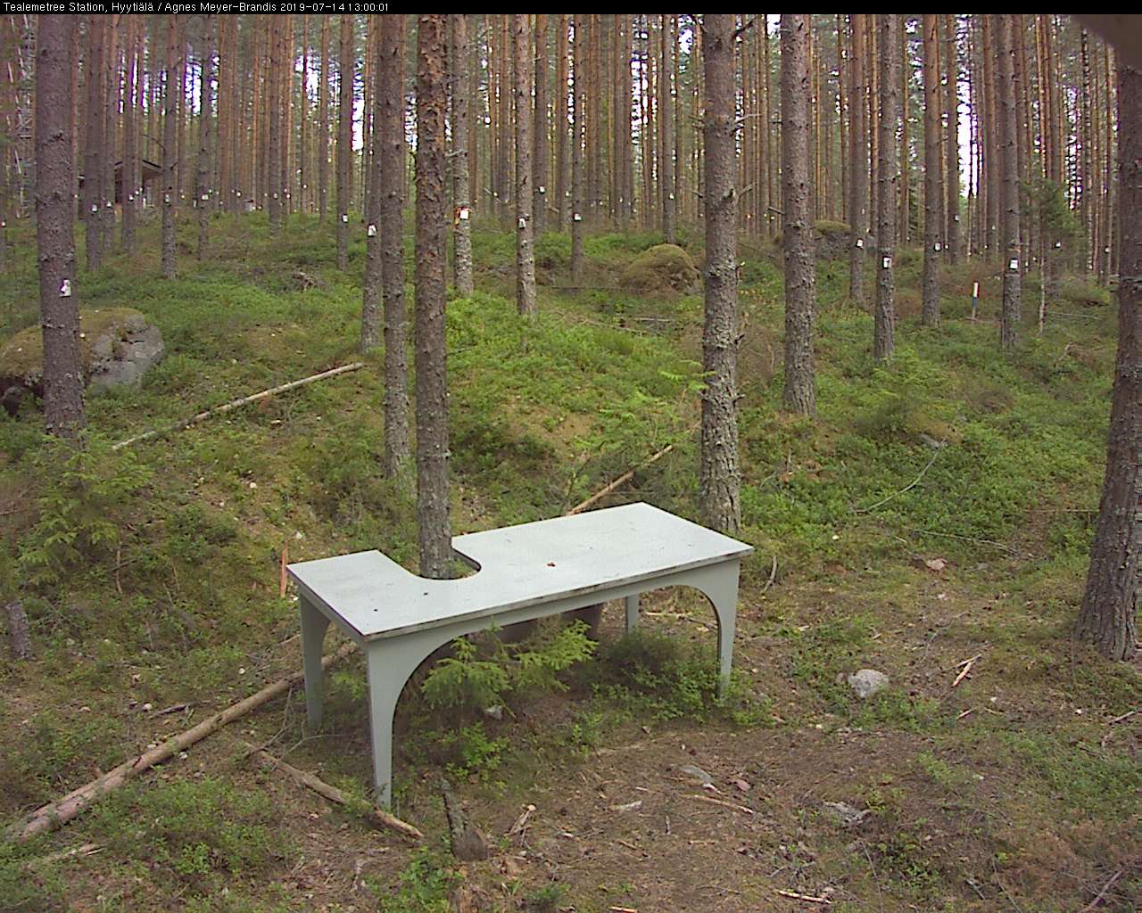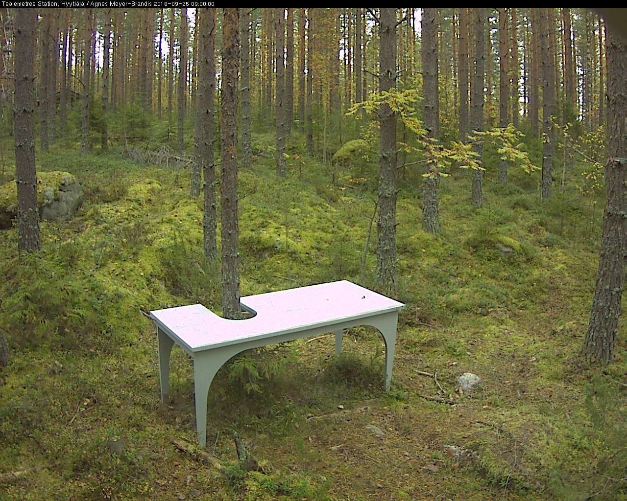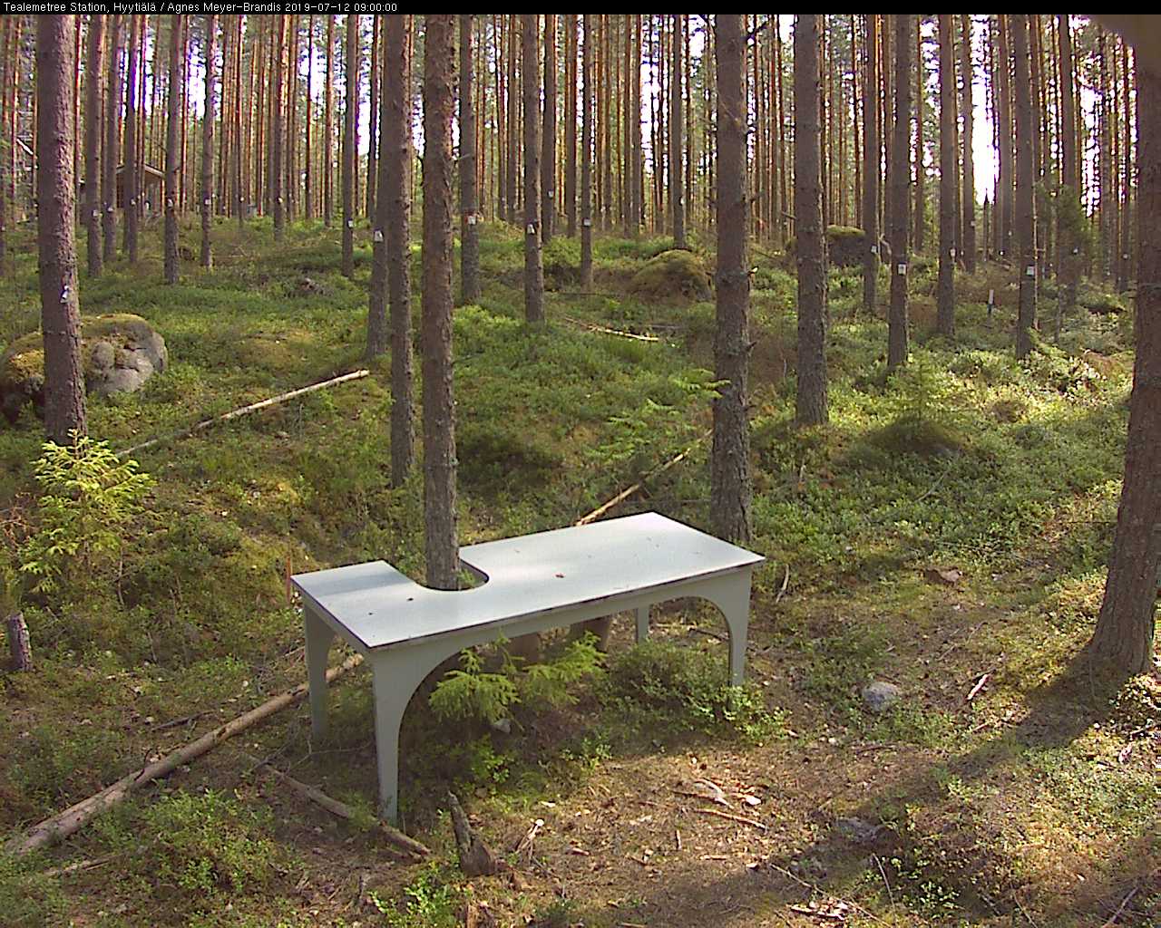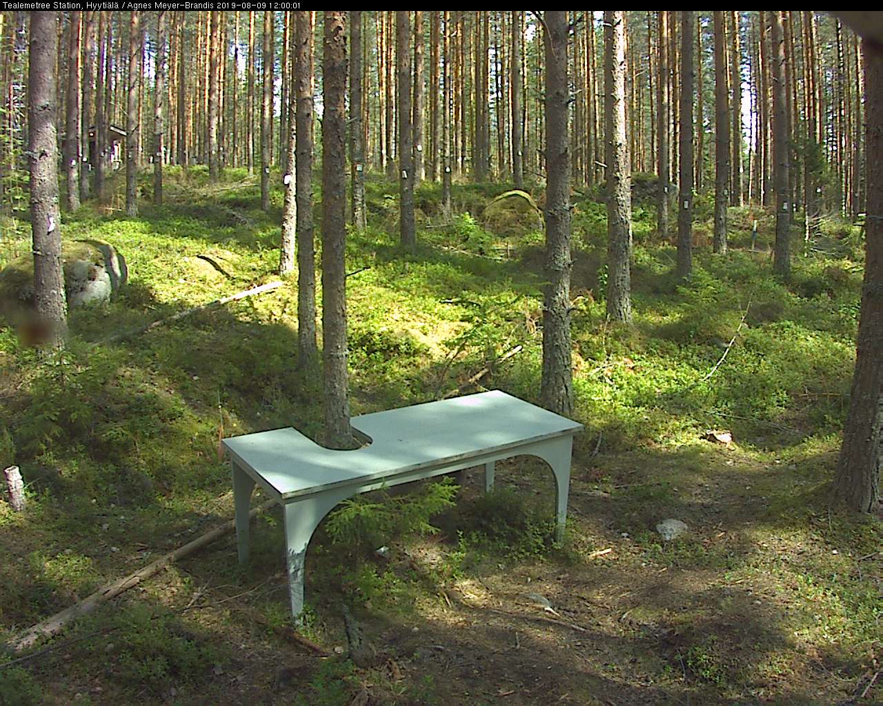 Agnes Meyer-Brandiksen työ Hyytiälässä alkoi tutustumalla aseman muihin tutkijoihin. Pystyäkseen tapaamaan ihmisiä metsässä, hän rakensi pöydän, josta muodostui kohtauspiste ja paikka teehetkille Agneksen ja puun kanssa.