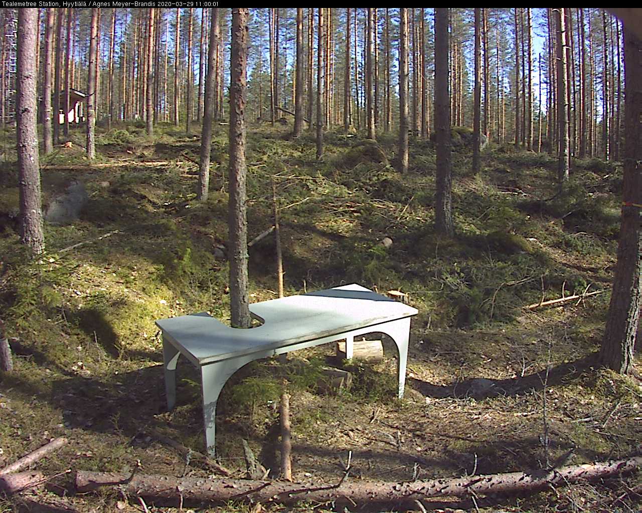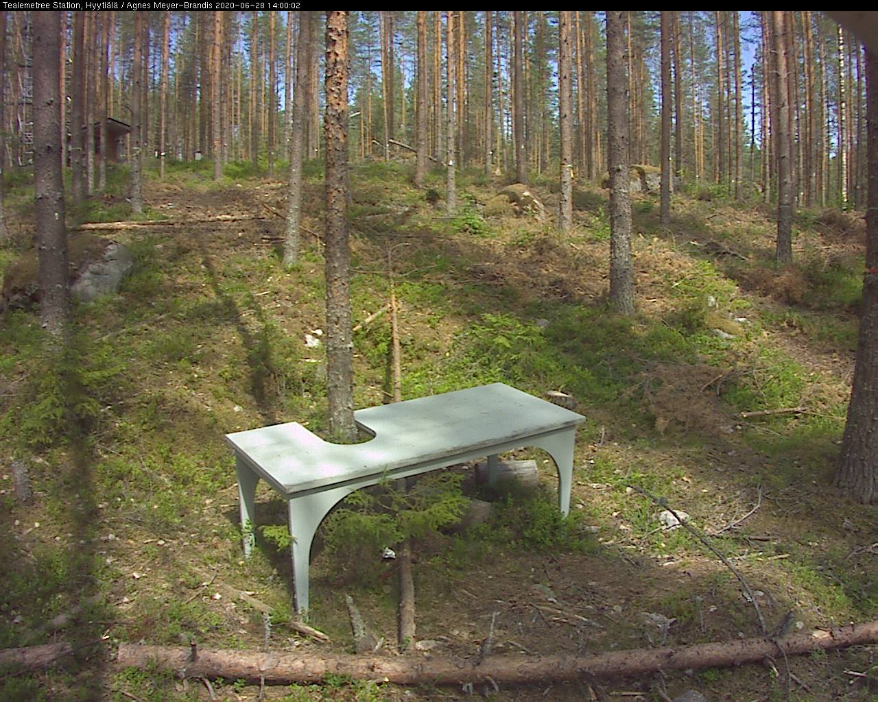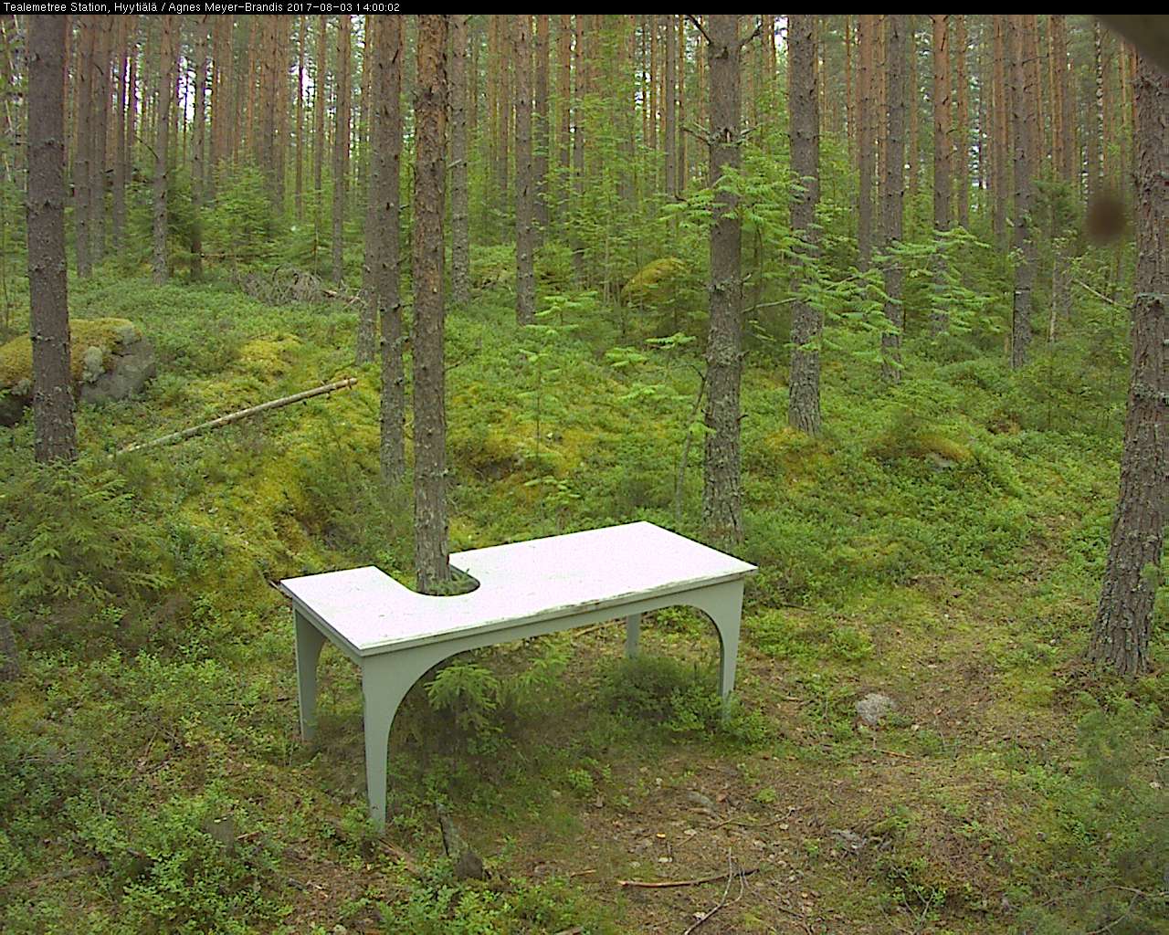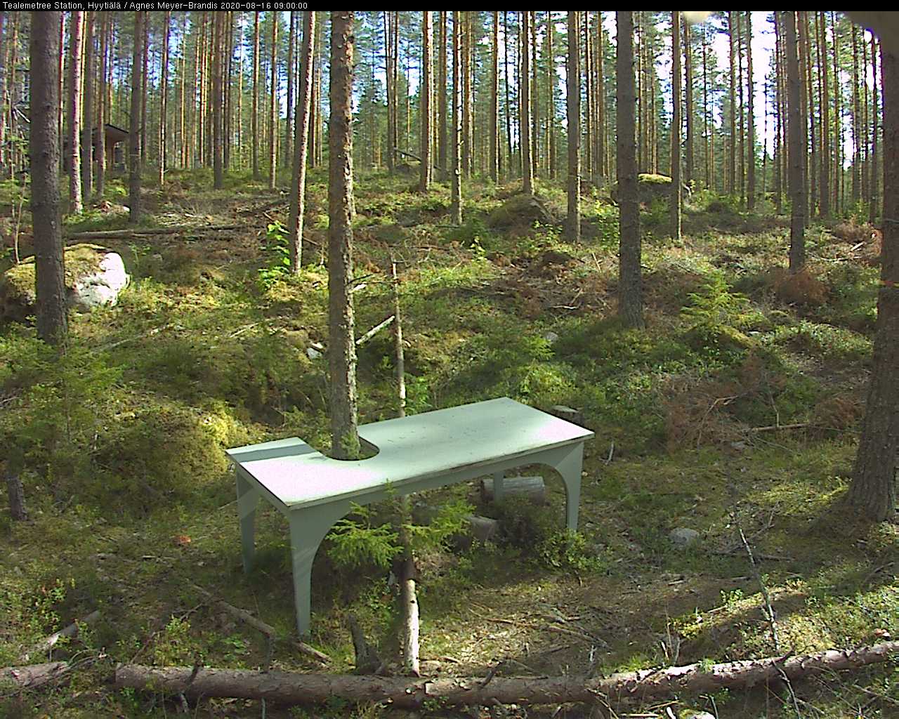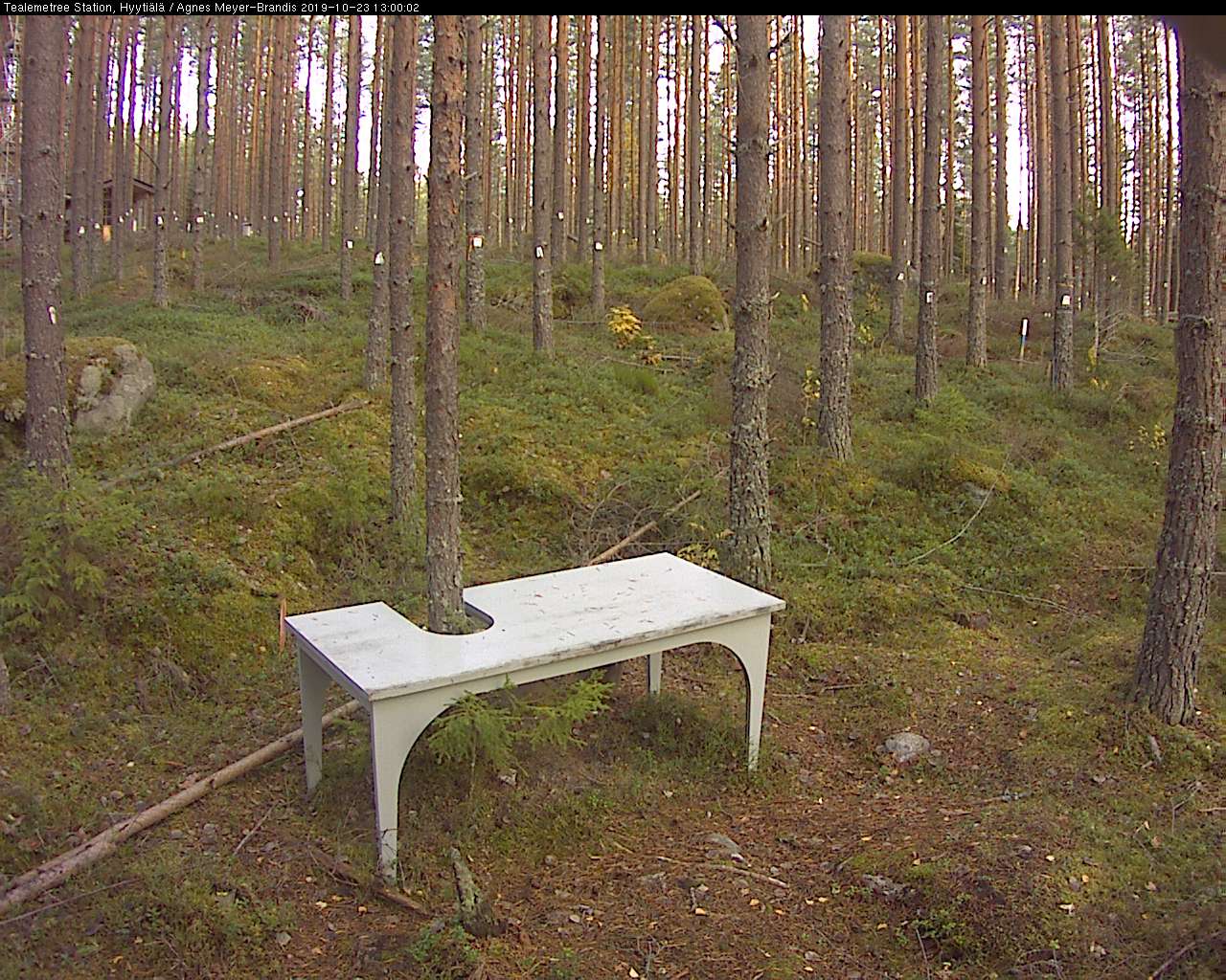 Agnes Meyer-Brandiksen työ Hyytiälässä alkoi tutustumalla aseman muihin tutkijoihin. Pystyäkseen tapaamaan ihmisiä metsässä, hän rakensi pöydän, josta muodostui kohtauspiste ja paikka teehetkille Agneksen ja puun kanssa.