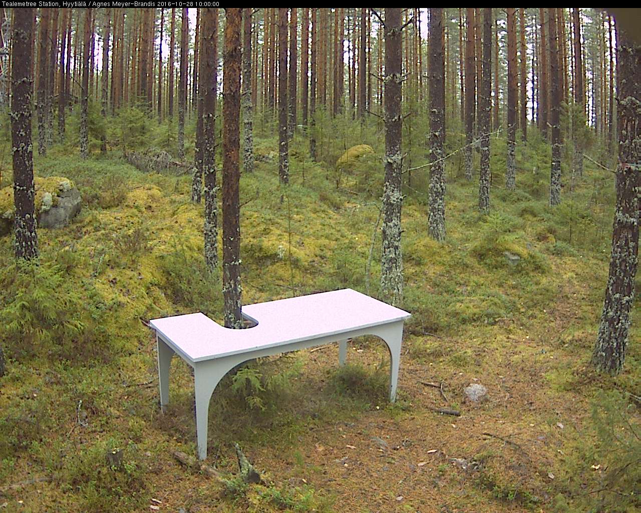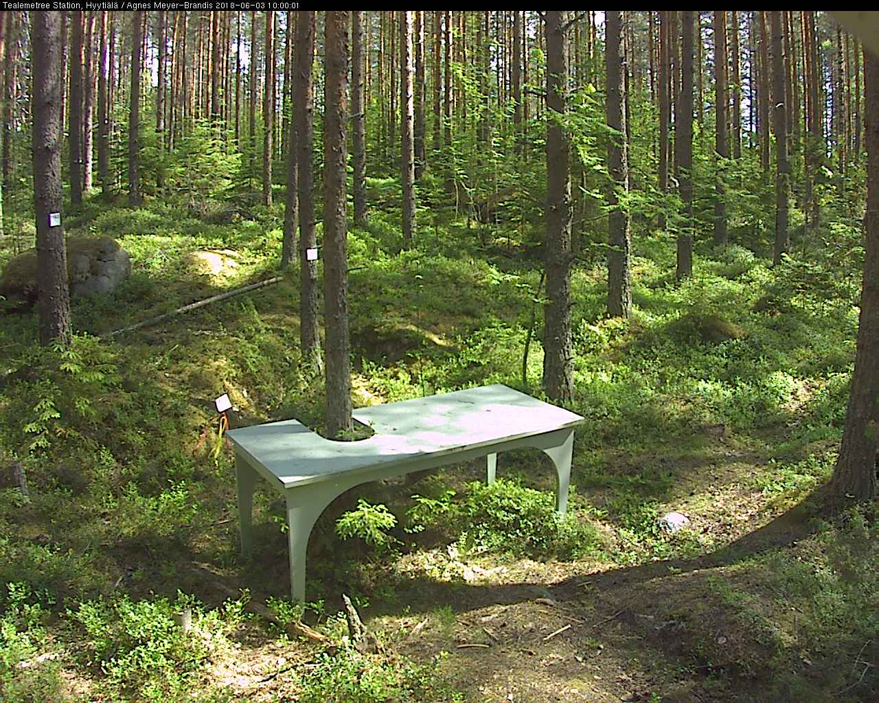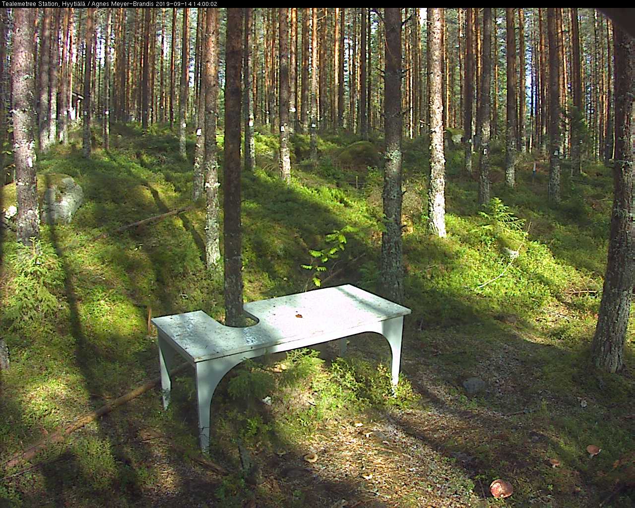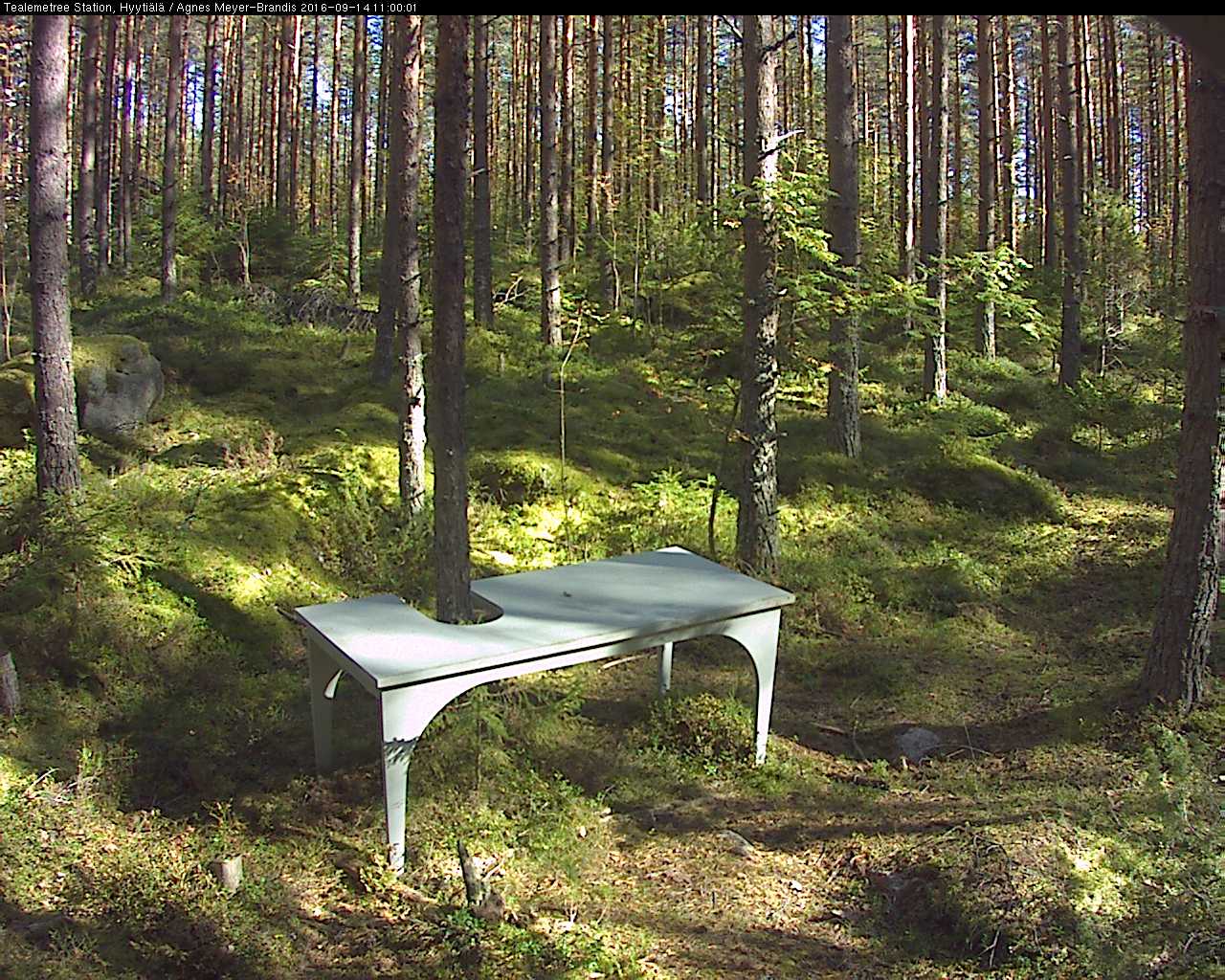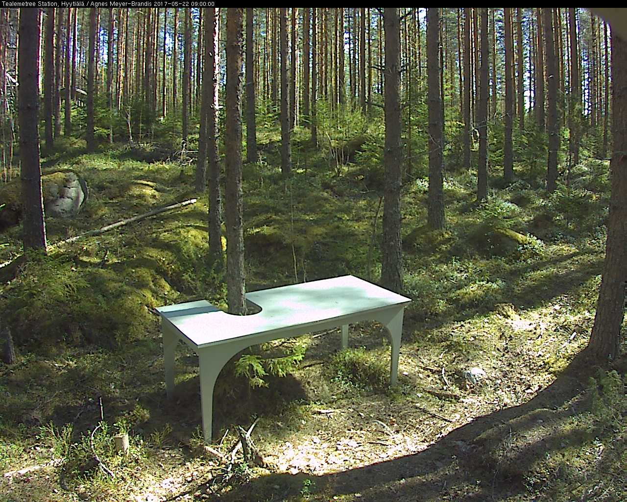 Agnes Meyer-Brandiksen työ Hyytiälässä alkoi tutustumalla aseman muihin tutkijoihin. Pystyäkseen tapaamaan ihmisiä metsässä, hän rakensi pöydän, josta muodostui kohtauspiste ja paikka teehetkille Agneksen ja puun kanssa.