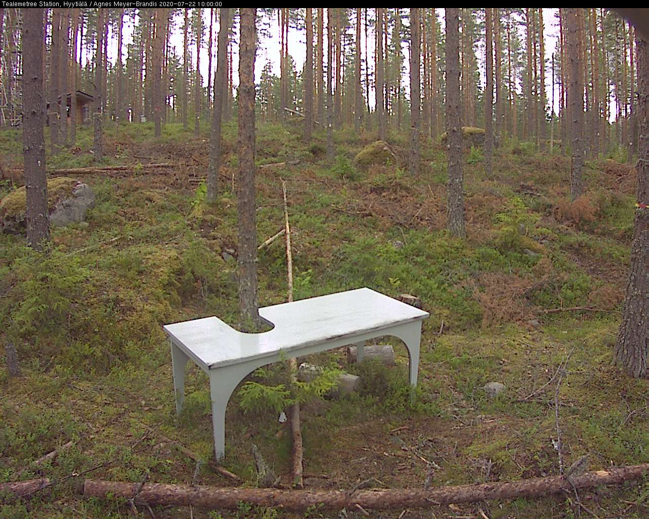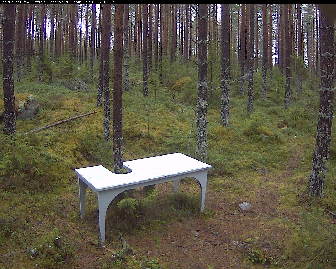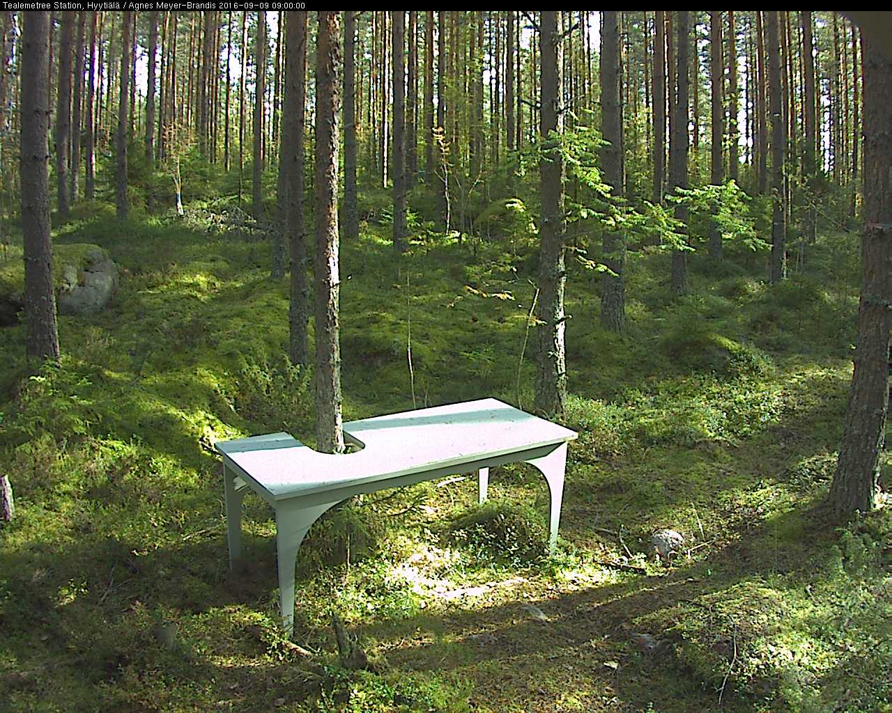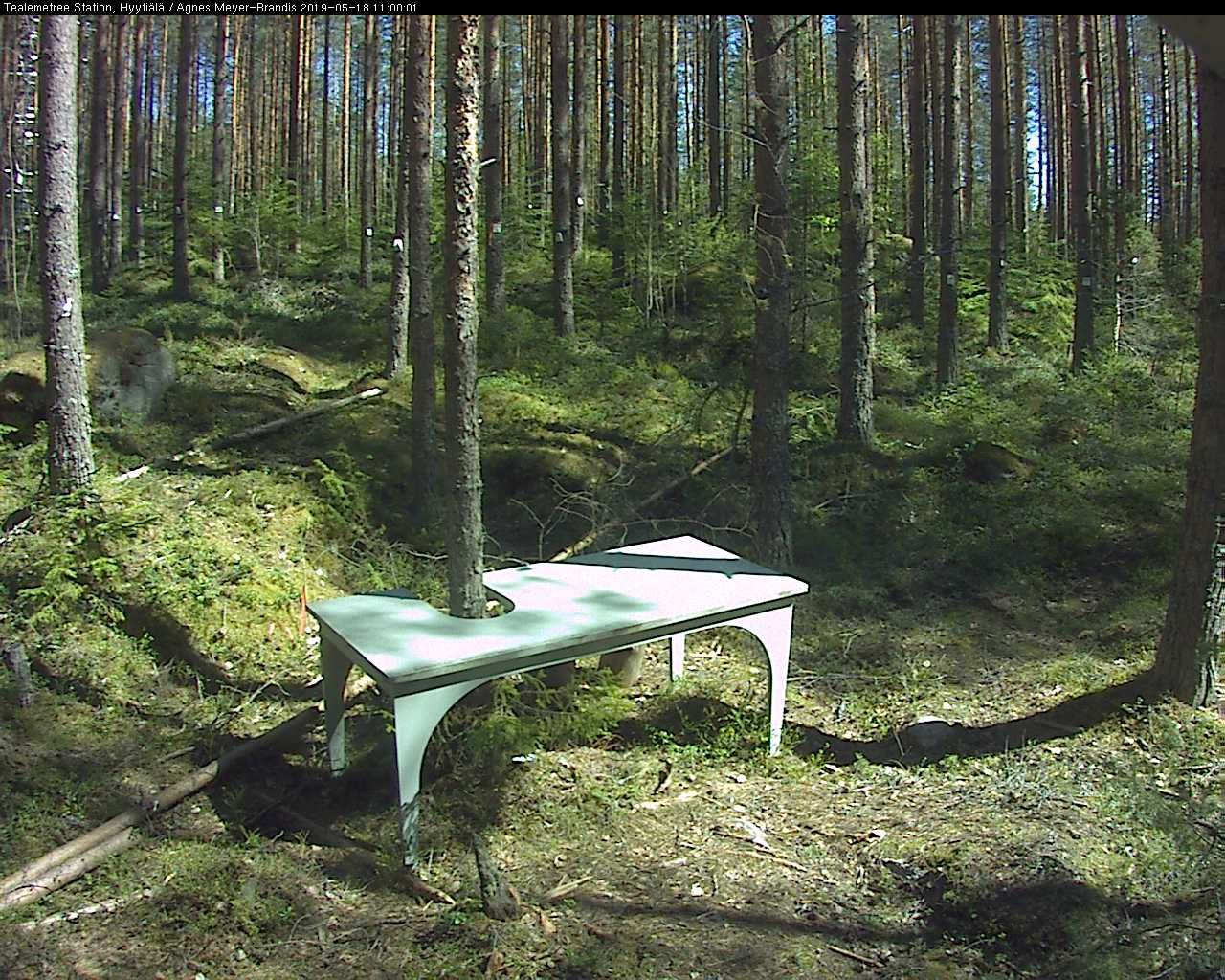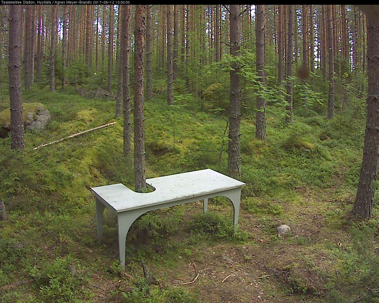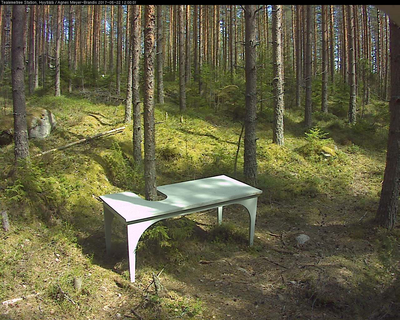 Agnes Meyer-Brandiksen työ Hyytiälässä alkoi tutustumalla aseman muihin tutkijoihin. Pystyäkseen tapaamaan ihmisiä metsässä, hän rakensi pöydän, josta muodostui kohtauspiste ja paikka teehetkille Agneksen ja puun kanssa.