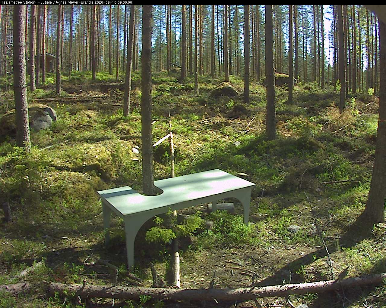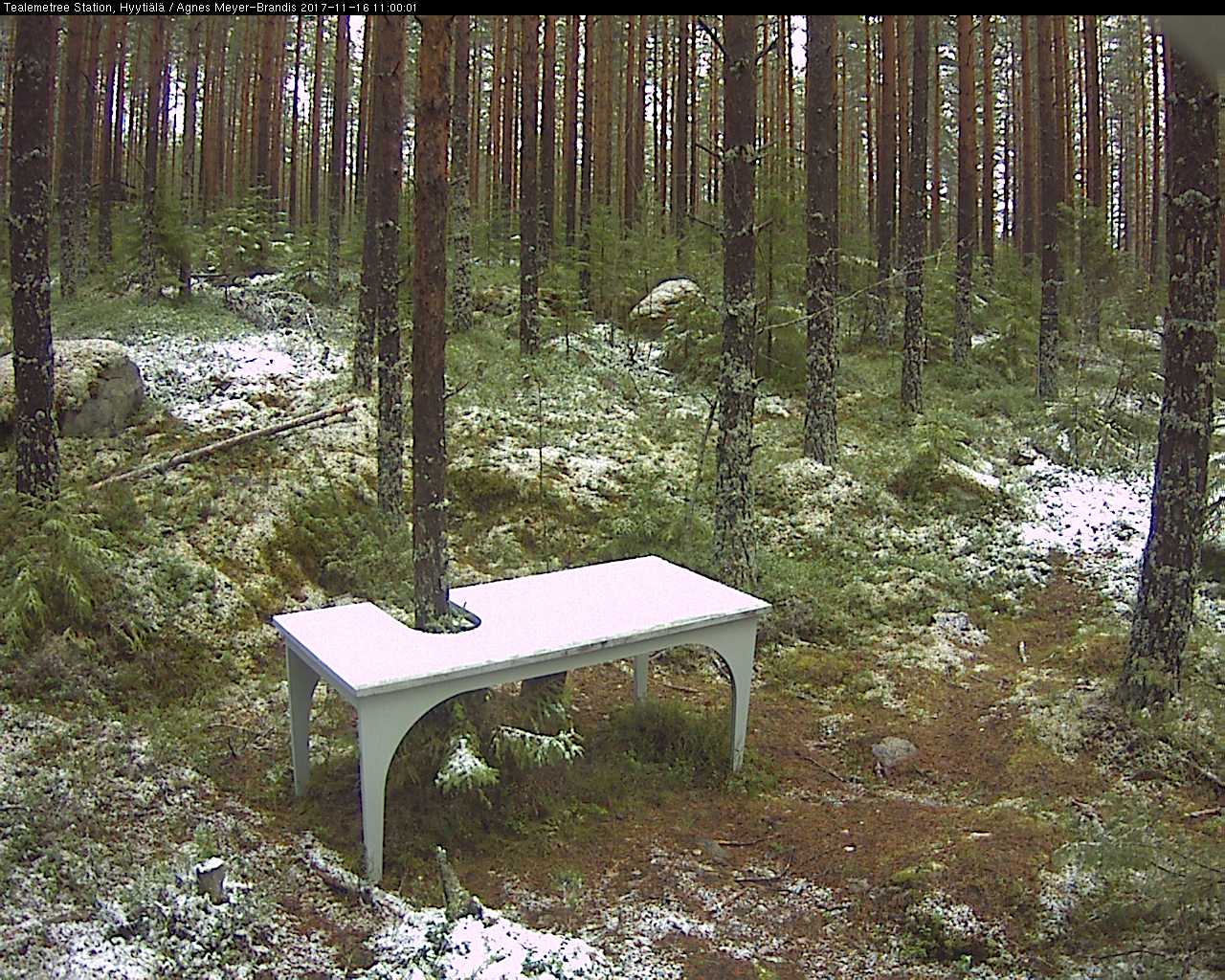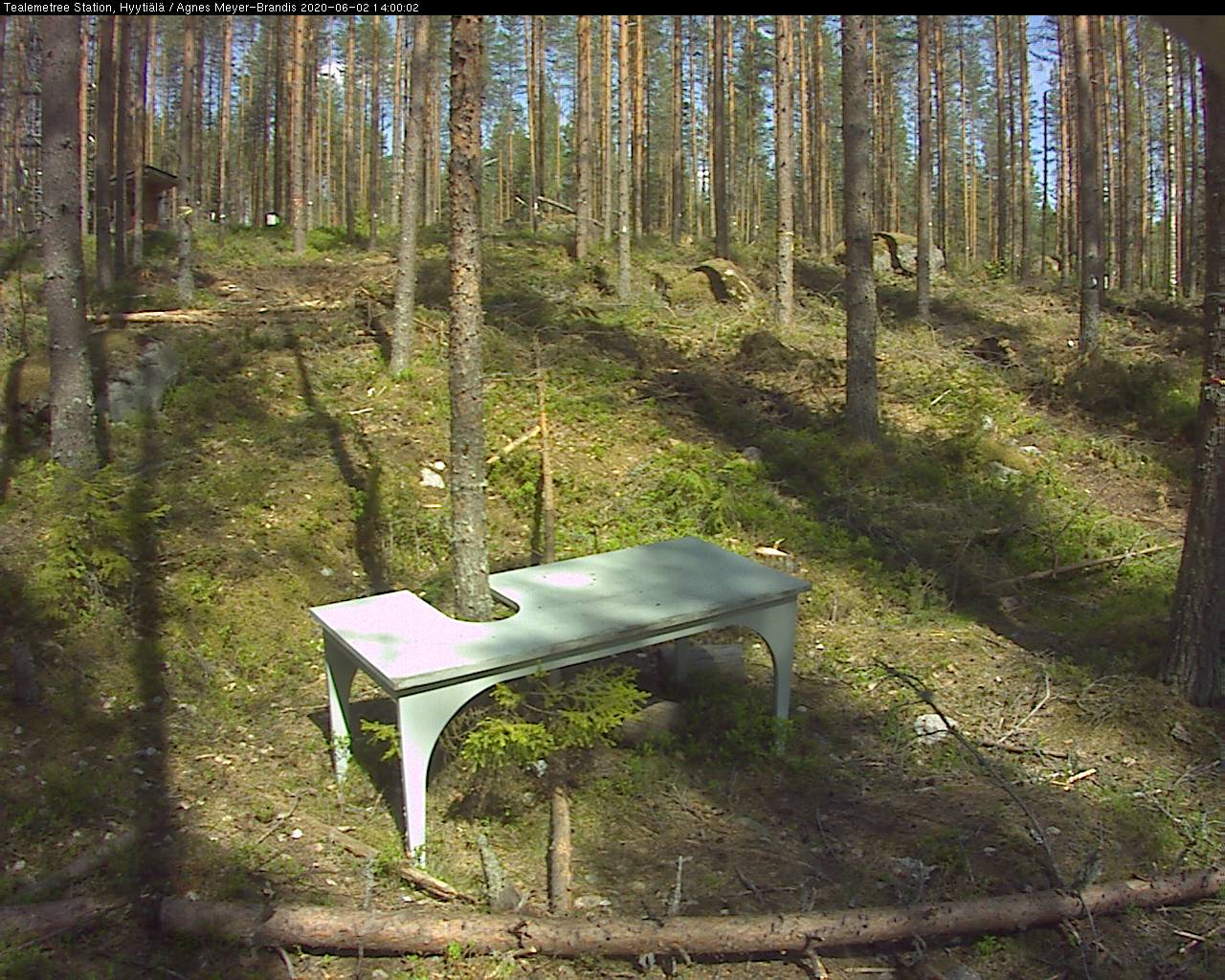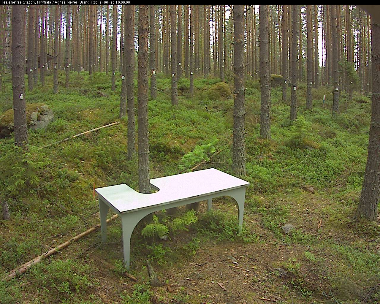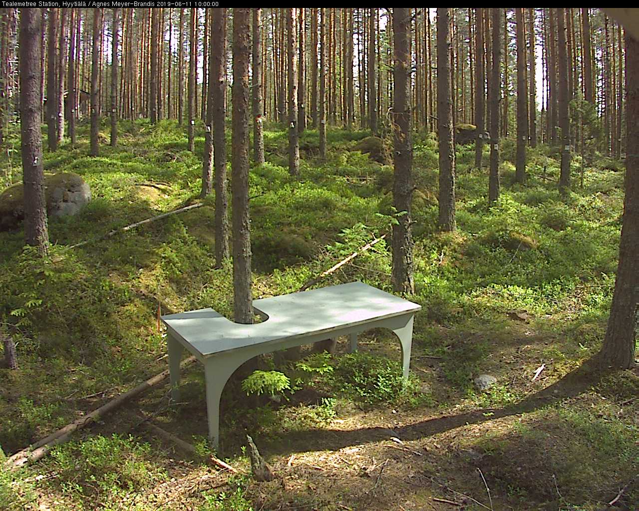 Agnes Meyer-Brandiksen työ Hyytiälässä alkoi tutustumalla aseman muihin tutkijoihin. Pystyäkseen tapaamaan ihmisiä metsässä, hän rakensi pöydän, josta muodostui kohtauspiste ja paikka teehetkille Agneksen ja puun kanssa.