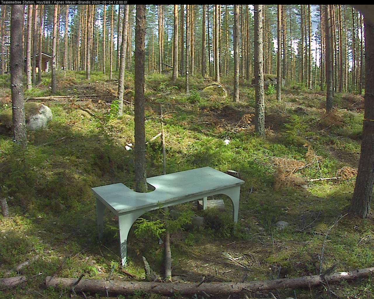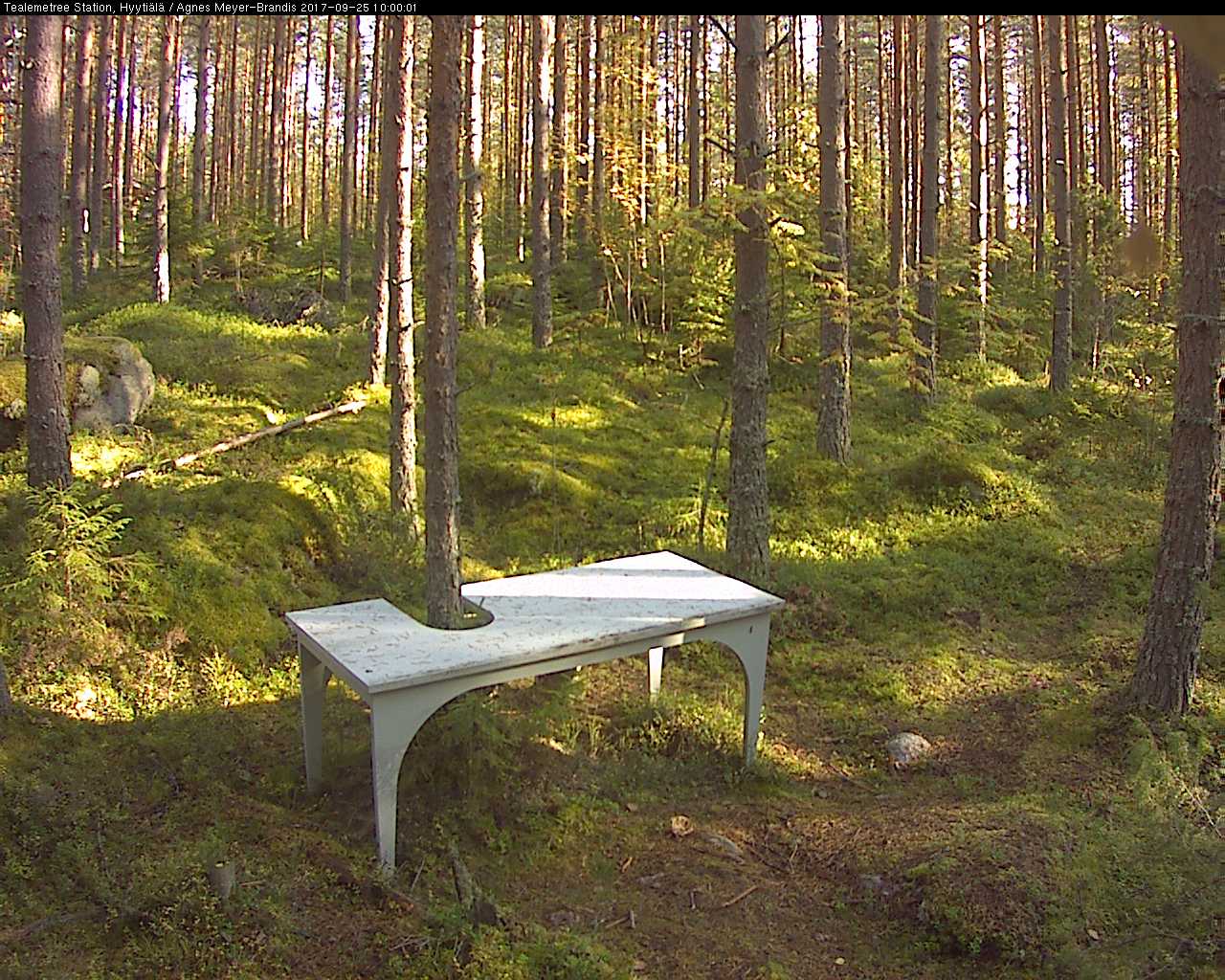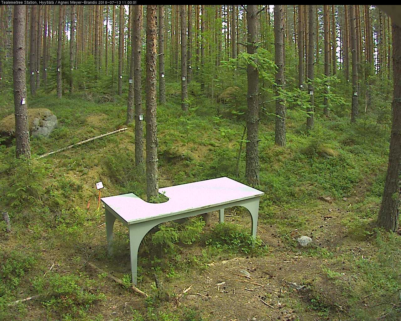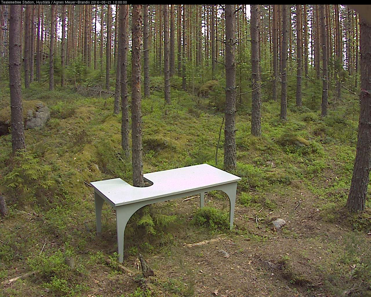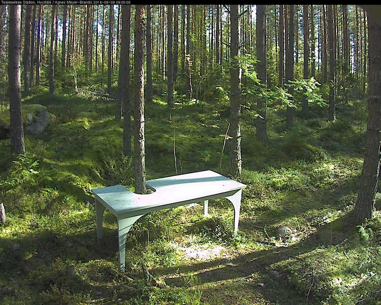 Agnes Meyer-Brandiksen työ Hyytiälässä alkoi tutustumalla aseman muihin tutkijoihin. Pystyäkseen tapaamaan ihmisiä metsässä, hän rakensi pöydän, josta muodostui kohtauspiste ja paikka teehetkille Agneksen ja puun kanssa.