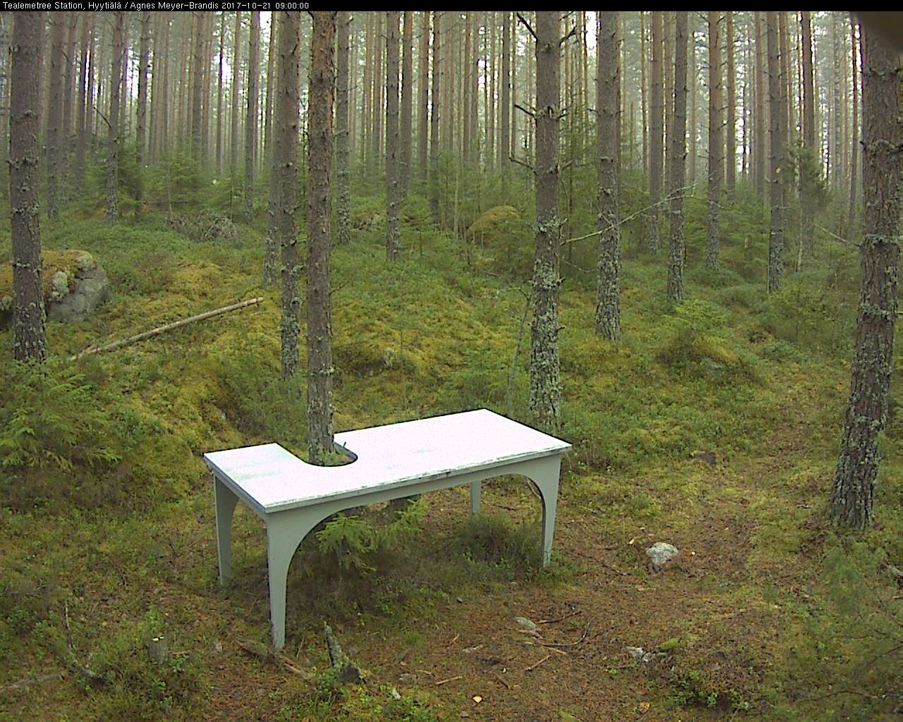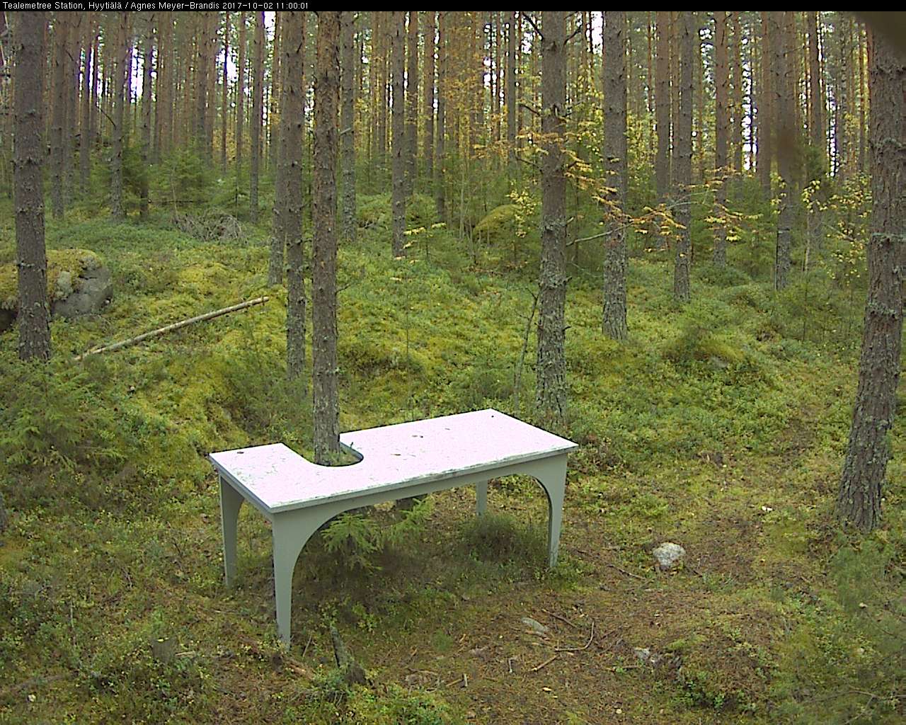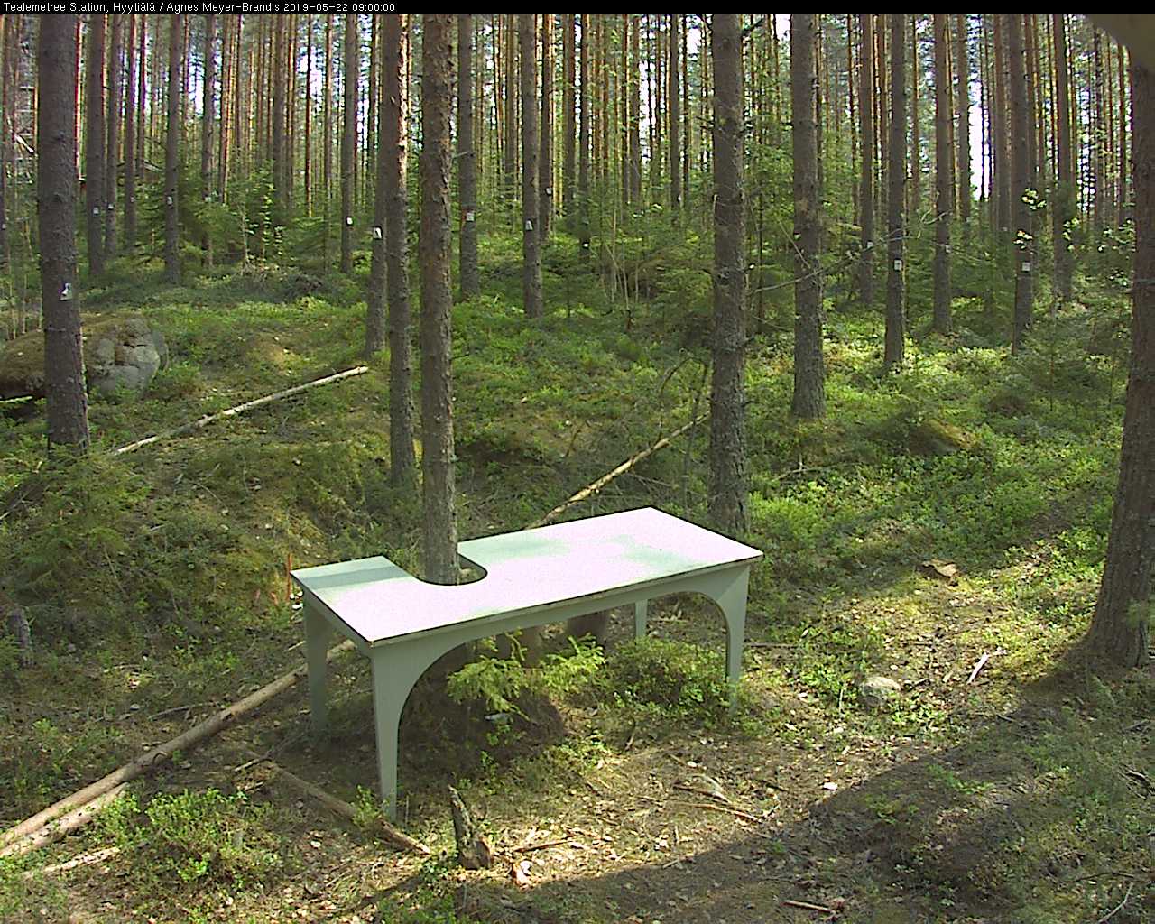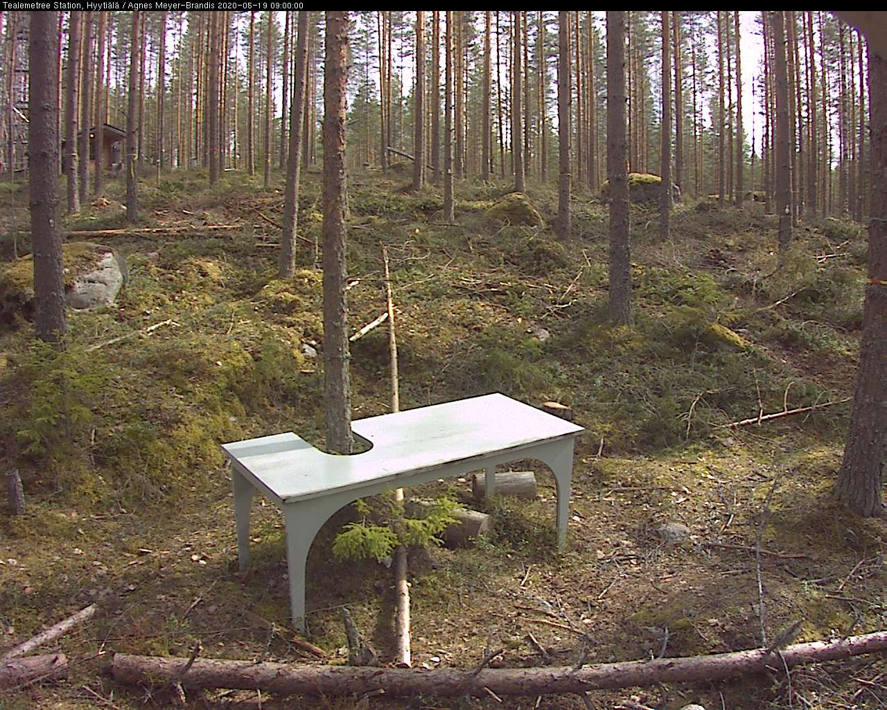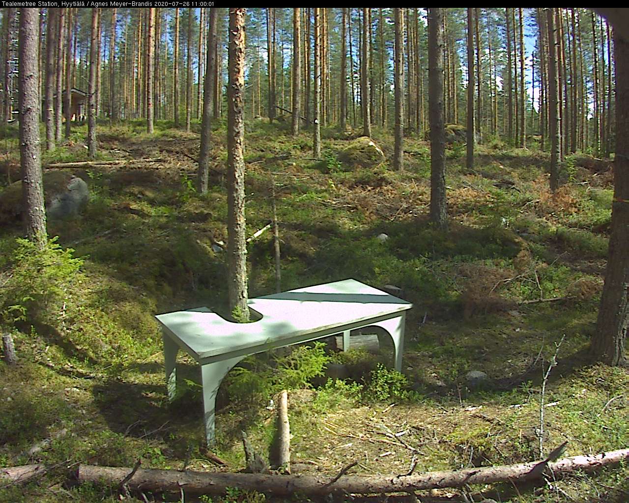 Agnes Meyer-Brandiksen työ Hyytiälässä alkoi tutustumalla aseman muihin tutkijoihin. Pystyäkseen tapaamaan ihmisiä metsässä, hän rakensi pöydän, josta muodostui kohtauspiste ja paikka teehetkille Agneksen ja puun kanssa.