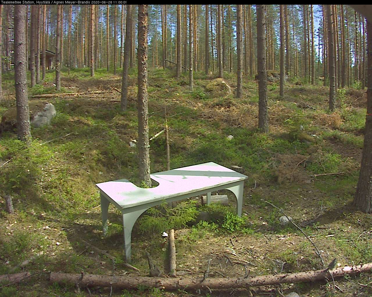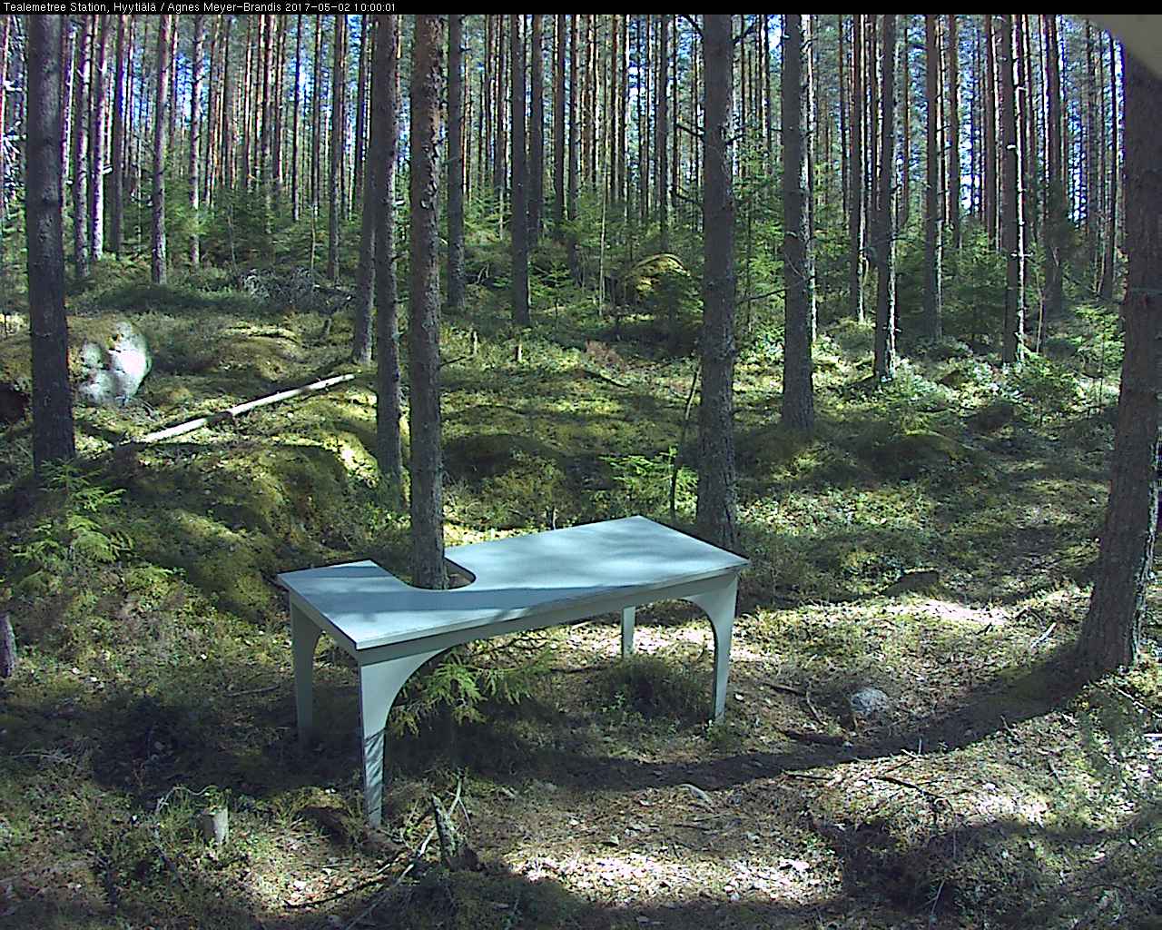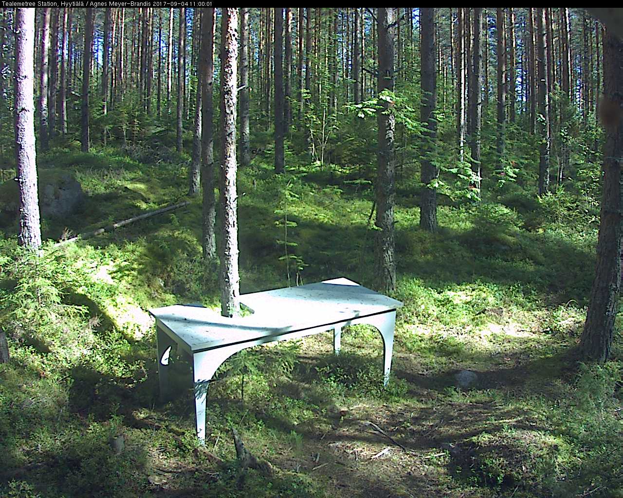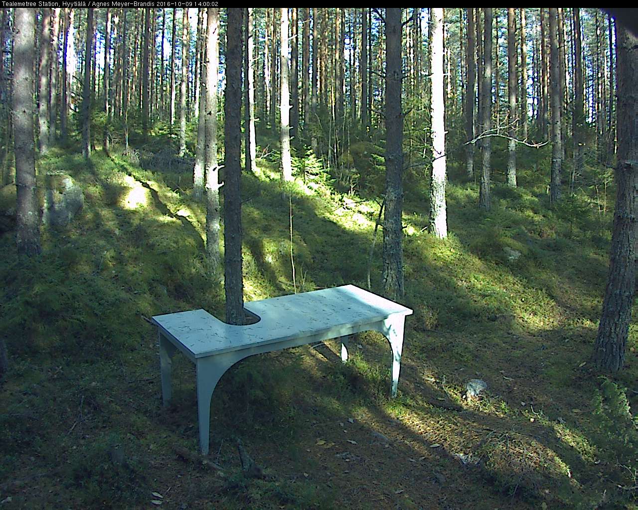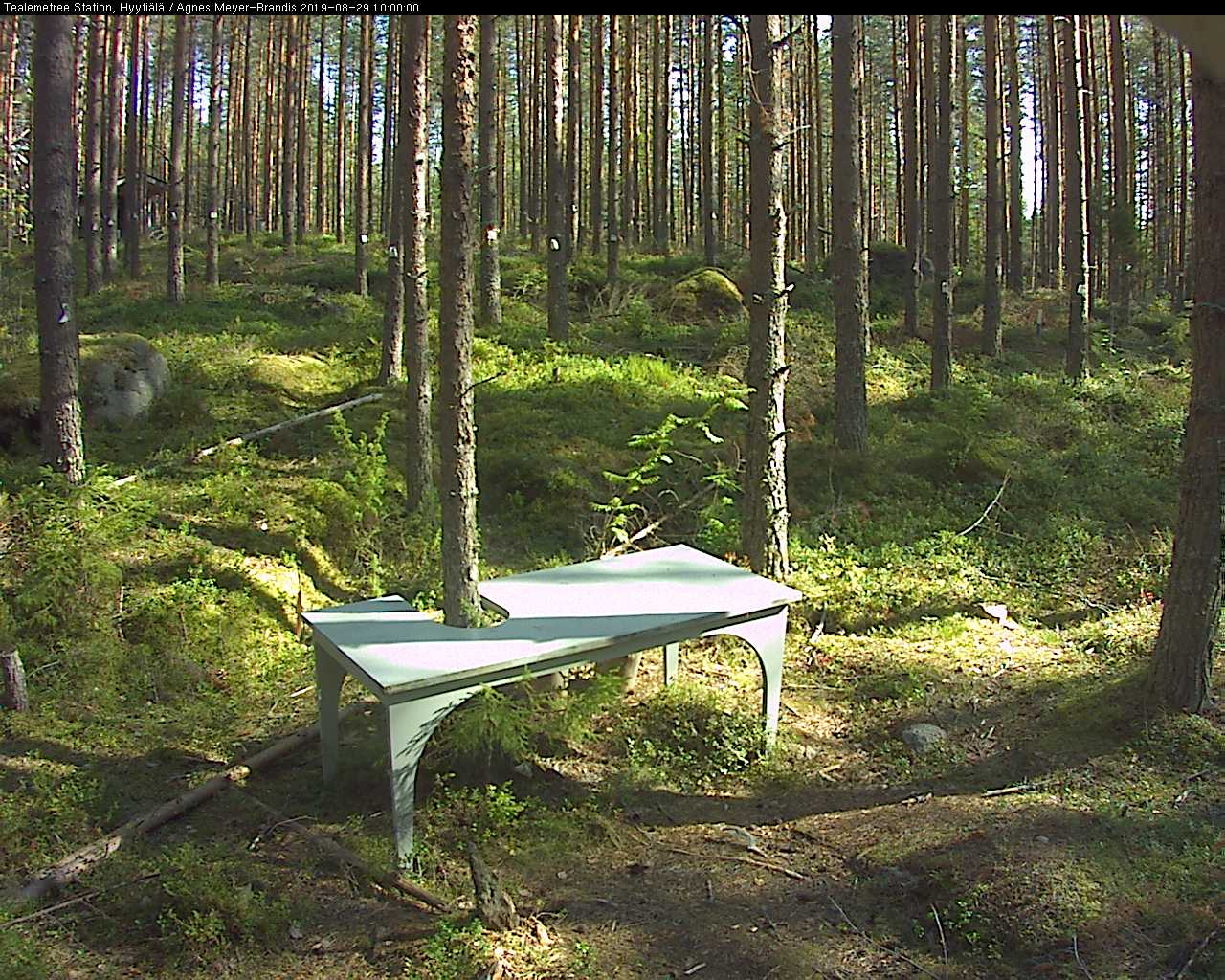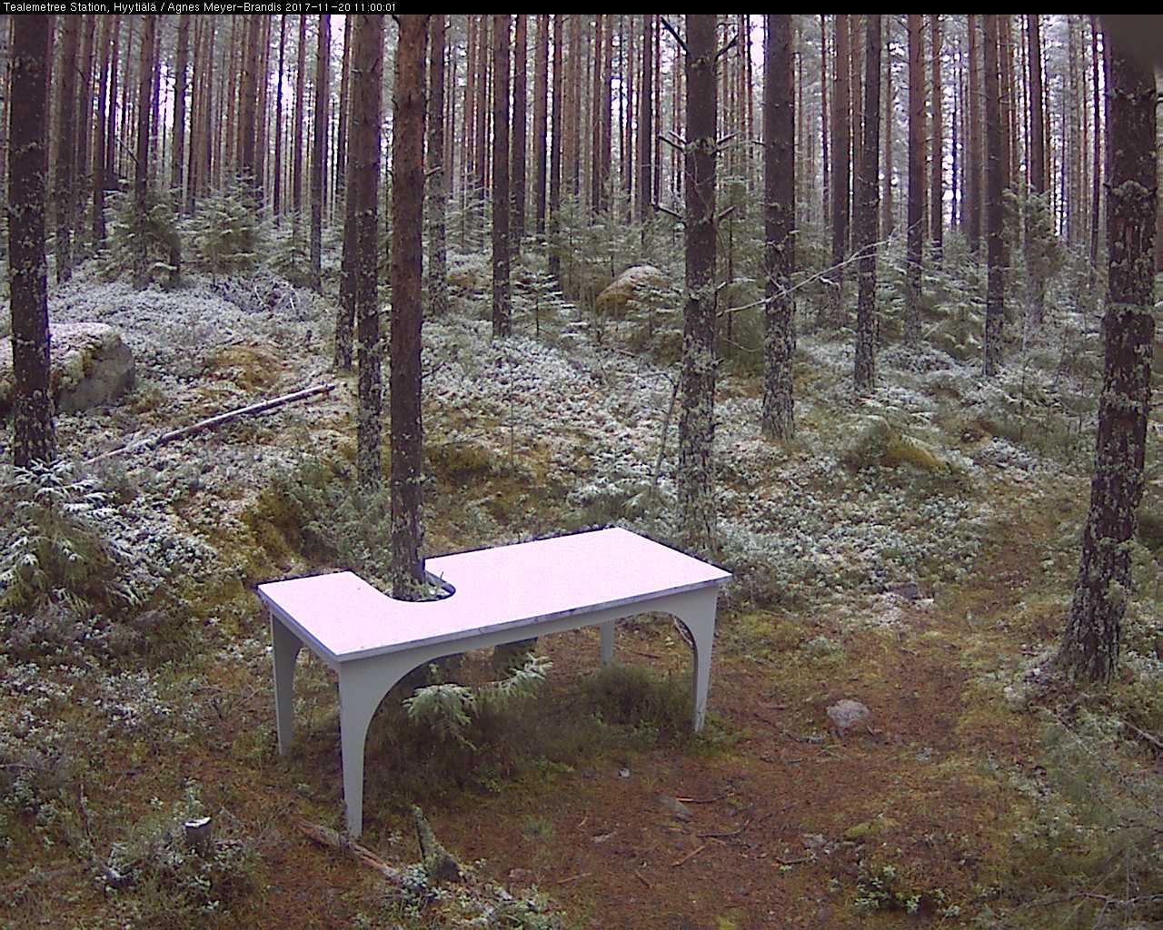 Agnes Meyer-Brandiksen työ Hyytiälässä alkoi tutustumalla aseman muihin tutkijoihin. Pystyäkseen tapaamaan ihmisiä metsässä, hän rakensi pöydän, josta muodostui kohtauspiste ja paikka teehetkille Agneksen ja puun kanssa.