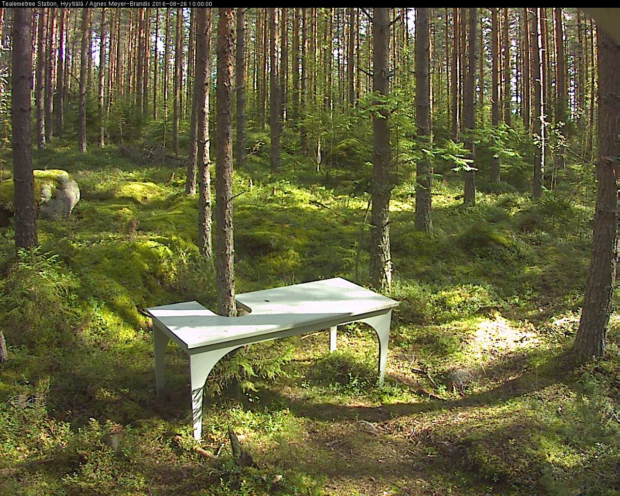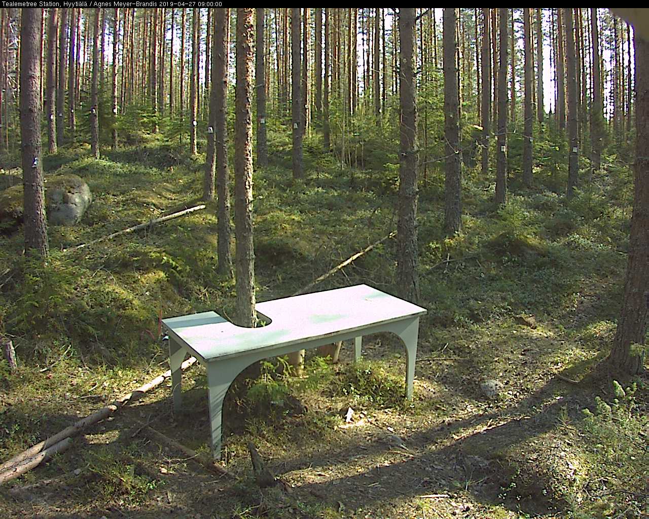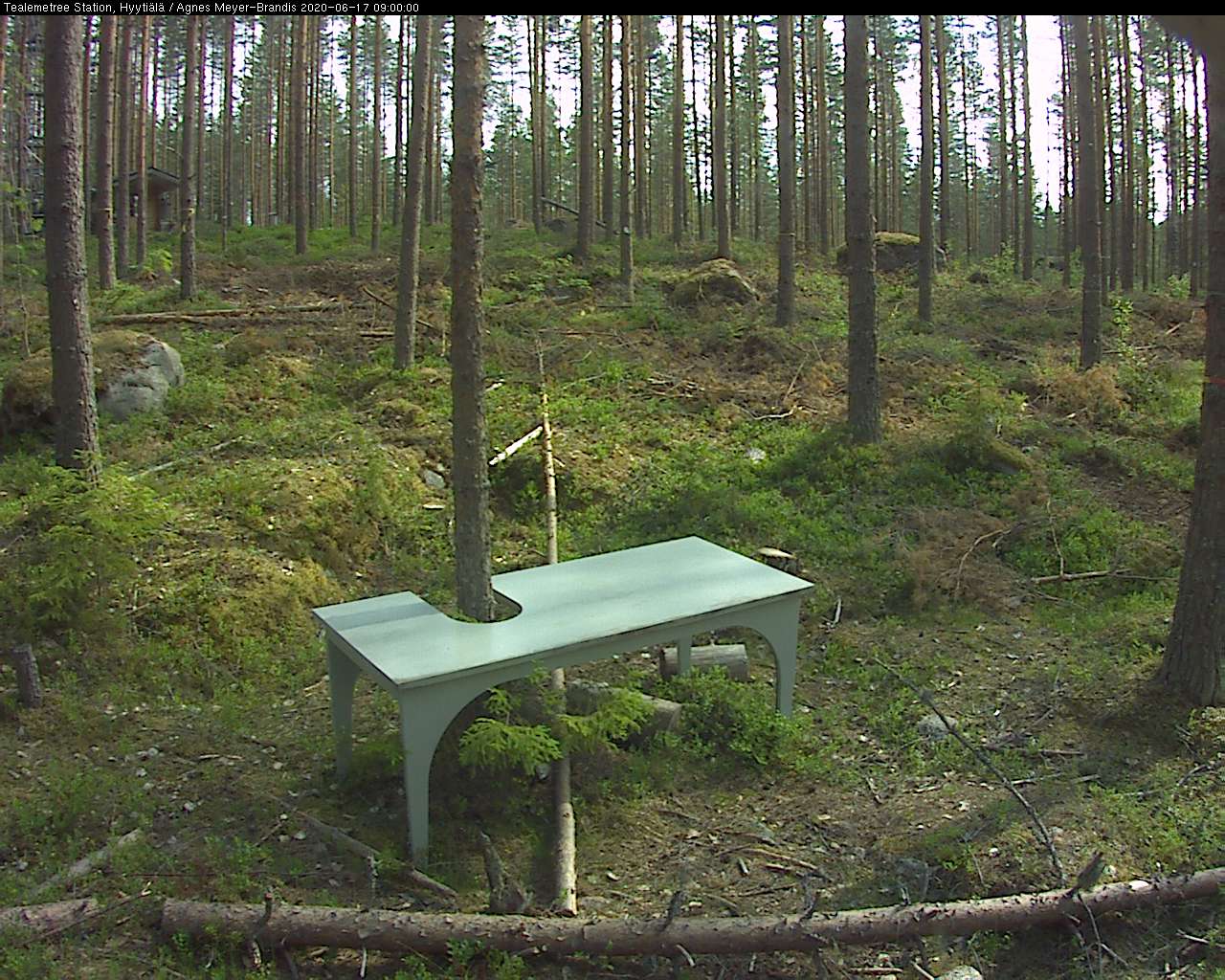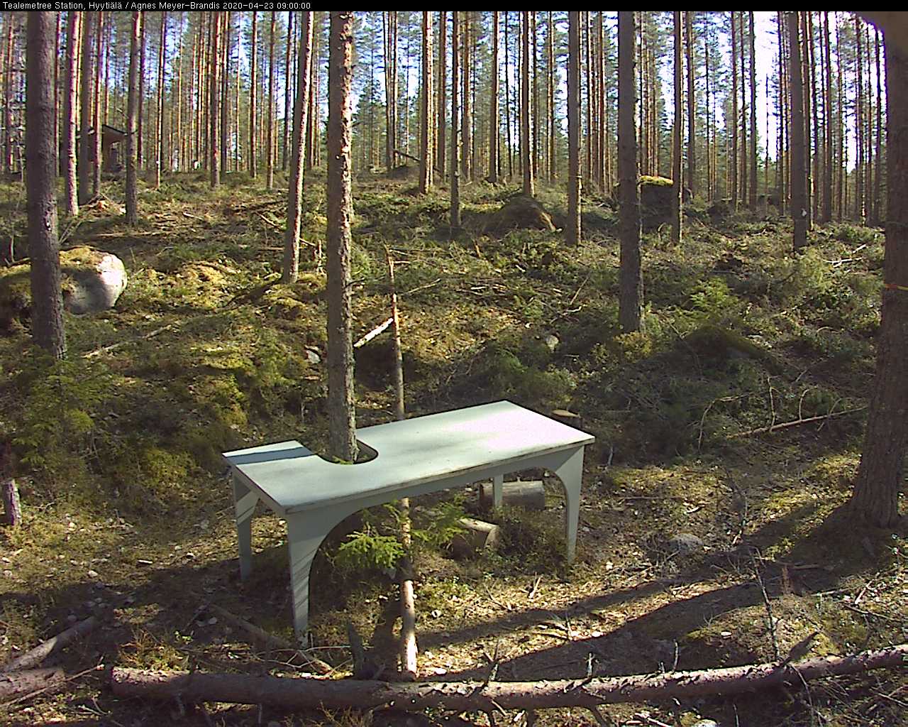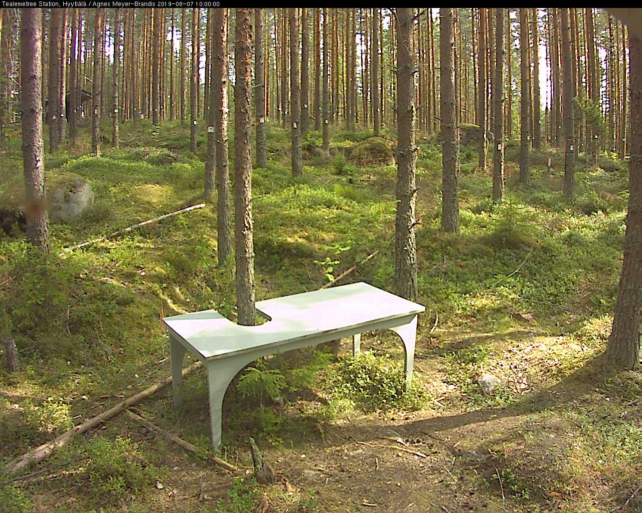 Agnes Meyer-Brandiksen työ Hyytiälässä alkoi tutustumalla aseman muihin tutkijoihin. Pystyäkseen tapaamaan ihmisiä metsässä, hän rakensi pöydän, josta muodostui kohtauspiste ja paikka teehetkille Agneksen ja puun kanssa.