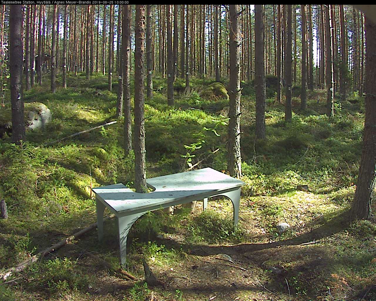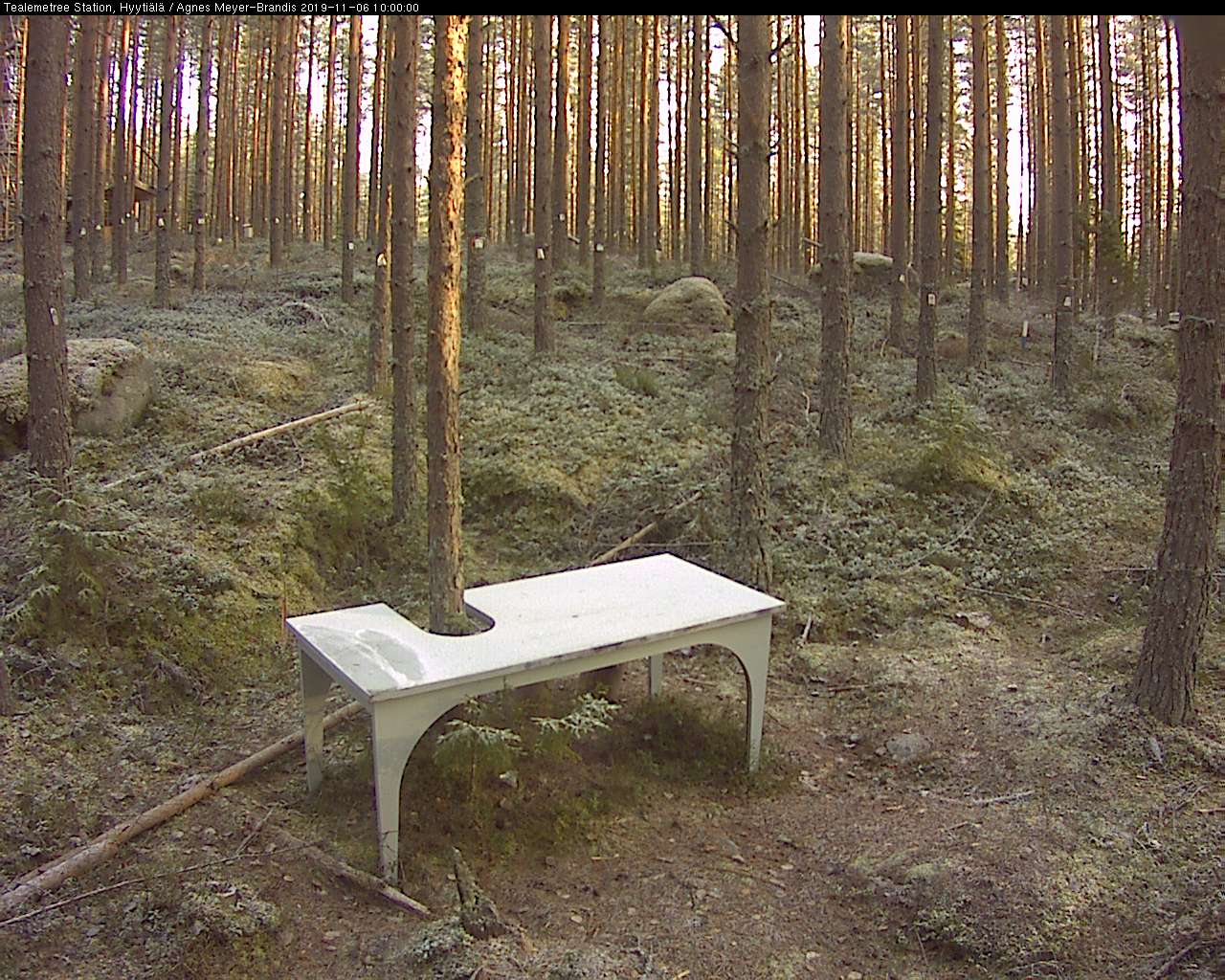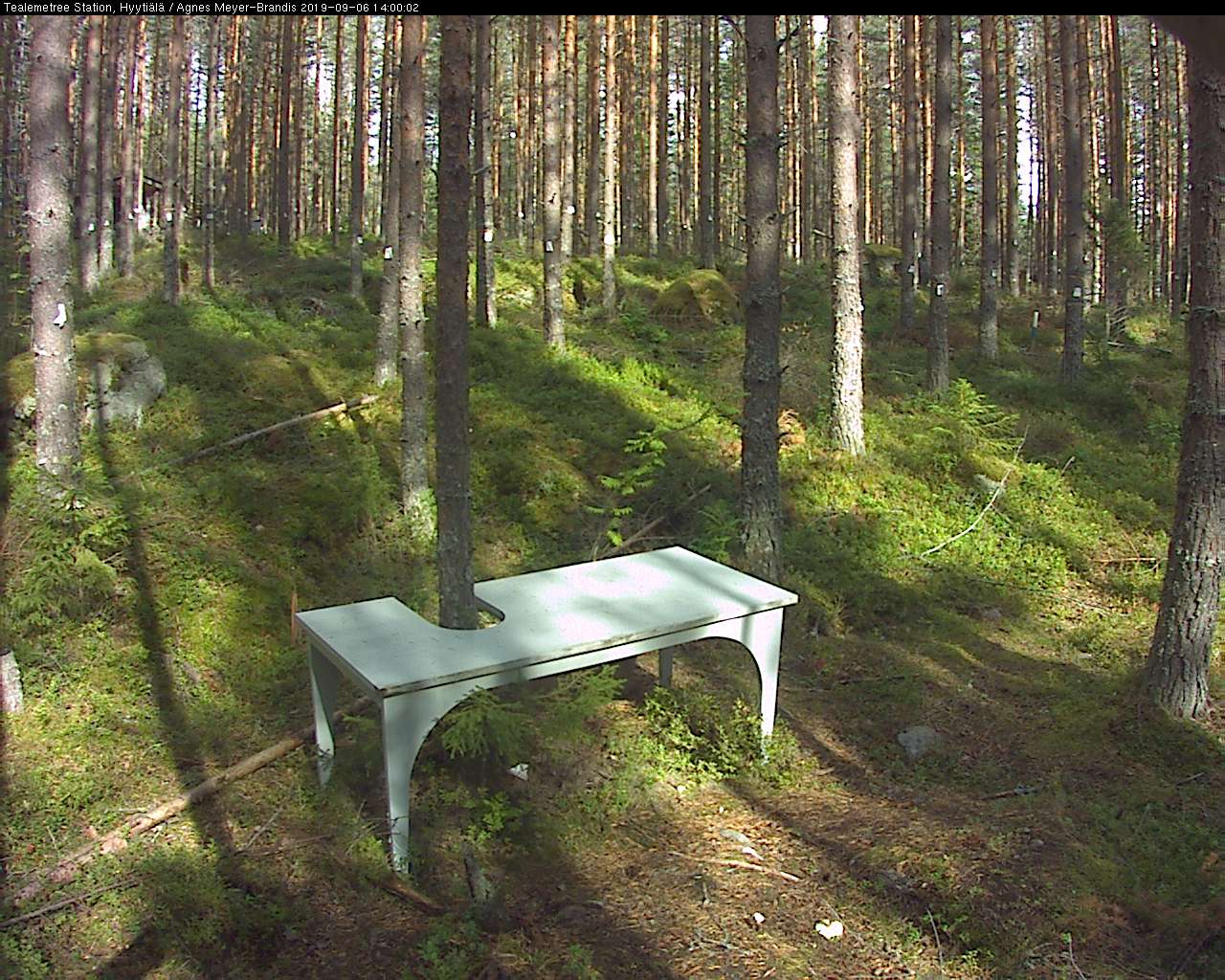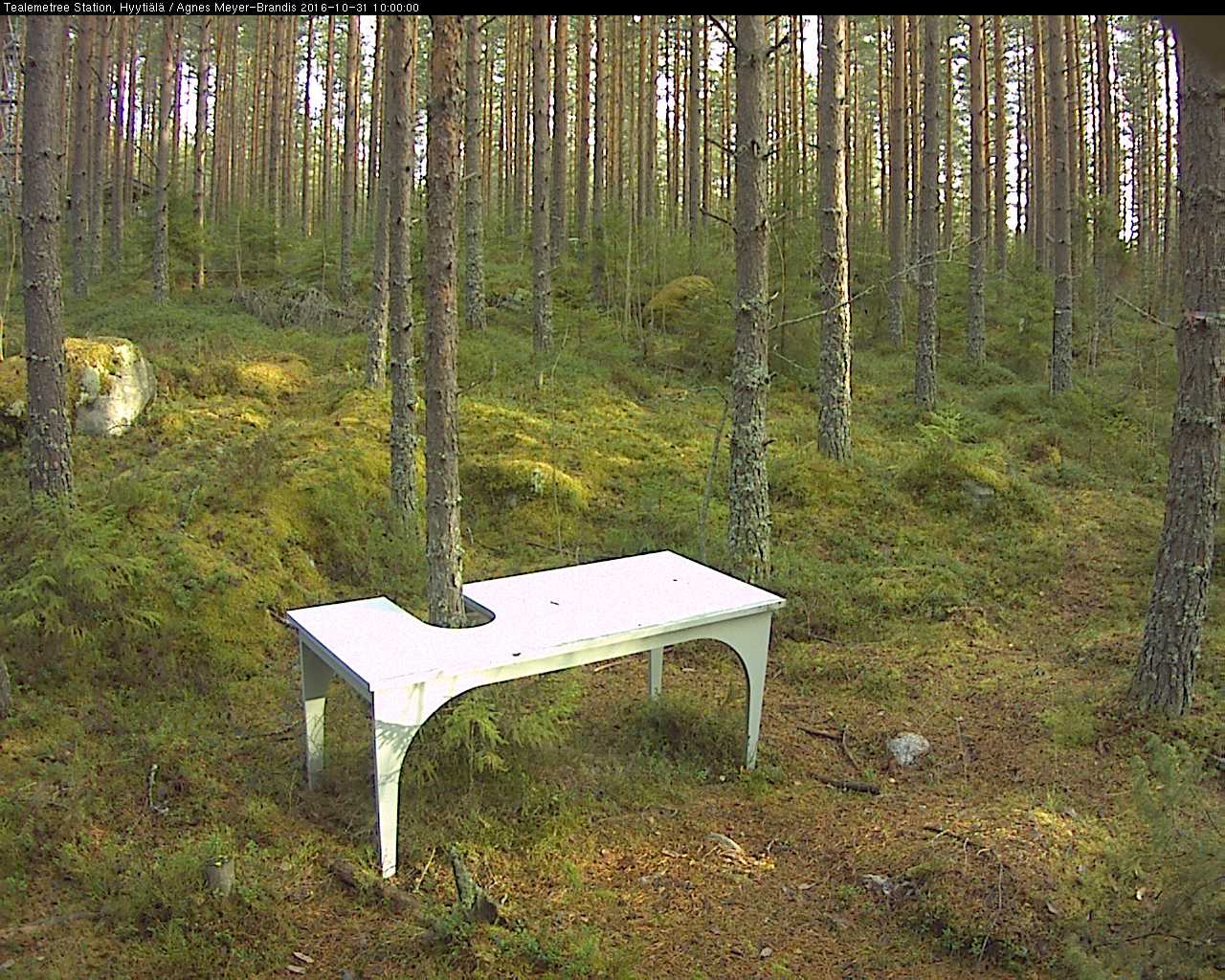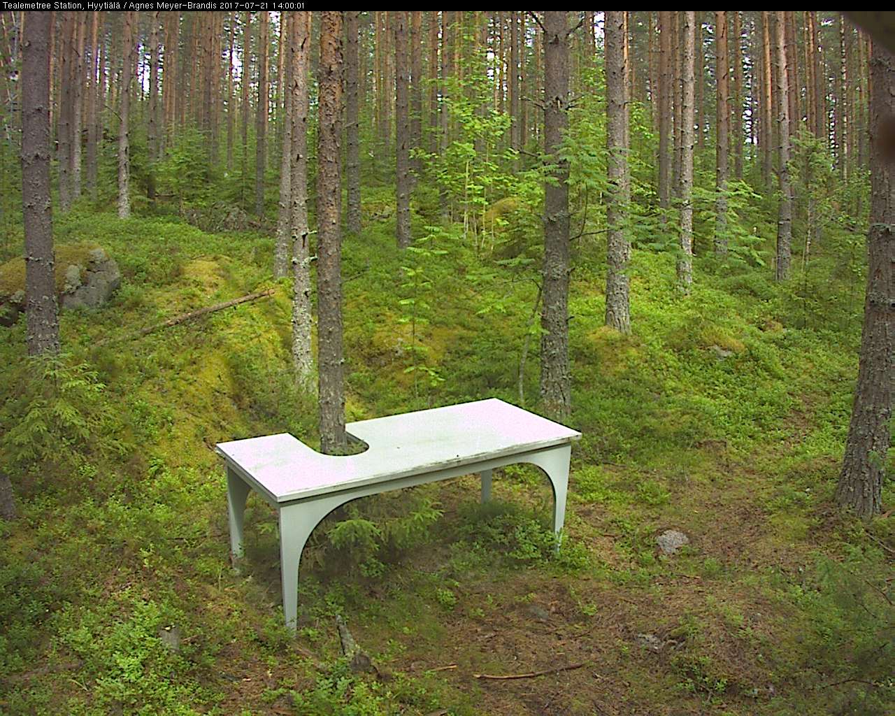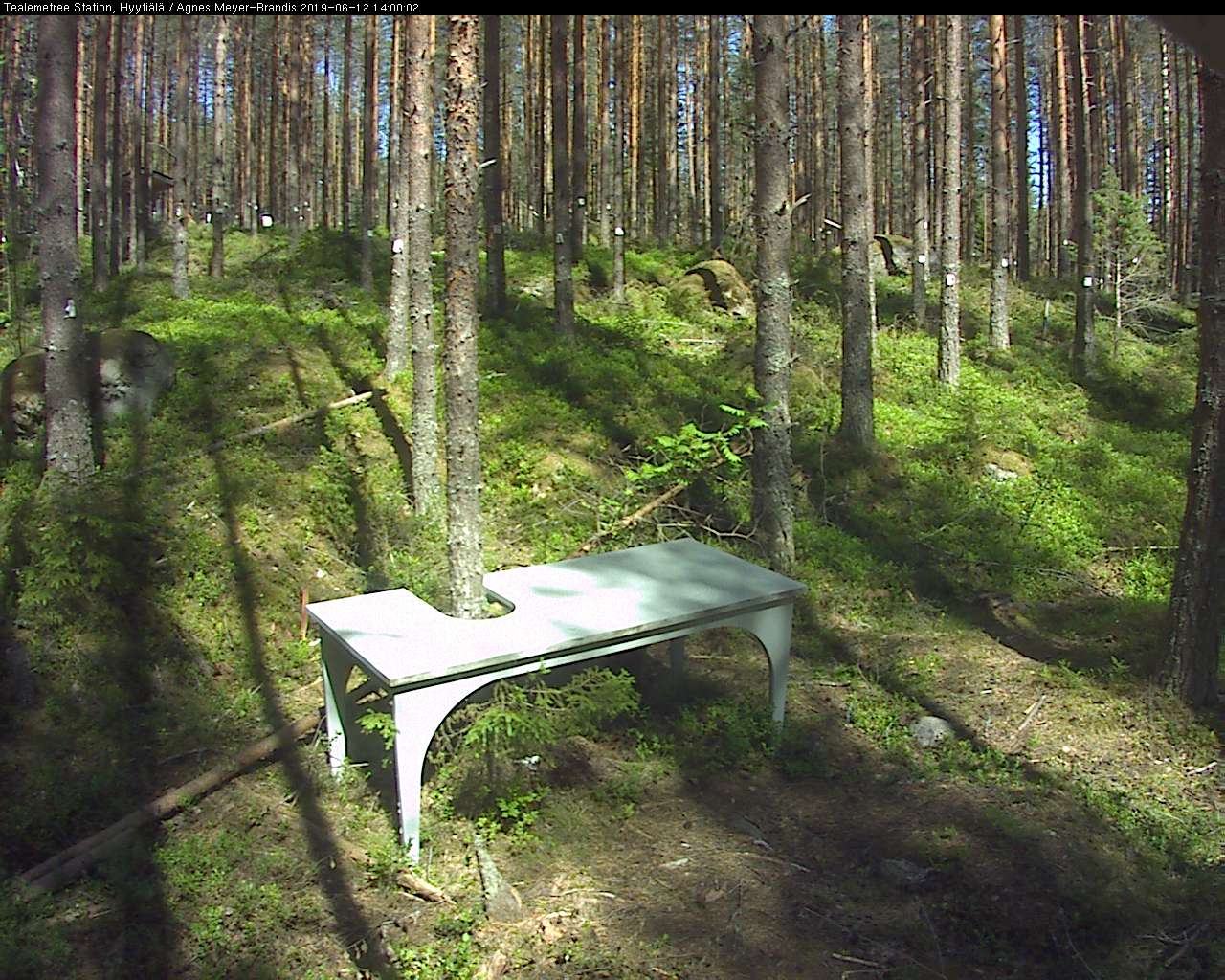 Agnes Meyer-Brandiksen työ Hyytiälässä alkoi tutustumalla aseman muihin tutkijoihin. Pystyäkseen tapaamaan ihmisiä metsässä, hän rakensi pöydän, josta muodostui kohtauspiste ja paikka teehetkille Agneksen ja puun kanssa.