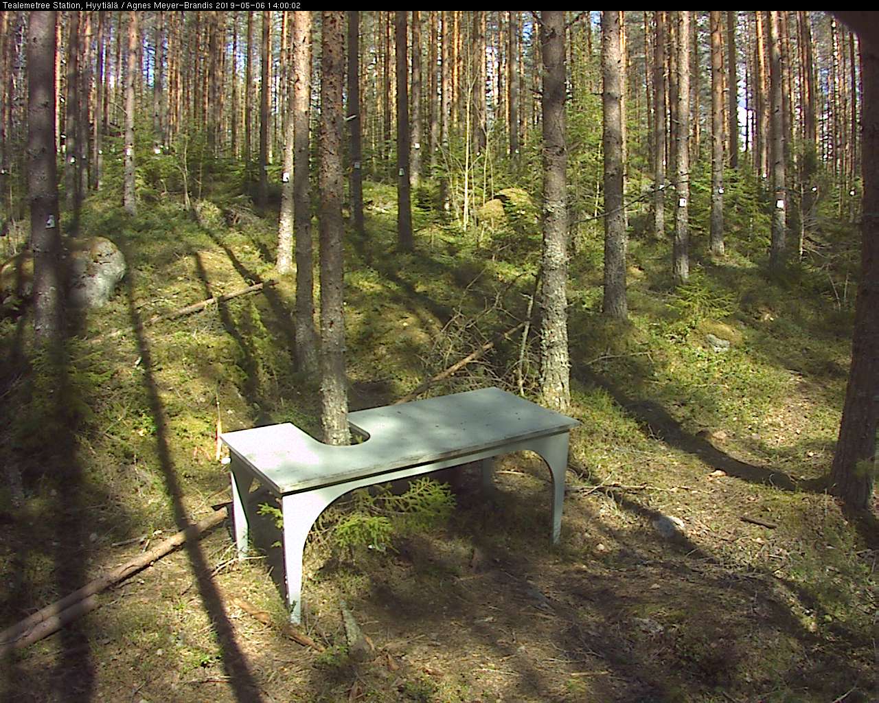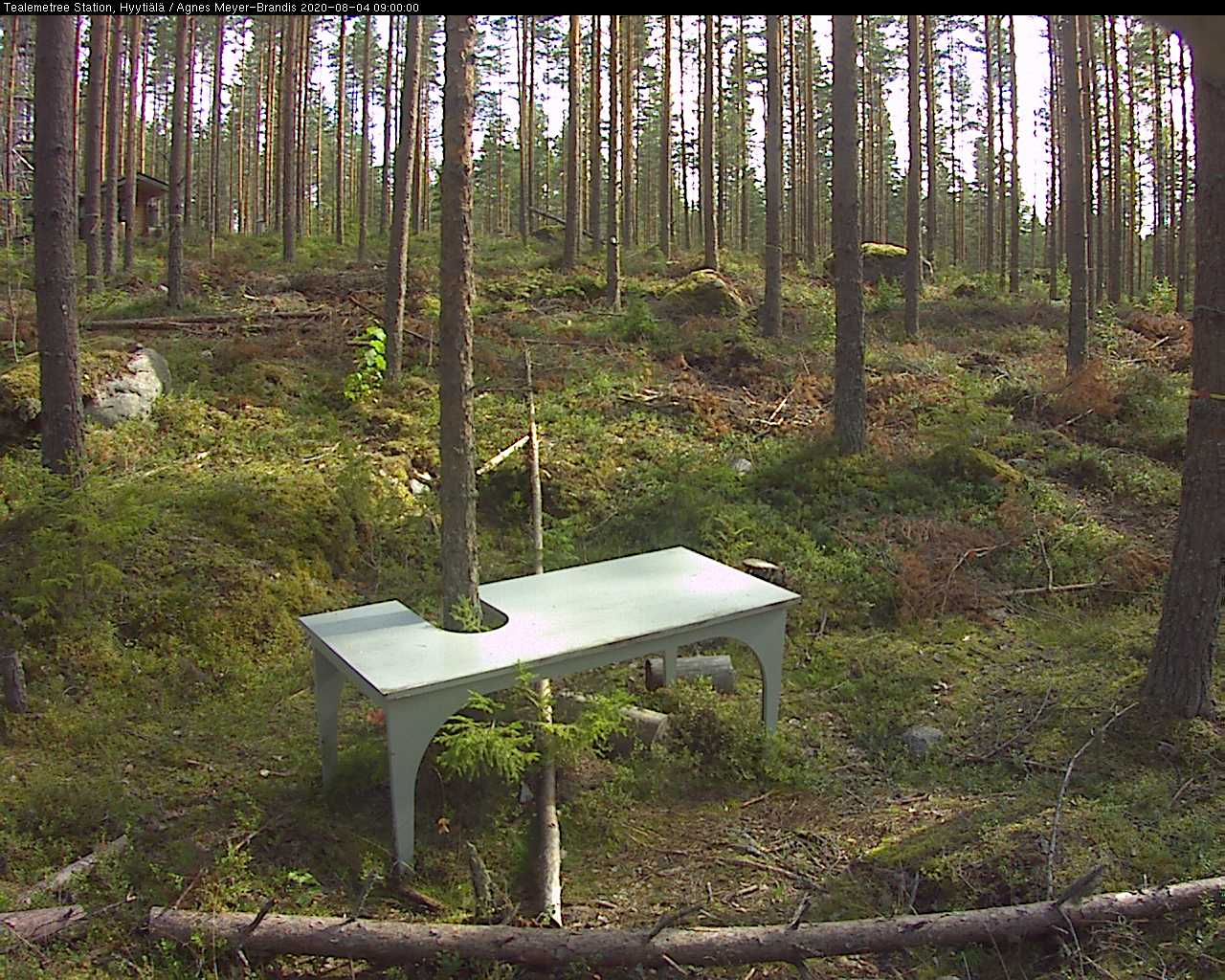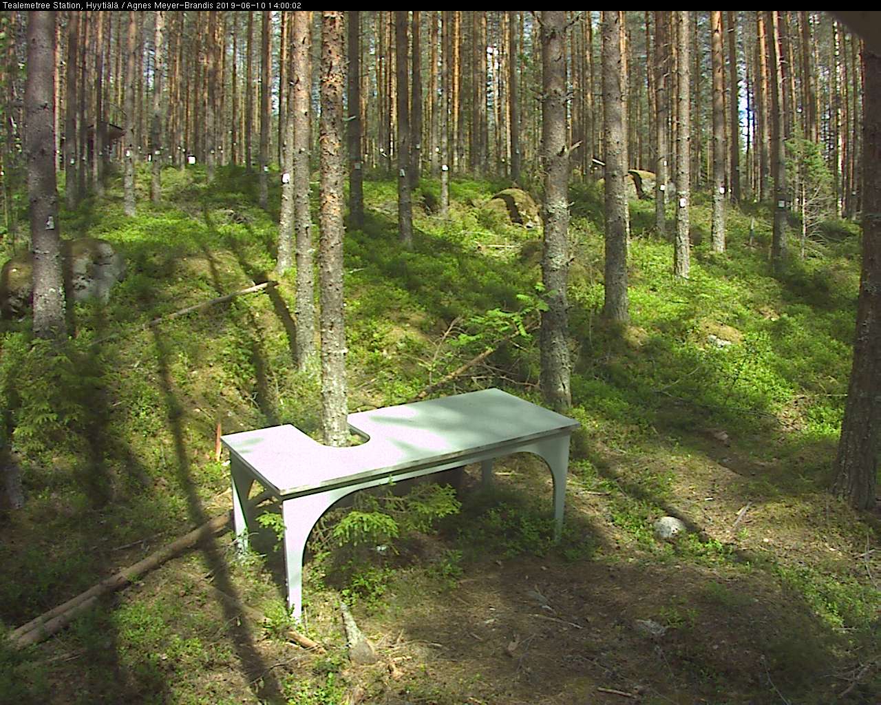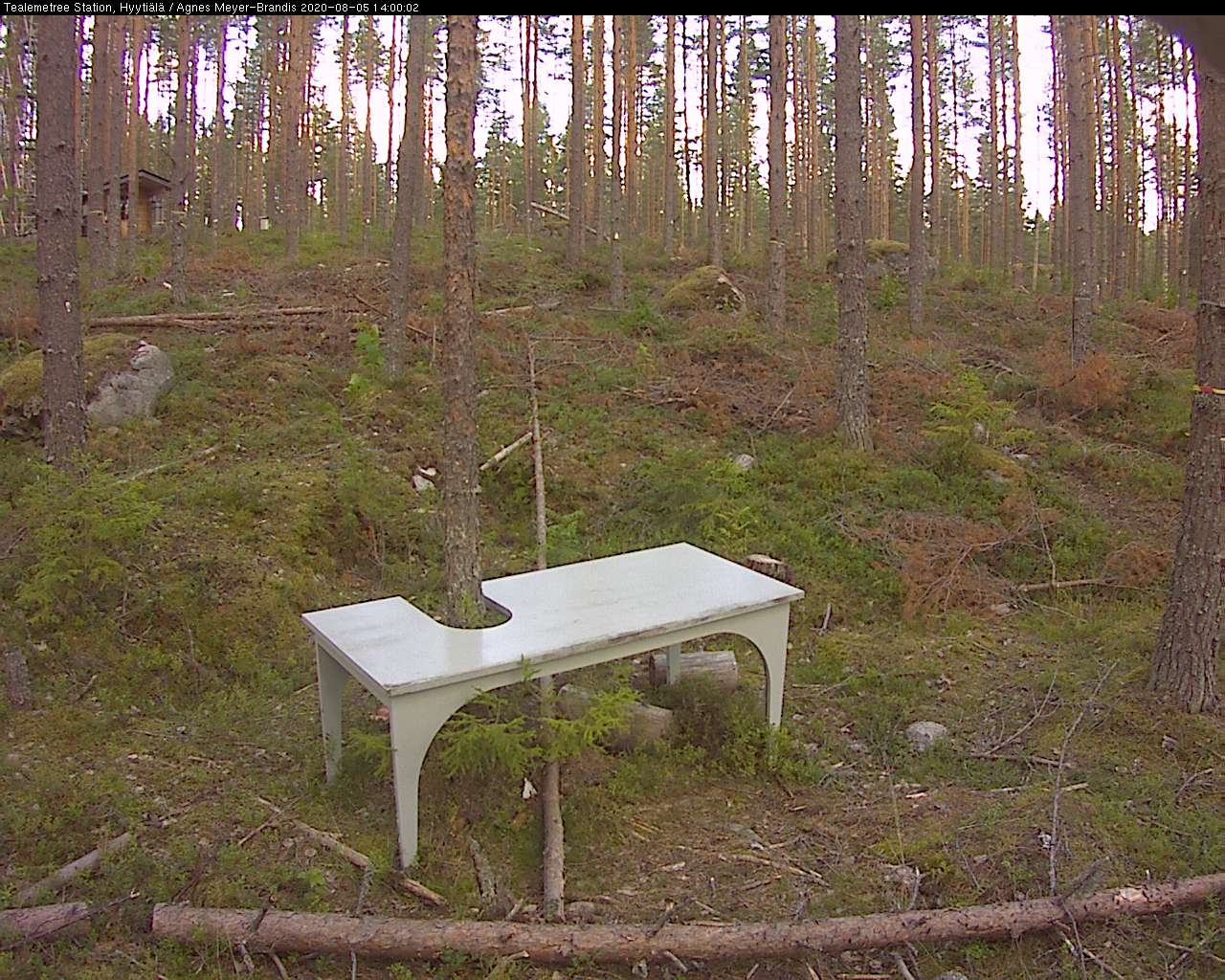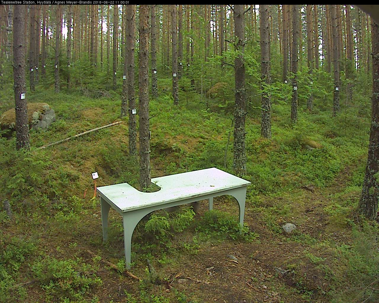 Agnes Meyer-Brandiksen työ Hyytiälässä alkoi tutustumalla aseman muihin tutkijoihin. Pystyäkseen tapaamaan ihmisiä metsässä, hän rakensi pöydän, josta muodostui kohtauspiste ja paikka teehetkille Agneksen ja puun kanssa.